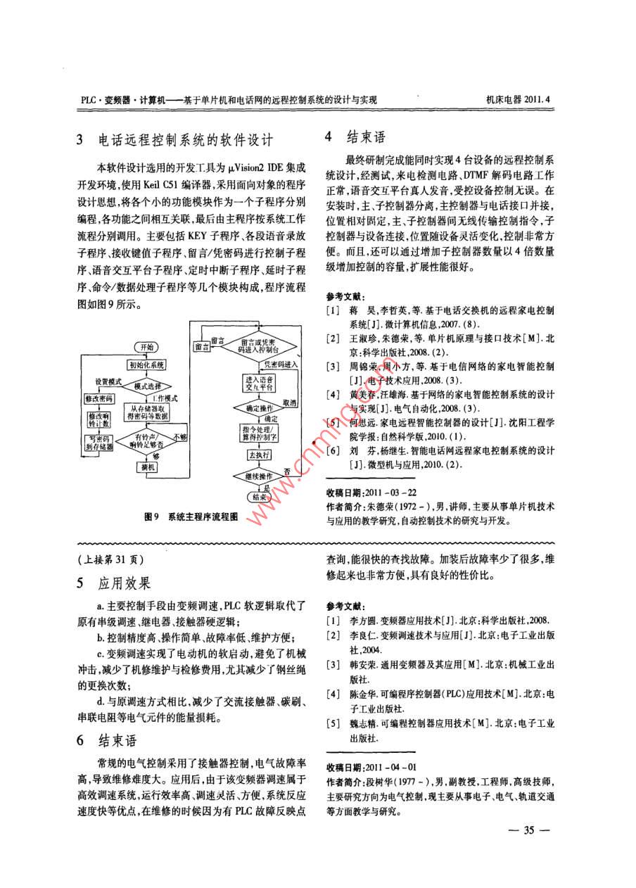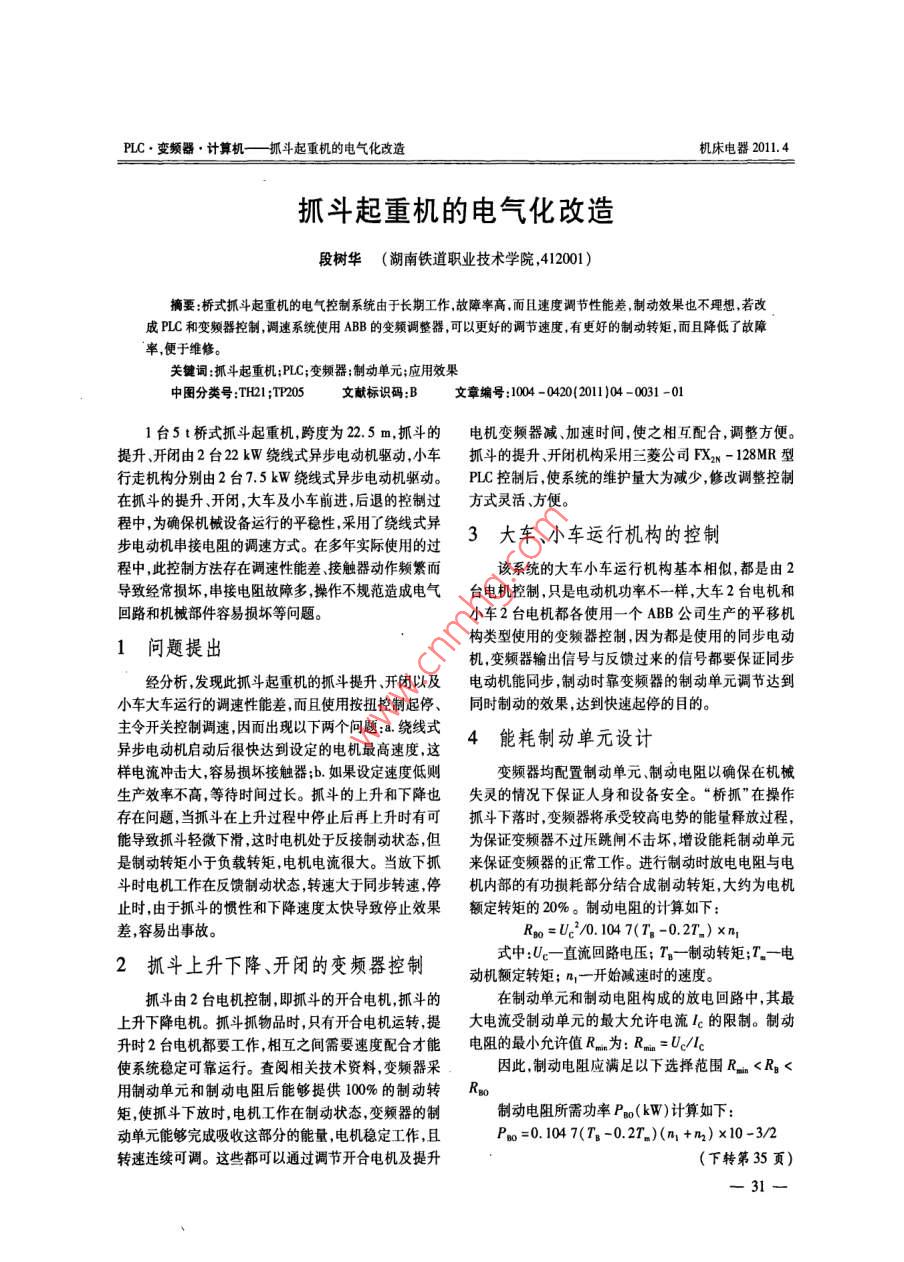 PLC.變頻器,計(jì)算機(jī)一抓斗起重機(jī)的電 氣化改造機(jī)床電器2011.4抓斗起重機(jī)的電氣化改造段樹華( 湖南鐵道職業(yè)技術(shù)學(xué)院,412001)摘要:橋式抓斗起重機(jī)的電氣控制系統(tǒng)由于長期工作,故障率高,而且速度調(diào)節(jié)性能差,制動(dòng)效果也不理想,若改成PLC和變頻器控制,調(diào)速系統(tǒng)使用ABB的變頻調(diào)整器,可以更好的調(diào)節(jié)速度,有更好的制動(dòng)轉(zhuǎn)矩,而且降低了故障率,便于維修。關(guān)鍵詞:抓斗起重機(jī);PLC;變頻器制動(dòng)單元;應(yīng)用效果中圈分類號(hào):TH21;TP205文獻(xiàn)標(biāo)識(shí)碼:B文章編號(hào):1004 -0420(2011)04 -0031 -011臺(tái)5 t橋式抓斗起重機(jī),跨度為22.5 m,抓斗的電機(jī)變頻器減、加速時(shí)間,使之相互配合,調(diào)整方便。提升、開閉由2臺(tái)22 kW繞線式異步電動(dòng)機(jī)驅(qū)動(dòng),小車抓斗的提升、開閉機(jī)構(gòu)采用三菱公司FX2N - 128MR型行走機(jī)構(gòu)分別由2臺(tái)7.5 kW繞線式異步電動(dòng)機(jī)驅(qū)動(dòng)。PLC控制后,使系統(tǒng)的維護(hù)量大為減少,修改調(diào)整控制在抓斗的提升、開閉,大車及小車前進(jìn),后退的控制過方式靈活方便。程中,為確保機(jī)械設(shè)備運(yùn)行的平穩(wěn)性,采用了繞線式異3大車、小車運(yùn)行機(jī)構(gòu)的控制步電動(dòng)機(jī)串接電阻的調(diào)速方式。在多年實(shí)際使用的過程中,此控制方法存在調(diào)速性能差、接觸器動(dòng)作頻繁而該系統(tǒng)的大車小車運(yùn)行機(jī)構(gòu)基本相似,都是由2導(dǎo)致經(jīng)常損壞,串接電阻故障多,操作不規(guī)范造成電氣臺(tái)電機(jī)控制,只是電動(dòng)機(jī)功率不一樣,大車2臺(tái)電機(jī)和回路和機(jī)械部件容易損壞等問題。小車2臺(tái)電機(jī)都各使用一個(gè)ABB公司生產(chǎn)的平移機(jī)構(gòu)類型使用的變頻器控制,因?yàn)槎际鞘褂玫耐诫妱?dòng)1問題提出機(jī),變頻器輸出信號(hào)與反饋過來的信號(hào)都要保證同步經(jīng)分析,發(fā)現(xiàn)此抓斗起重機(jī)的抓斗提升、開閉以及電動(dòng)機(jī)能同步,制動(dòng)時(shí)靠變頻器的制動(dòng)單元調(diào)節(jié)達(dá)到小車大車運(yùn)行的調(diào)速性能差,而且使用按扭控制起停、同時(shí)制動(dòng)的效果,達(dá)到快速起停的目的。主令開關(guān)控制調(diào)速,因而出現(xiàn)以下兩個(gè)問題:a.繞線式4能耗制動(dòng)單元設(shè)計(jì)異步電動(dòng)機(jī)啟動(dòng)后很快達(dá)到設(shè)定的電機(jī)最高速度,這樣電流沖擊大,容易損壞接觸器;b.如果設(shè)定速度低則變頻器均配置制動(dòng)單元制動(dòng)電阻以確保在機(jī)械生產(chǎn)效率不高,等待時(shí)間過長。抓斗的上升和下降也失靈的情況下保證人身和設(shè)備安全?!皹蜃ァ痹诓僮鞔嬖趩栴},當(dāng)抓斗在上升過程中停止后再上升時(shí)有可抓斗下落時(shí),變頻器將承受較高電勢(shì)的能量釋放過程,能導(dǎo)致抓斗輕微下滑,這時(shí)電機(jī)處于反接制動(dòng)狀態(tài),但為保證變頻器不過壓跳閘不擊壞,增設(shè)能耗制動(dòng)單元是制動(dòng)轉(zhuǎn)矩小于負(fù)載轉(zhuǎn)矩,電機(jī)電流很大。當(dāng)放下抓來保證變頻器的正常工作。進(jìn)行制動(dòng)時(shí)放電電阻與電斗時(shí)電機(jī)工作在反饋制動(dòng)狀態(tài),轉(zhuǎn)速大于同步轉(zhuǎn)速,停機(jī)內(nèi)部的有功損耗部分結(jié)合成制動(dòng)轉(zhuǎn)矩,大約為電機(jī)止時(shí),由于抓斗的慣性和下降速度太快導(dǎo)致停止效果額定轉(zhuǎn)矩的20%。制動(dòng)電阻的計(jì)算如下:差,容易出事故。Rgo =Uz2/0.104 7(T。-0.27.) xn式中:Ue- -直流回路電壓; T。一制動(dòng)轉(zhuǎn)矩;T.- -電2抓斗上升下降、開閉的變頻器控制動(dòng)機(jī)額定轉(zhuǎn)矩; n,-開始減速時(shí)的速度。抓斗由2臺(tái)電機(jī)控制,即抓斗的開合電機(jī),抓斗的在制動(dòng)單元和制動(dòng)電阻構(gòu)成的放電回路中,其最上升下降電機(jī)。抓斗抓物品時(shí),只有開合電機(jī)運(yùn)轉(zhuǎn),提大電流受制動(dòng)單元的最大允許電流Ic的限制。制動(dòng)升時(shí)2臺(tái)電機(jī)都要工作,相互之間需要速度配合才能電阻的最小允許值Rmin為: Rmn = U/Ic使系統(tǒng)穩(wěn)定可靠運(yùn)行。查閱相關(guān)技術(shù)資料,變頻器采因此,制動(dòng)電阻應(yīng)滿足以下選擇范圍Rgim