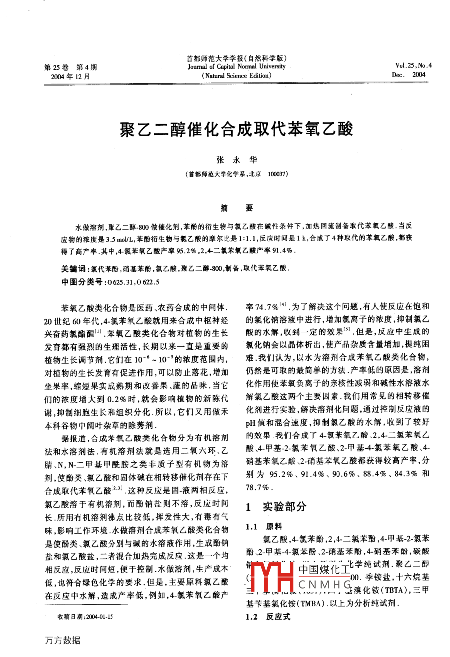 首都師范大學(xué)學(xué)報(bào)(自然科學(xué)版)第25卷第4期Journal of Capital Normal UniversityVol 25, No 42004年12月Natural Science Edition)聚乙二醇催化合成取代苯氧乙酸張永華(首都師范大學(xué)化學(xué)系,北京10007)摘要水做溶劑,聚乙二醇-800做催化劑,苯酚的衍生物與氯乙酸在堿性條件下,加熱回流制備取代苯氧乙酸.當(dāng)反應(yīng)物的濃度是3.5moML,苯酚衍生物與氯乙酸的摩爾比是1:11,反應(yīng)時(shí)間是1h,合成了4種取代的苯氧乙酸都獲得了高產(chǎn)率其中,4氯苯氧乙酸產(chǎn)率952%,2,4二氯苯氧乙酸產(chǎn)率914%關(guān)鍵詞:氯代苯酚硝基苯酚,氯乙酸聚乙二醇800,制備取代苯氧乙酸中圖分類號(hào):0625.31,0622.5苯氧乙酸類化合物是醫(yī)藥農(nóng)藥合成的中間體.率747%4,為了解決這個(gè)問題有人使反應(yīng)在飽和20世紀(jì)60年代,4氯苯氧乙酸就用來合成中樞神經(jīng)的氯化鈉溶液中進(jìn)行,增加氯離子的濃度,抑制氯乙興奮藥氯酯醒苯氧乙酸類化合物對(duì)植物的生長(zhǎng)酸的水解收到一定的效果.但是,反應(yīng)中生成的發(fā)育都有強(qiáng)烈的生理活性,長(zhǎng)期以來一直是重要的氯化鈉會(huì)以晶體析出,使產(chǎn)品雜質(zhì)含量增加提純困植物生長(zhǎng)調(diào)節(jié)劑它們?cè)?06-105的濃度范圍內(nèi),難我們認(rèn)為以水為溶劑合成苯氧乙酸類化合物對(duì)植物的生長(zhǎng)發(fā)育有促進(jìn)作用,可以防止落花,增加仍然是可取的最簡(jiǎn)單的方法產(chǎn)率低的原因是,溶劑坐果率縮短果實(shí)成熟期和改善果、蔬的品味當(dāng)它化作用使苯氧負(fù)離子的親核性減弱和堿性水溶液水們的濃度增大到02%時(shí),就會(huì)影響植物的新陳代解氯乙酸這兩個(gè)主要因素我們用常見的相轉(zhuǎn)移催謝,抑制細(xì)胞生長(zhǎng)和組織分化所以,它們又用做禾化劑進(jìn)行實(shí)驗(yàn)解決溶劑化問題,通過控制反應(yīng)液的本科谷物中闊葉雜草的除莠劑H值和混合速度,抑制氯乙酸的水解,收到了較好據(jù)報(bào)道合成苯氧乙酸類化合物分為有機(jī)溶劑的效果我們合成了4氯苯氧乙酸、2,4二氯苯氧乙法和水溶劑法有機(jī)溶劑法就是選用二氧六環(huán)、乙酸、4甲基-2-氯苯氧乙酸、2-甲基4氯苯氧乙酸、4腈、N,N二甲基甲酰胺之類非質(zhì)子型有機(jī)物為溶硝基苯氧乙酸、2硝基苯氧乙酸都獲得較高產(chǎn)率,分劑使酚類氯乙酸和固體堿在相轉(zhuǎn)移催化劑存在下別為95.2%、914%、90.6%、84%、84.3%和合成取代苯氧乙酸2.這種反應(yīng)是固液兩相反應(yīng),787%氯乙酸溶于有機(jī)溶劑,而酚鈉鹽則不溶,反應(yīng)時(shí)間1實(shí)驗(yàn)部分長(zhǎng)所用有機(jī)溶劑沸點(diǎn)比較低,揮發(fā)性大,有毒有氣味影響工作環(huán)境水做溶劑合成苯氧乙酸類化合物1.1原料是使酚類、氯乙酸分別與堿的水溶液作用,生成酚鈉氯乙酸,4-氯苯酚,2,4二氯苯酚,4甲基2氯苯鹽和氯乙酸鹽,二者混合加熱完成反應(yīng)這是一個(gè)均酚2甲基4氯苯酚、2硝基苯酚,4硝基苯酚,碳酸相反應(yīng),反應(yīng)時(shí)間短,便于控制水做溶劑,生產(chǎn)成本中國(guó)煤化工學(xué)純?cè)噭┚垡叶嫉?也符合綠色化學(xué)的要求但是,主要原料氯乙酸00.季銨鹽,十六烷基在反應(yīng)中水解,造成產(chǎn)率低,例如,4氯苯氧乙酸產(chǎn)、,法溴化銨(TBTA),三甲基芐基氯化銨(TMBA)以上為分析純?cè)噭┦崭迦掌?200401-1512反應(yīng)式首都師范大學(xué)學(xué)報(bào)(自然科學(xué)版)2004年ONa+CCH2CO№acCH, COONa + NaCl13實(shí)驗(yàn)方案是酚鈉與氯乙酸鈉的親核取代反應(yīng),是均相反應(yīng)這第一步合成4氯苯氧乙酸,研究催化劑種類,里存在著苯氧負(fù)離子與氫氧負(fù)離子的親核取代競(jìng)水的用量和原料配比對(duì)反應(yīng)產(chǎn)率的影響,找出最佳爭(zhēng)前者生成需要的產(chǎn)品,后者使氯乙酸水解,反應(yīng)條件第二步在最佳條件下合成幾種取代苯氧乙酸.產(chǎn)率下降在這個(gè)反應(yīng)中苯氧負(fù)離子的親核性應(yīng)該14實(shí)驗(yàn)操作比氫氧負(fù)離子的親核性強(qiáng),但是苯氧負(fù)離子的溶劑稱取氯乙酸10.4g(0.11mol)和無水碳酸鈉58化作用,水分子對(duì)它的包圍使其親核性減弱加入聚g(0.05mo),放人燒杯,加水25mL,使溶解制成溶乙二醇,它可以通過氫鍵和水作用,解除水對(duì)苯氧負(fù)液調(diào)整pH值到8.5在裝有電動(dòng)攪拌器、滴液漏斗離子的包圍,加速了苯氧負(fù)離子的親核取代反應(yīng)實(shí)和水冷凝器的三口燒瓶中加入4氯苯酚29g(0.1驗(yàn)表明PEG800催化效果最佳.季銨鹽也能起到催mol),氫氧化鈉4.0g(0.1m),加入35m水使溶化作用,效果沒有聚乙二醇好,是因?yàn)榧句@鹽尤其是解加入聚乙二醇800.5g,加熱使液體沸騰由滴長(zhǎng)鏈烷基的季銨鹽與水分子的作用力較差,去除苯液漏斗滴加配制好的氯乙酸鈉水溶液,30min加完,氧負(fù)離子的溶劑化作用不顯著對(duì)于催化劑聚乙二再回流反應(yīng)30min將反應(yīng)液倒人燒杯中用濃鹽酸醇800的用量我們做了一系列實(shí)驗(yàn),表明其用量是酸化,至剛果紅試紙變蘭,4氯苯氧乙酸呈白色固體反應(yīng)物的2%~5%范圍內(nèi)效果好超過5%,反應(yīng)液析出放置6~8h,使析出完全,抽濾、水洗、烘干,獲濃度變稠,反應(yīng)產(chǎn)率下降得4氯苯氧乙酸17.7g,產(chǎn)率952%22水的用量15產(chǎn)品分析此合成反應(yīng)在堿性條件