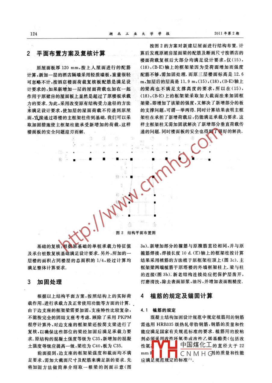 第26卷第2期2011年04月Vol 26 No. 2Journal of Hubei University of TechnologyApr.2011[文章編號(hào)]1003-4684(2011)020123-03建筑的加層改造設(shè)計(jì)耿紅湖北省機(jī)電研究設(shè)計(jì)院,湖北武漢430070)[摘要]結(jié)合漢口某大廈加層實(shí)例詳細(xì)介紹了加層改造設(shè)計(jì)的方法強(qiáng)調(diào)了加層改造設(shè)計(jì)中應(yīng)注意結(jié)構(gòu)方案的合理性,注重構(gòu)造處理[關(guān)鍵詞]加層改造;植筋;加固[中圖分類號(hào)]TU375[文獻(xiàn)標(biāo)識(shí)碼]:A在無(wú)建筑場(chǎng)地,擇址新建不可能,而投資資金不房,結(jié)構(gòu)形式為框架一剪力墻結(jié)構(gòu),兩塔之間間距足的情況下,加層改造就成為建設(shè)方最現(xiàn)實(shí)的選擇.8.7m~10.6m,裙房屋面標(biāo)高為8.4m,塔樓第三越來(lái)越多的業(yè)主提出了加層改造的要求.與新建的層面標(biāo)高為12.6m,一層地下室,基礎(chǔ)采用靜壓管相比,加層改造設(shè)計(jì)中最大的難點(diǎn)就在于結(jié)構(gòu)方案樁,裙房屋面按上人屋面設(shè)計(jì)該公司為了擴(kuò)展經(jīng)營(yíng)的設(shè)計(jì)合理性以及新舊結(jié)構(gòu)構(gòu)件連接處的構(gòu)造處范圍,欲在裙房屋面上加一層作為度假酒店,結(jié)構(gòu)平理.本文通過(guò)工程實(shí)例講述了加層改造結(jié)構(gòu)方案設(shè)面布置見(jiàn)圖1計(jì)和新舊結(jié)構(gòu)構(gòu)件連接處的加固方法和構(gòu)造措施(BA)~(BE)軸/(15)~(18)軸的范圍和(BE)~(E)軸范圍是裙房的部分屋頂平面,在此范圍1工程概況內(nèi)加一層作酒店,加層的結(jié)構(gòu)形式為框架結(jié)構(gòu),其余為33層的塔樓部分漢口某大廈為33層雙塔式高層建筑,二層裙圖1原結(jié)構(gòu)平面布置圖中國(guó)煤化工CNMHG[收稿日期]2010-09-13[作者簡(jiǎn)介]耿紅(1963-),女,湖北武漢人,湖北省機(jī)電研究設(shè)計(jì)院硎高級(jí)工程師,研究方向?yàn)榻ㄖこ毯惫I(yè)大學(xué)學(xué)報(bào)2011年第2期按圖2的方案對(duì)新建層屋面進(jìn)行結(jié)構(gòu)布置.計(jì)2平面布置方案及復(fù)核計(jì)算算后發(fā)現(xiàn)原裙房屋面梁的配筋及斷面尺寸按酒店的樓面荷載復(fù)核后大部分均滿足設(shè)計(jì)要求,僅(15),原屋面板厚120mm,按上人屋面進(jìn)行的配筋(18),(BE)軸上的框架梁因?yàn)槭芎擅嬖黾佣鴱?qiáng)度計(jì)算,新加一層的酒店隔墻采用輕質(zhì)墻板重量很輕配筋不夠需加固處理而原三層樓面標(biāo)高是126可忽略不計(jì),按酒店樓面荷載復(fù)核板配筋是滿足設(shè)m,加層后的層高是11.9m,(15),(18),(BE)軸上計(jì)要求的,如果新增加一層的屋面荷載也加在一起的梁高也不滿足支撐高度的要求,所以在(15),作用于原裙房的屋面板上顯然是超過(guò)了原樓板承載(18),(BE)上的框架梁采取加大截面法來(lái)加固框力的要求為此,采用改變?cè)薪Y(jié)構(gòu)受力途徑的方法架梁,即增加了該梁的強(qiáng)度,又解決了新增部分的板來(lái)滿足設(shè)計(jì)要求,使加層的屋面荷載不傳遞到原屋的支撐問(wèn)題,可謂一舉兩得.同時(shí)計(jì)算結(jié)果表明主框面宜接通過(guò)塔樓的主框架柱傳到基礎(chǔ)我們可以采架柱在承擔(dān)了新增荷載后,仍能滿足承載力要求這取加固措施使主框架柱能承受新增加的荷載這樣樣主框架柱無(wú)需加固就解決了新增部分垂直荷載傳樓面板的安全問(wèn)題迎刃而解遞的問(wèn)題.同時(shí)樓面板的安全也得到了很好的解決圖2結(jié)構(gòu)平面布置圖基礎(chǔ)的復(fù)核:根據(jù)原基礎(chǔ)的單樁承載力特征值3a)新增加部分的箍筋與原箍筋直徑相同,并與原及承臺(tái)樁數(shù)復(fù)核基礎(chǔ)滿足設(shè)計(jì)要求.另外,所加的一箍筋焊接,焊接長(zhǎng)度10d(E)軸上的框架柱按計(jì)算層樓的面積占同樓層的總面積的1/4,經(jīng)過(guò)計(jì)算均結(jié)果采用植筋的方法植于原框架柱頂上(圖3c).主滿足整體計(jì)算要求框架梁兩端植筋于原塔樓的外墻框架柱上.梁與柱的連接(圖3b).新老結(jié)構(gòu)連接處應(yīng)把保護(hù)層鑿開(kāi)3加固處理打磨清洗,除去表面原漿,油污,并增加表面粗糙度根據(jù)以上結(jié)構(gòu)平面方案按照結(jié)構(gòu)上的實(shí)際荷4植筋的規(guī)定及錨固計(jì)算載作用,進(jìn)行承載力及正常使用功能等方面的計(jì)算由于邊支座的框架梁需要加固,支座特性比較復(fù)雜,4.1植筋的規(guī)定不能按完全的固結(jié)支座考考慮顧除了采用PKPM混凝土結(jié)構(gòu)加固設(shè)計(jì)規(guī)范中規(guī)定植筋用的鋼筋程序計(jì)算外,對(duì)邊支座的框架梁還按簡(jiǎn)支梁進(jìn)行了需選用HRB335級(jí)熱軋帶肋鋼筋,鋼筋的質(zhì)量和性復(fù)核,以確保這些部位的梁經(jīng)加固后滿足承載力要能應(yīng)滿足國(guó)家有關(guān)規(guī)范標(biāo)準(zhǔn)的要求植筋用的膠粘求原結(jié)構(gòu)的混凝土強(qiáng)度等級(jí)為C35,新增加的混凝劑必須采用改性環(huán)氧類或改性乙烯基酯類(包括改土強(qiáng)度等級(jí)應(yīng)提高一級(jí),梁柱為C40,板為C35性氨中國(guó)煤化工的直徑大于22前面提到,邊支座的框架梁強(qiáng)度和截面均不滿mmCNMHG劑的質(zhì)量和性能足要求,需加大截面尺寸及配筋來(lái)滿足新的要求先應(yīng)滿足規(guī)范規(guī)定的標(biāo)準(zhǔn)將加固方法做簡(jiǎn)單介紹取一根梁的剖面示意(圖第26卷第2期耿紅