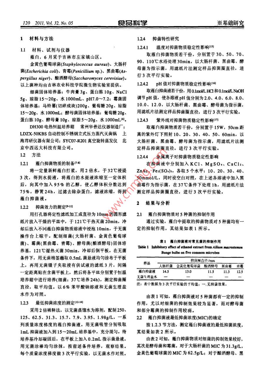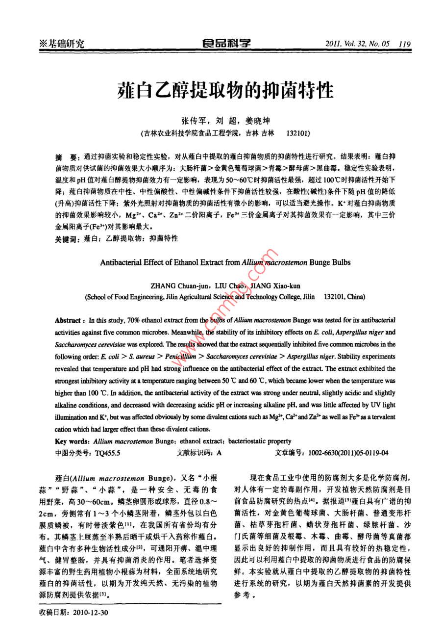 ※基礎(chǔ)研究食品科字201,vol.32,No.05119薤白乙醇提取物的抑菌特性張傳軍,劉超,姜曉坤(吉林農(nóng)業(yè)科技學(xué)院食品工程學(xué)院,吉林吉林132101)摘要:通過(guò)抑菌實(shí)驗(yàn)和穩(wěn)定性實(shí)驗(yàn),對(duì)從白中提取的白抑菌物質(zhì)的抑菌特性進(jìn)行研究。結(jié)果表明:薤白抑菌物質(zhì)對(duì)供試菌的抑菌效果大小順序?yàn)?大腸桿菌>金黃色葡萄球菌>青>酵母菌>黑曲霉穩(wěn)定性實(shí)驗(yàn)表明溫度和pH值對(duì)薤白醇提物抑菌效力有一定影響,表現(xiàn)為50~60℃時(shí)抑菌活性最強(qiáng),超過(guò)100℃時(shí)抑菌活性開(kāi)始下降:白抑菌物質(zhì)在中性、中性偏酸性、中性偏堿性條件下抑菌活性較強(qiáng),在酸性(堿性)條件下隨pH值的降低(升高)抑菌活性下降;紫外光照射對(duì)抑菌物質(zhì)的抑菌活性有微小的影響,可以適當(dāng)避光操作。K+對(duì)白抑菌物質(zhì)的抑菌效果影響較小,Mg2+、Ca2、Zn2二價(jià)陽(yáng)離子,Fe3+三價(jià)金屬離子對(duì)其抑菌效果有一定影響,其中三價(jià)金屬陽(yáng)離子(Fe3)對(duì)其影響最大。關(guān)鍵詞:白;乙醇提取物:抑菌特性 Antibacterial Effect of Ethanol Extract from Allium macrostemon Bunge Bulbs ZHANG Chuan-jun, LIU Chao, JIANG Xiao-kun (School of Food Engineering, Jilin Agricultural Science and Technology College, Jilin 132101, China) Abstract In this study, 70% ethanol extract from the bulbs of Allium macrostemon Bunge was tested for its antibacterial activities against five common microbes. Meanwhile, the stability of its inhibitory effects on. coli, Aspergillus niger and Saccharomyces cerevisiae was explored. The results showed that the extract sequentially inhibited five common microbes in the following order: E. coli >S. aureus Penic >Aspergillus niger. Stability experiments revealed that temperature and pH had strong influence on the antibacterial effect of the extract. The extract exhibited the the temperature was higher than 100 C. In addition, the al activity of the extract was strong under neutral, slightly acidic and slightly alkaline conditions, and dec ecreasing acidic pH or increasing alkaline pH, and was little affected by UV light illumination and K', but was affecte as Mg2,ca2and Zn2 as well as Fe as tervalent cation which had larger effect than these divalent cations. Key words: Allium macrostemon Bunge: ethanol extract: bacteriostatic property中圖分類(lèi)號(hào):TQ4555文獻(xiàn)標(biāo)識(shí)碼:A文章編號(hào):1002-6630(2011)05-0119-04白(Allium macrostemon Bunge),又名“小根現(xiàn)在食品工業(yè)中使用的防腐劑大多是化學(xué)防腐劑,蒜”“野蒜”、“小蒜”,是一種安全、無(wú)毒的食對(duì)人體有一定的毒副作用,開(kāi)發(fā)植物天然防腐劑是目用野菜,高30~60cm。鱗莖卵圓形或球形,直徑.8~前食品防腐研究的熱點(diǎn)1。據(jù)報(bào)道5薤白具有廣譜的抑2cm,旁側(cè)常有1~3個(gè)小鱗莖附著,鱗莖外包以白色菌活性,對(duì)金黃色葡萄球菌、大腸桿菌、普通變形桿膜質(zhì)鱗被,有時(shí)帶淡紫色山,在我國(guó)所有省份均有分菌、枯草芽孢桿菌、蠟狀芽孢桿菌、綠膿桿菌、沙布。其鱗莖上屜蒸至半熟后曬千或烘千入藥稱(chēng)作白。門(mén)氏菌等細(xì)菌及根霉、木、曲霉、酵母菌等真菌都薤白中含有多種生物活性成分,可通陽(yáng)開(kāi)痹、溫中理顯示出良好的抑制作用,而且具有較好的熱穩(wěn)定性,氣、健胃整腸,并具有抑菌消炎的作用。筆者選擇資因此可以利用白中提取的抑菌物質(zhì)進(jìn)行食品的防腐保源豐富的野生藥用植物小根蒜為材料,全面系統(tǒng)地研究鮮。本實(shí)驗(yàn)就從薤白中提取的乙醇提取物的抑菌特性薤白的抑菌活性,以期為開(kāi)發(fā)純天然、無(wú)污染的植物進(jìn)行系統(tǒng)的研究,以期為白天然抑菌素的開(kāi)發(fā)提供源防腐劑提供依據(jù)31參考收稿日期:2010-12-301202011,ol.32.no.05食品科字※基礎(chǔ)研究1材料與方法1.24抑菌特性研究11材料、試劑與儀器1.2.41溫度對(duì)抑菌物質(zhì)穩(wěn)定性影響5薤白,6月采于吉林市左家鎮(zhèn)山區(qū)。取薤白抑菌物質(zhì)若干份,分別置于30、50、70、金黃色葡萄球菌(Staphylococcus aureus)、大腸桿90、110℃水浴處理30min,以大腸桿菌、黑曲霉、酵菌(Escherichia coli)、青(Penicillium sp曲霉(A母菌為指示菌,用濾紙片法測(cè)定樣品抑菌圈直徑,進(jìn) pergillus niger)、釀酒酵母(Saccharomyces cerevisiae)行3次平行實(shí)驗(yàn)。以上菌種均由吉林農(nóng)業(yè)科技學(xué)院微生物實(shí)驗(yàn)室提供。1.2.4.2pH值對(duì)抑菌物質(zhì)穩(wěn)定性影響16細(xì)菌固體培養(yǎng)基:牛肉膏3g、蛋白陳10g、NaC取薤白抑菌液若份,用0.1 moVL HC和0.1 NaOH5g、瓊脂15~20g、水1000mL、pH7.0~7.2:菌固調(diào)節(jié)pH值,使各溶液pH值分別為2.0、4.0、6.0、8.0、體培養(yǎng)基:馬鈴薯(切碎成塊)200g、葡萄糖20g、瓊脂1.0、12.0,以大腸桿菌、黑曲霉、酵母菌為指示菌,15~20g、水1000mL;酵母菌固體培養(yǎng)基:葡萄糖20g用濾紙片法測(cè)定樣品抑菌圈直徑,進(jìn)行3次平行實(shí)驗(yàn)。蛋白陳10g、酵母膏10g、瓊脂5~20g、水10L61.2.4.3紫外線對(duì)抑菌物質(zhì)穩(wěn)定性影響DH300電熱恒溫培養(yǎng)箱常州華普達(dá)儀器制造廠取薤白抑菌物質(zhì)若千份,分別置于15W,50cm距LDX-50KBS自動(dòng)控制不銹鋼立式壓力蒸汽滅菌鍋上離的紫外燈下照射10、20、30、40、50、60min,以海茸研儀器有限公司:yCo7-R201真空旋轉(zhuǎn
