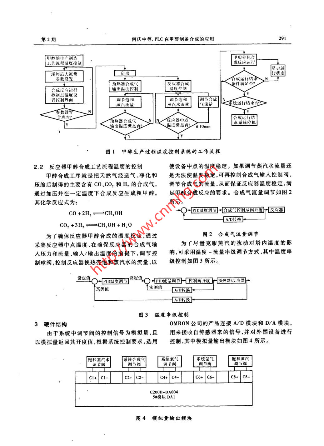 290化工自動(dòng)化及儀表第39卷PLC在甲醇制備合成的應(yīng)用.何慶中周鐵顧文武(四川理工學(xué)院機(jī)械工程學(xué)院,四川自貢643000)摘要介紹甲醇催化系統(tǒng)過程控制中溫度控制的要求和控制過程的運(yùn)行情況,采用 PLC實(shí)現(xiàn)甲酵催化系統(tǒng)的溫度控制,使甲醇催化合成的工藝參數(shù)保持在穩(wěn)定范圍內(nèi)。關(guān)鍵詞甲醇合成 溫度控制PLC中圖分類號(hào)TH862*.6文獻(xiàn)標(biāo)識(shí)碼1文章編號(hào)1000-3932(2012)02-0290-03隨著經(jīng)濟(jì)的迅猛發(fā)展,能耗需求也8益增大,(氮?dú)夂蜌錃?、冷卻水、飽和蒸汽和合成氣管道人們對新能源的研究和開發(fā)已成為能源開發(fā)的重控制閥的開度進(jìn)行調(diào)節(jié),實(shí)現(xiàn)控制閥的啟/停、傳點(diǎn)。甲醇能與大多數(shù)有機(jī)溶劑良好地混溶,在農(nóng)感器信號(hào)的采集以及調(diào)節(jié)閥開度等參數(shù)的自動(dòng)控藥、醫(yī)藥及汽油摻燒等許多領(lǐng)域都有應(yīng)用空間,成制,以滿足各階段設(shè)備的穩(wěn)定和工藝流程的平穩(wěn)為重要的化工基礎(chǔ)產(chǎn)品和代用燃料。近年來,眾進(jìn)行。筆者以甲醇催化制備工藝流程中的生產(chǎn)制多領(lǐng)域?qū)状嫉男枨笠踩找嬖鲩L"。但是甲醇遇造過程階段為重點(diǎn),介紹甲醇裝置溫度控制的自熱、明火或氧化劑時(shí)易著火。如何在安全生產(chǎn)的.動(dòng)化實(shí)現(xiàn)過程。其溫度控制系統(tǒng)由PLC,溫度、壓前提下,提高甲醇的產(chǎn)量,減少生產(chǎn)過程中的能力傳感器,流量計(jì),氫氣、氮?dú)?、合成氣、飽和蒸?耗,對于節(jié)能、降耗和環(huán)保有著重要的意義。和冷卻水調(diào)節(jié)閥組成。常用甲醇催化制備的合成工藝由于反應(yīng)溫度2甲醇催化制備過程溫度自控系統(tǒng)不易控制,反應(yīng)器熱穩(wěn)定性差以及催化劑的消耗甲醇的催化生產(chǎn)工藝流程主要由合成氣的催量大等因素,影響了合成反應(yīng)的速度,并導(dǎo)致合成化和反應(yīng)流程組成。為使合成塔內(nèi)的合成甲醇反氣利用率低、能耗大、排氣量高且生產(chǎn)成本高(2]。應(yīng)達(dá)到自身熱平衡,對預(yù)熱器催化后合成氣體的筆者提出采用一種新型的專為工業(yè)環(huán)境而設(shè)計(jì)的輸出溫度和反應(yīng)器的中點(diǎn)溫度的控制十分重要,工業(yè)控制裝置PLC,對甲醇的生產(chǎn)制造和催化劑直接影響到甲醇合成的反應(yīng)發(fā)生速度和合成效的還原進(jìn)行自動(dòng)控制,控制系統(tǒng)結(jié)構(gòu)簡單,有較高率,以及甲醇催化生產(chǎn)工藝流程過程的順利進(jìn).的可靠性,在保證控制要求和反應(yīng)進(jìn)行的同時(shí),在行叫。節(jié)能減排方面取得更積極的效果和明顯的經(jīng)濟(jì)效2.1預(yù)熱器合成氣輸出溫度的控制益合成氣的催化流程在預(yù)熱器中完成。該裝置甲醇催化制備合成系統(tǒng)及控制要求在確保合成氣輸人預(yù)熱器的壓力和流量的同時(shí),1.1 系統(tǒng)構(gòu)成通過調(diào)節(jié)控制球閥來控制飽和蒸汽的流量,使預(yù)甲醇催化制備的生產(chǎn)工藝由催化劑的還原控?zé)崞鬏敵龅暮铣蓺鉁囟却笥?90心,并且保證反制和甲醇生產(chǎn)制造過程,以及系統(tǒng)啟/停等控制過應(yīng)系統(tǒng)的壓力和溫度穩(wěn)定。甲醇生產(chǎn)過程溫度控程組成,其中催化劑的還原控制和甲醇生產(chǎn)制造制系統(tǒng)的工作流程如圖1所示。過程是甲醇催化制備過程中的兩個(gè)關(guān)鍵階段。1.2 系統(tǒng)控制要求甲醇催化制備生產(chǎn)控制系統(tǒng)通過對還原氣收稿日期:2011-10-24(修改稿).第2期何慶中等.PLC在甲醇制備合成的應(yīng)用291的生產(chǎn)制造甲醇催化合|甲醉的生產(chǎn)制造成反應(yīng)運(yùn)行山藝流程溫度控制」廠球閥最 大流一啟動(dòng)]參數(shù)設(shè)置個(gè)成運(yùn)行結(jié)預(yù)熱器合成(I反成器合成輸出調(diào)性控制溫度控制眾成反應(yīng)運(yùn)行挖制點(diǎn)溫度設(shè)置控制界面調(diào)節(jié)飽和調(diào)節(jié)合成”(流址 心系統(tǒng)運(yùn)彳結(jié)束督>系數(shù)沒界合理空之介成達(dá)行結(jié)熱器合成’NN/ 反應(yīng)器中點(diǎn)Y輸出溫度滿足2溫度滿足 10min| 束系統(tǒng)停機(jī)圖1甲醇生產(chǎn)過程溫度控制系統(tǒng)的工作流程2.2反應(yīng)器甲醇合成工藝流程溫度的控制使設(shè)備中點(diǎn)的溫度穩(wěn)定。如果調(diào)節(jié)蒸汽水流量還甲醇合成工序就是把天然氣經(jīng)造氣、凈化和是無法使溫度穩(wěn)定,可再控制合成氣輸人控制閥,壓縮后制得的主要含有CO .CO2和H2的合成氣,調(diào) 節(jié)合成氣的流量,從而保證反應(yīng)器溫度穩(wěn)定,滿通過加壓并在一定溫度下合成反應(yīng)生成粗甲醇。足甲醇合成反應(yīng)的要求。合成氣流量調(diào)節(jié)如圖2其化學(xué)反應(yīng)式為:所示。( )PID溫度調(diào)司企成(控制球閥升閔區(qū)應(yīng)器CO + 2H2 - =CH,0HMD轉(zhuǎn)換]-CO2 +3H2一=CH,OH + H2O .為了確保反應(yīng)器甲醇合成的溫度穩(wěn)定,通過圖2合成氣流量調(diào)節(jié)采集反應(yīng)器中點(diǎn)溫度,在確保反應(yīng)器的合成氣輸為了盡量克服蒸汽的擾動(dòng)對塔內(nèi)溫度的影入壓力和流量.輸入/輸出溫度的前提下,調(diào)節(jié)控響,可采用溫度-流量串級(jí)調(diào)節