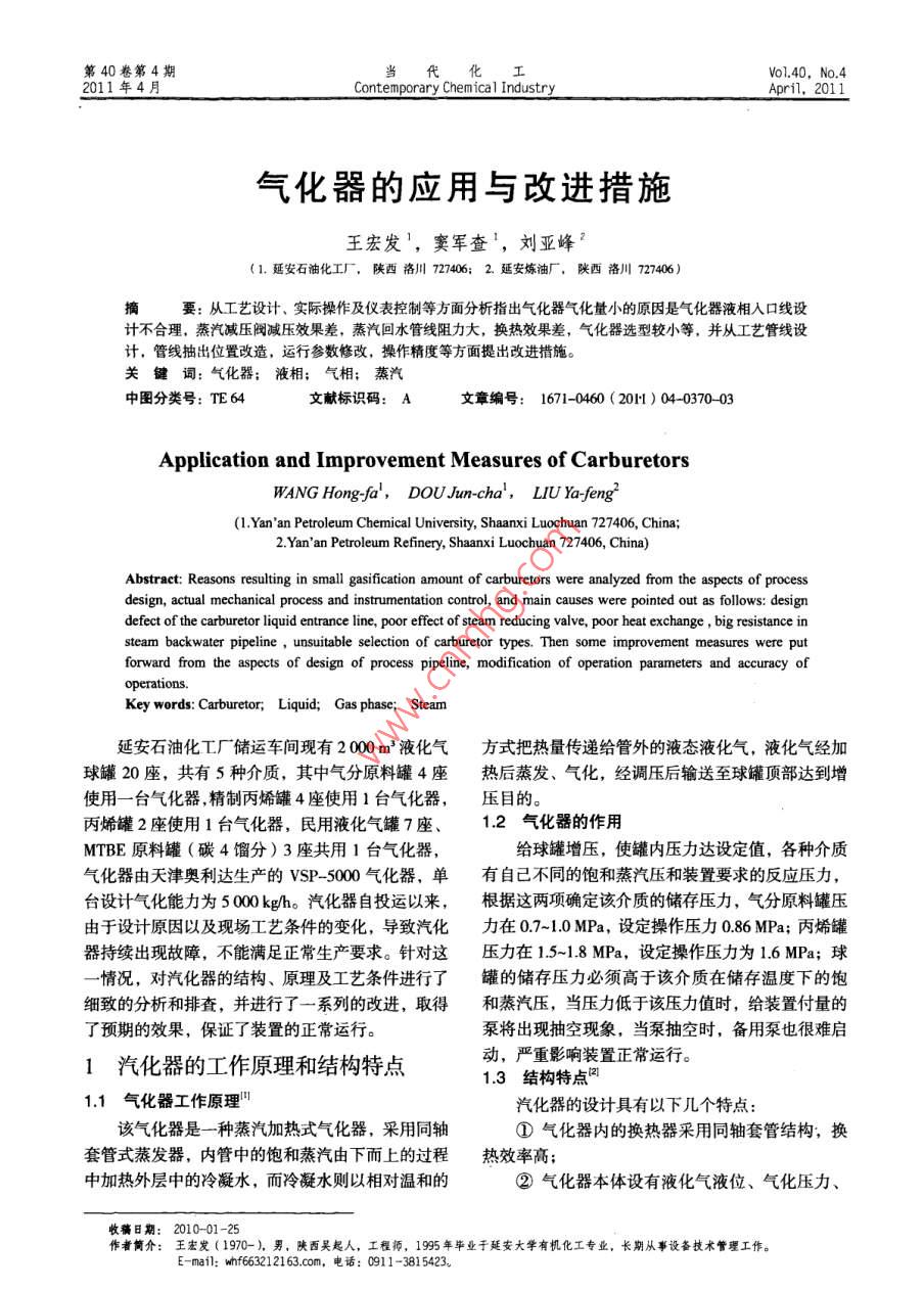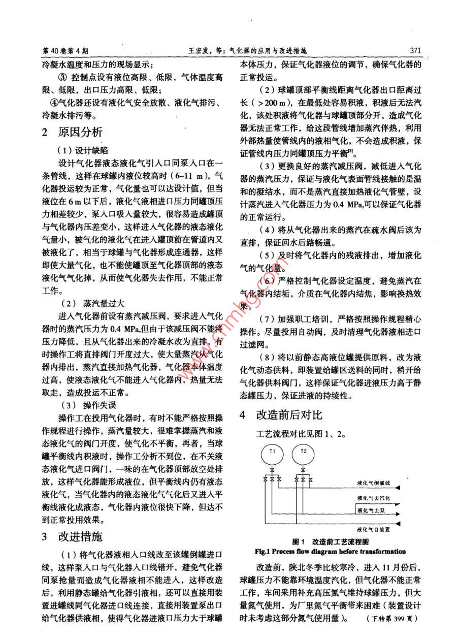 第40卷第4期當(dāng)代化1V0o1.40, No.42011年4月Contemporary Chemical IndustryApril, 2011氣化器的應(yīng)用與改進(jìn)措施王宏發(fā)',竇軍查',劉亞峰(1.延安石油化工廠(chǎng),陜西洛川727406; 2. 延安煉油廠(chǎng),陜西洛川727406)摘要:從工藝設(shè)計(jì)、實(shí)際操作及儀表控制等方面分析指出氣化器氣化量小的原因是氣化器液相入口線(xiàn)設(shè)計(jì)不合理,蒸汽減壓閥減壓效果差,蒸汽回水管線(xiàn)阻力大,換熱效果差,氣化器選型較小等,并從工藝管線(xiàn)設(shè)計(jì),管線(xiàn)抽出位置改造,運(yùn)行參數(shù)修改,操作精度等方面提出改進(jìn)措施。關(guān)鍵詞:氣化器;液相;氣相;蒸汽中圖分類(lèi)號(hào): TE 64文獻(xiàn)標(biāo)識(shí)碼: A文章編號(hào): 1671-0460 ( 20r ) 04-0370-03Application and Improvement Measures of CarburetorsWANG Hong-fa', DOUJun cha',LIU Ya-feng?(1.Yan'an Petroleum Chemical University, Shaanxi Luochuan 727406, China;2.Yan' an Petroleum Refinery, Shaanxi Luochuan 727406, China)Abstract: Reasons resulting in small gasification amount of carburetors were analyzed fom the aspects of processdesign, actual mechanical process and instrumentation control, and main causes were pointed out as follows: designdefect of the carburetor liquid entrance line, poor effect of steam reducing valve, poor heat exchange , big resistance insteam backwater pipeline ,unsuitable selection of carburetor types. Then some improvement measures were putforward from the aspects of design of process pipeline, modification of operation parameters and accuracy ofoperations.Key words: Carburetor, Liquid; Gas phase; Steam延安石油化工廠(chǎng)儲(chǔ)運(yùn)車(chē)間現(xiàn)有2 000 m2液化氣方式把熱量傳遞給管外的液態(tài)液化氣,液化氣經(jīng)加球罐20座,共有5種介質(zhì),其中氣分原料罐4座熱后蒸發(fā)、氣化,經(jīng)調(diào)壓后輸送至球罐頂部達(dá)到增使用一臺(tái)氣化器,精制丙烯罐4座使用1臺(tái)氣化器,壓目的。丙烯罐2座使用1臺(tái)氣化器,民用液化氣罐7座、1.2氣化器的作用MTBE原料罐(碳4餾分) 3座共用1臺(tái)氣化器,給球罐增壓,使罐內(nèi)壓力達(dá)設(shè)定值,各種介質(zhì)氣化器由天津奧利達(dá)生產(chǎn)的VSP- -5000氣化器,單有自己不同的飽和蒸汽壓和裝置要求的反應(yīng)壓力,臺(tái)設(shè)計(jì)氣化能力為5000kg/h。汽化器自投運(yùn)以來(lái),根據(jù)這兩項(xiàng)確定該介質(zhì)的儲(chǔ)存壓力,氣分原料罐壓由于設(shè)計(jì)原因以及現(xiàn)場(chǎng)工藝條件的變化,導(dǎo)致汽化力在0.7-1.0 MPa,設(shè)定操作壓力0.86 MPa;丙烯罐器持續(xù)出現(xiàn)故障,不能滿(mǎn)足正常生產(chǎn)要求。針對(duì)這壓力在1.5~1.8 MPa,設(shè)定操作壓力為1.6 MPa;球一情況,對(duì)汽化器的結(jié)構(gòu)、原理及工藝條件進(jìn)行了罐的儲(chǔ)存壓力必須高于該介質(zhì)在儲(chǔ)存溫度下的飽細(xì)致的分析和排查,并進(jìn)行了一系列的改進(jìn),取得和蒸汽壓,當(dāng)壓力低于該壓力值時(shí),給裝置付量的了預(yù)期的效果,保證了裝置的正常運(yùn)行。泵將出現(xiàn)抽空現(xiàn)象,當(dāng)泵抽空時(shí),備用泵也很難啟1汽化器的工作原理和結(jié)構(gòu)特點(diǎn)動(dòng),嚴(yán)重影響裝置正常運(yùn)行。1.3結(jié)構(gòu)特點(diǎn)問(wèn)1.1 氣化器工作原理"汽化器的設(shè)計(jì)具有以下幾個(gè)特點(diǎn):該氣化器是- -種蒸汽加熱式氣化器,采用同軸①氣化器內(nèi)的換熱器采用同軸套管結(jié)構(gòu),換套管式蒸發(fā)器,內(nèi)管中的飽和蒸汽由下而上的過(guò)程熱效率高;中加熱外層中的冷凝水,而冷凝水則以相對(duì)溫和的②氣化器本體設(shè)有液化氣液位、氣化壓力、收稿日期:2010-01-25作者簡(jiǎn)介:王宏發(fā)(1970-), 男,陜西吳起人,工程師,1995年畢業(yè)于延安大學(xué)有機(jī)化工專(zhuān)業(yè)。長(zhǎng)期從事設(shè)備技術(shù)管理工作。E-mail: whf663212163.com. 電話(huà): 0911-381 5423。第40卷第4期王宏發(fā),等:氣化器的應(yīng)用與改進(jìn)措施371冷凝水溫度和壓力的現(xiàn)場(chǎng)顯示;本體壓力,保證氣化器液位的調(diào)節(jié),確保氣化器的③控制點(diǎn)設(shè)有液位高限、低限,氣體溫度高正常投運(yùn)。限、低限,出口壓力高限、低限;(2)球罐頂部平衡線(xiàn)距離氣化器出口距離過(guò)④氣化器還設(shè)有液化氣安全放散、液化氣排污、長(zhǎng)( > 200 m),在最低處容易積液,積液后無(wú)法汽冷凝水排污等?;?,該處積液將氣化器與球罐頂部分開(kāi),造成氣化器無(wú)法正常工作,給這段管線(xiàn)增加蒸汽伴熱,利用2原因分析外部熱量使管線(xiàn)內(nèi)的液相氣化,不會(huì)造成積液,保(1)設(shè)計(jì)缺陷證管線(xiàn)內(nèi)壓力同罐頂壓力平衡”。設(shè)計(jì)氣化器液態(tài)液化氣引入口同泵人口在一(3)更換良好的蒸汽減壓閥,減低進(jìn)人氣化條管線(xiàn),這樣在球罐內(nèi)液位較高時(shí)(6-11 m),氣器的蒸汽壓力,保證與液化氣表面管線(xiàn)接觸的是溫化器投運(yùn)較為正常,氣化量也可以達(dá)設(shè)計(jì)值,但當(dāng)和的凝結(jié)水,而不是蒸汽直接加熱液化氣管壁,設(shè)液位在6m以下后,液化氣液相進(jìn)口壓力同罐頂壓計(jì)蒸汽進(jìn)入氣化器壓力為0.4 MPa,可以保證氣化器力相差較少,泵入口吸入量較大,很容易造成罐頂?shù)恼_\(yùn)行。與氣化器內(nèi)壓差變小,這樣進(jìn)入氣化器的液態(tài)液化(4)將從氣