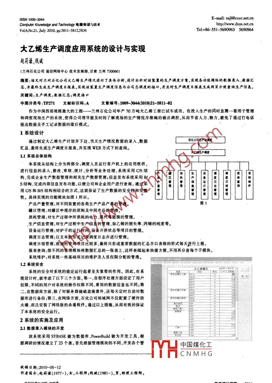 ISSN 1009- -3044E-mail: xji@ccc.net.cnComputer Knowledge and Technalogy電腦知識與技術(shù)htp/:wwww.et.cnVolL6,No.21, July 2010, p:5811-58125836Tel:+86- -51- 56909635690964大乙烯生產(chǎn)調(diào)度應(yīng)用系統(tǒng)的設(shè)計與實現(xiàn)趙莉謙,錢斌(蘭州石化公司通信網(wǎng)絡(luò)中心技術(shù)發(fā)展部,甘肅蘭州730060)摘要:該文對蘭州石化公司大乙烯生產(chǎn)情況進(jìn)行了具體分析,設(shè)計出針對該裝置的生產(chǎn)調(diào)度方案,實現(xiàn)各功能模塊的數(shù)據(jù)錄入、數(shù)據(jù)匯總,并最終生成生產(chǎn)調(diào)度日報表,實現(xiàn)該裝置生產(chǎn)調(diào)度信息與公司總調(diào)度的接口,并且對生產(chǎn)調(diào)度日報表生成網(wǎng)頁方便查詢生產(chǎn)信息。關(guān)鍵詞:生產(chǎn)調(diào)度;敷據(jù)匯總;調(diào)度接口中圖分類號:TP271文獻(xiàn)標(biāo)識碼:A文章編號:1009- 3044(2010)21- -5811-02作為中國西部規(guī)模最大的工程一-蘭 州石化公司年產(chǎn)70萬噸大乙烯工程已試車成功,在投入生產(chǎn)的同時急需一套用于管理和調(diào)度現(xiàn)場生產(chǎn)(的系統(tǒng).使得公司領(lǐng)導(dǎo)能及時的了解現(xiàn)場的生產(chǎn)情況并準(zhǔn)確的做出調(diào)控,從而節(jié)省人力、物力,避免了通過打電話.報送數(shù)據(jù)及手工記錄數(shù)據(jù)的落后模式。1系統(tǒng)設(shè)計通過制定大乙烯生產(chǎn)計劃并下達(dá)、當(dāng)天生產(chǎn)情況數(shù)據(jù)的錄人、數(shù)據(jù)石化公司生產(chǎn)總漏莊匯總、最終生成生產(chǎn)調(diào)度日報表,并實現(xiàn)WEB方式下的查詢。大乙城生產(chǎn)調(diào)度1.1系統(tǒng)總體結(jié)構(gòu)本系統(tǒng)從結(jié)構(gòu)上分為兩部分:調(diào)度人員運行客戶機(jī)上的應(yīng)用軟件,進(jìn)行信息的錄人、修改、審核統(tǒng)計、分析等業(yè)務(wù)處理,系統(tǒng)采用CIS結(jié)構(gòu),完成企業(yè)生產(chǎn)數(shù)據(jù)管理和相關(guān)生產(chǎn)數(shù)據(jù)管理;信息發(fā)布系統(tǒng)采用B/S結(jié)構(gòu),完成內(nèi)部信息發(fā)布功能,以便公司和企業(yè)用戶進(jìn)行查詢。通過采日用CIS和B/S結(jié)構(gòu)相結(jié)合的方式.這就保證了生產(chǎn)數(shù)據(jù)的安全性和完整性。具體實現(xiàn)的功能模塊如圖1所示。產(chǎn)品產(chǎn)量管理:對不同裝置的各類生產(chǎn)產(chǎn)品產(chǎn)量的管理。圖1罐區(qū)管理:對罐區(qū)中現(xiàn)存的原料及中間產(chǎn)品的管理。消耗管理:對生產(chǎn)過程中所消耗的電力、蒸汽等能源的管理。,生產(chǎn)信息管理:對生產(chǎn)過程中生產(chǎn)信息的管理.如乙烯的損失率、丙烯的純度等。設(shè)備運行管理:對爐子的運行時間設(shè)備開停狀態(tài)等項目的管理。調(diào)度日志管理:以文本的形式記錄調(diào)度日志并進(jìn)行管理。調(diào)度日報管理:前面的管理項目比較多,最終只形成重要數(shù)據(jù)的匯總并以表格的形式每天進(jìn)行上報。報表查詢:按不同的管理模塊將數(shù)據(jù)匯總的一張表 上,這樣查閱起來快捷方便,不用再分查每個子模塊。系統(tǒng)維護(hù):對系統(tǒng)一些基礎(chǔ)項目的維護(hù)及人員權(quán)限分配的管理。1.2系統(tǒng)安全大乙地球區(qū)系統(tǒng)的安全對系統(tǒng)的穩(wěn)定運行起著至關(guān)重要的作用。因此,在系統(tǒng)設(shè)計時,就考慮了以下三個方面。第一,在程序處理方面設(shè)定了用戶權(quán)限,不同的用戶對系統(tǒng)的操作權(quán)限不同,看到的數(shù)據(jù)信息也不同;第二,在數(shù)據(jù)庫方面,除了對服務(wù)器做磁盤鏡像外,還每天定時自動對數(shù)據(jù)庫進(jìn)行備份;第三,在網(wǎng)絡(luò)方面,石化公司局域網(wǎng)不僅配置了硬件防火墻、而且安裝了網(wǎng)絡(luò)版的殺毒軟件。通過以上措施.從而有效的保證了本系統(tǒng)的安全運行。2系統(tǒng)的實施及應(yīng)用2.1數(shù)據(jù)錄入模塊的開發(fā)該系統(tǒng)采用SYBASE做為數(shù)據(jù)庫,PowerBuild做為開發(fā)工具,根據(jù)調(diào)研的情況建立了23個表。首先根據(jù)管理模塊的不同,開發(fā)各個管中國煤化工YHCNMHG收稿日期:2010- 05-12作者簡介:趙莉謙(1977-),女,工程師;錢斌(1981-),男,助理工程師。.......軟件設(shè)計開發(fā).5811Computer Knowedge and Technology電隋知識與技術(shù)第6卷第21期(2010年7月)理子模塊數(shù)據(jù)錄人接口。各個模塊的維護(hù)項目在系統(tǒng)維護(hù)子模塊中設(shè)置圖2為產(chǎn)品產(chǎn)量管理輸人模塊的錄人界面。2.2數(shù)據(jù)匯總對已錄人的基礎(chǔ)數(shù)據(jù)進(jìn)行統(tǒng)計、分析、計算等業(yè)務(wù),按需求查詢部分主要信息生成調(diào)度日報表,并將生成的8報表轉(zhuǎn)存為EXCEL文檔進(jìn)行上傳。圖3為生成的一張8報表并進(jìn)行上傳。2.3實現(xiàn)與公司總調(diào)度系統(tǒng)的接口將該裝置生成的調(diào)度日報表信息自動插人到公司總調(diào)度系統(tǒng)中,就要實現(xiàn)與公司總調(diào)度系統(tǒng)的接口,以下為實現(xiàn)接口的部分代碼:CONNECT USING SQLCA;CONNECT USING SQLCA1;圈3CONNECT USING SQLCA2;DECLARE cl CURSOR FORSELECT T sc. _GONCYI _QK.DANWEL _BIANMA,T .SC_ CONGYL QK.GY _XUHAO,T_ SC CONCYI _QK.XUHAO,T_ SC. CONGYI _QK.DUI _YING _WH,T SC_ CONGDUAN.SHUAXIN _ZHOUQIFROM T. sc. CONGDUAN,TL sC_ GONCYL QKWHERE(T_ SC_ CONGYI QK.DANWEL ,