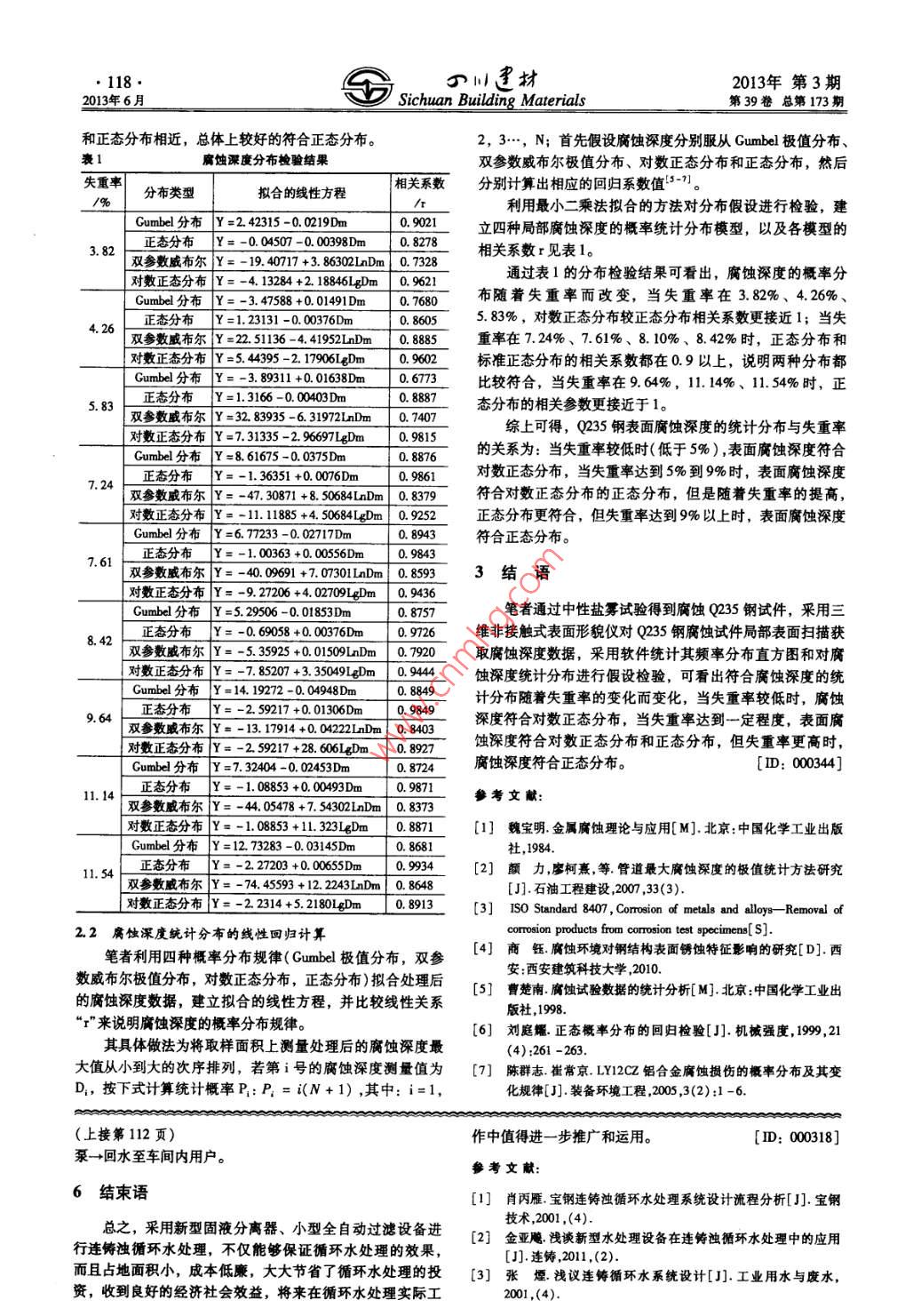 112小材2013年第3期2013年6月2 Sichuan Building Materials第39卷總第173期DoI:10.3969/jisn.1672-4011.2013.03.050新型水處理設備在連鑄濁循環(huán)水處理中的運用探究呂超,劉長升(河北鋼鐵集團石家莊鋼鐵有限責任公司,河北石家莊050031)摘要:文章指出了新型固液分高器、小型全自動過大大提高了過濾分離的效率;該設備在排污的時候不需要濾設備的特點,分析了他們在連鑄濁循環(huán)水處理系統(tǒng)的運反沖洗水,節(jié)約了排污水,不會出現(xiàn)流量損失;在過濾分用,并介紹了連鑄濁循環(huán)水處理的工藝流程。實際運用表離的時候設備沒有任何運動產(chǎn)生,不會出現(xiàn)機械設備磨損明,該工藝不僅占地面積小,而且成本低廉,能夠顯著節(jié)的情況;設備不需要外部動力,節(jié)約了能源。關鍵詞:新型水處理設備;連鑄濁循環(huán)水處理;圓液3新型固液分離器在連鑄濁循環(huán)水處理的運用分離器;全自動過濾設備將該設備運用到連鑄濁循環(huán)水處理系統(tǒng)中,利用固液中圖分類號:X703.3文獻標志碼:B分離器取代了二次沉淀池、中高速過濾器、化學除油器等文章編號:1672-4011(2013)03-0112-02等。新型固液分離器能夠分離出3μm至9mm比例大于液1現(xiàn)有連鑄濁循環(huán)水處理工藝介紹體的固體顆料,連鑄濁循環(huán)水經(jīng)過一次鐵皮沉淀池處理后,其出水完全符合被分離固體顆粒的要求。通過一次沉淀池連鑄濁循環(huán)水的運用范圍主要包括二次噴淋冷卻、設去除水中浮油,直接上冷卻塔,排出的廢水送污泥處理設備直接冷卻、火焰切割機、火焰清理機用水等,具有較為施。運用固液分離器進行水處理不僅能夠節(jié)省水處理占地廣泛的運行空間,在實際工作中發(fā)揮重要的作用。水中含還方便對設備的管理和維護,具有良好的效果。其水處理有大量的氧化鐵皮、少量的潤滑油和油脂。目前常用的工工藝流程如下:車間內(nèi)各用戶含氧化鐵皮水→氧化鐵皮溝藝流程能夠有效的去除水中的Ss雜質(zhì),并使得水溫得以降次鐵皮沉淀池→固液分離器→冷卻塔→冷水池→冷水低,符合工藝生產(chǎn)的要求。但是該水處理工藝所使用的都池提升泵→回水至車間內(nèi)用戶。是大型水處理構(gòu)筑物,設備的構(gòu)造復雜,占地面積十分巨大,往往占到主車間用地面積的一半左右。在工業(yè)用地面4小型全自動過濾設備介紹積日益緊張的情況下,修建大規(guī)模的水處理設備不切合實在構(gòu)成上,它是由標準罐體根據(jù)所需過濾流量組和而際,況且上述設備數(shù)量眾多,維護和管理工作量大。因此,成,標準罐體的直徑為0.91m,長度為2.0m的臥式罐,必須采用新型的水處理設備,以減少設備占地,收到更好罐體為碳鋼材料,內(nèi)外部都有一層特殊的防腐和抗化學腐的水處理效果。蝕的保護層,系統(tǒng)的進出水管均為UPvC管材。每個罐體2新型固液分離器介紹之前都有玻璃透明人孔,這樣就可以隨時觀察罐內(nèi)過濾情況,設備采用壓力形式,全自動方式運行,設備具有以下(1)工作原理。該設備根據(jù)離心分離原理,經(jīng)過相應幾個方面的顯著特點:反沖效率高、反沖時間短、在反沖的加工和處理,將液體中的可沉淀固體物分離出來,進而洗的時候能夠節(jié)水;安裝簡單方便,系統(tǒng)的占地面積小,滿足水處理的實際需要。在固液分離器內(nèi)部,進行著加速系統(tǒng)比較輕,不需要特殊地基,一般水泥地基就滿足要求運動,產(chǎn)生高速旋轉(zhuǎn)的渦流,從而將液體中的固體雜質(zhì)高效率的分離出來。該設備的分離效果顯著,能夠分離出35小型全自動過濾設備在連鑄濁循環(huán)水處理系統(tǒng)Jm至9mm比例大于液體的固體顆料。在單級分離系統(tǒng)中的運用中,對74μm等級的固體物,能達到98%以上的分離效果;將該設備運用到連鑄濁循環(huán)水處理系統(tǒng)中,主要是利在雙級分離系統(tǒng)中,對40m等級的固體物,也可達到用小型全自動過濾設備取代中高速過濾器,從而實現(xiàn)水處98%的分離效果。此外,該設備的水處理效果十分顯著理,達到良好的水處理效果。從水質(zhì)的角度來看,經(jīng)過能夠處理懸浮物含量高達2500mL的污水,不管是何等次沉淀池之后,連鑄濁循環(huán)水處理系統(tǒng)的水質(zhì)懸浮物含量惡劣環(huán)境下的水,都能夠滿足處理要求。不大于100mg/L,而供水控制懸浮物在30mg/L左右的指(2)新型固液分離器特點。主要表現(xiàn)在以下幾個方面:標,因此,小型全自動過濾設備完全可以起到過濾水質(zhì)的過濾的時候不需要濾網(wǎng)和濾盤,所以在過濾的時候,不會效果,該設備能夠被運用于連鑄濁循環(huán)水處理中,能夠收出現(xiàn)堵網(wǎng)、堵盤現(xiàn)象,也不用更換濾袋,省去了很多的工到良好的效果。利用該設備進行水處理的工藝流程如下作,提高了過濾效率,過濾分離能夠連續(xù)無止境的進行,車間內(nèi)各用戶含氧化鐵皮水→氧化鐵皮溝→一次鐵皮沉淀池→小型全自動過濾設備→冷卻塔→冷水池→冷水池提升作者簡介:呂超(1979-),男,河北石寡莊人,主要研究方向:冶金廢水(下轉(zhuǎn)第118頁)處理,確環(huán)水處理。118H理材2013年第3期2013年6月2 Sichuan Building Materials第39卷總第173期和正態(tài)分布相近,總體上較好的符合正態(tài)分布。2,3…,N;首先假設腐蝕深度分別服從 Gumbel極值分布、表1腐燭深度分布檢驗結(jié)果雙參數(shù)威布
