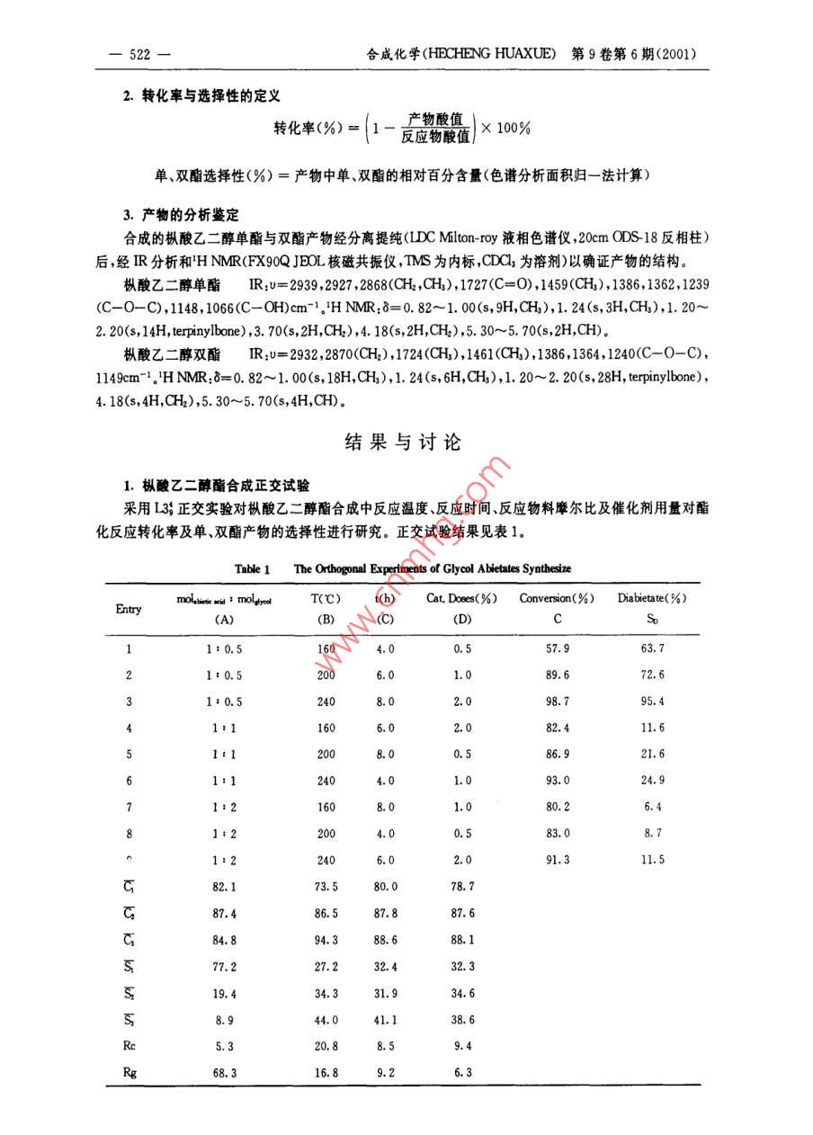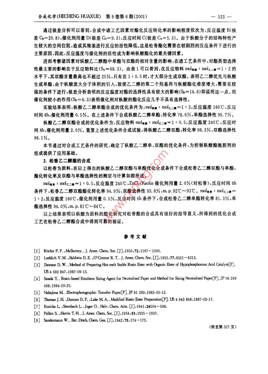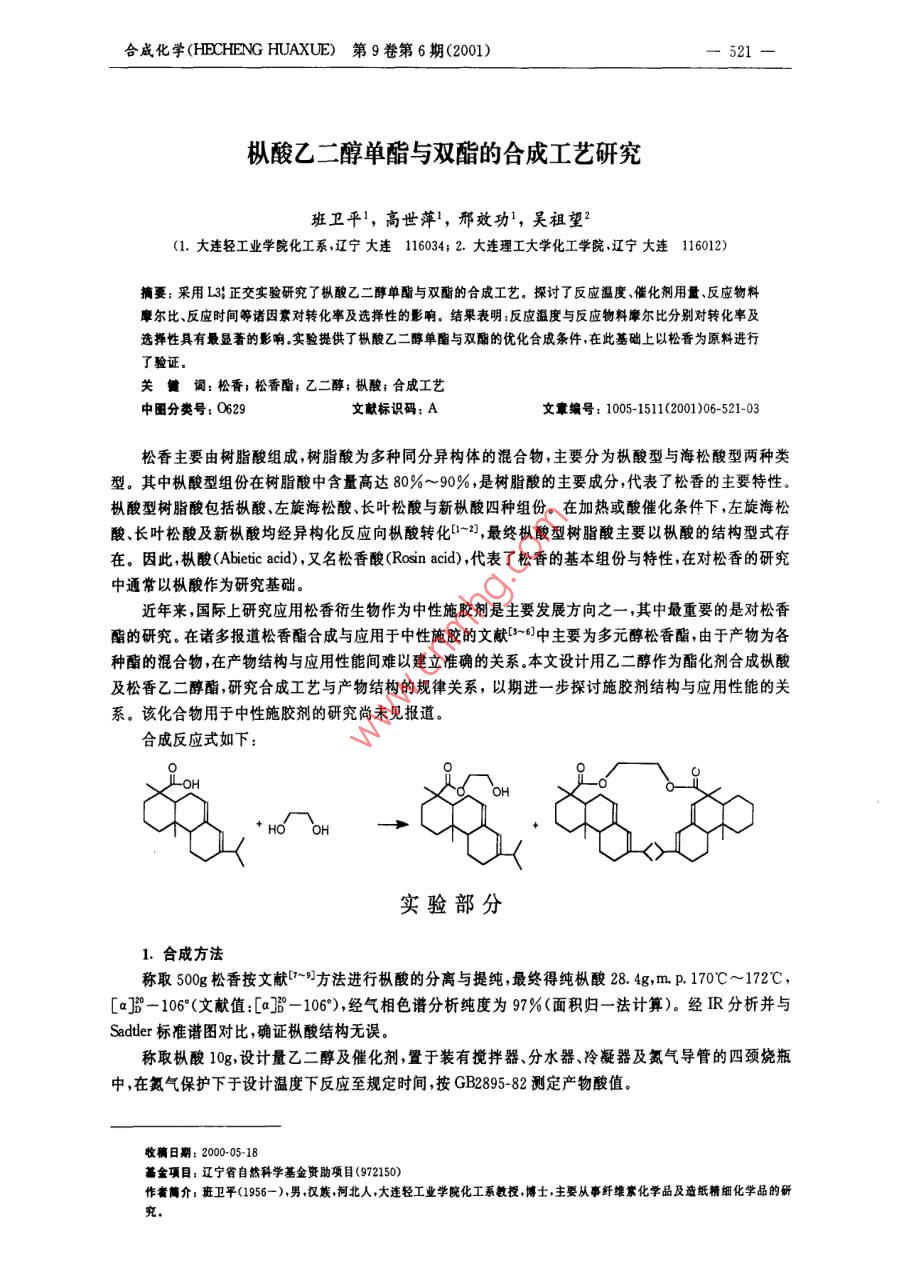 合成化學(HECHENG HUAXUE)第9卷第6期(2001)521樅酸乙二醇單酯與雙酯的合成工藝研究班衛(wèi)平1,高世萍1,那效功1,吳祖望2(1.大連輕工業(yè)學院化工系,遼寧大連116034;2大連理工大學化工學院遼寧大連116012摘要:采用L3正交實驗研究了樅酸乙二醇單酯與雙酯的合成工藝探討了反應溫度、催化劑用量、反應物料摩爾比、反應時間等諸因素對轉化率及選擇性的影響。結果表明:反應溫度與反應物料摩爾比分別對轉化率及選擇性具有最顯的影響實驗提供了樅酸乙二醇單酯與雙酯的優(yōu)化合成條件,在此基礎上以松香為原料進行了驗證關鍵詞:松香;松香酯;乙二醇;樅酸;合成工藝中分類號:0629文獻標識碼:A文章編號:1005-1511(2001)06-521-03松香主要由樹脂酸組成,樹脂酸為多種同分異構體的混合物,主要分為樅酸型與海松酸型兩種類型。其中酸型組份在樹脂酸中含量高達80%~90%,是樹脂酸的主要成分,代表了松香的主要特性。樅酸型樹脂酸包括樅酸、左旋海松酸、長葉松酸與新樅酸四種組份。在加熱或酸催化條件下,左旋海松酸、長葉松酸及新樅酸均經異構化反應向樅酸轉化2,最終樅酸型樹脂酸主要以樅酸的結構型式存在。因此,樅酸(Abietic acid),又名松香酸(Rosin acid),代表了松香的基本組份與特性,在對松香的研究中通常以樅酸作為研究基礎。近年來,國際上研究應用松香衍生物作為中性施膠劑是主要發(fā)展方向之一,其中最重要的是對松香酯的研究。在諸多報道松香酯合成與應用于中性施膠的文獻6中主要為多元醇松香酯,由于產物為各種酯的混合物,在產物結構與應用性能間難以建立準確的關系本文設計用乙二醇作為酯化劑合成樅酸及松香乙二醇酯,研究合成工藝與產物結構的規(guī)律關系,以期進一步探討施膠劑結構與應用性能的關系。該化合物用于中性施膠劑的研究尚未見報道。合成反應式如下:實驗部分1.合成方法稱取500g松香按文獻[7~方法進行樅酸的分離與提純,最終得純樅酸28.4g,mp.170℃~172℃,[a]106(文獻值:[a]-106°),經氣相色譜分析純度為97%面積歸一法計算)經R分析并與 Sadtler標準譜圖對比,確證樅酸結構無誤。稱取樅酸10g,設計量乙二醇及催化劑,置于裝有攪拌器、分水器、冷凝器及氮氣導管的四頸燒瓶中,在氮氣保護下于設計溫度下反應至規(guī)定時間,GB2895-82測定產物酸值。收稿日期:2000-05-18基金項目:遼寧省自然科學基金資助項目(972150)作者簡介:班衛(wèi)平(1956一),男,漢族,河北人,大連輕工業(yè)學院化工系教授,博士,主要從事纖維素化學品及造紙精細化學品的研究522合成化學(HECHENG HUAXUE)第9卷第6期(2001)2.轉化率與選擇性的定義產物酸值轉化率(%)=1-反應物酸值100%單、雙酯選擇性(%)=產物中單、雙酯的相對百分含量(色譜分析面積歸一法計算)3.產物的分析鑒定合成的樅酸乙二醇單酯與雙酯產物經分離提純(LDC Milton--roy液相色譜儀,20 cm ODS-18反相柱)后,經IR分析和HNMR(FX90Q JBOL核磁共振儀Ms為內標,CDC3為溶劑)以確證產物的結構。樅酸乙二醇單酯IR:=2939,2927,2868(C2,CH3),1727(C=O),1459(CH3),1386,1362,1239(c--c),1148,1066(-oh)cm-1hnmr:8=0.82~1.00(s,9h,ch3),1.24(s,3h,h3),1.20~2.20(s,14h, terpinylbone),3.70(s,2h,ch2)4.18(s,2h,ch2),5.30~5.70(s,2h,ch)樅酸乙二醇雙酯IR:U=2932,2870(CH2),724(CH3),1461(CH3),1386,1364,1240(-0-C),1149cm-hnmr:=0.82~1.00(s,18hch3),1.24(s,6h,ch3),1.20~2.20(s,28h, terpinylbone),4.18(s,4h,ch2),5.30~5.70(s,4h,ch結果與討論1.樅酸乙二醇酯合成正交試驗采用L3正交實驗對樅酸乙二醇酯合成中反應溫度反應時間反應物料摩爾比及催化劑用量對酯化反應轉化率及單、雙酯產物的選擇性進行研究。正交試驗結果見表1 Table The Orthogonal Experiments of Glycol Abietates Synthesize Entry molbicse molyed T(C) t(h) Cat. Doses() Conversion() Diabietate(%)(A)(B)(C(D)CS1:0.51604.00.557.963.71:0.52006.01.089.672.61:0.52408.02.098.795.41:11606.02.082.411.62345678。RR1:12008.00.586.921.61:12404.01.093.024.91:21608.01.080.26.41:22004.00.583.08.71:22406.02.091.311.582.173.580.078.787.486.587.887.684.894.388.688.177.227.232.432.319.434.331.934.68.944.041.138.65.320.88.59.468.316.89.26.3合成化學(HECHENG HUAXUE)第9卷第6期(2001)523一通過極差分析可以看到,合成中諸工藝因素對酯化反應轉化率的影響程度依次為:反應溫度B(極差C=20.8),催化劑用量D(極差C=9.3,反應時間C(極差CA=5.3)。由于樅酸分子的結構特性產生較大的空間位阻,造成其羧基進行反應的活性降低這是松香酯化需要在較劇烈的反應條件下進行的主要原因,因此,反應溫度與催化劑的活性成為影響樅酸酯化的最關鍵因素。進而考察諸因素對縱酸乙二醇酯中單酯與雙酯的相對含量的影響,在諸工藝條件中,對酯類型選擇性最主要的影響在于反應物料比(SA=68.3)。由表1可以看到,在反應物料 molg molz二=1:2的水平下,其雙酯含量最高也不超過25%,只有在10.5時,才大部分生成雙酯。表明乙二醇優(yōu)先與樅酸生成單酯,由于樅酸龐大分子體積的引入,致使乙二醇的第二個羥基再與樅酸酯化難度增大需要在較強的條件下進行,極差分析表明的反應溫度對酯的選擇性具有較大的影響(S=16.8)即說明這一點。而催化劑較小的作用(S=6.3)表明催化劑對樅酸的酯化反應幾乎不具有選擇性。實驗結果表明:樅酸乙二醇單酯合成的優(yōu)化條件為: molg molz二=1:2,反應溫度160℃,反應時間6h,催化劑用量0.5%。在上述條件下合成樅酸乙二醇單酯,轉化率78.6%,單酯選擇性95.7%樅酸乙二醇雙酯合成的優(yōu)化條件為:反應物料mol:molz二=1:0.5,反應溫