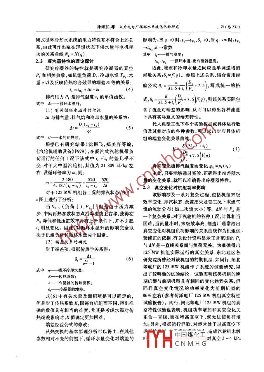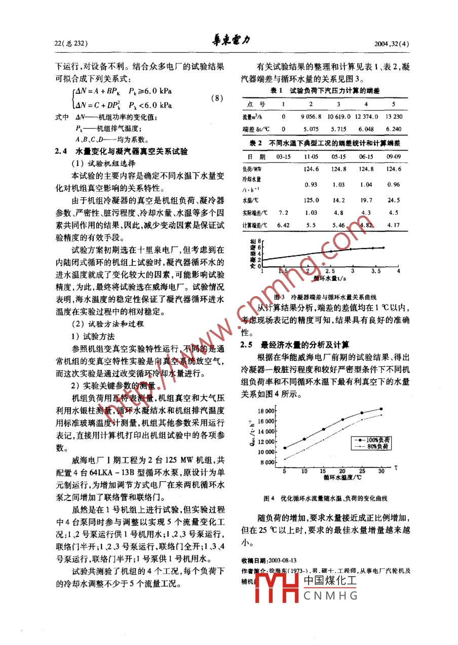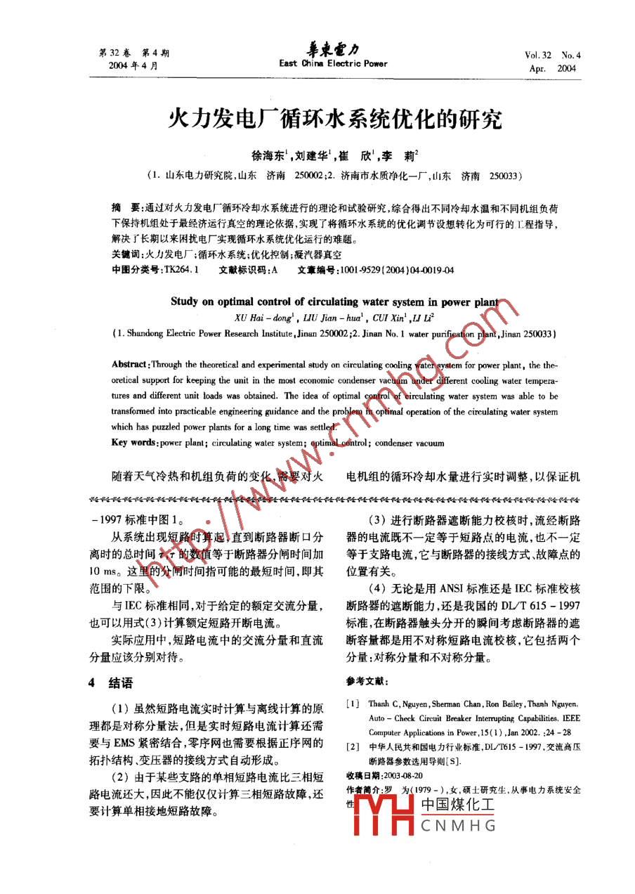 第32卷第4期羊柬電力.Vol.32 No.42004年4月East China Electric PowerApr. 2004火力發(fā)電廠循環(huán)水系統(tǒng)優(yōu)化的研究徐海東',劉建華',崔欣',李莉(1.山東電力研究院,山東濟南250002;2. 濟南市水質凈化- -廠,山東濟南25003)摘要:通過對火力發(fā)電廠循環(huán)冷卻水系統(tǒng)進行的理論和試驗研究,綜合得出不同冷卻水溫和不同機組負荷下保持機組處于最經濟運行真空的理論依據(jù),實現(xiàn)了將循環(huán)水系統(tǒng)的優(yōu)化調節(jié)設想轉化為可行的I程指導,解決了長期以來困擾電廠實現(xiàn)循環(huán)水系統(tǒng)優(yōu)化運行的難題。關鍵詞:火力發(fā)電廠;循環(huán)水系統(tǒng);優(yōu)化控制;凝汽器真空中圖分類號:TK264. 1文獻標識碼:A文章編號 :1009529(2004 )04-0019-04Study on optimal control of circulating water system in power plantXU Hai -dong' , UU Jian- hua' , CUI Xin' ,II Li(1. Shandong Elctrie Power Research Institute ,Jinan 250002 ;2. Jinan No. 1 water purification plant,Jinan 250033 )Abstrat:Through the theoretical and experimental study on circulating coling water sysem for power plant, the theorelical support for keeping the unit in the most economic condenser vacuum under diferent cooling waler tempera-tures and dfferent unit loads was obtained. The idea of optimal control of circulating water system was able to betransformed into practicable engineering guidance and the problem in optinal operation of the circulating water systemwhich has puzzled power plants for a long time was sttled.Key words :power planl; circulating water system; optimal control; condenser vacuum隨著天氣冷熱和機組負荷的變化,需要對火電機組的循環(huán)冷卻水量進行實時調整,以保證機-1997標準中圖1。(3)進行斷路器遮斷能力校核時,流經斷路從系統(tǒng)出現(xiàn)短路時算起,直到斷路器斷口分器的電流既不-定等于短路點的電流,也不一定離時的總時間r,T的數(shù)值等于斷路器分閘時間加等于支路電流,它與斷路器的接線方式、故障點的10ms。這里的分閘時間指可能的最短時間,即其位置有關。范圍的下限。(4)無論是用ANSI標準還是IEC標準校核與IEC標準相同,對于給定的額定交流分量,斷路 器的遮斷能力,還是我國的DL/T 615 - 1997也可以用式(3)計算額定短路開斷電流。標準,在斷路器觸頭分開的瞬間考慮斷路器的遮實際應用中,短路電流中的交流分量和直流斷容量都是用不對稱短路電流校核,它包括兩個分量應該分別對待。分量:對稱分量和不對稱分量。4結語參考文獻:(1)雖然短路電流實時計算與離線計算的原1] Thanh C, Nguyen, Sherman Chan, Ron Bailey , Thanh Nguyen.Auto - Check Circuit Breaker Iteruping Capabilies. IEEE理都是對稱分量法,但是實時短路電流計算還需Computer Aplications in Power,1S(1) ,Jan 2002. :24 -28要與EMS緊密結合,零序網(wǎng)也需要根據(jù)正序網(wǎng)的2] 中華人民共和國電力行業(yè)標準, DL/T615 - 1997,交流高壓拓撲結構變壓器的接線方式自動形成。斷路器參數(shù)選用導則[S].(2)由于某些支路的單相短路電流比三相短收稿日期2003-08-20路電流還大,因此不能僅僅計算三相短路故障,還作者簡介:羅為(1979-),女 .碩士研究生,從事電力系統(tǒng)安全中國煤化工要計算單相接地短路故障。YHCNMHG20(總230)阜柬電力.2004 ,32(4)組處于“最有利真空”下運行,實際上電廠普遍缺00C[_ 計算工況- -10C, 80%機組負荷 (224t/h, 排汽)乏有效、準確的運行指導依據(jù),再加上調節(jié)手段有800t限,對于每臺機組全年實際上只采用兩個甚至一600個冷卻水流量運行(即單、雙泵運行),由此引起400、AN= 0N- AN系統(tǒng)供水和機組實際需求之間的嚴重失衡,加大ONm了機組的冷端損失。-200根據(jù)查新和調研結果,國內外在電廠循環(huán)水6000 8000 1000 12000 14000 16000 18000循環(huán)水流量/i.h系統(tǒng)優(yōu)化調節(jié)方面的應用技術研究較少,現(xiàn)有的文獻僅限于對循環(huán)水系統(tǒng)優(yōu)化調節(jié)設想等原理性圖1最佳循環(huán)水 量計算原理示意圖的闡述,遠未達到工程應用的程度。當前電廠只是根據(jù)經驗、現(xiàn)象以及簡單的試驗得出的極不準確的數(shù)據(jù)指導循環(huán)水系統(tǒng)的運行調節(jié)。主要是“看真空”、“看電流"、機組運行能水景qrh’否“滿負荷"等進行簡單的判斷和操作;有的電廠已經進行了一些摸索試驗,但因為眾多因素和條圖2循環(huán)水管路阻力特性示意圖件的限制難于獲取有意義的結論,尤其是當過分阻力與水量關系H =f(q)用拋物線表示具有強調“小指標”競賽時,得出的觀點可能與機組的足夠的精度:實際需要背道而馳。H=H。+aq + bq2(1)少數(shù)電廠雖然增設了流量調節(jié),改變了落后式中H-- 循環(huán)水系統(tǒng)的阻力, 即與之匹配的水泵揚的臺數(shù)調節(jié)模式,但因缺乏控制依據(jù)而只能手動程;操作,無法實現(xiàn)自動控制,更談不上優(yōu)化調節(jié)。a、b-均為系數(shù)。則循環(huán)水所獲得的有效能量為:1電廠循環(huán)水系統(tǒng)優(yōu)化的基本原理N有=gHq通常,在特定的循環(huán)水溫下,循環(huán)冷卻水量若式中N一-循環(huán)水泵的有效功率;增加Aq將提高汽輪機組的排汽真空,從而使機g--重力加速度。組負荷相應增加ANg,但水泵電耗也相應增加考慮泵和電機效率后,實際電機耗功為: .ON,,所獲凈效益為AN = AN, - AN,;當水量的增N電n=N在_ g(Ho+aq+bq*) .q(3)η.pη.np加使得水溫差減小的幅度變小時,對真空的影響式中nn,一一電機、水泵效