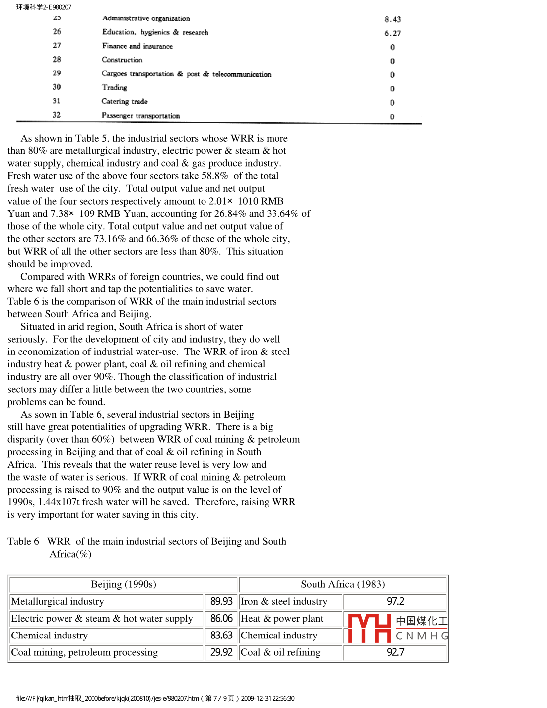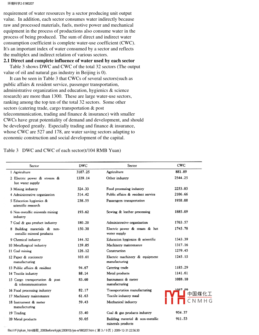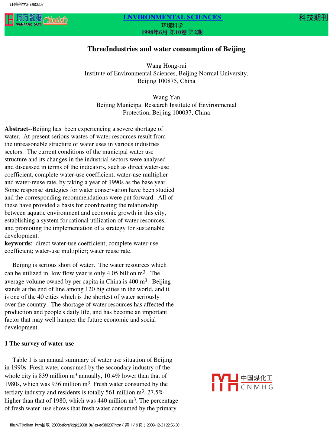 環(huán)境科學(xué)2- E980207日萬萬數(shù)據(jù)(hinalnfENVIRONMENTAL SCIENCES科技期刊WANFANG DATA環(huán)境科學(xué)1998年6月第10卷第2期ThreeIndustries and water consumption of BeijingWang Hong-ruiInstitute of Environmental Sciences, Beijing Normal University,Bejjing 100875, ChinaWang YanBejjing Municipal Research Institute of EnvironmentalProtection, Beijing 100037, ChinaAbstract-- Beijing has been experiencing a severe shortage ofwater. At present serious wastes of water resources result fromthe unreasonable structure of water uses in various industriessectors. The current conditions of the municipal water usestructure and its changes in the industrial sectors were analysedand discussed in terms of the indicators, such as direct water-usecoefficient, complete water-use coefficient, water-use multiplierand water-reuse rate, by taking a year of 1990s as the base year.Some response strategies for water conservation have been studiedand the corresponding recommendations were put forward. All ofthese have provided a basis for coordinating the relationshipbetween aquatic environment and economic growth in this city,establishing a system for rational utilization of water resources,and promoting the implementation of a strategy for sustainabledevelopment.keywords: direct water-use coefficient; complete water-usecoefficient; water-use multiplier; water reuse rate.Beijing is serious short of water. The water resources whichcan be utilized in low flow year is only 4.05 billion m3. Thaverage volume owned by per capita in China is 400 m3. Beijingstands at the end of line among 120 big cities in the world, and itis one of the 40 cities which is the shortest of water seriouslyover the country. The shortage of water resources has affected theproduction and people's daily life, and has become an importantfactor that may well hamper the future economic and social1 The survey of water useTable 1 is an annual summary of water use situation of Beijingin 1990s. Fresh water consumed by the secondary industry of thewhole city is 839 million m3 annually, 10.4% lower than that of中國煤化工1980s, which was 936 million m3. Fresh water consumed by theMHCNM HGtertiary industry and residents is totally 561 million m3, 27.5%higher than that of 1980, which was 440 million m3. The percentageof fresh water use shows that fresh water consumed by the primaryfle// vqikan. _htm抽取20k010)jiesj e980207.htm(第1/ 9頁) 2009 12-31 2:56:30環(huán)境科學(xué)2- E980207industry takes 61.5% if total fresh water consumed. Thus it'sclear that agriculture is still a large water-use sector. Lowwater reuse rate (12. 17%) shows there is a great water-savingpotentiality in the primary industry. Fresh water consumed byresident was 112 million m3, taking up 3.1% of the total water-usein a year of 1980s. Fresh water consumed by resident is 4.8% oftotal fresh water use in Beijing, 1.7% higher than that of 1980s.Table 2 shows the comparison of the fresh water between the twoperiods.Table 1 Water consumption of Beijing( 103m3)Type ofThe primaryThe secondaryThe tertiaryAnnual totalHousehold useconsumptionindustryTotal water use74.4125.4743.084.11Fresh water36.3722.378.393.861.75Tap water1.422.421.39Well water22.8217.173.851.44River water8.325.203.12Reuse water38.013.1034.690.25Reuse rate51.1212.1780.526.08Percentage of|fresh water10061.523.110.64.8|consumed,%Notes:fresh water refers to tap-water,well eater and river waterTable 2Rates of fresh water consumed by the three industriesin 1980s and 1990s(%)TimeTotalThe primary industry| The secondary industryResident use1980s61.626.11990sNotes:primaryb industry :agricultrual &mine;secondary industry:manufacture;tertiary industry:services ectTable 2 shows that the rate of fresh water consumed by theprimary industry varies only a little, while the rate by thesecondary industry dropped 3%, and that by the tertiary industryand resident use increased. It is mainly because water reuse rateof the secondary industry rose quickly.中國煤化工2 Analysis of water-use coefficient of each sectorMHCNM HGDirect water-use coefficient (DWC) is the direct consumptioncoefficient of each production sector, reflecting the directfle// vqikan. htm抽取20k010)jiesj e980207.htm(第2/ 9頁) 2009 12-31 2:56:30環(huán)境科學(xué)2- E980207requirement of water resources by a sector producing unit outputvalue. In addition, each sector consumes water indirectly becauseraw and processed materials, fuels, motive power and mechanicalequipment in the process of productions also consume water in theprocess of being produced. The sum of direct and indirect waterconsumption coefficient is complete water-use coefficient (CWC).It's an important index of water consumed by a sector and reflectsthe multiplex and indirect relation of various sectors.2.1 Direct and complete influence of water used by each sectorTable 3 shows DWC and CWC of the total 32 sectors (The outputvalue of oil and natural gas industry in Beijing is 0).It can be seen in Table 3 that CWCs of several sectors(such aspublic affairs & resident service, passenger transportation,administrative organization and education, hygienics & scienceresearch) are more than 1300. These are large water-use sectors,ranking among the top ten of the total 32 sectors. Some othersectors (catering trade, cargo transportation & posttelecommunication, trading and finance & insurance) with smallerCWCs have great potentiality of demand and development, and shouldbe developed greatly. Especially trading and finance & insurance,whose CWC are 527 and 178, are water saving sectors adapting toeconomic construction and social development of the capital.Table 3 DWC and CWC of each sector(t/104 RMB Yuan)SectorDWCCWC1 Agriculture3187.25Agriculture881.892 Electric power & stream &1339.14Other industry2544.25hor water supply3 Mining industry324.33Food processing indusry2253.034 Admninistrative organization314.42Publie afaics & resident service2106.66S Eduxcat