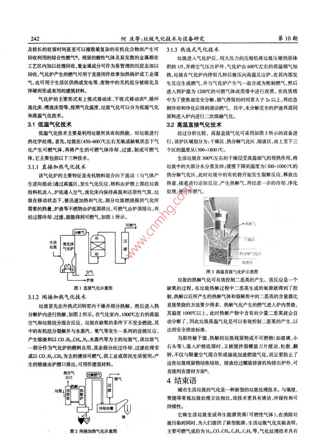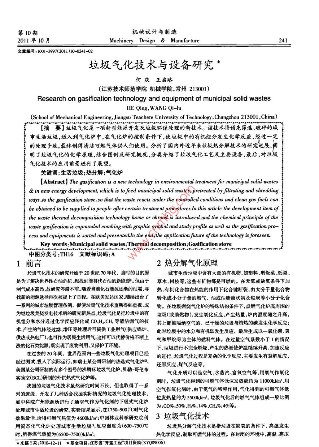 第10期機(jī)械設(shè)計(jì)與制造2011年10月MachineryDesign & Manufacture241文章編號(hào): 1001 399(2011)10-0241-02垃圾氣化技術(shù)與設(shè)備研究*何慶王啟路(江蘇技術(shù)師范學(xué)院機(jī)械學(xué)院,常州213001)Research on gasification technology and equipment of municipal solid wastesHE Qing, WANG Qi-lu(School of Mechanical Engineering,Jiangsu Teachers University of Technology ,Changzhou 213001 ,China)[摘要]垃圾氣化是一項(xiàng)新型能源 開發(fā)及垃圾環(huán)保處理的新技術(shù)。該技術(shù)將預(yù)先篩選破碎的城市生活垃圾,送入到氣化爐中,在氣化爐的控制條件下,使垃圾中的有機(jī)組分發(fā)生化學(xué)反應(yīng),經(jīng)過一定的處理手段,最終制得清潔可燃?xì)怏w供人們使用。分析了國(guó)內(nèi)外近年來垃圾熱分解技術(shù)的研究進(jìn)展,闡明了垃圾氣化的化學(xué)原理,結(jié)合圖例及研究概況,分類介紹了垃圾氣化工藝及主要設(shè)備,最后,對(duì)垃圾氣化技術(shù)的應(yīng)用前景進(jìn)行了展望。關(guān)鍵詞:生活垃圾;熱分解;氣化爐[ Abstract] The gasificaion is a new technology in enwironmental treatment for municipal solid wastes& in new energy development, which is 1o feed municipal solid wastes, pretreated by filtrating and shreddingways. ,to the gasification stove ,s0 that the waste reacts under the controlled conditions and clean gas fiuels canbe obtained to be supplied to people after certain treatment procedures.In this article the development item ofthe uwaste thermal decomposition technology home or abroad is introduced and the chemical principle of thewaste gasification is expounded combing with graphic symbol and study profile as well as the gasification pro-cess and equipments is sorted and presentedIn the end ,the application future of the technology is foreseenKey words:Municipal solid wastes;Thermal decomposition;Gasification stove中圖分類號(hào):TH16文獻(xiàn)標(biāo)識(shí)碼:A1前言2熱分解氣化原理垃圾氣化技術(shù)的研究開始于20世紀(jì)70年代,當(dāng)時(shí)的目的原城市生活垃圾中含有大量的有機(jī)物,如塑料、剩飯菜、紙類、是為了解決世界性石油危機(jī),想找到能替代石油的新能源。但由于草木、樹枝等,這些有機(jī)物都是可燃的。在無氧或缺氧條件下加制氣成本高昂,故研究停滯不前。隨著當(dāng)前化石能源逐漸的枯竭,尋熱, 有機(jī)化合物在熱能的作用下化合鍵斷裂,由大分子量化合物找新的能源途徑再次被提上了日程。在歐美發(fā)達(dá)國(guó)家,陸續(xù)出臺(tái)了轉(zhuǎn)化成小分子量的燃?xì)狻⒂突蛴椭籂钗锛敖固康刃》肿踊弦幌盗械某鞘欣芾項(xiàng)l例,促使垃圾氣化技術(shù)重新得到重視,成 物。在垃圾燃燒氣化爐的特殊結(jié)構(gòu)條件下,點(diǎn)燃?xì)饣癄t底周圍的為繼垃圾焚燒發(fā)電技術(shù)后的研究新熱點(diǎn)。垃圾化是把垃圾中的有垃圾(或助燃物),發(fā)生氧化反應(yīng),產(chǎn)生熱量,爐內(nèi)溫度隨之升高,機(jī)組分和水分通過化學(xué)反應(yīng)轉(zhuǎn)化成CO.H2CH4等清潔燃?xì)獾募计渖喜勘桓艚^空氣的、已干燥的垃圾與灼熱的碳發(fā)生化學(xué)反應(yīng);術(shù),產(chǎn)生的氣體經(jīng)過濾、增壓等處理后可提供工業(yè)燃?xì)?供應(yīng)鍋爐、此時(shí)垃圾中的水分和有機(jī)碳發(fā)生反應(yīng),最后生成以- -氧化碳、氫供熱或熱電廠),也可作為居民生活用氣,這樣可以代替價(jià)格不斷上氣和甲烷等為主體的燃料氣體。在過量空氣系數(shù)小于1的情況漲的化石類能源,既實(shí)現(xiàn)了廢物利用,又保護(hù)了環(huán)境。下,垃圾進(jìn)行不完全燃燒,產(chǎn)生的熱量使?fàn)t溫繼續(xù)升高,加速反應(yīng)在過去的20年間,世界范圍內(nèi)一些垃圾 氣化處理項(xiàng)目已經(jīng)的進(jìn)行。垃圾氣化過程是復(fù)雜的化學(xué)反應(yīng),主要發(fā)生有裂解反應(yīng)、經(jīng)過測(cè)試,投入了實(shí)際運(yùn)行,如瑞士某公司研制的熱選式氣化爐風(fēng)、還原反應(yīng)煤氣反應(yīng)等。美國(guó)某公司研制的有多個(gè)型號(hào)的沸騰床垃圾氣化爐、貝勒.哥倫布?xì)饣橘|(zhì)可以是空氣、水燕汽、富氧空氣等,用氧氣作氧化實(shí)驗(yàn)室(BCL)研制的外供熱式氣化爐等。我國(guó)的垃圾氣化技術(shù)雖然研究時(shí)間不長(zhǎng),但也取得了一系劑時(shí),垃圾氣化得到的可燃?xì)怏w低位發(fā)熱量約為1000k J/m?,用列的進(jìn)展,開發(fā)了幾種適合我國(guó)實(shí)際情況的垃圾氣化處理技術(shù),空氣作氧化劑時(shí),由于氮?dú)獾南♂屪饔?,氣化得到的可燃?xì)怏w低如中科院廣州能源所進(jìn)行了通空氣作為氣化劑的下吸式氣化爐位發(fā)熱量約為50kJ/m?,垃圾氣化后的燃?xì)鈿怏w組成一般比例處理城市生活垃圾的研究,實(shí)驗(yàn)結(jié)果顯示,在(750-900)9C時(shí)氣化為:CO%:50%、H2%: 14% .CH%:4%等。效果最佳.所得可燃?xì)鉄嶂禐?0Jm';中國(guó)林業(yè)科學(xué)研究院利3 垃圾氣化技術(shù)用流態(tài)化氣化爐處理城市生活垃圾用,反應(yīng)溫度為(600~750)心垃圾熱分解氣化技術(shù)是指垃圾在缺氧的條件下,高溫發(fā)生時(shí),所得煤氣熱值為(6500-7500)kJm’。熱化學(xué)反應(yīng),制取可燃?xì)怏w的過程。在封閉的環(huán)境中,高溫、高壓*來稿日期:2010-12-11★ 基金項(xiàng)目:江蘇省“青藍(lán)工程”項(xiàng)目資助(KYQ09006)242何慶等:垃圾氣化技術(shù)與設(shè)備研究第1