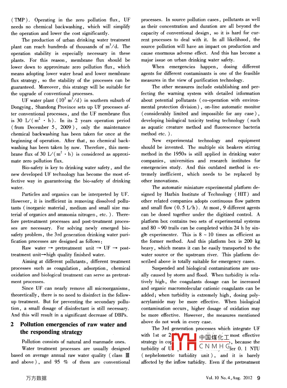 Drinking water safety and the developmentof purification technologyLi Guibai( Harbin Institute of Technology,Harbin 150090, China)Abstract: This paper briely introduced the evolution of purification technology for drinking water over time. Afterdescription of the 1st generation processes in the beginning of the 20th centuryconventional processes and the 2ndgeneration processes in 1970sintegrated processes was proposed. Moreover ,reaction measures ( dosing variety of regents for different contaminants)for urban source water emergencies.were ilustrated in brief. A new technology of KMnO, and potassium permanganatecomposite (PPC) for drinking water purification which was developed by Harbin Institute of Technology (HT) wasconcisely introduced.Key words: urban drinking water safety ;tertiary purifcation processes; UF ;source water emergencies and the reactionplan;KMnO4 and PPCrious drinking water safety problem, the bio-safetylUrban drinking water purificationproblem.technology and its developmentAt the beginning of the 20th century, the proces-In China,pollution in water source is relativelysef coagulation- -sedimentation- -filtration- -disin-serious. And this mainly affects bio-safety and chemi-fection ( chlorine ) for water treatment were invented.cal safety of urban drinking water.Using the processes,particle contaminants can be reIn recent years,emergencies of water source pol-moved and disease-causing bacteria can be inactivated,lutionhappen frequently, and serious events evenso epidemics can be efectively controlled. The proces-strike at intervals. It has posed a considerable threat toses were named as 1st generation drinking water purifi-urban drinking water safety.cation processes and also known as conventional treat-With the deteriorating of water environment atment processes. In the middle period of the 20th cen-home and aboard,drinking water sanitary standard hastury, the epidemic of viral infectious disease via drink-been constantly raised. New drinking water sanitarying water appeared. It was found that the epidemicsstandard ( GB 5749- 2006) issued in 2006 containscould be controlled by decreasing turbidity, so it was106 water-quality indicators which are far more thanfollowed with close attention then. And this had im-that in 1986 ' s edition, with 35 items only.pelled the development of 1st generation processes.The increasing gap between the deterioration oConsidering the contribution of 1 st generation processeswater source and the raising drinking water standardo human being, United States Engineering andpromotes the development of drinking water purificationScience Community selected it as the 4th greatesttechnology.engineering achievement of the 20th century.Social needs are the driving force behind the ad-In the 1970' s, numerous toxic organic pollutantsvance of science and technology. The advance ofand chlorinated disinfection byproducts ( DBPs) weredrinking water purification technology is introduced asfound in drinking water. This is another serious drink-follows.ing water safety problem, the chemical safety problem.In the past, the safety of urban drinking waterst generation processes can remove natural organiccould not be guaranteed,which caused the prevalencematerial ( NOM) to some extent, hence diminishingof drastically bacterial epidemics ( such as cholera ,the generation of DBPs. However, it was insufficient indysentery,typhoid, etc. ) via drinking water. Thisremoving to)中國煤化工a new purifica-was the first time that people were confronted with a se-tion technoloMCNMHGthattime.Receited 8 March 2012Vol. 10 No. 4,Aug.2012 7It is found that 03 oxidation and activated carbonlows: virus being 20 ~ several hundred nm,bacteriumadsorption perform well in treating toxic micropolluta-being several hundred nm ~ several μum, protozan be-nts. The 1 st generation processes coupling with O3-ing several μm ~ umpty μm,algae being severalGAC ( granular activated carbon) have the advantageμum ~ several hundred μm.of removing toxic micropollutants ,thus controlling theThe pore size of microfiltration ( MF) is 100 ~DBPs. The processes are referred as advanced treat-200 nm which is not small enough to intercept bacteriamenor 2nd generation processes. 2nd generationand virus. The pore size of nanofiltration( NF) isprocesses have been commonly used aboard, while it is1 nm or so,and this size of ultrafiltration ( UF) isgradually applied at home.several nm. Both of them can almost remove all the mi-At the end of the 20th century, the major drinkingcroorganisms in water, so they are considered as thewater safety problem which was represented by giardia-best method for enhancing bio-safety. It is suggestedsis and cryptosporidium appeared. This was consideredthat the pore size of UF membrane used for drinkingas new bio-safety problem.water treatment should not be bigger than 20 nm. NFGiardiasis and cryptosporidium are pathogenicmembrane is expensive and high energy-consuming,protozoa with wide distribution in nature, and they canwhile the price of UF membrane has been reduced toparasitize in animals or human. The cyst cell of giar-an acceptable level, so that UF has become the mostdiasisisovate,8~12μminlength,7~10μminsuitable processes for large-scale urban water treatmentwidth; the oocyst of cryptosporidium is globular inlant.shape, 4 ~6 μm in length.UF processes can almost remove all the microor-The aforementioned cyst or oocyst cells will con-ganisms in water, which will surely enhance bio-safetytaminate the raw water through the excretion of ani-of drinking water. And this will bring about a greatmals. When water treatment processes fail, the cellsrevolution for drinking water purification processes.can penetrate through the filter bed. With strong chlo-The application of UF in drinking water plant canrine resistance,the cyst has drastic pathogenicity asreplace 1 st generation processes:well. This disease happened frequentlyaround theRaw water-→UF-→disinfection- + fin