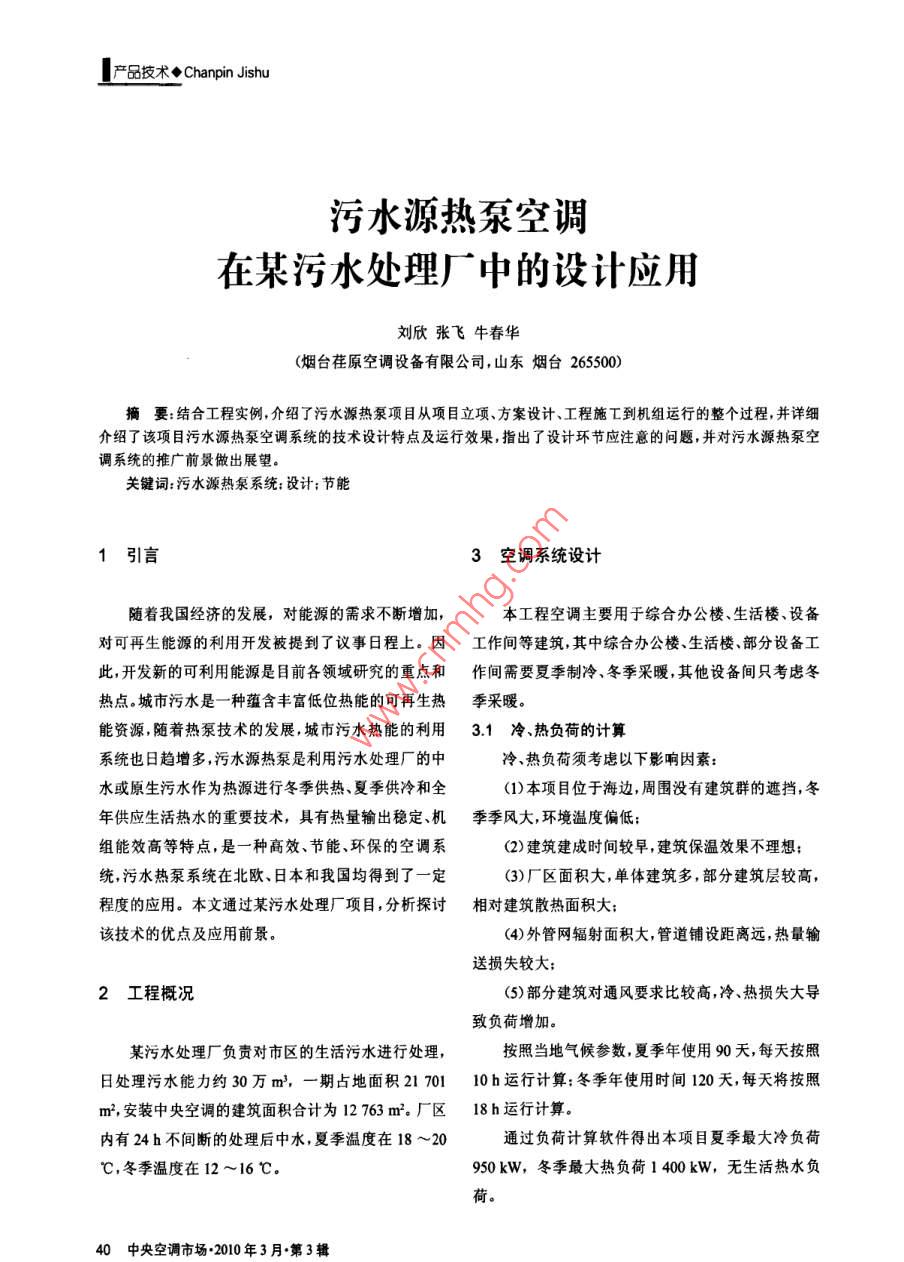 污水源熱泵空調(diào)在某污水處理廠中的設(shè)計應(yīng)用