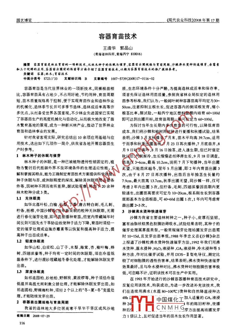 園藝博覽《現(xiàn)代農(nóng)業(yè)科技》2008年第17期容器育苗技術(shù)王清華郭晶山(青海省林科所,青梅西寧810016)摘要容器育苗是林業(yè)育苗的一項(xiàng)新技術(shù) ,從林木種子的休眠與催芽、容器苗出圃規(guī)格與育苗周期、沙棘沸水燙種快速催芽,赤霉素和三十烷醇的應(yīng)用、容器苗出圃前的煉苗等方面介紹了容器育苗技術(shù),以期為容器育苗技術(shù)的推廣提供參考。關(guān)鍵詞容器;林木;育苗技術(shù)中圈分類(lèi)號(hào)S723.1*33 文獻(xiàn)標(biāo)識(shí)碼 B文章編號(hào) 1007-5739(2008)17-0116-02容器育苗是當(dāng)代世界林業(yè)的一項(xiàng)新技術(shù)。同裸根苗相質(zhì),生態(tài)環(huán)境條件+分嚴(yán)酷,為提高造林成活率和保存率,比,容器育苗具有占地少、不占用好地、節(jié)約用種、育苗周期須首先保證造林用苗質(zhì)量。參照我省林業(yè)局?jǐn)M定的造林用短、苗木質(zhì)量規(guī)格易于控制.便于實(shí)現(xiàn)育苗作業(yè)和造林作業(yè)苗參考標(biāo)準(zhǔn),我們認(rèn)為:一般闊葉樹(shù)種容器苗高平均定為30~的機(jī)械化造林季節(jié)長(zhǎng)并可多季節(jié)造林、造林成活率高等許50cm,注意抑制主根生長(zhǎng),促進(jìn)容器內(nèi)的側(cè)須根發(fā)育,縮小多優(yōu)點(diǎn),從而備受世界各國(guó)重視。不少林業(yè)先進(jìn)國(guó)家已實(shí)現(xiàn)根莖比率。據(jù)試驗(yàn),一般西寧地區(qū)塑料溫棚內(nèi)培育60~100d了容器苗生產(chǎn)的高度機(jī)械化與自動(dòng)化,從而極大地改變了苗即可達(dá)到出圃月標(biāo)。故育苗周期一般可擬定為60~100d。木繁育基地的景觀,成為-種新興林產(chǎn)業(yè),推動(dòng)了世界林業(yè)為探討當(dāng)年生長(zhǎng)期內(nèi)多次育苗的可行性,以降低育苗育苗和造林事業(yè)的發(fā)展。成本,我們將沙棘和榆樹(shù)兩樹(shù)種進(jìn)行夏播和秋播試驗(yàn)。結(jié)果針對(duì)我省客觀實(shí)際,研究總結(jié)出10余項(xiàng)應(yīng)用基礎(chǔ)與應(yīng)表明:沙棘3月末秋播至7月末,苗木平均高39.7cm,適用用技術(shù),選出如下幾項(xiàng)作一簡(jiǎn)介,供我省各地開(kāi)展容器苗生于雨季和秋季出圃造林。7月23日再次播種,7月底苗齊,8產(chǎn)時(shí)參考。月9日吐生真葉,8月16日抽莖,進(jìn)入速生期,但已時(shí)值定1林木種子的休眠與催芽秋以后,氣候漸冷,生長(zhǎng)緩慢進(jìn)而停滯生長(zhǎng),9月18日調(diào)查,林木種子的休眠,是一-種已被植物遺傳性鎖固定的,植苗高僅3~6cm,最高10.2cm。 說(shuō)明7月下旬播種,當(dāng)年出圃物為繁衍后代抵御外界不良環(huán)境條件的生理適應(yīng)性能。了無(wú)望,只能苗床越冬,翌年5月出圃,即2年內(nèi)育苗出圃3解和掌握其特點(diǎn),能為正確制定育苗技術(shù)方案提供科學(xué)依據(jù)。次。由于8月27日再次播種,出苗后當(dāng)年抽莖生長(zhǎng)量約種子休眠與否,或休眠程度的深淺,解除其休眠所需必要條7.9cm,最大苗高13.7cm。秋季出圃無(wú)望.同沙棘一樣,僅可件等,因樹(shù)種不同而有所差異。據(jù)試驗(yàn)觀察,將如下20余種考慮2年內(nèi)出圃3次。但檸條.毛刺、四翅濱藜因苗期內(nèi)更林木粒種分成3類(lèi)。較速生,出圃苗高要求可定為10~20cm, 根系剛生長(zhǎng)到容器1.1無(wú)休眠類(lèi)底部基本為全苗根苗,可40~60d出圃1次,1年內(nèi)可考慮育如華北落葉松、白榆、杜梨.丁香、唐古特白刺.毛兒刺、苗出圃2~3次。檸條檉柳、中國(guó)沙棘等。當(dāng)年新采制的粒種無(wú)休眠期,無(wú)需3 沙棘沸水燙種 快速催芽進(jìn)行春化催芽處理,即可直接播種育苗。但室內(nèi)帶藏隔年時(shí)沙棘為我省主要造林樹(shù)種之一。種子小,皮厚而堅(jiān)韌,間長(zhǎng)則可因失水干旱脅迫致使種子活力下降,育苗時(shí)須經(jīng)一富有油脂狀棕黑色膠膜妨礙吸水。試驗(yàn)結(jié)果表明,其種子的定的催芽處理或迫施赤霉素等以恢復(fù)和提高種子活力,提催芽處理屬喜溫類(lèi)型。一般常規(guī)催芽處理場(chǎng)圃發(fā)芽出苗需高種子出苗成活率。時(shí)10~15d, 且發(fā)芽出苗率低。1988年李忠義在《沙棘>雜志1.2輕度休眠類(lèi)上報(bào)道了沙棘粒沸水燙種快速催芽方法。1992年我們用沸如華山松、白皮松、丁子、木梨、海棠杏榆葉梅、樺.水燙種、溫水浸種、H2O2液浸種.GA,液浸種、冷水浸種等5樹(shù)、四翅濱藜等。種子均有一定時(shí)間的休眠期,須在冷濕低種方法,作對(duì)比催芽試驗(yàn),并用DDS-I型電導(dǎo)儀,測(cè)定比溫條件下,進(jìn)行混砂埋藏越冬春化處理,才能解除休眠發(fā)芽較了對(duì)細(xì)胞膜的透性傷害率。結(jié)果表明:沸水燙種快速催芽出苗。.效果最好。且與冷水浸種對(duì)比,沸水燙種對(duì)細(xì)胞膜傷害率極13 深度休眠類(lèi)低,可忽略不計(jì),證明該技術(shù)可在生產(chǎn)中實(shí)用。如祁連園柏砂地柏野棘玫.黃波欏等。種子須經(jīng)冷濕在1993年開(kāi)始進(jìn)行的沙棘容器播種育苗技術(shù)研究中,低溫并高溫光照刺激交替處理,才能解除休眠發(fā)芽出苗。如反復(fù)應(yīng)用該技術(shù),均獲成功。為進(jìn)-步改進(jìn)補(bǔ)充該技術(shù),我祁連圓柏野棘梅粒種,須經(jīng)2個(gè)以上的“冬-夏-冬”變溫處們?cè)谶B續(xù)用沸水(水溫80~1009C)燙種和自然降溫浸種達(dá)理,才能陸續