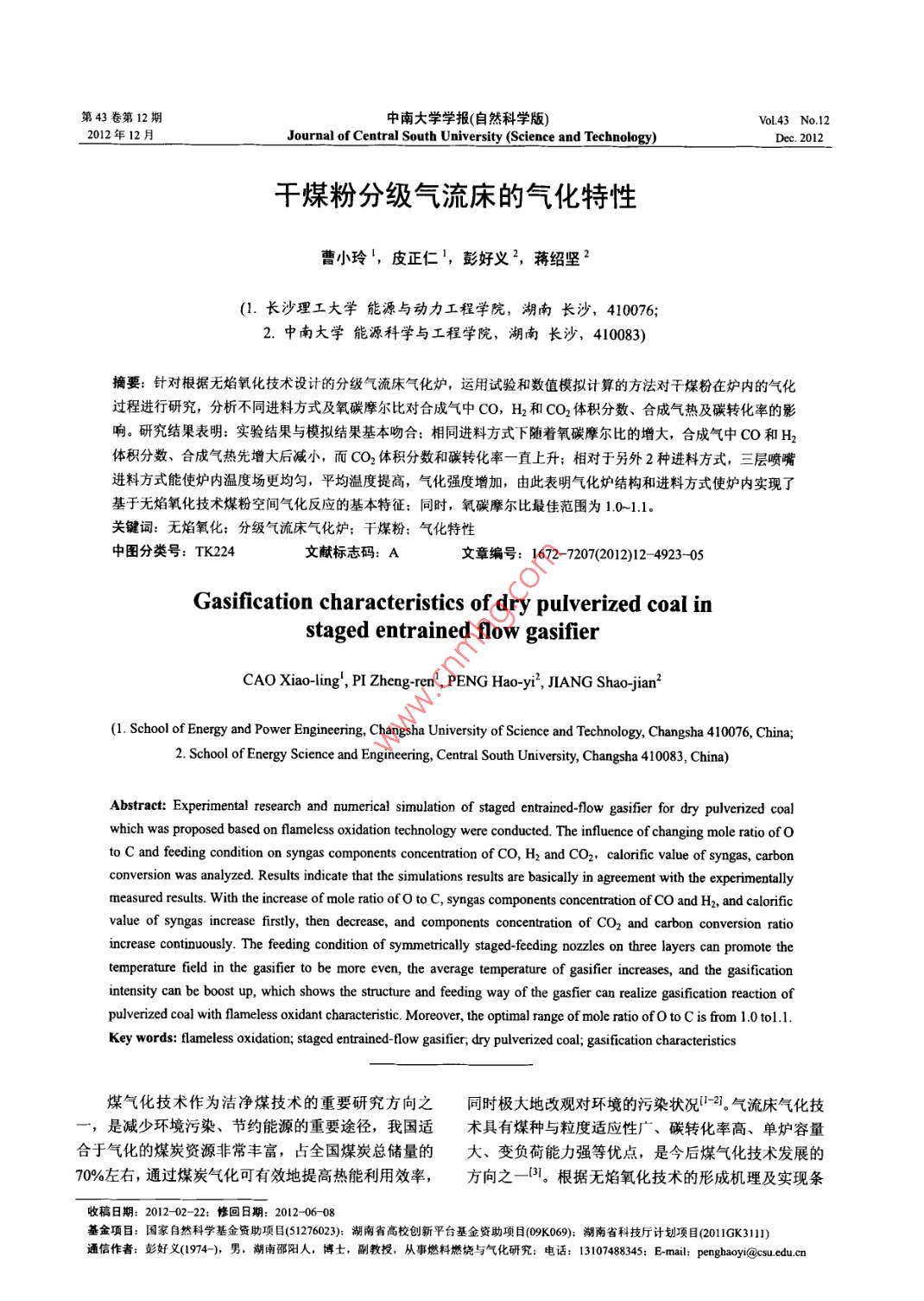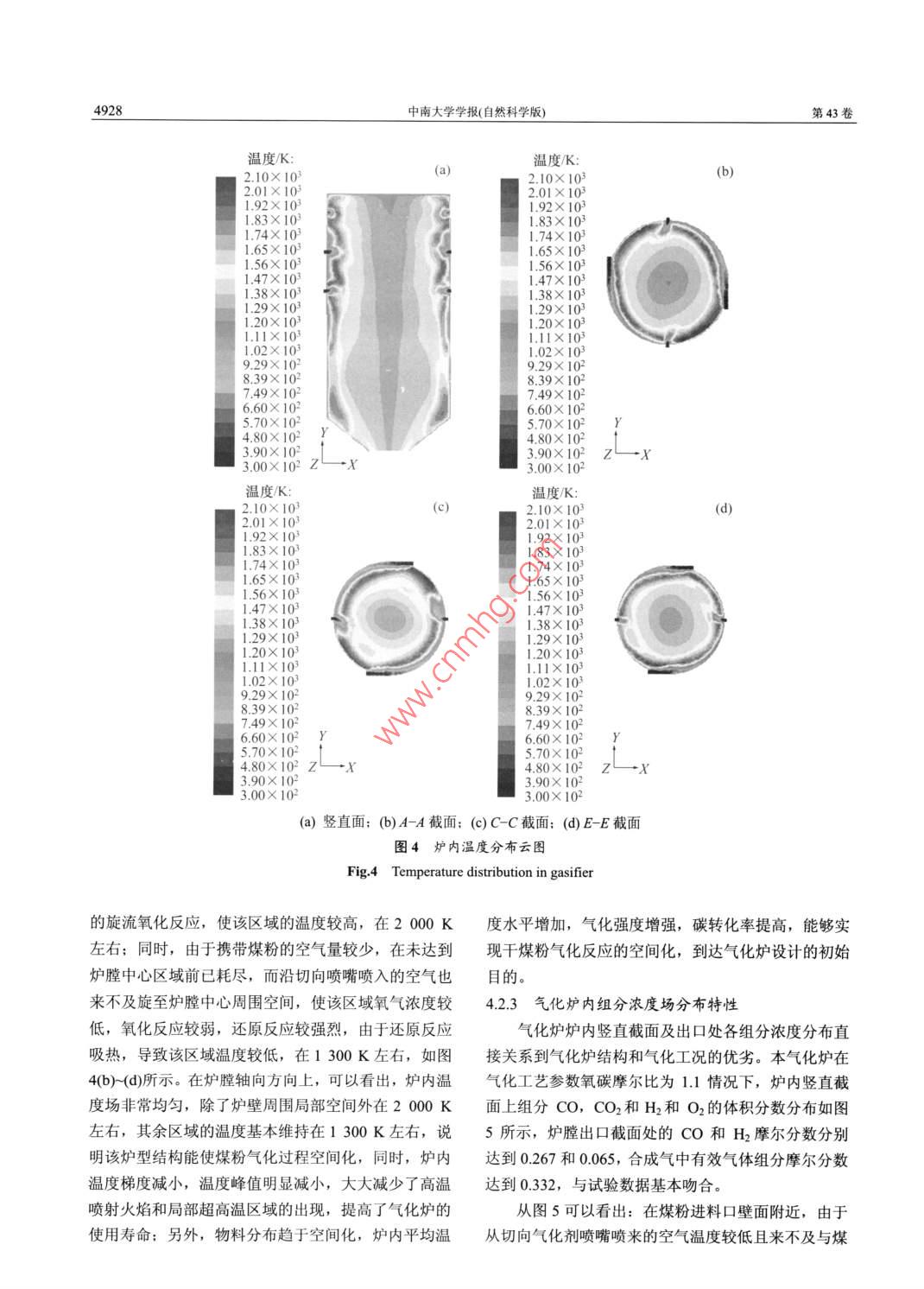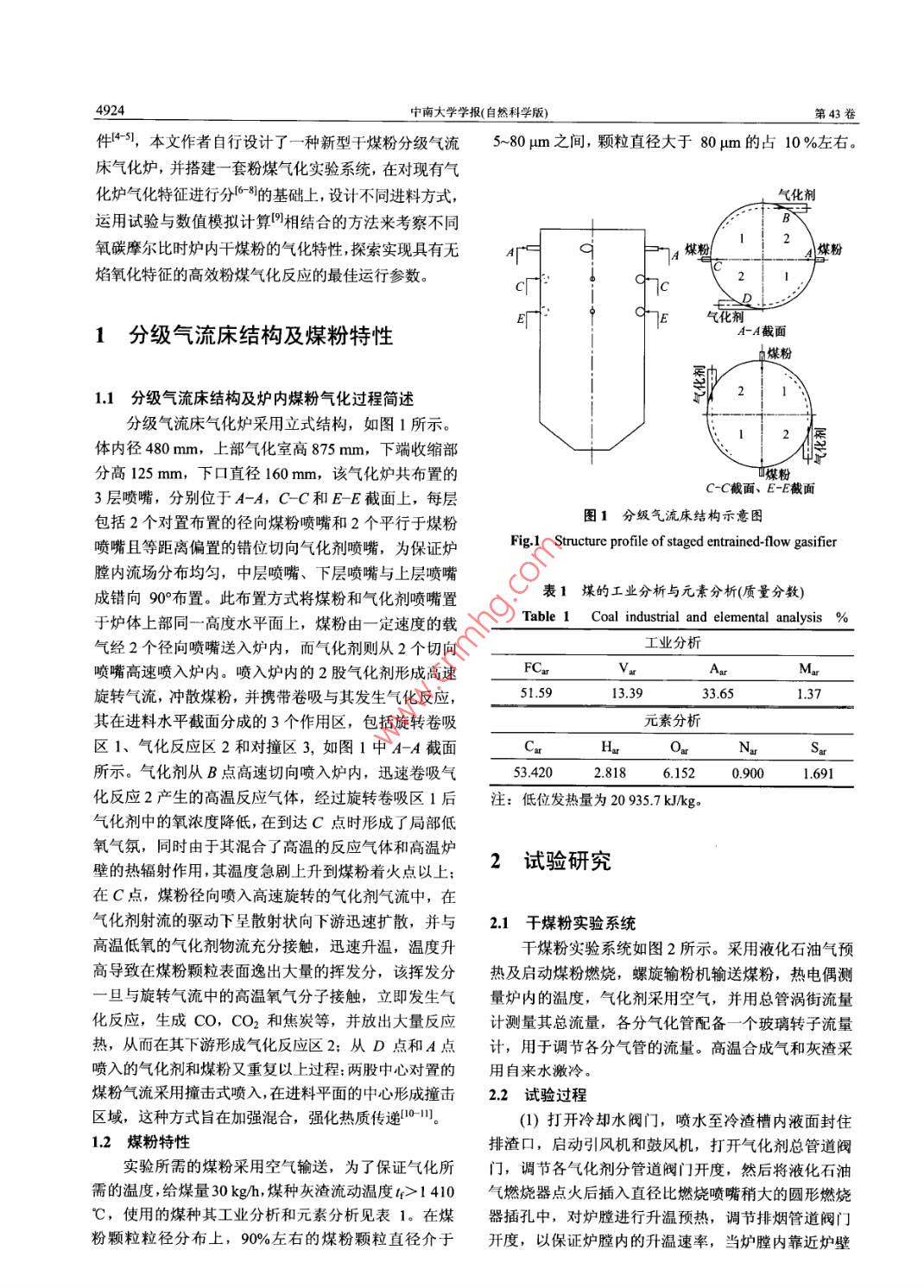第43卷第12期中南大學(xué)學(xué)報(bào)(自然科學(xué)版)Vol.43 No.122012年 12月.Journal of Central South University (Science and Technology)Dec.2012干煤粉分級氣流床的氣化特性曹小玲',皮正仁',彭好義”,蔣紹堅(jiān)(1. 長沙理工大學(xué)能源與動(dòng)力工程學(xué)院,湖南長沙,410076;2.中南大學(xué)能源科學(xué)與工程學(xué)院,湖南長沙,410083)摘要:針對根據(jù)無焰氧化技術(shù)設(shè)計(jì)的分級氣流床氣化爐,運(yùn)用試驗(yàn)和數(shù)值模擬計(jì)算的方法對F煤粉在爐內(nèi)的氣化過程進(jìn)行研究,分析不同進(jìn)料方式及氧碳摩爾比對合成氣中Co, H2 和CO2體積分?jǐn)?shù)、合成氣熱及碳轉(zhuǎn)化率的影響。研究結(jié)果表明:實(shí)驗(yàn)結(jié)果與模擬結(jié)果基本吻合:相同進(jìn)料方式F隨著氧碳摩爾比的增大,合成氣中co和H2體積分?jǐn)?shù)、合成氣熱先增大后減小,而CO2體積分?jǐn)?shù)和碳轉(zhuǎn)化率-直上升;相對于另外2種進(jìn)料方式,三層噴嘴進(jìn)料方式能使?fàn)t內(nèi)溫度場更均勻,平均溫度提高,氣化強(qiáng)度增加,由此表明氣化爐結(jié)構(gòu)和進(jìn)料方式使?fàn)t內(nèi)實(shí)現(xiàn)了基于無焰氧化技術(shù)煤粉空間氣化反應(yīng)的基本特征:同時(shí),氧碳摩爾比最佳范圍為1.0-1.1。關(guān)鍵詞:無焰氧化;分級氣流床氣化爐;干煤粉:氣化特性中圖分類號: TK224文獻(xiàn)標(biāo)志碼: A .文章編號: 1672-7207(2012)12- 4923- 05Gasification characteristics of dry pulverized coal instaged entrained flow gasifierCAO Xiao-ling', PI Zheng ren', PENG Hao-yit, JIANG Shao-jian2(1. School of Energy and Power Engineering, Changsha University of Science and Technology, Changsha 410076, China;2. School of Energy Science and Engrneering, Central South University, Changsha 410083, China)Abstract: Experimental research and numerical simulation of staged entained-low gasifier for dry pulverized coalwhich was proposed based on flameless oxidtion technology were conducted. The infuence of changing mole ratio ofOto c and feeding condition on syngas components concentration of Co, H2 and CO2, calorific value of syngas, carbonconversion was analyzed. Results indicate that the simulations results are basically in agreement with the experimentallymeasured results. With the increase of mole ratio ofO to C, syngas components concentration of CO and H2, and calorificvalue of syngas increase frstly, then decrease, and components concentation of CO2 and carbonconversion ratioincrease continuously. The feeding condition of symmetrically staged feding nozzles on three layers can promote thetemperature field in the gasifier to be more even, the average temperature of gasifier increases, and the gasifcaionintensity can be boost up, which shows the structure and feeding way of the gasfier can realize gasification reaction ofpulverized coal with flameless oxidant characteristic. Moreover, the optimal range of mole ratio ofO to C is fom 1.0 tol.1.Key words: flameless oxidation; staged entrained- flow gasifier, dry pulverized coal; gasification characteritics煤氣化技術(shù)作為潔凈煤技術(shù)的重要研究方向之同時(shí)極大地改觀對環(huán)境的污染狀況1-21。氣流床氣化技一,是減少環(huán)境污染、節(jié)約能源的重要途徑,我國適術(shù)具有煤種與粒度適應(yīng)性廣、碳轉(zhuǎn)化率高、單爐容量合于氣化的煤炭資源非常豐富,占全國煤炭總儲量的大、變負(fù)荷能力強(qiáng)等優(yōu)點(diǎn),是今后煤氣化技術(shù)發(fā)展的70%左右,通過煤炭氣化可有效地提高熱能利用效率,方向之一_BI。 根據(jù)無焰氧化技術(shù)的形成機(jī)理及實(shí)現(xiàn)條收稿日期: 2012 02 22:修回日期: 2012-06- 08基金項(xiàng)目:國家自然科學(xué)基金資助項(xiàng)目(51276023);湖南省高校創(chuàng)新平臺基金資助項(xiàng)目(09K069);湖南省科技廳計(jì)劃項(xiàng)目(011GK3111)通信作者:彭好義(1974-), 男, 湖南邵陽人,博士,副教授,從事燃料燃燒與氣化研究:電話: 13107488345; E-mail; pengay@csu edu.cn4924中南大學(xué)學(xué)報(bào)(自然科學(xué)版)第43卷件14-5),本文作者自行設(shè)計(jì)了一種新型干煤粉分級氣流5~80 um之間,顆粒直徑大于80 μm的占10 %左右。床氣化爐,并搭建一套粉煤氣化實(shí)驗(yàn)系統(tǒng), 在對現(xiàn)有氣化爐氣化特征進(jìn)行分(681的基礎(chǔ)上,設(shè)計(jì)不同進(jìn)料方式,氣化劑B代運(yùn)用試驗(yàn)與數(shù)值模擬計(jì)算19相結(jié)合的方法來考察不同2氧碳摩爾比時(shí)爐內(nèi)干煤粉的氣化特性,探索實(shí)現(xiàn)具有無2A煤整煤粉焰氧化特征的高效粉煤氣化反應(yīng)的最佳運(yùn)行參數(shù)。c廠門E1分級 氣流床結(jié)構(gòu)及煤粉特性A-A截面1.1 分級氣流床結(jié)構(gòu)及爐內(nèi)煤粉氣化過程簡述分級氣流床氣化爐采用立式結(jié)構(gòu),如圖1所示。體內(nèi)徑480 mm,上部氣化室高875 mm,下端收縮部分高125mm,下口直徑160mm,該氣化爐共布置的C-C截面、E-E截面3層噴嘴,分別位于A-A,C-C和E E截面上,每層:圖1分級氣流床結(jié)構(gòu)示意圖包括2個(gè)對置布置的徑向煤粉噴嘴和2個(gè)平行于煤粉噴嘴且等距離偏置的錯(cuò)位切向氣化劑噴嘴,為保證爐Fig,1 Structure profile of staged entrained-flow gasifier膛內(nèi)流場分布均勻,中層噴嘴、下層噴嘴 與上層噴嘴成錯(cuò)向90°布置。此布置方式將煤粉和氣化劑噴嘴置表1煤的工業(yè)分析與元素分析(質(zhì)量分?jǐn)?shù))于爐體上部同一高度水平面上,煤粉由一定速度的載lable 1 Coal industrial and el