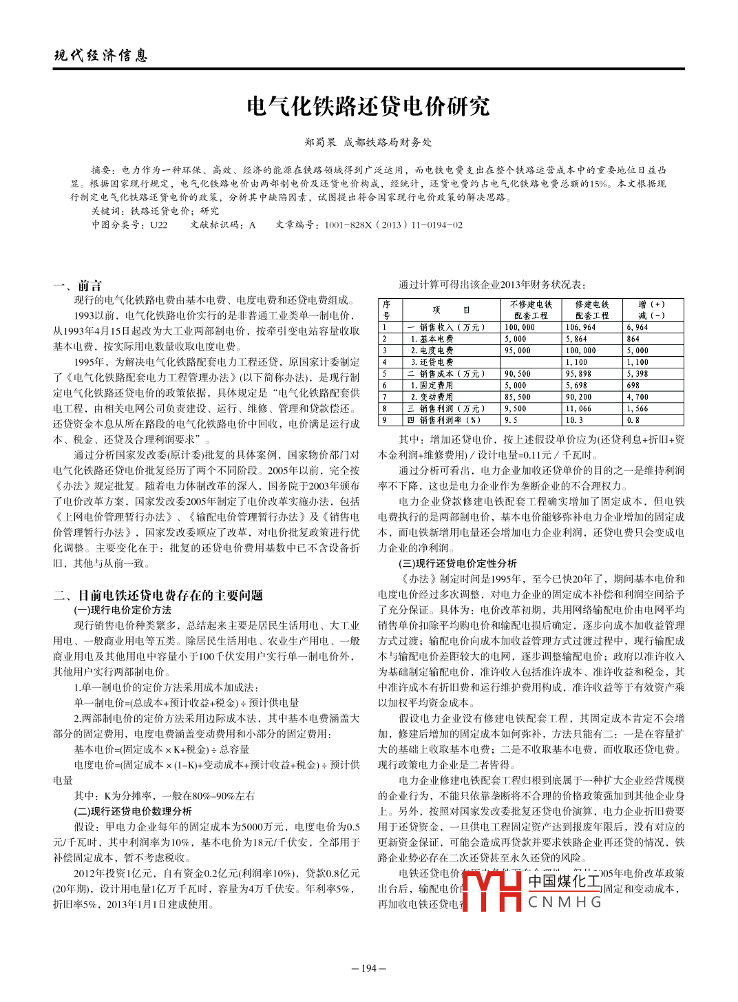 現(xiàn)代經(jīng)濟(jì)信息電氣化鐵路還貸電價(jià)研究鄭蜀果成都鐵路局財(cái)務(wù)處摘要:電力作為一種環(huán)保、高效、經(jīng)濟(jì)的能源在鐵路領(lǐng)堿得到廣泛運(yùn)用,而電鐵電貲攴岀在整鐵路運(yùn)營(yíng)成本中的重要地位日益凸顯。根據(jù)囯家現(xiàn)行規(guī)定,電氣化鐵路電價(jià)由兩部制電價(jià)及還貸電價(jià)枘成,經(jīng)統(tǒng)計(jì),還貸電費(fèi)約占電氣牝鐵路電貲總額的15‰%。本文根據(jù)現(xiàn)制定電氣化鐵路還貸電價(jià)的政策,分析其中缺陷因素,試圖提岀符合國(guó)家現(xiàn)行電價(jià)政策的解決思路。鍵詞還貸電價(jià);研究中圖分類(lèi)號(hào):U22文獻(xiàn)標(biāo)識(shí)碼:A文章編號(hào):1001-828X(2013)11-0194-02前言通過(guò)計(jì)算可得出該企業(yè)2013年財(cái)務(wù)狀況表現(xiàn)行的電氣化鐵路電費(fèi)由基本電費(fèi)、電度電費(fèi)和還貸電費(fèi)組成不修建電鐵修建電鐵增(+)1993以前,電氣化鐵路電價(jià)實(shí)行的是非普通工業(yè)類(lèi)單一制電價(jià)配套工程配套工程從199年4月15日起改為大工業(yè)兩部制電價(jià),按牽引變電站容量收取銷(xiāo)售收入(萬(wàn)元)104106.9621.基本電費(fèi)5,000基本電費(fèi),按實(shí)際用電數(shù)量收取電度電費(fèi)。32電度電費(fèi)100,0005,001995年,為解決電氣化鐵路配套電力工程還貸,原國(guó)家計(jì)委制定43還貸電費(fèi)1,100了《電氣化鐵路配套電力工程管理辦法》(以下簡(jiǎn)稱(chēng)辦法,是現(xiàn)行制5成本(萬(wàn)元)90,50095,898定電氣化鐵路還貸電價(jià)的政策依據(jù),具體規(guī)定是“電氣化鐵路配套供電工程,由相關(guān)電網(wǎng)公司負(fù)責(zé)建設(shè)、運(yùn)行、維修、管理和貸款償還。銷(xiāo)售利潤(rùn)(萬(wàn)元貸資金本息從所在路段的電氣化鐵路電價(jià)中回收,電價(jià)滿足運(yùn)行成四銷(xiāo)售利潤(rùn)率(%)9的么畫(huà)過(guò)分析國(guó)家發(fā)改委(原計(jì)委批復(fù)的具體案例,國(guó)家物價(jià)部門(mén)對(duì)本金利潤(rùn)維修費(fèi)用)/設(shè)計(jì)電量=01元/千貸利息+折舊+資本、稅金、還貸及合理利潤(rùn)要求化鐵路還貸電價(jià)批復(fù)經(jīng)歷了兩個(gè)不同階段。2005年以前,完全按通過(guò)分析可看出,電力企業(yè)加收還貸單價(jià)的目的之一是維持利潤(rùn)《辦法》規(guī)定批復(fù)。隨著電力體制改革的深人,國(guó)務(wù)院于2003年頒布率不下降,這也是電力企業(yè)作為壟斷企業(yè)的不合理權(quán)力了電價(jià)改革方案,國(guó)家發(fā)改委2005年制定了電價(jià)改革實(shí)施辦法,包括電力企業(yè)貸款修建電鐵配套工程確實(shí)增加了固定成本,但電鐵《上網(wǎng)電價(jià)管理暫行辦法》、《輸配電價(jià)管理暫行辦法》及《銷(xiāo)售電電費(fèi)執(zhí)行的是兩部制電價(jià),基本電價(jià)能夠彌補(bǔ)電力企業(yè)增加的固定成價(jià)管理暫行辦法》,國(guó)家發(fā)改委順應(yīng)了改革,對(duì)電價(jià)批復(fù)政策進(jìn)行優(yōu)本,而電鐵新增用電量還會(huì)增加電力企業(yè)利潤(rùn),還貸電費(fèi)只會(huì)變成電化調(diào)整。主要變化在于:批復(fù)的還貸電價(jià)費(fèi)用基數(shù)中已不含設(shè)備折力企業(yè)的凈利潤(rùn)。其他與從前一致。(三)現(xiàn)行還貸電價(jià)定性分析《辦法》制定時(shí)間是1995年,至今已快20年了,期間基本電價(jià)和H前電鐵還貸電費(fèi)存在的主要問(wèn)題電度電價(jià)經(jīng)過(guò)多次調(diào)整,對(duì)電力企業(yè)的固定成本補(bǔ)償和利潤(rùn)空間給予(一)現(xiàn)行電價(jià)定價(jià)方法了充分保證。具體為:電價(jià)改革初期,共用網(wǎng)絡(luò)輸配電價(jià)由電網(wǎng)平均現(xiàn)行銷(xiāo)售電價(jià)種類(lèi)繁多,總結(jié)起來(lái)主要是居民生活用電、大工業(yè)銷(xiāo)售單價(jià)扣除平均購(gòu)電價(jià)和輸配電損后確定,逐步向成本加收益管理用電、一般商業(yè)用電等五類(lèi)。除居民生活用電、農(nóng)業(yè)生產(chǎn)用電、一般方式過(guò)渡;輸配電價(jià)向成本加收益管理方式過(guò)渡過(guò)程中,現(xiàn)行輸配成商業(yè)用電及其他用電中容量小于100千伏安用戶實(shí)行單一制電價(jià)外,本與輸配電價(jià)差距較大的電網(wǎng),逐步調(diào)整輸配電價(jià);政府以準(zhǔn)許收人其他用戶實(shí)行兩部制電價(jià)為基礎(chǔ)制定輸配電價(jià),準(zhǔn)許收入包括準(zhǔn)許成本、準(zhǔn)許收益和稅金,其1單一制電價(jià)的定價(jià)方法采用成本加成法中準(zhǔn)許成本有折舊費(fèi)和運(yùn)行維護(hù)費(fèi)用構(gòu)成,準(zhǔn)許收益等于有效資產(chǎn)乘單一制電價(jià)=(總成本+預(yù)計(jì)收益+稅金)÷預(yù)計(jì)供電量以加權(quán)平均資金成本。2兩部制電價(jià)的定價(jià)方法采用邊際成本法,其中基本電費(fèi)涵蓋大假設(shè)電力企業(yè)沒(méi)有修建電鐵配套工程,其固定成本肯定不會(huì)增部分的固定費(fèi)用,電度電費(fèi)涵蓋變動(dòng)費(fèi)用和小部分的固定費(fèi)用加,修建后增加的固定成本如何彌補(bǔ),方法只能有二:一是在容量擴(kuò)基本電價(jià)=固定成本×K+稅金)÷總?cè)萘看蟮幕A(chǔ)上收取基本電費(fèi);二是不收取基本電費(fèi),而收取還貸電費(fèi)電度電價(jià)=(固定成