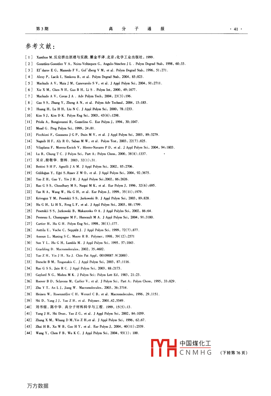 . 第3期高分子通報(bào)反應(yīng)擠出聚烯烴接枝改性研究進(jìn)展金慧,盛京",原續(xù)波(天津大學(xué)材料科學(xué)與工程學(xué)院,天津300072)摘要:聚烯烴通過(guò)接枝改性可以有效地?cái)U(kuò)大其應(yīng)用范圍。本文簡(jiǎn)介了近幾年反應(yīng)擠出中聚烯烴接枝體系的組成和接枝機(jī)理,討論了影響因素及其存在的副反應(yīng),同時(shí)介紹了接枝產(chǎn)物在增容改性等方面的應(yīng)用。關(guān)鍵詞:聚烯烴;反應(yīng)擠出;熔融接枝引言反應(yīng)擠出(reactiveextrusion)是指在聚合物和/或可聚合單體的連續(xù)擠出過(guò)程中完成--系列化學(xué)反應(yīng)的操作過(guò)程"。反應(yīng)擠出是近20年來(lái)迅速發(fā)展起來(lái)的高新技術(shù),它利用單/雙螺桿擠出機(jī)加工高粘度聚合物的獨(dú)特功能,對(duì)擠出機(jī)螺桿螺筒上的各個(gè)區(qū)段進(jìn)行獨(dú)立的溫度、物料停留時(shí)間和剪切強(qiáng)度的控制,使物料在各個(gè)區(qū)段傳輸過(guò)程中,完成固體輸送、增壓熔融、物料混合、熔體加壓、化學(xué)反應(yīng)、排除副產(chǎn)物和未反應(yīng)單體、熔體輸送和泵出成型等--系列化工單元操作,是理想的高熔體粘度聚合物熔融反應(yīng)加工方法。目前反應(yīng)擠出技術(shù)已經(jīng)廣泛應(yīng)用于聚合物降解|2-s]、接枝(6.7] .本體聚合[8)、交聯(lián)[9]及反應(yīng)性共混(oi等方面,在聚合物制備、功能化及高性能化學(xué)改性等領(lǐng)域發(fā)揮了重要作用,是高分子材料反應(yīng)加工學(xué)科的重要組成部分。以聚丙烯(PP)和聚乙烯(PE)為代表的聚烯烴是用途廣泛的通用塑料,具有產(chǎn)量大、價(jià)格低、耐水、耐化學(xué)藥品,以及成型工藝好等優(yōu)點(diǎn),在高分子材料中占有十分重要的地位。但由于它們是非極性材料,與其他聚合物或填料共混時(shí),界面作用力差。同時(shí),PE和PP的熔點(diǎn)較低,熱變形溫度低,尺寸穩(wěn)定性不好,給實(shí)際應(yīng)用帶來(lái)了很多的限制。通過(guò)與極性不飽和單體進(jìn)行接枝,在聚烯烴分子鏈上引人極性基團(tuán),可以改善其性能上的不足,同時(shí)又增加新的性質(zhì),是一-種簡(jiǎn)單有效的聚烯烴改性方法。聚烯烴接枝改性方法主要有:溶液接枝"、熔融接枝'2]、固相接枝[川)、輻射接枝[4.1、懸浮接枝'%)等。其中熔融接枝主要是在擠出機(jī)和密煉機(jī)中操作,它們有相似的反應(yīng)過(guò)程。擠出機(jī)中的熔融接枝不僅能靈活設(shè)計(jì)具有特性的高分子材料,而且無(wú)溶劑回收,減少設(shè)備費(fèi)用,可以方便、經(jīng)濟(jì)地在聚合物分子鏈上接枝不同的官能團(tuán),改善原有聚合物的染色性、吸濕性、粘接性、反應(yīng)活性及與其它聚合物的相容性等,從而開(kāi)發(fā)性能更優(yōu)的高分子材料。美、日、歐等已有大量的專(zhuān)利報(bào)道,并開(kāi)始有商品出售。國(guó)內(nèi)有多家科研單位,大專(zhuān)院校,生產(chǎn)企業(yè)從事類(lèi)似研究工作["”。本文主要綜述近幾年擠出機(jī)中聚烯烴接枝改性的研究情況。1聚烯烴接枝的單體反應(yīng)擠出中,聚烯烴接枝的單體主要有酸性官能團(tuán)單體、堿性官能團(tuán)單體和其它單體。酸性官能團(tuán)單體主要有:馬來(lái)酸酐(MAH)18.19.、丙烯酸( AA)20.21、甲基丙烯酸(MA) .富馬酸(FA)2、衣康酸(IA)23)異氰酸酯(等;堿性官能團(tuán)單體主要有:甲基丙烯酸縮水甘油酯(GMA)25-2]1、唑啉基化合物[3)等。另外還有官能化過(guò)氧化物[291、不飽和硅烷[9)苯乙烯(St)等。馬來(lái)酸酐(MAH)是聚烯烴接枝反應(yīng)最常用的單體。由于聚烯烴的熔融接枝溫度一般高于馬來(lái)酸酐均聚的上限溫度,因此很少形成馬來(lái)酸酐的均聚物或在聚_來(lái)酸酐支鏈,通常中國(guó)煤化工基金項(xiàng)目:基金項(xiàng)目:國(guó)家自然科學(xué)基金重大項(xiàng)目(50390090);作者簡(jiǎn)介:金慧(1980-),女,現(xiàn)為天津大學(xué)材料科學(xué)與工程學(xué)院在TYH.CN MH G料結(jié)構(gòu)與性能的研究。*聯(lián)系人,shengxu@ publi.tpt.j.cn高分子通報(bào)2006年3月以單個(gè)或兩個(gè)馬來(lái)酸酐分子的短支鏈形式存在。馬來(lái)酸酐分子中酸酐官能團(tuán)的存在使其雙鍵的反應(yīng)活性降低,為了增加接枝率必須增加過(guò)氧化物引發(fā)劑的用量,帶來(lái)嚴(yán)重的降解或交聯(lián)副反應(yīng)。甲基丙烯酸縮水甘油酯(GMA)不含有羧基,不腐蝕設(shè)備,無(wú)刺激性氣味,沸點(diǎn)較高(204C),不易揮發(fā),該化合物帶有的環(huán)氧基團(tuán)較為活潑,在- -定條件下可開(kāi)環(huán)與羧基、羥基、胺基等官能團(tuán)反應(yīng),形成偶聯(lián)結(jié)構(gòu),但易自聚,接枝率- -般比較低26)。苯乙烯類(lèi)的單體也可以用作某些聚合物反應(yīng)擠出接枝的單體。由于苯乙烯類(lèi)單.體的接枝效率較低,需要導(dǎo)人大量的苯乙烯單體以增加接枝效率,同時(shí)生成了-定量的均聚物。在聚丙烯、聚乙烯上接枝少量的苯乙烯可以顯著改善該類(lèi)材料的耐磨性,增加自潤(rùn)滑性'"71。聚烯烴與含羧基單體接枝得到的產(chǎn)物,易于熱氧化,影響材料使用性能,接枝的羧基基團(tuán)通過(guò)中和反應(yīng),可以提高聚烯烴和熱塑性塑料共混時(shí)的熱穩(wěn)定性,Krivoguz等'23]在單螺桿擠出機(jī)中制備LDPE-g-IA接枝
