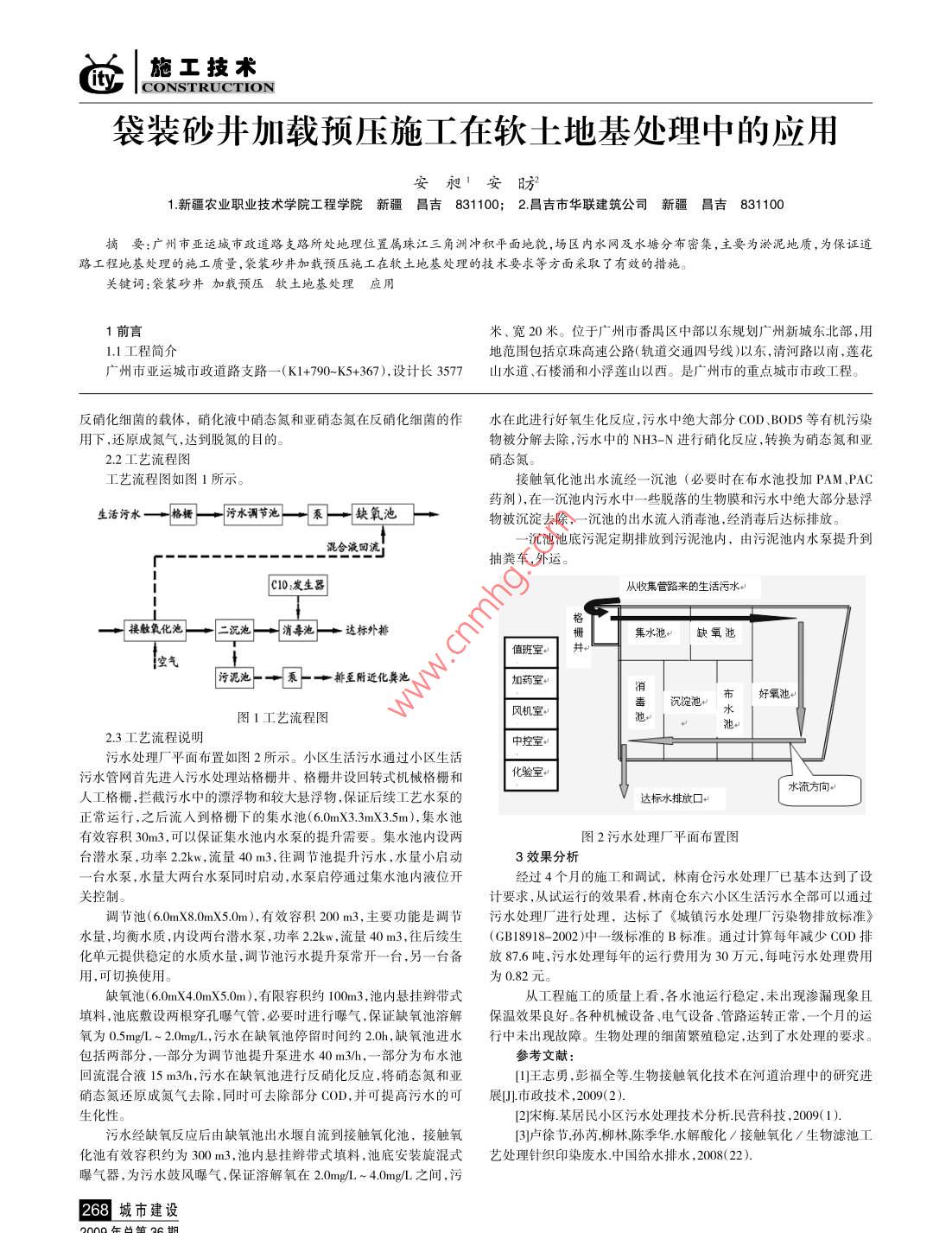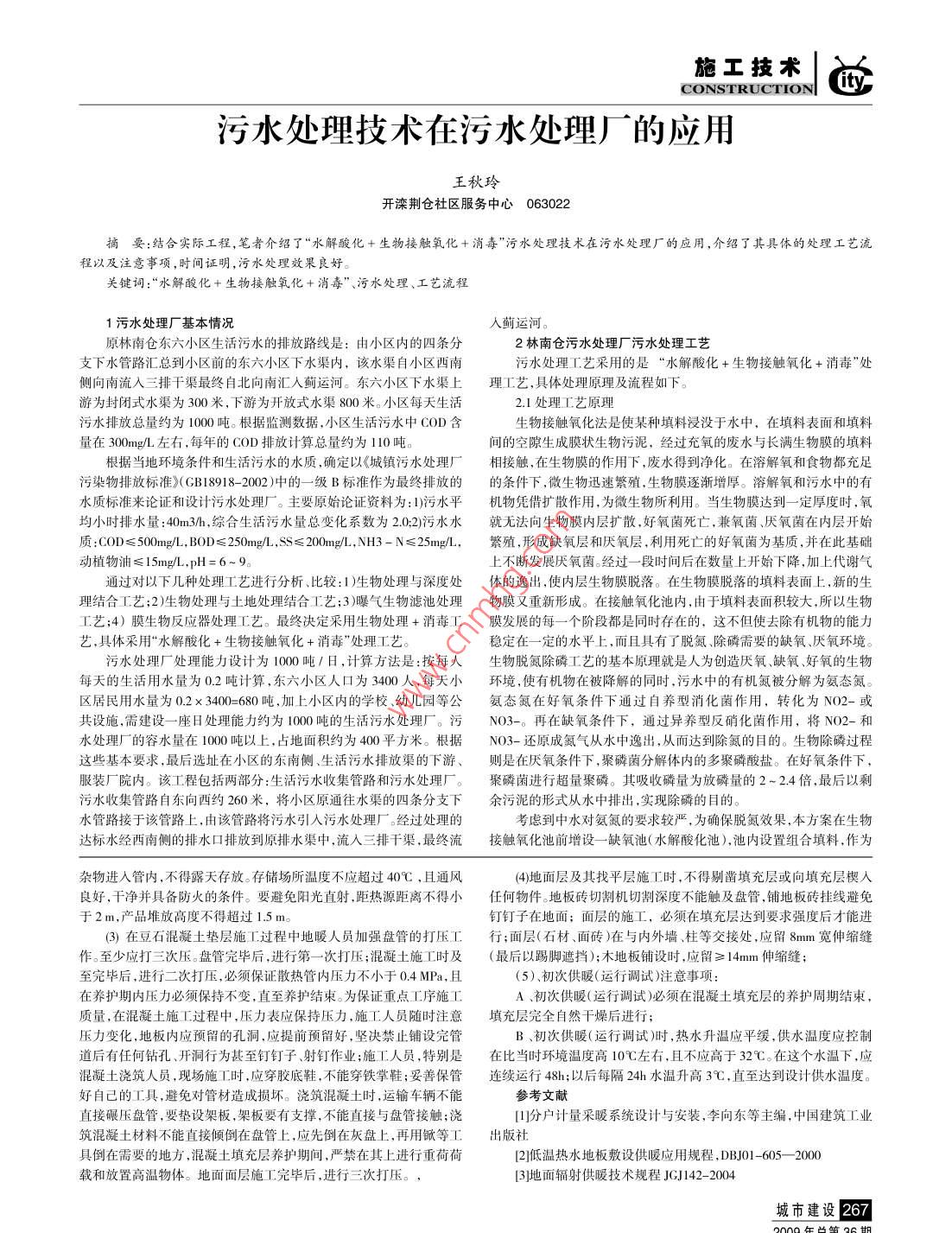 施工技術CONSTRUCTIONc污水處理技術在污水處理廠的應用王秋玲開灤荊倉社區(qū)服務中心063022摘要:結合實際工程,筆者介紹了¨水解酸化生物接觸氧化+消毒″污水處理技術在污水處理廠的應用,介紹了其具體的處理工藝流程以及注意事項,時間證明,污水處理效果良好。關鍵詞:“水解酸化十生物接觸氧化十消毒”、污水處理、工藝流程1污水處理廠基本情況入薊運河原林南倉東六小區(qū)生活污水的排放路線是:由小區(qū)內(nèi)的四條分2林南倉污水處理廠污水處理工藝支下水管路匯總到小區(qū)前的東六小區(qū)下水渠內(nèi),該水渠自小區(qū)西南污水處理工藝采用的是“水解酸化+生物接觸氧化+消毒”處側(cè)向南流入三排干渠最終自北向南匯人薊運河。東六小區(qū)下水渠上理工藝,具體處理原理及流程如下游為封閉式水渠為300米,下游為開放式水渠800米。小區(qū)每天生活2.1處理工藝原理污水排放總量約為1000噸。根據(jù)監(jiān)測數(shù)據(jù),小區(qū)生活污水中COD含生物接觸氧化法是使某種填料浸沒于水中,在填料表面和填料量在300mg/左右,每年的COD排放計算總量約為110噸。間的空隙生成膜狀生物污泥,經(jīng)過充氧的廢水與長滿生物膜的填根據(jù)當?shù)丨h(huán)境條件和生活污水的水質(zhì),確定以《城鎮(zhèn)污水處理廠相接觸,在生物膜的作用下,廢水得到凈化。在溶解氧和食物都充污染物排放標準》(GBl8918-2002)中的一級B標準作為最終排放的的條件下,微生物迅速繁殖,生物膜逐漸增厚。溶解氧和污水中的有水質(zhì)標準來論證和設計污水處理廠。主要原始論證資料為:1)污水平機物憑借擴散作用,為微生物所利用。當生物膜達到一定厚度時,氧均小時排水量:40m3h,綜合生活污水量總變化系數(shù)為2.02)污水水就無法向生物膜內(nèi)層擴散,好氧菌死亡,兼氧菌厭氧菌在內(nèi)層開始質(zhì):COD≤500mg,BOD≤25mg/,SS≤200mg,NH3-N≤25mg/,繁殖,形成缺氧層和厭氧層,利用死亡的好氧菌為基質(zhì),并在此基礎動植物油≤15mg/L,pH=6~9。上不斷發(fā)展厭氧菌。經(jīng)過一段時間后在數(shù)量上開始下降,加上代謝氣通過對以下幾種處理工藝進行分析、比較:1)生物處理與深度處體的逸出,使內(nèi)層生物膜脫落。在生物膜脫落的填料表面上,新的生理結合工藝;2)生物處理與土地處理結合工藝;3)曝氣生物濾池處理物膜又重新形成。在接觸氧化池內(nèi),由于填料表面積較大,所以生物工藝;4)膜生物反應器處理工藝。最終決定采用生物處理+消毒工膜發(fā)展的每一個階段都是同時存在的,這不但使去除有機物的能力藝,具體采用“水解酸化+生物接觸氧化+消毒”處理工藝。穩(wěn)定在一定的水平上,而且具有了脫氮、除磷需要的缺氧、厭氧環(huán)境。污水處理廠處理能力設計為1000噸/日,計算方法是:按每人生物脫氮除磷工藝的基本原理就是人為創(chuàng)造厭氧、缺氧、好氧的生物每天的生活用水量為0.2噸計算,東六小區(qū)人口為3400人,每天小環(huán)境,使有機物在被降解的同時,污水中的有機氮被分解為氨態(tài)氮。區(qū)居民用水量為0.2×3400=680噸加上小區(qū)內(nèi)的學校、幼兒園等公氨態(tài)氮在好氧條件下通過自養(yǎng)型消化菌作用,轉(zhuǎn)化為NO2-或共設施,需建設一座日處理能力約為1000噸的生活污水處理廠。污NO3-。再在缺氧條件下,通過異養(yǎng)型反硝化菌作用,將NO2-和水處理廠的容水量在I000噸以上,占地面積約為400平方米。根據(jù)NO3-還原成氮氣從水中逸出,從而達到除氮的目的。生物除磷過程這些基本要求,最后選址在小區(qū)的東南側(cè)、生活污水排放渠的下游、則是在厭氧條件下,聚磷菌分解體內(nèi)的多聚磷酸鹽。在好氧條件下,裝廠院內(nèi)。該工程包括兩部分:生活污水收集管路和污水處理廠。聚磷菌進行超量聚磷。其吸收磷量為放磷量的2-2.4倍,最后以污水收集管路自東向西約260米,將小區(qū)原通往水渠的四條分支下余污泥的形式從水中排出,實現(xiàn)除磷的目的水管路接于該管路上,由該管路將污水引人污水處理廠。經(jīng)過處理的考慮到中水對氨氮的要求較嚴,為確保脫氮效果,本方案在生物達標水經(jīng)西南側(cè)的排水口排放到原排水渠中,流入三排干渠,最終流接觸氧化池前增設一缺氣池(水解酸化池),池內(nèi)設置組合填料,作為雜物進入管內(nèi),不得露天存放。存儲場所溫度不應超過40℃,且通風4)地面層及其找平層施工時,不得剔鑿填充層或向填充層楔入良好,干凈并具備防火的條件。要避免陽光直射,距熱源距離不得小任何物件。地板磚切割機切割深度不能觸及盤管,鋪地板磚掛線避免于2m,產(chǎn)品堆放高度不得超過1.5m。釘釘子在地面;面層的施工,必須在填充層達到要求強度后才能進3)在豆石混凝土墊層施工過程中地暖人員加強盤管的打壓工行;面層(石材、面磚)在與內(nèi)外墻、柱等交接處,應留8mm寬伸縮縫作。至少應打三次壓。盤管完畢后,進行第一次打壓;混凝土施工時及(最后以踢腳遮擋);木地板鋪設時,應留≥14mm伸縮縫至完畢后,進行二次打壓,必須保證散熱管內(nèi)壓力不小于04MPa,且(5)、初次供暖(運行調(diào)試)注意事項:在養(yǎng)護期內(nèi)壓力必須保持不變,直至養(yǎng)護結束。為保證重點工序施工A、初次供暖(運行調(diào)試)必須在混凝土填充層的養(yǎng)護周期結束質(zhì)量,在混凝土施工過