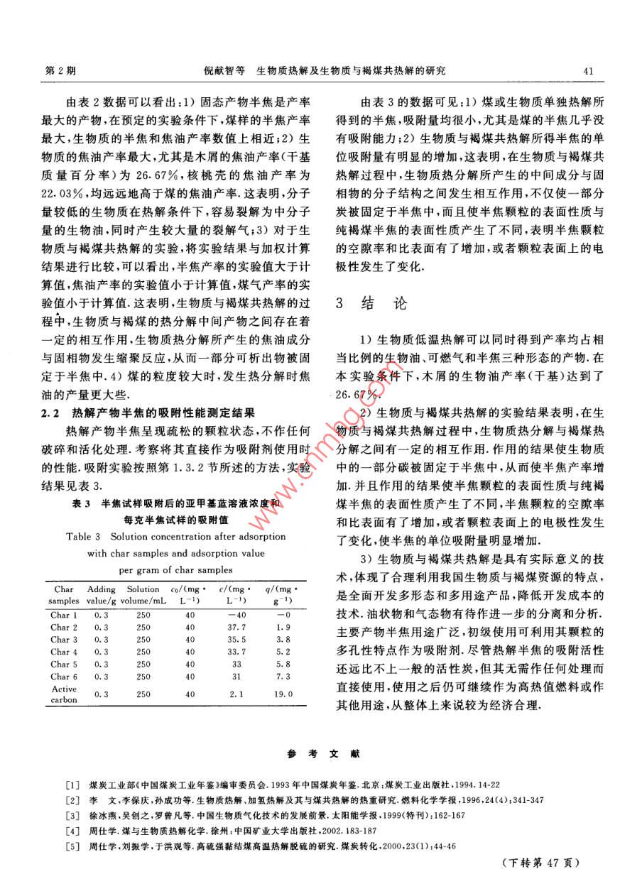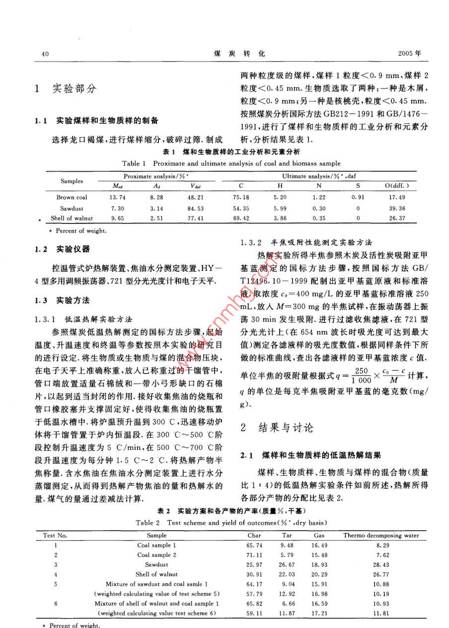 第28卷第2期煤炭轉(zhuǎn)化Vol. 28 No. 22005年4月COAL CONVERSIONApr. 2005生物質(zhì)熱解及生物質(zhì)與褐煤共熱解的研究倪獻智)叢 興順2)馬小隆3) 周 任學”)摘要褐煤及生物質(zhì)均具有隔絕空氣受熱時化學結構發(fā)生裂解的特性.經(jīng)過熱裂解可得到半焦、焦油和煤氣等三種形態(tài)的物質(zhì)。對于一定的煤及生物質(zhì)來說,三種形態(tài)產(chǎn)物的產(chǎn)率將因熱解條件不同而有差異。研究選取了龍口褐煤,選取了木屑和核桃殼兩種生物質(zhì),在一定的條件下進行低溫熱解.考察了生物質(zhì)熱解及生物質(zhì)與褐煤共熱解時,三種形態(tài)產(chǎn)物產(chǎn)率的差異.考察了低溫熱解所得半焦直接作為吸附劑使用的性能.吸附實驗結果表明,不經(jīng)任何處理的低溫熱解半焦吸附亞甲基藍的單位吸附量可以達到7.3 mg/g.關鍵詞生物質(zhì),褐煤, 熱解,吸附:中圖分類號TQ530. 2,Q949. 9稻殼5 000萬t,林業(yè)加工廢棄物約3000萬t,三項0引言總計折合標準煤2.15億t.L.3)生物質(zhì)中的主要化學組分為木質(zhì)素、纖維素和糖類等,其能量密度低,不褐煤除了作為燃料使用以外,經(jīng)過不同的化學宜儲存和運輸.若直接作為燃料使用,燃燒熱效率很加工過程可以得到各種化工產(chǎn)品或化工原料.褐煤低,環(huán)境污染嚴重.生物質(zhì)在無氧的條件下進行熱裂是變質(zhì)程度最低的煤,其儲量占煤炭總儲量的解反應,可獲得木炭、生物油和可燃氣.[中生物油和12.5%.[1]褐煤分子結構中芳香環(huán)的縮合程度低,縮可燃氣中含多種有價值的化工原料.合芳香環(huán)周圍的各種含氧活性基團和脂肪側鏈含量根據(jù)生物質(zhì)和煤的成分特點,將生物質(zhì)和煤一豐富,化學活性好,故褐煤水分含量較高,揮發(fā)分產(chǎn)同進行低溫熱解是近些年來能源化工中嶄新的研究率高,發(fā)熱量低.將褐煤直接燃燒時,隨煙道氣粉塵課題.[2]周仕學[°]較系統(tǒng)地研究了生物質(zhì)與高硫強帶出量大,環(huán)境污染嚴重,熱利用率較低.但是,對于黏結煤共熱解過程中的化學行為,從理論上考察高褐煤進行低溫熱解(干餾)時,容易發(fā)生熱裂解反應,硫強黏結煤熱解的過程中生物質(zhì)分解反應所產(chǎn)生的同時得到固態(tài)半焦、液態(tài)焦油及煤氣.焦油是含有脫硫及抗黏作用.將生物質(zhì)與褐煤的混合物進行低酚、蔡、蒽、菲、苯和瀝青等多種組分的混合物,通過溫熱解,是基于生物質(zhì)和褐煤的熱分解溫度相近的精餾分離,可以得到多種重要的有機化工原料.熱解特點(生物質(zhì)主要熱解溫度為265 C~310 C,褐煤煤氣中含氫氣、一氧化碳和低分子烴等,可作為高熱的初始分解溫度約350C).將生物質(zhì)與褐煤冷壓成值燃料氣或化學合成氣.所得到的固態(tài)高碳物型,熱解時逐層受熱發(fā)生熱裂解,有效控制粉塵隨熱半焦,強度較大而且孔隙發(fā)達,可作為潔凈燃料、氣解氣的逸出.發(fā)生熱裂解的分子界面產(chǎn)生自由基,其化原料、鐵合金生產(chǎn)用焦和電石生產(chǎn)用焦,或者經(jīng)過易于及時發(fā)生縮聚反應,這就保證了固相產(chǎn)物的微進一步加工,制備活性炭或碳分子篩,或者直接作為觀機械強度,從而提高了其品位.低溫熱解能夠同時吸附劑用于環(huán)境保護中.得到較大量的焦油、大量的煤氣和高碳半焦三種形生物質(zhì)是日益得到重視的重要碳質(zhì)資源,主要態(tài)的產(chǎn)物,對于合理而有效地利用褐煤資源和生物包括農(nóng)作物秸稈、稻殼、果殼.木屑.制糖業(yè)蔗渣和造質(zhì)資源,發(fā)展多形態(tài)化工產(chǎn)品的聯(lián)合生產(chǎn)技術,減輕紙業(yè)蔗髓等.我國農(nóng)作物秸桿的生產(chǎn)量約達6億t,環(huán)境污染等,具有重要的意義.*山東科技大學2004年度科研基金資助項目.1)碩士、教授、碩士生導師.濟南大學化學工程學院,250022濟南;2) 碩士生;3)實驗師;4)博士、教授、博士生導師,山東科技大學化學與環(huán)境工程學院,266510青島4煤炭轉(zhuǎn)化2005年兩種粒度級的煤樣,煤樣1粒度<0.9 mm,煤樣21實驗部分粒度<0.45 mm.生物質(zhì)選取了兩種:一種是木屑,粒度<0.9 mm;另一種是核桃殼,粒度<0.45 mm.按照煤炭分析國際方法GB212- 1991和GB/1476-1.1實驗 煤樣和生物質(zhì)樣的制備1991,進行了煤樣和生物質(zhì)樣的工業(yè)分析和元素分選擇龍口褐煤,進行煤樣縮分,破碎過篩.制成析,分析結果見表1.表1 煤和生物質(zhì)樣的工業(yè)分析和元素分析Table 1 Proximate and ultimate analysis of coal and biomass sampleProximate analysis/ %”Ultimate analysis/%* ,dafSamplesMusAd_VanlNOdiff.)Brown coal13.748.2848. 2175.185.201.220.9117. 49Sawdust7. 303.1484. 5354.355.99.0.3039. 36Shell of walnut9.652. 5177.4169.423. 860. 3526.37+ Percent of weight.1.3.2半焦吸附性 能測定實驗方法1.2實驗儀器熱解實驗所得半焦參照木炭及活性炭吸附亞甲控溫管式爐熱解裝置、焦油水分測定裝置.HY一基藍測定的國標方法步驟,按照國標方法GB/4型多用調(diào)頻振蕩器.721型分光光度計和電子天平.T12496.10-1999配制出亞甲基藍原液和標準溶液取濃度co=400mg/L的亞甲基藍標準溶液2501.3實驗方 法mL,放人M= 300 mg的半焦試樣,在振動蕩器上振1.3.1 低溫熱解實驗方法蕩30 min發(fā)生吸附.進行過濾收焦濾液,在721型參照煤炭低溫熱解測定的國標方法步驟,起始分光光計上(在654nm波長時吸光度可達到最大溫度、升溫速度和終溫等參數(shù)按照本實驗的研究目