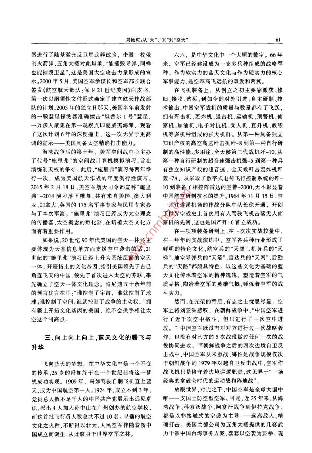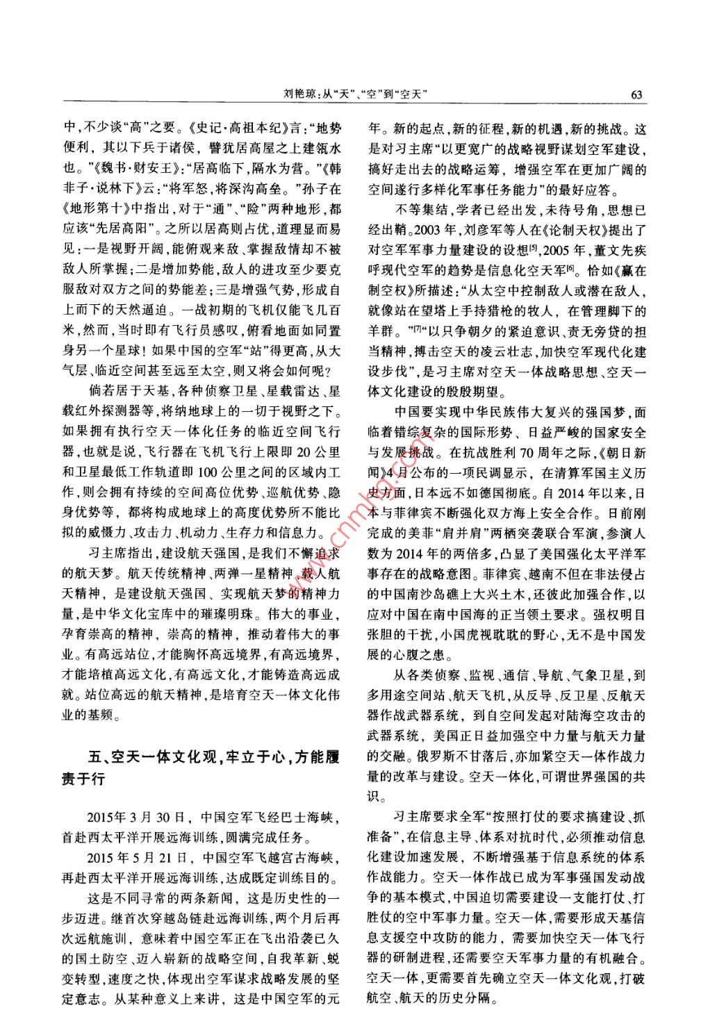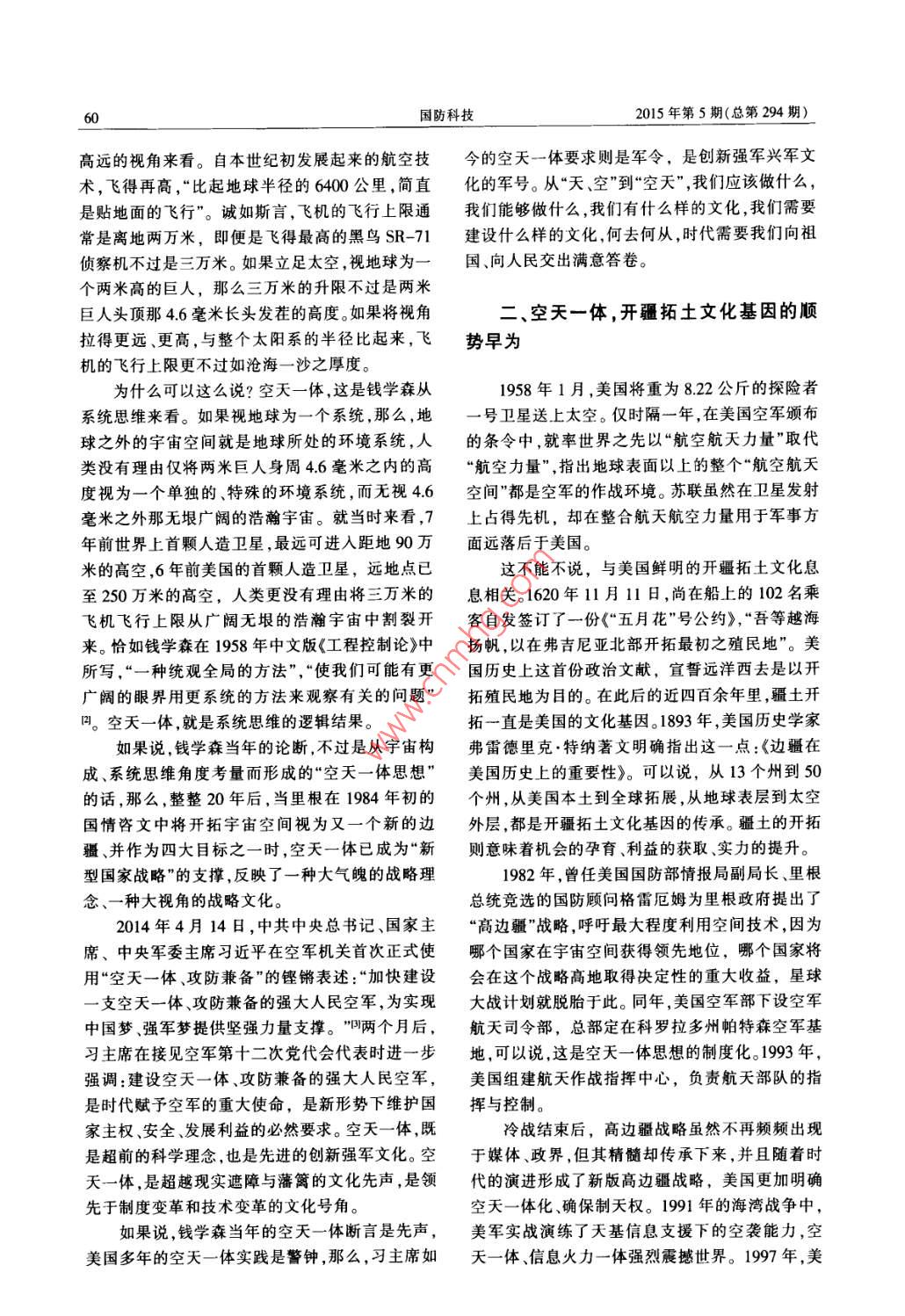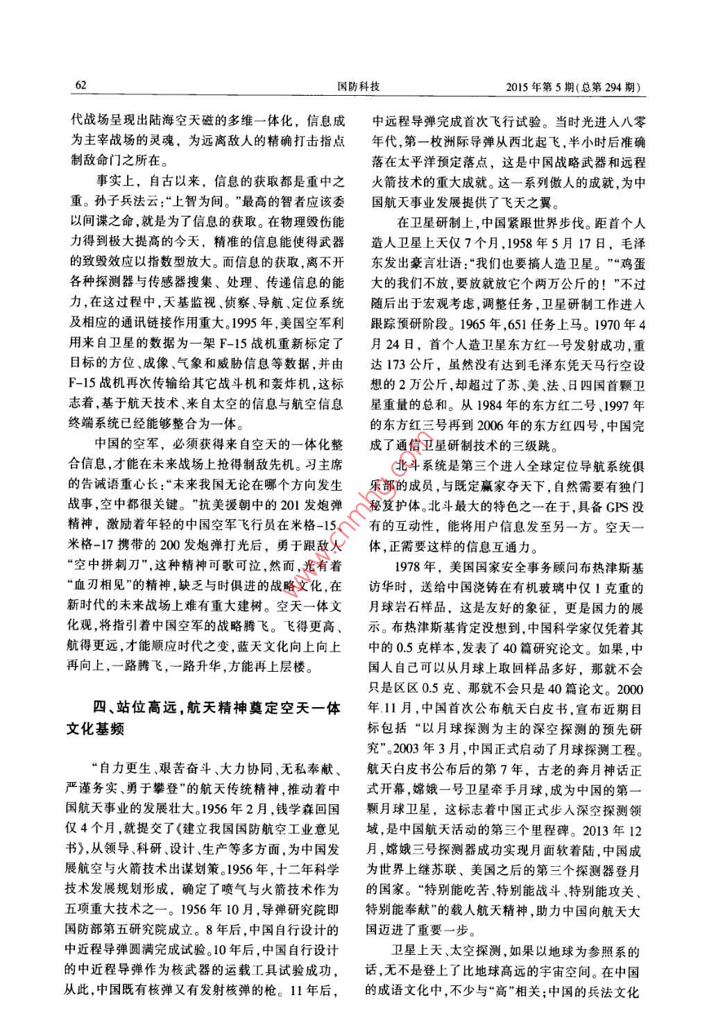 第36卷第5期國防科技Vol 36. No 52015年10月NATIONAL DEFENSE SCIENCE TECHNOLOGY0ct2015從“天”、“空”到“空天”劉艷瓊國防科學(xué)技術(shù)大學(xué)人文與社會科學(xué)學(xué)院,湖南長沙410073摘要]隨著航空、航天技術(shù)的發(fā)展,人類延續(xù)幾千年的陸地、海洋戰(zhàn)場開始向上轉(zhuǎn)移,甚至取而代之威為主戰(zhàn)場??仗煲惑w,在這一趨勢中日顯緊迫。從分離的“空”、“天"文化走向一體化“空天”,這是深層文化的本質(zhì)轉(zhuǎn)變:轉(zhuǎn)變?yōu)楦哌h(yuǎn)視角,轉(zhuǎn)變?yōu)橄到y(tǒng)思維,轉(zhuǎn)變?yōu)榇髴?zhàn)略理念,轉(zhuǎn)變?yōu)橄冗M(jìn)戰(zhàn)斗力文化。空天一體,既有現(xiàn)實(shí)緊迫性,又有藍(lán)天文化、航天文化作為堅(jiān)實(shí)基頻的客觀可行性。[關(guān)鍵詞]空天一體;空天;文化[中圖分類號E816文獻(xiàn)標(biāo)識碼]A[文章編號]1671-4547(2015)05-005905Dol:10.13943/ j.issnI671-4547.2015.05131964年,英國元帥蒙哥馬利參觀北京軍區(qū),楊從“天、空”到“空天”;減少的不只是勇將軍陪同3天后蒙哥馬利回國途經(jīng)香港在記頓號,交換的不僅是位置者招待會上感嘆:“我要告誡我的同行,這要成為軍事家的一條禁忌:不要和中國軍隊(duì)在地面上交什么是“天、空”?什么是“空天”?雖然只是一手個(gè)頓號的分隔,雖然只是一個(gè)位置的交換,卻有著這是中國軍隊(duì)的榮耀,但這僅僅是中國陸地本質(zhì)的轉(zhuǎn)變。從“天、空”到“空天”,轉(zhuǎn)變的是視角軍隊(duì)的榮耀。半個(gè)世紀(jì)的歲月一晃而過,如今,遠(yuǎn)轉(zhuǎn)變的是思維,轉(zhuǎn)變的是理念,轉(zhuǎn)變的是深層文攻奇襲的非接觸作戰(zhàn)、可決定勝負(fù)的斬首行動不化。從“天、空”分隔到“空天”一體,這種轉(zhuǎn)變,不能必在地面交手,已成現(xiàn)實(shí)。中國軍隊(duì),是否還能威坐等問題倒逼,不能慢等水到渠成需要超前的科震全球懾?cái)秤趪T之外?在空天一體化時(shí)代,空學(xué)理念引領(lǐng)人、導(dǎo)向人、規(guī)范人需要先進(jìn)的創(chuàng)新天文化應(yīng)如何順時(shí)而生、順流而為、順勢而動?文化陶冶人、激勵(lì)人、凝聚人。航空、航天,只是人類在探索地球之外全部空1964年1月,錢學(xué)森在《祝<航空知識>復(fù)刊》間進(jìn)程中從科學(xué)程序上的分階段、分步驟。空天,賀詞中揮筆斷言,“今天我們所說的航空技術(shù),必從物理域上而言,原本就是一體,并沒有明顯界須包括航空氣和航空間這兩個(gè)部分,即從地球表限。從戰(zhàn)略上而言,更應(yīng)該是一體,不可分割。一戰(zhàn)面算起,一直到整個(gè)的約120億公里范圍的太陽中的坦克與飛機(jī)、二戰(zhàn)中的v2火箭與T34坦克清系?!昂娇臻g”和“航空氣”,分別對應(yīng)于今天所說楚地說明:缺乏相應(yīng)戰(zhàn)略文化作支撐的單件先進(jìn)的“航天”和“航空”,在錢學(xué)森看來,原本就該是整武器并不能決定戰(zhàn)爭勝負(fù)。在空天一體化時(shí)代,空合于一體之內(nèi)的都是“航空”一詞的應(yīng)有之意。這天一體文化觀應(yīng)如何樹立、將如何作為,這是一個(gè)意味著,“航天”和“航空”,理應(yīng)是“空天一體”,五值得深思的課題。十一年前的錢學(xué)森真是目光如炬為什么可以這么說?空天一體,這是錢學(xué)森從[收稿日期]2015-08-11作者簡介]劉艷瓊,女,副教授,博士,研究方向:科技發(fā)展史;國防科技2015年第5期(總第294期)高遠(yuǎn)的視角來看。自本世紀(jì)初發(fā)展起來的航空技今的空天一體要求則是軍令,是創(chuàng)新強(qiáng)軍興軍文術(shù),飛得再高,“比起地球半徑的6400公里,簡直化的軍號。從“天、空”到“空天”,我們應(yīng)該做什么,是貼地面的飛行”。誠如斯言,飛機(jī)的飛行上限通我們能夠做什么,我們有什么樣的文化,我們需要常是離地兩萬米,即便是飛得最高的黑鳥SR-71建設(shè)什么樣的文化,何去何從,時(shí)代需要我們向祖?zhèn)刹鞕C(jī)不過是三萬米。如果立足太空,視地球?yàn)橐粐?、向人民交出滿意答卷。個(gè)兩米高的巨人,那么三萬米的升限不過是兩米巨人頭頂那46毫米長頭發(fā)茬的高度。如果將視角空天一體,開疆拓土文化基因的順拉得更遠(yuǎn)更高,與整個(gè)太陽系的半徑比起來,飛勢早為機(jī)的飛行上限更不過如滄海一沙之厚度。為什么可以這么說?空天一體,這是錢學(xué)森從1958年1月,美國將重為822公斤的探險(xiǎn)者系統(tǒng)思維來看。如果視地球?yàn)橐粋€(gè)系統(tǒng)那么,地號衛(wèi)星送上太空。僅時(shí)隔一年,在美國空軍頒布球之外的宇宙空間就是地球所處的環(huán)境系統(tǒng),人的條令中,就率世界之先以“航空航天力量”取代類沒有理由僅將兩米巨人身周46毫米之內(nèi)的高“航空力量”,指出地球表面以上的整個(gè)“航空航天度視為一個(gè)單獨(dú)的、特殊的環(huán)境系統(tǒng),而無視46空間”都是空軍的作戰(zhàn)環(huán)境。蘇聯(lián)雖然在衛(wèi)星發(fā)射毫米之外那無垠廣闊的浩瀚宇宙。就當(dāng)時(shí)來看,7上占得先機(jī),卻在整合航天航空力量用于軍事方年前世界上首顆人造衛(wèi)星,最遠(yuǎn)可進(jìn)入距地90萬面遠(yuǎn)落后于美國。米的高空,6年前美國的首顆人造衛(wèi)星,遠(yuǎn)地點(diǎn)已這不能不說,與美國鮮明的開疆拓土文化息至250