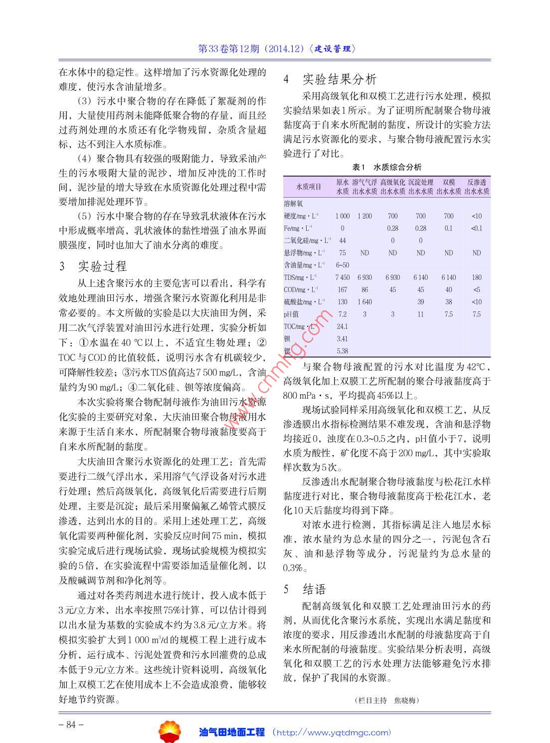 第33卷第12期(2014.12)〈建設(shè)管理油田含聚污水的資源化利用海蘭內(nèi)蒙古化工職業(yè)學(xué)院摘要:目前,稠油熱采、注聚比例逐漸増大,天然能量開發(fā)日漸増多,這導(dǎo)致了部分地區(qū)水源井水、海水和清水,所采出的污水無法完全用于回注,開發(fā)過程中產(chǎn)生過多富余污水。為此提出了一種高級氧化法對污水進行預(yù)處理的工藝,通過強化氧化能力將有毒的有機物分解成二氧化碳和水,有效地處理油田污水,以對石油行業(yè)生態(tài)環(huán)境起到保護作用。將聚合物配母液作為油田污水資源化實驗的主要研究對象。高級氧化加上雙膜工芑所配制的聚合母液黏度高于800mPa·s,平均提高45%以上。反滲透出水配制聚合物母液黏度與松花江水樣黏度進行對比,聚合物母液黏度高于松花江水,老化10天后黏度均得到下降關(guān)鍵詞:高級氧化;含聚污水;資源化處理;雙模工藝doi:10.3969/ J. Issn.1006-6896.2014.120501國內(nèi)研究現(xiàn)狀2油田含聚污水的主要特征我國對原油的需求日趨增長,國內(nèi)大部分油田在采油的過程中,由于油質(zhì)、采油方法以及地已經(jīng)進入開發(fā)中后期,石油污染問題越來越受到關(guān)質(zhì)條件的不同,油田回注水的水質(zhì)也會有所不同。注。目前,稠油熱釆、注聚比例逐漸増大,天然能通常,采油產(chǎn)生的污水含有微生物、化學(xué)藥劑、原量開發(fā)日漸增多,這導(dǎo)致了部分地區(qū)注水源井水、油雜質(zhì)、懸浮顆粒等成分,其水溫度較高,含有大海水和清水,所采出的污水無法完全用于回注,開量SRB和TGB等細(xì)菌,水質(zhì)礦化度嚴(yán)重超標(biāo),存發(fā)過程中產(chǎn)生過多富余污水。例如大慶油田,油田有化學(xué)殘余等其他物質(zhì)。而油田含聚污水不僅具有污水總富余量高于20%,只能依靠無效回灌解決常規(guī)采油污水的特點,并且存有殘余聚合物,具有其岀路。隨著地層回灌容量日漸減少,含聚污水乳一些特有的性質(zhì),具體表現(xiàn)在化程度日益增髙,開展污水資源化硏究工作已經(jīng)刻(1)采油污水含有聚合物,導(dǎo)致污水的黏度增不容緩。加。黏度增加會使水中膠體顆粒增大,聚合物含量為此提出了一種高級氧化法對污水進行預(yù)處理越多,污水的黏度越大,處理污水時間就越長的工藝,通過強化氧化能力將有毒的有機物分解成(2)含聚合物污水90%以上的油珠粒直徑小于二氧化碳和水,有效地處理油田污水,以對石油行70μm,經(jīng)過測試可以得出結(jié)論,聚合物導(dǎo)致油水業(yè)生態(tài)環(huán)境起到保護作用。中水膜增強,水中的正負(fù)電場增強,提升了小油珠(2)管道試壓。首先是強度試驗。儀表風(fēng)、潤油加注管道凍土層以上部分設(shè)電伴熱和保溫,過濾滑油管道強度試驗以壓縮空氣為介質(zhì),其他管道強分離器進氣分支管關(guān)斷閥上游部分設(shè)電伴熱和保度試驗應(yīng)以潔凈水為介質(zhì)。當(dāng)采用水作為試驗介溫。首末站改造部分排污管道凍土層以上部分設(shè)電質(zhì),環(huán)境溫度低于5℃時,應(yīng)有防凍措施,同時進伴熱和保溫。行嚴(yán)密性試驗。5改造站氮氣置換設(shè)備及管道的伴熱保溫新建管道經(jīng)強度試驗和嚴(yán)密性試驗合格之后與(1)設(shè)備伴熱保溫。保溫要求排污罐及DN?0已建管道連接之前,應(yīng)首先切斷可燃?xì)怏w氣源,在的集液包采用δ=80mm厚的離心玻璃棉板保溫,管網(wǎng)首端(進站端)充入氮氣。充入氮氣速度用閥然后用鍍鋅鋼帶捆扎并外包δ=0.8mm復(fù)合防銹型門控制,在管網(wǎng)末端放散口(外輸出口)檢測氣體花紋鋁板一層。過濾分離器集液包采用δ=50mm含量,當(dāng)檢測合格后方可動火連接。置換過程中的厚的離心玻璃棉管殼保溫,然后用鍍鋅鋼帶捆扎并混合氣體經(jīng)放空線排放至火炬。相關(guān)操作可參照外包δ=0.5mm復(fù)合防銹型花紋鋁板一層。《天然氣管道運行規(guī)范(SY丌5922-2003)》執(zhí)行。(2)管道伴熱保溫。增壓站內(nèi)排污管道及潤滑(欄目主持焦曉梅)油氣田地面工程(http://www.yatdmgc.com第33卷第12期(2014.12)〈建設(shè)管理〉在水體中的穩(wěn)定性。這樣增加了污水資源化處理的4實驗結(jié)果分析難度,使污水含油量增多。3)污水中聚合物的存在降低了絮凝劑的作釆用高級氧化和雙模工藝進行污水處理,模擬用,大量使用藥劑未能降低聚合物的存量,而目經(jīng)實驗結(jié)果如表1所示。為了證明所配制聚合物母液過藥劑處理的水質(zhì)還有化學(xué)物殘留,雜質(zhì)含量超黏度高于自來水所配制的黏度,所設(shè)計的實驗方法標(biāo),達(dá)不到注入水質(zhì)標(biāo)準(zhǔn)。滿足污水資源化的要求,與聚合物母液配置污水實(4)聚合物具有較強的吸附能力,導(dǎo)致采油產(chǎn)驗進行了對比生的污水吸附大量的泥沙,增加反沖洗的工作時表1水質(zhì)綜合分析間,泥沙量的增大導(dǎo)致在水質(zhì)資源化處理過程中需原水溶氣氣浮高級氧化沉淀處理雙模反滲透水質(zhì)項目水質(zhì)出水水質(zhì)出水水質(zhì)出水水質(zhì)出水水質(zhì)出水水質(zhì)要增加排泥處理環(huán)節(jié)溶解氧(5)污水中聚合物的存在導(dǎo)致乳狀液體在污水硬度mg·111001207007007010中形成概率增高,乳狀液體的黏性增強了油水界面Femg·L280.280.1<0.1膜強度,同時也加大了油水分離的難度。二氧化硅mg·L44懸浮物mg·L