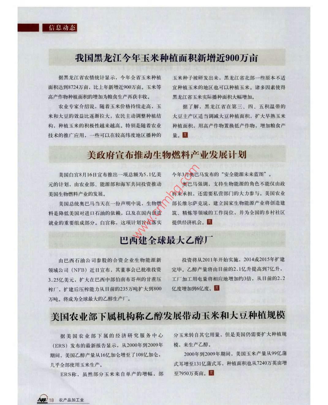 信息動(dòng)態(tài)我國(guó)黑龍江今年玉米種植面積新增近900萬(wàn)畝據(jù)黑龍江省農(nóng)情統(tǒng)計(jì)顯示,今年全省玉米種植玉米種子被研發(fā)出來(lái),黑龍江省北部一些原本不適面積達(dá)到8724萬(wàn)畝,比上年新增近900萬(wàn)畝。玉米等宜種植玉米的地區(qū)也可以種植玉米。諸多因素使得高產(chǎn)作物種植面積的增加為糧食生產(chǎn)再獲豐收。黑龍江省玉米實(shí)際播種面積大幅增加。農(nóng)業(yè)專家介紹說(shuō),隨著玉米價(jià)格持續(xù)走高,玉據(jù)了解,黑龍江省在第三、四、五積溫帶的米和大豆的效益比逐漸拉大,農(nóng)民主動(dòng)調(diào)整種植結(jié)大豆主產(chǎn)區(qū)適當(dāng)調(diào)減大豆種植面積,擴(kuò)大早熟玉米構(gòu),種植玉米的積極性越來(lái)越高。特別是隨著農(nóng)業(yè)種植面積,用高產(chǎn)作物置換低產(chǎn)作物,增加糧食產(chǎn)技術(shù)的推廣應(yīng)用,一些可以在較高緯度地區(qū)播種的量。美政府宣布推動(dòng)生物燃料產(chǎn)業(yè)發(fā)展計(jì)劃美國(guó)白宮8月16日宣布推出一項(xiàng)總額為5.1億美今年3月奧巴馬發(fā)布的“安全能源未來(lái)藍(lán)圖”。元的計(jì)劃,由農(nóng)業(yè)部、能源部和海軍共同投資推動(dòng)奧巴馬強(qiáng)調(diào),支持生物能源的角色不能僅由政美國(guó)生物燃料產(chǎn)業(yè)的發(fā)展。府來(lái)承擔(dān),還需要私營(yíng)部門的大力參與。美國(guó)農(nóng)業(yè)美國(guó)總統(tǒng)奧巴馬當(dāng)天在一份聲明中說(shuō),生物燃部長(zhǎng)維爾薩克說(shuō),建立國(guó)家生物能源產(chǎn)業(yè)將創(chuàng)造建料是降低美國(guó)對(duì)進(jìn)口石油的依賴,以及在國(guó)內(nèi)創(chuàng)造筑、精煉等領(lǐng)域的工作崗位,并為全國(guó)的鄉(xiāng)村社區(qū)就業(yè)的重要組成部分。白宮稱,這項(xiàng)計(jì)劃旨在落實(shí)提供經(jīng)濟(jì)機(jī)會(huì)。巴西建全球最大乙醇廠由巴西石油公司參股的合資企業(yè)生物能源新投資將從2011年開始實(shí)施,2014或2015年擴(kuò)建領(lǐng)域公司(NFB)近日宣布,其董事會(huì)已批準(zhǔn)投資完畢。乙醇產(chǎn)量將由目前的2.1億升提高到7億升,3.25億美元,擴(kuò)大在巴西中部伯南布哥州的甘蔗壓工廠加工用電量將相應(yīng)地增加約3倍,從目前的2.2榨廠,擴(kuò)建后壓榨能力從目前的235萬(wàn)噸擴(kuò)大到800億度增加到6億度。萬(wàn)噸。將成為全球最大的乙醇生產(chǎn)廠。美國(guó)農(nóng)業(yè)部下屬機(jī)構(gòu)稱乙醇發(fā)展帶動(dòng)玉米和大豆種植規(guī)模據(jù)美國(guó)農(nóng)業(yè)部下屬的經(jīng)濟(jì)研究服務(wù)中心分玉米轉(zhuǎn)自其它用量,但是美國(guó)仍需要擴(kuò)大種植規(guī)(ERS)發(fā)布的最新報(bào)告顯示,從2000年到2009年模,來(lái)生產(chǎn)乙醇。期間,美國(guó)乙醇產(chǎn)量從16億加侖增至了108億加侖,2000年到2009年期間,美國(guó)玉米產(chǎn)量從99億蒲幾乎全部使用玉米生產(chǎn)。式耳增至131億蒲式耳,種植面積也從7240萬(wàn)英畝增ERS稱,雖然部分玉米來(lái)自單產(chǎn)的增幅,部至7950萬(wàn)英畝。18農(nóng)產(chǎn)品加工業(yè)