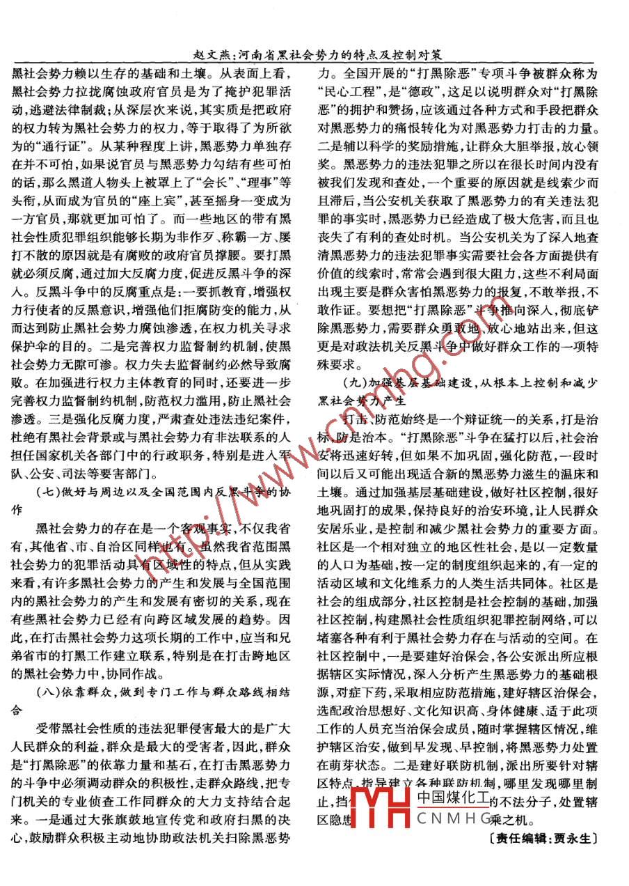 第99柔年第5期鐵道警官高等??茖W(xué)校學(xué)報(bào)、,2002No.4。第12卷Journal of Railway Police CollegeVol. 12 Serial 51河南省黑社會(huì)勢(shì)力的特點(diǎn)及控制對(duì)策趙文燕(鐵道警官高等??茖W(xué)校治安系,河南鄭州450053)[摘要]黑社會(huì)勢(shì)力違法犯罪已經(jīng)成為現(xiàn)代違法犯罪的一種重要形式,其對(duì)社會(huì)治安的穩(wěn)定具有非常大的破壞作用。本文通過對(duì)河南省范圍內(nèi)黑社會(huì)勢(shì)力違法犯罪特點(diǎn)的分析,提出了控制和打擊黑社會(huì)勢(shì)力的一些對(duì)策。[關(guān)鍵詞]河南省;黑社會(huì)勢(shì)力;特 點(diǎn);對(duì)策[中圖分類號(hào)] DF792[文獻(xiàn)標(biāo)志碼] B[文章編號(hào)] 1009 - 3192(2002)04 - 0042 - 04近幾年,河南省范圍內(nèi)從省會(huì)鄭州到其他市縣,為了達(dá)到其目的常常不擇手段,甚至還充當(dāng)他人的黑社會(huì)勢(shì)力的活動(dòng)猖獗,不斷發(fā)生由于黑社會(huì)性質(zhì)打手,接受他人的雇傭進(jìn)行違法犯罪。如:項(xiàng)城市肖組織引發(fā)的各種違法犯罪,有些黑社會(huì)勢(shì)力橫行鄉(xiāng)全彬犯罪團(tuán)伙,從開始霸占魚塘侮辱婦女、尋釁滋里,欺壓群眾,欺行霸市,擾亂正常的市場(chǎng)秩序,對(duì)社事欺行霸市、聚眾淫亂發(fā)展到盜竊、搶劫強(qiáng)奸等嚴(yán)會(huì)治安構(gòu)成了極大的危害。下面就河南省黑社會(huì)勢(shì)重犯罪活動(dòng),先后作案148起,其中搶劫56起,強(qiáng)奸力的特點(diǎn)和相應(yīng)對(duì)策談--些看法。輪奸58起,強(qiáng)奸婦女83人,強(qiáng)奸對(duì)象最大的70歲,一、河南省黑社會(huì)勢(shì)力的特點(diǎn)最小的8歲。所謂黑社會(huì)勢(shì)力,在我們國(guó)家主要是指帶黑社(二)組織比較嚴(yán)密,成員比較穩(wěn)定,形成幫派體會(huì)性質(zhì)的犯罪組織,指某些犯罪集團(tuán)已具有黑社會(huì).系犯罪的某些痕跡和性質(zhì),但還不具備黑社會(huì)犯罪的由一般犯罪團(tuán)伙發(fā)展演化而來的黑社會(huì)性質(zhì)犯完整特征,屬于在集團(tuán)犯罪之上,向黑社會(huì)犯罪過渡罪組織,已經(jīng)不同于那種臨時(shí)糾合、結(jié)構(gòu)松散的- -般的一個(gè)中間形態(tài)。如那些類似于舊中國(guó)的各種幫會(huì)違法犯罪團(tuán)伙,逐步向組織嚴(yán)密型發(fā)展。其內(nèi)部結(jié)組織和有- -定的勢(shì)力范圍,犯罪職業(yè)化,較長(zhǎng)期從事構(gòu)已經(jīng)趨向于嚴(yán)密,組成成員不再是臨時(shí)糾合在一某種或幾種犯罪,人數(shù)一般較多且相對(duì)穩(wěn)定,反社會(huì)起的,而是相對(duì)固定的一些人員。在集團(tuán)中有駕馭性強(qiáng),作惡多端,殘害群眾,有一定經(jīng)濟(jì)實(shí)力的非正組織活動(dòng)、起指揮作用的頭目,在組織內(nèi)部有等級(jí)責(zé)規(guī)組織。這些組織盡管“組織化”程度沒有黑社會(huì)組任之分,有的甚至規(guī)定了幫規(guī)戒律,每個(gè)成員加入進(jìn)織那么高,但已具有了黑社會(huì)組織的特征。河南省來要舉行儀式,履行手續(xù),交納會(huì)費(fèi),既有濃厚的封黑社會(huì)勢(shì)力在其存在和發(fā)展過程中,既包含了黑社建幫會(huì)色彩,又向境外黑社會(huì)學(xué)來--套新的犯罪手會(huì)勢(shì)力的--般特征,同時(shí)也體現(xiàn)出--定地域性的特段,成為一種新型的犯罪幫伙。汝州市唐利峰團(tuán)伙征,表現(xiàn)在:成員分為三個(gè)中隊(duì),內(nèi)部實(shí)行分級(jí)管理方式,統(tǒng)- -著(一)集多種犯罪于一體黑色西服,留“板寸頭”,配備汽車、砍刀、手機(jī)、傳呼在河南省已查獲的黑社會(huì)性質(zhì)組織往往是一些機(jī)等作案工具,每人每月根據(jù)表現(xiàn)領(lǐng)取500元~殺人、傷害、搶劫、強(qiáng)奸、詐騙等犯罪團(tuán)伙。這些團(tuán)伙1000中國(guó)煤化工員接到指令后必須5YHCNMHG[收稿日期]2002 - 08 - 20[作者簡(jiǎn)介]趙文燕(1969-),男,內(nèi)蒙呼和浩特人,鐵道警官高等??茖W(xué)校治安系講師。' 42方方數(shù)據(jù)趙文燕:河南省黑社會(huì)勢(shì)力的特點(diǎn)及控制對(duì)策分鐘內(nèi)趕到現(xiàn)場(chǎng),違者輕則開除,重則斷肢。信陽市然有了“人力資本”,但發(fā)展的條件還不夠,有的是通王賴蛋犯罪團(tuán)伙實(shí)行團(tuán)伙頭目管骨干,骨干管一般過以金錢賄賂政法機(jī)關(guān)的- -些執(zhí)法人員,為其開脫,成員的等級(jí)制度,并在人伙審查、分工、保密等方面為其開路;有的是通過暴力手段進(jìn)人基層政權(quán)組織有嚴(yán)格的規(guī)定。內(nèi)部,依仗權(quán)勢(shì)橫行鄉(xiāng)里。鄭州鞋城的- -些帶黑社(三)稱霸一方,欺壓良善,無惡不作會(huì)性質(zhì)的流氓惡勢(shì)力,積極掛靠某些黨政機(jī)關(guān),每月黑社會(huì)勢(shì)力--般都有自己的勢(shì)力范圍,俗稱“地向掛靠單位或幕后保護(hù)人交納5000元以上的費(fèi)用,盤”。黑社會(huì)勢(shì)力經(jīng)過一定時(shí)期的發(fā)展, -般都控制遇到麻煩就請(qǐng)掛靠單位或有關(guān)人員出面擺平。輝縣一定的地盤,而且有些黑社會(huì)勢(shì)力通過竊取--定的.市流氓惡勢(shì)力首犯琚金中,依仗上千萬元的資產(chǎn),極權(quán)力,使用各種非法手段在一些地方取得了控制權(quán)力與一些政府官員、政法民警拉關(guān)系,出事后琚本人后,稱霸一方,為非作惡。商丘市謝