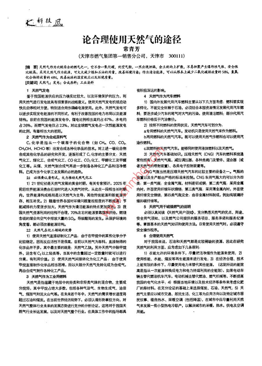 科技論合理使用天然氣的途徑常青芳(天津市燃氣集團第一銷售分公司,天津市30011)摘要天然氣作為比較安全的燃氣之一,它不含一氧化唳,比空氣輕,一旦出現(xiàn)泄漏,會立刻向上擴散,不易積聚產生爆炸性氣體,安全性比較高。采用天然氣作為能源,可大大減少煤和石油的用量,改善環(huán)境污染;作為清潔能源,可以從根本上減少二氧化喉排放量的58%,氮氧化合物排放量的48%,改善地球的溫室效應以及環(huán)境質量[關鍵詞天然氣;發(fā)電;合成原料;工業(yè)染料1天然氣發(fā)電有積極深遠的影響。鑒于我國能源供應的壓力確實比較大、以及環(huán)境保護的壓力,利4天然氣作為汽車熔料用天然氣進行發(fā)電就具有很重婆的戰(zhàn)略意義。使用天然氣發(fā)電機組啟動1)國內外發(fā)展代用汽車燃料主要從以下幾方面考慮:燃料要實現(xiàn)快且啟停相對方便,特別適合用作調峰電源使用。此外,天然氣發(fā)電可多樣化,不能完全依賴于石油,必須結合本國資源情況發(fā)展代用汽車燃以逐步實現(xiàn)發(fā)電能源的不同形式,有利于改善我國的電力布局以及能源料;要逐步減少汽車的尾氣對大氣的污染,使用清潔燃料;部分代用汽結構。目前在我國的能源發(fā)電中,煤電比例相當高約占67%,水電約車燃料價格低于汽油售價。占26%,而燃氣發(fā)電僅占23%,對比全球燃氣發(fā)電占一次性能源發(fā)電2)按照不同燃料的使用狀況,天然氣汽車可劃分為的比例,有著相當大的差距。a專用燃料的天然氣汽車。發(fā)動機只是使用天然氣來作為燃料。2天然氣作為合成原料氣b兩用燃料的天然氣汽車。既可以使用天然氣作燃料也可以使用汽C1化學是指從一個碳原子的化合物(如cH、co、cO2油作燃料CH2OH、HCHo等)出發(fā)合成各種化學品的技術。對上述一碳化合物c雙燃料的天然氣汽車。能夠同時使用液體燃料以及天然氣。合成其他化學品的研究和開發(fā),逐漸形成了C,化學的主要分支:天然3)天然氣汽車基礎知識。壓縮天然氣CNG)汽車的燃料系統(tǒng)通氣化工、燦化工、合成氣化工、CO化、CO2化、甲醇化工及甲醛常包括有:天然氣氣瓶,減壓調壓器,各種類閥門及管件、混合器域或化工等。從煤、天然氣制合成氣再進一步制備各種化工產品和潔凈燃者天然氣的噴射裝置)、各類電子控制裝置等料,已成為當今化學工業(yè)發(fā)展的必然趨勢。cNG氣瓶當然是壓縮天然氣汽車的比較主要的設備之一。氣瓶的2A必須要認清形式,大力推動天然氣化工設置以及生產都由嚴格的標準來控制。CNG車用氣瓶大約可以分為四1)21世紀初是天然氣發(fā)展的黃金時期,有關專家預計,2025年類:第一類氣瓶:全金屬氣瓶,材料是鋁或鋼第二類氣瓶:采用金屬前后世界能源消費由石油時代進入天然氣時代,從此在一段相當長時期內襯,外面使用纖維環(huán)狀纏繞:第三類氣瓶:采用薄金屬內襯,外面使內,世界能源構成格局是以天然氣為主導,其他傳統(tǒng)能源和新能源并用纖維完全纏繞;第四類氣瓶完全:由非金屬材料制成,例如有玻璃纖存、相互補充。2)隨著世界各國對環(huán)境問題重視程度的不斷提高,節(jié)維和碳纖維等。能減排的力度逐步加大,天然氣作為清潔能源的特點更加突出。3)我5天然氣用于城鎮(zhèn)燃氣的說明國天然氣資源利用的結構不合理,70%左右的能源要靠煤來供給,燃燒必須認真閱讀矢然氣用戶須知,充分熟悉天然氣的優(yōu)點、用途含硫的煤會向空氣中排放大量的SO2導致酸雨的發(fā)生。從保護環(huán)境的安全用氣須知、以及燃氣公司提供的服務項目、服務承諾和服務紀律角度看,都必須改善能源結構。等,掌握基本的天然氣知識和使用方法。日常使用天然氣時,必須遵守22天然氣在化工領域的優(yōu)勢1)使用天然氣直接研制化工產品:由于在甲烷中的某些化學分子6合理使用天然汽氣比較穩(wěn)定,因而反應活性不是很高,目前以天然氣為原料,直接制得的對于我國來說,石油和天然氣都是比較稀缺的資源,因此在研究化學品并不多,其中最主要的就是:天然氣乙炔。另外天然氣中除甲烷天然氣的利用方面,應考慮如下幾條原則外,還含有C2以上烴類等,當其中的含量超過一定數(shù)量時就可以進行1)在能允許的環(huán)境條件下,盡量把潔凈煤作為能源來使用;2分窩,有利用價值。2)使用天然氣間接轉化為化工產品:由于使用使用核能、水能、煤炭等再生能源來進行發(fā)電;3)在經濟合理、技術甲烷直接制作化學品相當困難,所以大部分天然氣先轉化成為合成上能有效的條件下,盡量使用電力來替代其他能源,(這里所說的能效再由合成氣制作各種化工產品高是指從一次能源轉換成電力和電力終端利用的全能效,如果電動車3天然氣作為工業(yè)用燃料天然氣是指蘊藏于地層中的烴類和非烴類氣體的混合物,主要成我國的電氣化水平;4)根據當?shù)丨h(huán)境以及技術經濟等條件來考慮化肥分烷烴,其中甲烷占絕大多數(shù),包括各種氣田氣、生物生成氣、油田廠的原材料,在充分論證的基礎上來選擇煤炭、石油、天然氣;5)天氣、煤層氣和泥火山氣等。在未來若干年中,天然氣的需求增長速度將然氣主要應以城市交通、居民生活、化工等為應用方向以及特定城市居超過石油和煤炭。在當前世界經濟局勢下,必須認清形勢掌控方向,對民炊寧、樓房熱水、采暖空調(包括降溫,在城市中應盡量利用天然