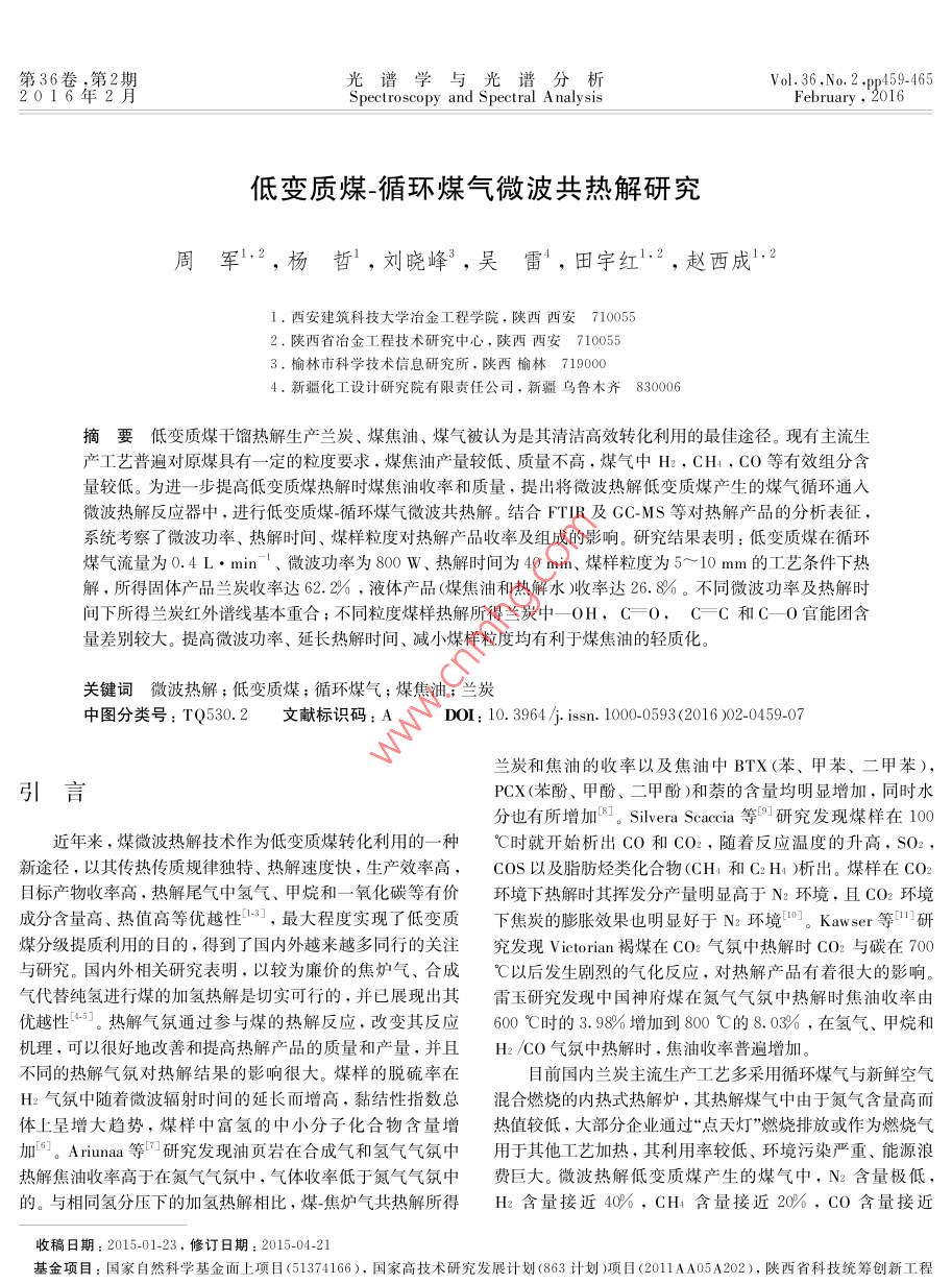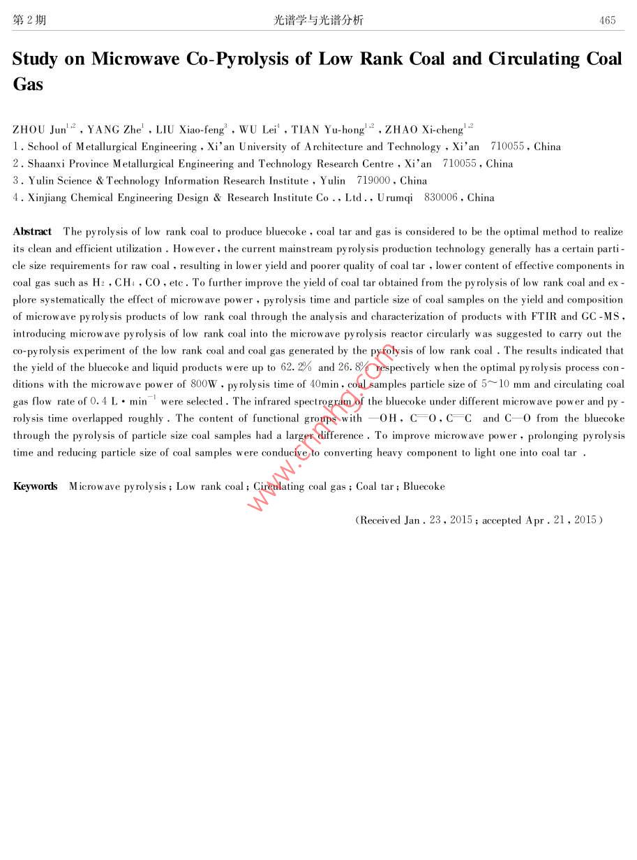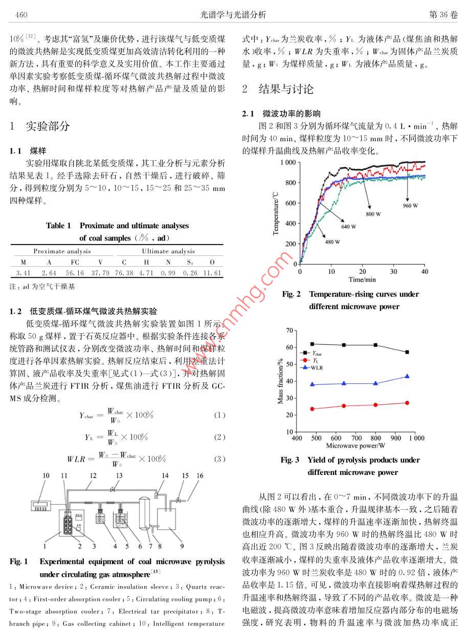 第36卷,第2期光譜學(xué)與光譜分析Vol. 36.No.2 ,pp459-4652016年2月Spectroscopy and Spectral A nalysisFebruary , 2016低變質(zhì)煤~循環(huán)煤氣微波共熱解研究周軍',2,楊哲’,劉曉峰”,吳雷,田宇紅2,趙西成121.西安建筑科技大學(xué)冶金工程學(xué)院.陜西西安7100552.陜西省冶金工程技術(shù)研究中心,陜西西安7100553.榆林市科學(xué)技術(shù)信息研究所,陜西榆林7190004.新疆化工設(shè)計研究院有限責(zé)任公司,新疆烏魯木齊830006摘要低變質(zhì)煤干餾熱解生產(chǎn)蘭炭、煤焦油、 煤氣被認(rèn)為是其清潔高效轉(zhuǎn)化利用的最佳途徑?,F(xiàn)有主流生產(chǎn)工藝普遍對原煤具有一定的粒度要求.煤焦油產(chǎn)量較低、質(zhì)量不高,煤氣中Hz, CH,CO等有效組分含量較低。為進(jìn)一步提高低變質(zhì)煤熱解時煤焦油收率和質(zhì)量,提出將微波熱解低變質(zhì)煤產(chǎn)生的煤氣循環(huán)通入微波熱解反應(yīng)器中,進(jìn)行低變質(zhì)煤循環(huán)煤氣微波共熱解。結(jié)合FTIR及GC-MS等對熱解產(chǎn)品的分析表征,系統(tǒng)考察了微波功率、熱解時間、煤樣粒度對熱解產(chǎn)品收率及組成的影響。研究結(jié)果表明:低變質(zhì)煤在循環(huán)煤氣流量為0.4 L. min '、微波功率為800 w.熱解時間為40 min、煤樣粒度為5~ 10 mm的工藝條件下熱解,所得固體產(chǎn)品蘭炭收率達(dá)62.2%,液體產(chǎn)品(煤焦油和熱解水)收率達(dá)26.8%。不同微波功率及熱解時間下所得蘭炭紅外譜線基本重合;不同粒度煤樣熱解所得蘭炭中一OH,C =0,CFC和C-0官能團(tuán)含量差別較大。提高微波功率、延長熱解時間、減小煤樣粒度均有利于煤焦油的輕質(zhì)化。關(guān)鍵詞微波熱解 ;低變質(zhì)煤;循環(huán)煤氣;煤焦油;蘭炭中圖分類號: TQ530.2文獻(xiàn)標(biāo)識碼: ADOI: 10. 3964/j. ssn. 1000-0593(2016 )02-0459-07蘭炭和焦油的收率以及焦油中BTX(苯、甲苯、二甲苯),引言PCX(苯酚、甲酚、二甲酚)和萘的含量均明顯增加,同時水分也有所增加”。Silvera Seaccia等91研究發(fā)現(xiàn)煤樣在100近年來,煤微波熱解技術(shù)作為低變質(zhì)煤轉(zhuǎn)化利用的一-種°C時就開始析出CO和CO2,隨著反應(yīng)溫度的升高,SO2,新途徑,以其傳熱傳質(zhì)規(guī)律獨(dú)特、熱解速度快,生產(chǎn)效率高,COS以及脂肪烴類化合物(CH:和C2 H )析出。煤樣在CO2目標(biāo)產(chǎn)物收率高,熱解尾氣中氫氣、甲烷和一- 氧化碳等有價環(huán)境下熱解時其揮發(fā)分產(chǎn)量明顯高于N2環(huán)境,且CO2環(huán)境成分含量高、熱值高等優(yōu)越性13],最大程度實(shí)現(xiàn)了低變質(zhì)下焦炭的膨脹效果也明顯好于N2環(huán)境”0]。Kawser 等研煤分級提質(zhì)利用的目的,得到了國內(nèi)外越來越多同行的關(guān)注究發(fā)現(xiàn)Vicetorian褐煤在CO2氣氛中熱解時CO2與碳在700與研究。國內(nèi)外相關(guān)研究表明,以較為廉價的焦?fàn)t氣、合成°C以后發(fā)生劇烈的氣化反應(yīng),對熱解產(chǎn)品有著很大的影響。氣代替純氫進(jìn)行煤的加氫熱解是切實(shí)可行的,并已展現(xiàn)出其雷玉研究發(fā)現(xiàn)中國神府煤在氮?dú)鈿夥罩袩峤鈺r焦油收率由優(yōu)越性*5。熱解氣氛通過參與煤的熱解反應(yīng),改變其反應(yīng)600 C時的3. 98%增加到800 °C的8.03% , 在氫氣、甲烷和機(jī)理,可以很好地改善和提高熱解產(chǎn)品的質(zhì)量和產(chǎn)量,并且.H2 /C0氣氛中熱解時,焦油收率普遍增加。不同的熱解氣氛對熱解結(jié)果的影響很大。煤樣的脫硫率在目前國內(nèi)蘭炭主流生產(chǎn)工藝多采用循環(huán)煤氣與新鮮空氣H2氣氛中隨著微波輻射時間的延長而增高,黏結(jié)性指數(shù)總混合燃燒的內(nèi)熱式熱解爐,其熱解煤氣中由于氮?dú)夂扛叨w上呈增大趨勢,煤樣中富氫的中小分子化合物含量增熱值較低,大部分企業(yè)通過“點(diǎn)天燈”燃燒排放或作為燃燒氣加”。Ariunaa等口研究發(fā)現(xiàn)油頁巖在合成氣和氫氣氣氛中用于其他工藝加熱,其利用率較低、環(huán)境污染嚴(yán)重、能源浪費(fèi)巨大。微波熱解低變質(zhì)煤產(chǎn)生的煤氣中,N2含量極低,的。與相同氫分壓下的加氫熱解相比,煤焦?fàn)t氣共熱解所得H2含量接近40%,CH4含量接近20%,C0含量接近.收稿日期: 2015-01-23.修訂日期: 2015-04-21基金項(xiàng)目:國家自然科學(xué)基金面上項(xiàng)目(51374166).國家高技術(shù)研究發(fā)展計劃(863計劃)項(xiàng)目<2011AA05A202).陜西省科技統(tǒng)籌創(chuàng)新工程460光譜學(xué)與光譜分析第36卷10%021??紤]其“富氫”及廉價優(yōu)勢.進(jìn)行該煤氣與低變質(zhì)煤式中:Yehar為蘭炭收率,%;YL為液體產(chǎn)品(煤焦油和熱解的微波共熱解是實(shí)現(xiàn)低變質(zhì)煤更加高效清潔轉(zhuǎn)化利用的- -種水)收率,% ; WLR為失重率,% ; Wahar 為固體產(chǎn)品蘭炭質(zhì)新方法,具有重要的科學(xué)意義及實(shí)用價值。本工作主要通過量,g; Wo為煤樣質(zhì)量,g; W1.為液體產(chǎn)品質(zhì)量,go單因素實(shí)驗(yàn)考察低變質(zhì)煤循環(huán)煤氣微波共熱解過程中微波功率、熱解時間和煤樣粒度等對熱解產(chǎn)品產(chǎn)量及質(zhì)量的影2結(jié)果與討論.向。2.1微波 功率的影響1實(shí)驗(yàn)部分圖2和圖3分別為循環(huán)煤氣流量為0.4L●min'、熱解時間為40 min、煤樣粒度為10~ 15 mm時,不同微波功率下1.1 煤樣的煤樣升溫曲線及熱解產(chǎn)