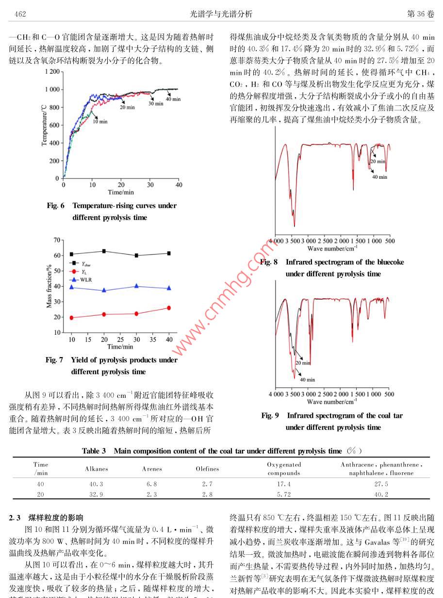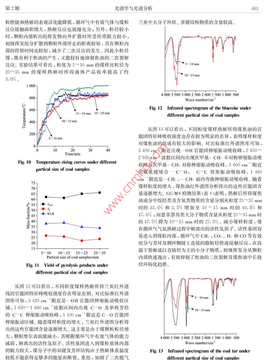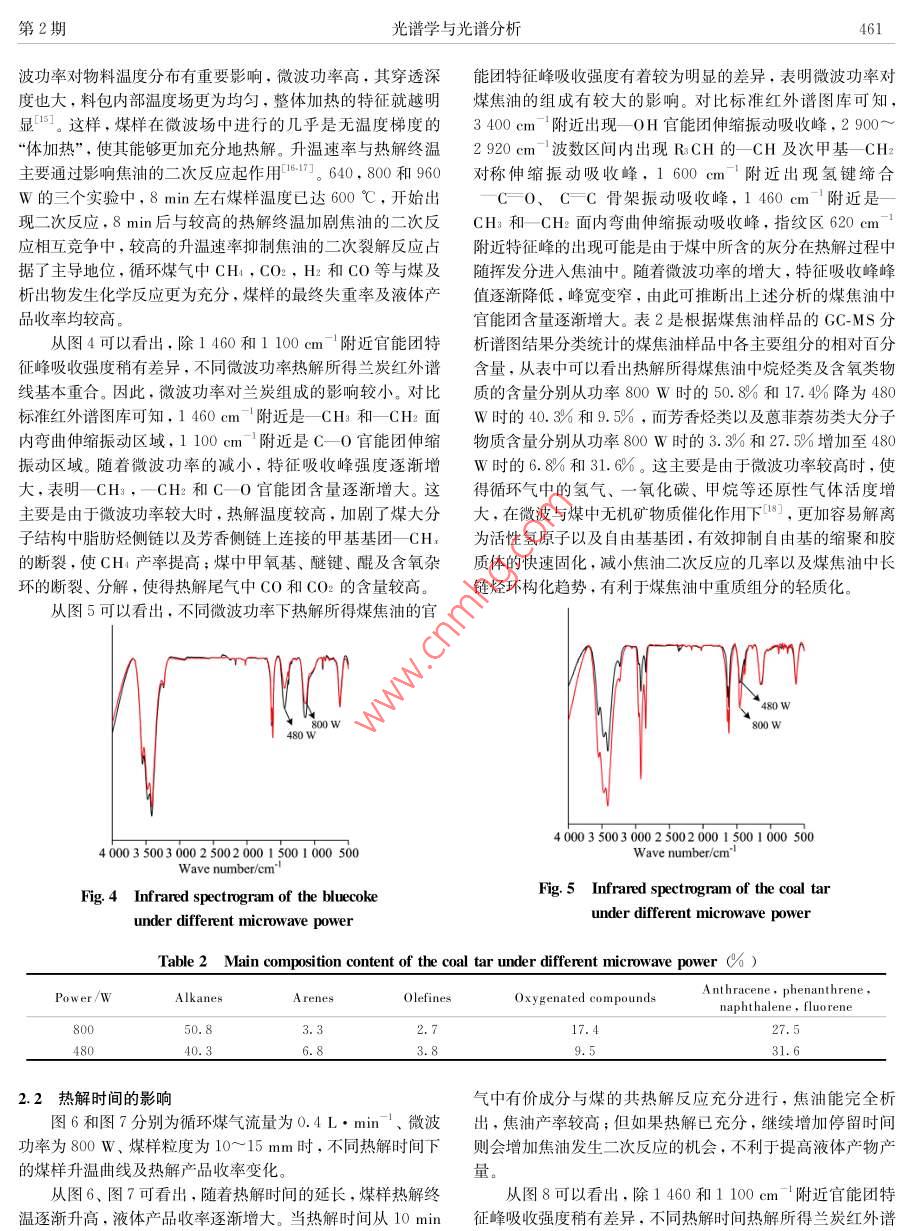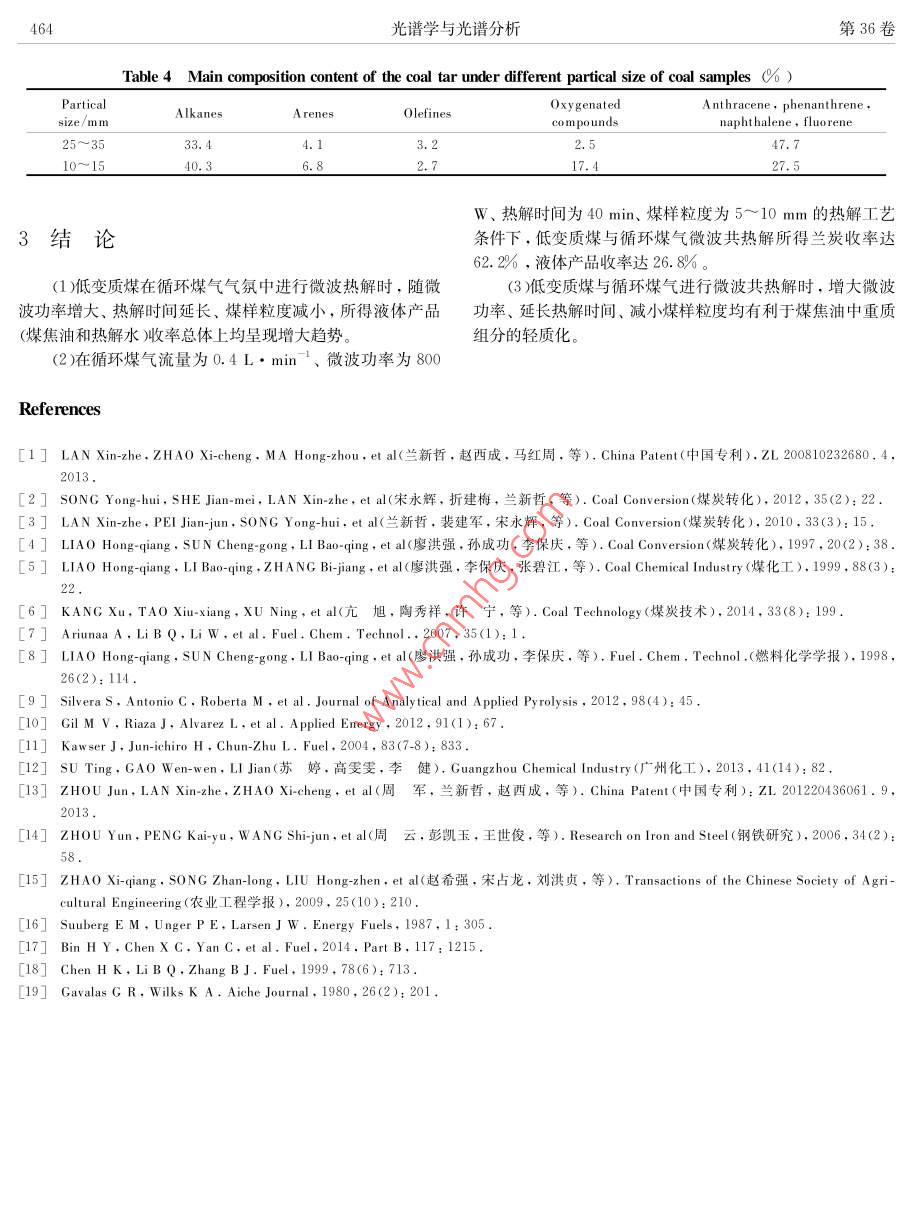 第36卷,第2期光譜學(xué)與光譜分析Vol. 36.No.2 ,pp459-4652016年2月Spectroscopy and Spectral A nalysisFebruary , 2016低變質(zhì)煤~循環(huán)煤氣微波共熱解研究周軍',2,楊哲’,劉曉峰”,吳雷,田宇紅2,趙西成121.西安建筑科技大學(xué)冶金工程學(xué)院.陜西西安7100552.陜西省冶金工程技術(shù)研究中心,陜西西安7100553.榆林市科學(xué)技術(shù)信息研究所,陜西榆林7190004.新疆化工設(shè)計研究院有限責(zé)任公司,新疆烏魯木齊830006摘要低變質(zhì)煤干餾熱解生產(chǎn)蘭炭、煤焦油、 煤氣被認(rèn)為是其清潔高效轉(zhuǎn)化利用的最佳途徑?,F(xiàn)有主流生產(chǎn)工藝普遍對原煤具有一定的粒度要求.煤焦油產(chǎn)量較低、質(zhì)量不高,煤氣中Hz, CH,CO等有效組分含量較低。為進(jìn)一步提高低變質(zhì)煤熱解時煤焦油收率和質(zhì)量,提出將微波熱解低變質(zhì)煤產(chǎn)生的煤氣循環(huán)通入微波熱解反應(yīng)器中,進(jìn)行低變質(zhì)煤循環(huán)煤氣微波共熱解。結(jié)合FTIR及GC-MS等對熱解產(chǎn)品的分析表征,系統(tǒng)考察了微波功率、熱解時間、煤樣粒度對熱解產(chǎn)品收率及組成的影響。研究結(jié)果表明:低變質(zhì)煤在循環(huán)煤氣流量為0.4 L. min '、微波功率為800 w.熱解時間為40 min、煤樣粒度為5~ 10 mm的工藝條件下熱解,所得固體產(chǎn)品蘭炭收率達(dá)62.2%,液體產(chǎn)品(煤焦油和熱解水)收率達(dá)26.8%。不同微波功率及熱解時間下所得蘭炭紅外譜線基本重合;不同粒度煤樣熱解所得蘭炭中一OH,C =0,CFC和C-0官能團(tuán)含量差別較大。提高微波功率、延長熱解時間、減小煤樣粒度均有利于煤焦油的輕質(zhì)化。關(guān)鍵詞微波熱解 ;低變質(zhì)煤;循環(huán)煤氣;煤焦油;蘭炭中圖分類號: TQ530.2文獻(xiàn)標(biāo)識碼: ADOI: 10. 3964/j. ssn. 1000-0593(2016 )02-0459-07蘭炭和焦油的收率以及焦油中BTX(苯、甲苯、二甲苯),引言PCX(苯酚、甲酚、二甲酚)和萘的含量均明顯增加,同時水分也有所增加”。Silvera Seaccia等91研究發(fā)現(xiàn)煤樣在100近年來,煤微波熱解技術(shù)作為低變質(zhì)煤轉(zhuǎn)化利用的一-種°C時就開始析出CO和CO2,隨著反應(yīng)溫度的升高,SO2,新途徑,以其傳熱傳質(zhì)規(guī)律獨(dú)特、熱解速度快,生產(chǎn)效率高,COS以及脂肪烴類化合物(CH:和C2 H )析出。煤樣在CO2目標(biāo)產(chǎn)物收率高,熱解尾氣中氫氣、甲烷和一- 氧化碳等有價環(huán)境下熱解時其揮發(fā)分產(chǎn)量明顯高于N2環(huán)境,且CO2環(huán)境成分含量高、熱值高等優(yōu)越性13],最大程度實(shí)現(xiàn)了低變質(zhì)下焦炭的膨脹效果也明顯好于N2環(huán)境”0]。Kawser 等研煤分級提質(zhì)利用的目的,得到了國內(nèi)外越來越多同行的關(guān)注究發(fā)現(xiàn)Vicetorian褐煤在CO2氣氛中熱解時CO2與碳在700與研究。國內(nèi)外相關(guān)研究表明,以較為廉價的焦?fàn)t氣、合成°C以后發(fā)生劇烈的氣化反應(yīng),對熱解產(chǎn)品有著很大的影響。氣代替純氫進(jìn)行煤的加氫熱解是切實(shí)可行的,并已展現(xiàn)出其雷玉研究發(fā)現(xiàn)中國神府煤在氮?dú)鈿夥罩袩峤鈺r焦油收率由優(yōu)越性*5。熱解氣氛通過參與煤的熱解反應(yīng),改變其反應(yīng)600 C時的3. 98%增加到800 °C的8.03% , 在氫氣、甲烷和機(jī)理,可以很好地改善和提高熱解產(chǎn)品的質(zhì)量和產(chǎn)量,并且.H2 /C0氣氛中熱解時,焦油收率普遍增加。不同的熱解氣氛對熱解結(jié)果的影響很大。煤樣的脫硫率在目前國內(nèi)蘭炭主流生產(chǎn)工藝多采用循環(huán)煤氣與新鮮空氣H2氣氛中隨著微波輻射時間的延長而增高,黏結(jié)性指數(shù)總混合燃燒的內(nèi)熱式熱解爐,其熱解煤氣中由于氮?dú)夂扛叨w上呈增大趨勢,煤樣中富氫的中小分子化合物含量增熱值較低,大部分企業(yè)通過“點(diǎn)天燈”燃燒排放或作為燃燒氣加”。Ariunaa等口研究發(fā)現(xiàn)油頁巖在合成氣和氫氣氣氛中用于其他工藝加熱,其利用率較低、環(huán)境污染嚴(yán)重、能源浪費(fèi)巨大。微波熱解低變質(zhì)煤產(chǎn)生的煤氣中,N2含量極低,的。與相同氫分壓下的加氫熱解相比,煤焦?fàn)t氣共熱解所得H2含量接近40%,CH4含量接近20%,C0含量接近.收稿日期: 2015-01-23.修訂日期: 2015-04-21基金項(xiàng)目:國家自然科學(xué)基金面上項(xiàng)目(51374166).國家高技術(shù)研究發(fā)展計劃(863計劃)項(xiàng)目<2011AA05A202).陜西省科技統(tǒng)籌創(chuàng)新工程460光譜學(xué)與光譜分析第36卷10%021??紤]其“富氫”及廉價優(yōu)勢.進(jìn)行該煤氣與低變質(zhì)煤式中:Yehar為蘭炭收率,%;YL為液體產(chǎn)品(煤焦油和熱解的微波共熱解是實(shí)現(xiàn)低變質(zhì)煤更加高效清潔轉(zhuǎn)化利用的- -種水)收率,% ; WLR為失重率,% ; Wahar 為固體產(chǎn)品蘭炭質(zhì)新方法,具有重要的科學(xué)意義及實(shí)用價值。本工作主要通過量,g; Wo為煤樣質(zhì)量,g; W1.為液體產(chǎn)品質(zhì)量,go單因素實(shí)驗(yàn)考察低變質(zhì)煤循環(huán)煤氣微波共熱解過程中微波功率、熱解時間和煤樣粒度等對熱解產(chǎn)品產(chǎn)量及質(zhì)量的影2結(jié)果與討論.向。2.1微波 功率的影響1實(shí)驗(yàn)部分圖2和圖3分別為循環(huán)煤氣流量為0.4L●min'、熱解時間為40 min、煤樣粒度為10~ 15 mm時,不同微波功率下1.1 煤樣的煤樣升溫曲線及熱解產(chǎn)