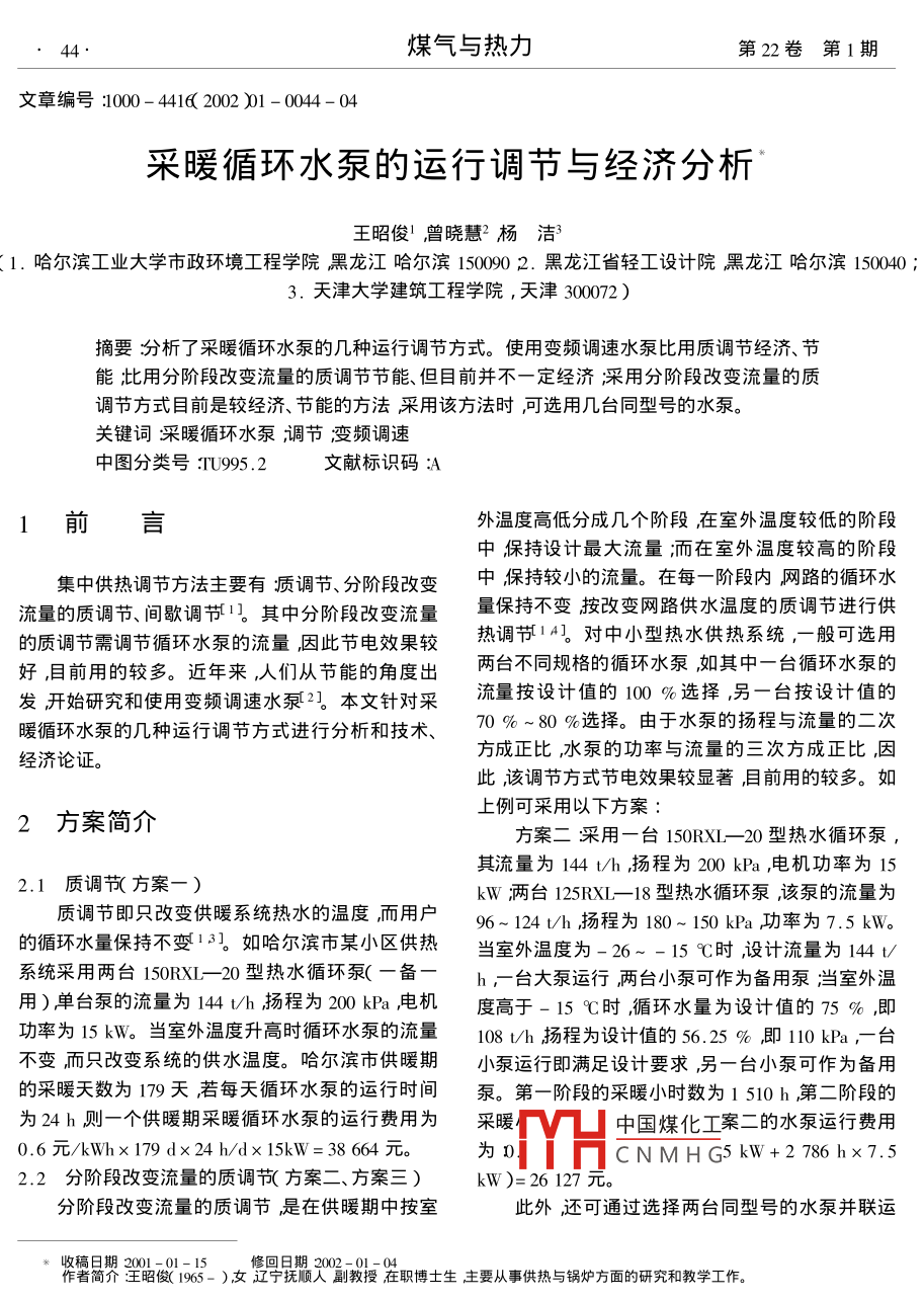 煤氣與熱力第22卷第1期文章編號:1000- 4416( 2002 )01 - 0044- 04采暖循環(huán)水泵的運行調(diào)節(jié)與經(jīng)濟分析王昭俊'曾曉慧?楊潔( 1.哈爾濱工業(yè)大學市政環(huán)境工程學院黑龍江哈爾濱150090 2.黑龍江省輕工設計院黑龍江哈爾濱150040;3.天津大學建筑工程學院,天津300072)摘要:分析了采暖循環(huán)水泵的幾種運行調(diào)節(jié)方式。使用變頻調(diào)速水泵比用質(zhì)調(diào)節(jié)經(jīng)濟、節(jié)能;此用分階段改變流量的質(zhì)調(diào)節(jié)節(jié)能、但目前并不一定經(jīng)濟 ;采用分階段改變流量的質(zhì)調(diào)節(jié)方式目前是較經(jīng)濟、節(jié)能的方法采用該方法時,可選用幾臺同型號的水泵。關(guān)鍵詞采暖循環(huán)水泵,調(diào)節(jié);變 頻調(diào)速中圖分類號:TU995.2文獻標識碼:A1前言外溫度高低分成幾個階段在室外溫度較低的階段中保持設計最大流量;而在室外溫度較高的階段集中供熱調(diào)節(jié)方法主要有質(zhì)調(diào)節(jié)、分階段改變中,保持較小的流量。在每一階段內(nèi)網(wǎng)路的循環(huán)水流量的質(zhì)調(diào)節(jié)、間歇調(diào)節(jié)11。其中分階段改變流量量保持不變按改變網(wǎng)路供水溫度的質(zhì)調(diào)節(jié)進行供的質(zhì)調(diào)節(jié)需調(diào)節(jié)循環(huán)水泵的流量,因此節(jié)電效果較熱調(diào)節(jié)[14。對中小型熱水供熱系統(tǒng),-般可選用好,目前用的較多。近年來人們從節(jié)能的角度出兩臺不同規(guī)格的循環(huán)水泵,如其中-臺循環(huán)水泵的發(fā)開始研究和使用變頻調(diào)速水泵2。本文針對采流量按設計值的100 %選擇,另一臺按設計值的暖循環(huán)水泵的幾種運行調(diào)節(jié)方式進行分析和技術(shù)、70 %~80 %選擇。由于水泵的揚程與流量的二次方成正比,水泵的功率與流量的三次方成正比,因經(jīng)濟論證。此,該調(diào)節(jié)方式節(jié)電效果較顯著,目前用的較多。如上例可采用以下方案:2方案簡介方案二采用一臺150RXL- 20 型熱水循環(huán)泵,其流量為144 l/h揚程為200 kPa ,電機功率為152.1質(zhì)調(diào)節(jié)( 方案一)kW兩臺125RXL-18型熱水循環(huán)泵,該 泵的流量為質(zhì)調(diào)節(jié)即只改變供暖系統(tǒng)熱水的溫度,而用戶96~ 124 t/h揚程為180~ 150 kPa功率為7.5 kW。的循環(huán)水量保持不變13。如哈爾濱市某小區(qū)供熱當室外溫度為-26~ -15 c時,設計流量為144 1/系統(tǒng)采用兩臺150RXL--20型熱水循環(huán)泵(-備--h-臺大泵運行,兩臺小泵可作為備用泵;當室外溫用)單臺泵的流量為144 t/h揚程為200 kPa ,電機度高于- 15 C時,循環(huán)水量為設計值的75 % ,即功率為15kW。當室外溫度升高時循環(huán)水泵的流量108 t/h揚程為設計值的56.25 % ,即110 kPa,-臺不變而只改變系統(tǒng)的供水溫度。哈爾濱市供暖期小泵運行即滿足設計要求,另一臺小泵可作為備用的采暖天數(shù)為179天若每天循環(huán)水泵的運行時間泵。第一階段的采暖小時數(shù)為1 510 h第二階段的為24h則一個供暖期采暖循環(huán)水泵的運行費用為采暖中國煤化工案二的水泵運行費用0.6元/kWhx 179 dx24 h/dx 15kW= 38 664元。為oMYHCNMH G5 kW +2 786 hx7.52.2分階 段改變流量的質(zhì)調(diào)節(jié)(方案二、方案三)kW )=26127元。分階段改變流量的質(zhì)調(diào)節(jié)是在供暖期中按室此外,還可通過選擇兩臺同型號的水泵并聯(lián)運*收稿日期2001-01-15修回日期2002 -01-04作者簡介:王昭俊( 1965- )女遼寧撫順人副教授在職博士生主要從事供熱與鍋爐方面的研究和教學工作。2002年2月王昭俊等采暖循環(huán)水泵的運行調(diào)節(jié)與經(jīng)濟分析45.行增加網(wǎng)路流量的方法來實現(xiàn)分階段改變流量的質(zhì)方案四采用兩臺150RXL- -20 型熱水循環(huán)泵,調(diào)節(jié)即當室外溫度較低時兩臺同型號的水泵并聯(lián)-臺變頻調(diào)速器按1500元/kW估算約需22500運行,而當室外溫度較高時,只運行其中的一臺水元) ,當室外溫度為-26~ -15 C時,單臺泵運行,泵另一臺水泵作為備用泵。該方法運行調(diào)節(jié)較方泵的流量為144 /h揚程為200 kPa電機功率為15便,且設備備用率較高為方案三。kW電機的轉(zhuǎn)速為1 460 r/min;當室外溫度高于方案三采用三臺125RXL- -18型熱水循環(huán)泵,-15C時,-臺水泵運行,且將水泵的轉(zhuǎn)速調(diào)節(jié)為單臺泵的流量為96~ 124 t/h揚程為180~ 150 kPa,設計值的75 % ,即1 095 r/min ,因為流量與轉(zhuǎn)速成功率為7.5 kW。當室外溫度為- 26~ - 15C時兩正比、揚程與轉(zhuǎn)速的二次方成正比、功率與轉(zhuǎn)速的三臺泵并聯(lián)運行另一臺泵為備用泵,在并聯(lián)運行最佳次方成正比此時水泵的流量為108 t/h揚程為110工況點系統(tǒng)的總流量約為單臺泵的流量的125 % ,kPa功率為6.33 kW。方案四的水泵運行費用為:即120~155t/h,并聯(lián)后的揚程約為單臺泵的揚程0.6元/kWhx( 1510hx 15 kW+2 786hx6.33 kW )的150 % ,即270~ 220 kPa滿足設計要求,而并聯(lián)=24 171.23元。運行后的功率為單臺泵運行的功率的140 % ,即10.5kWf5。當室外溫度高于-15 9時,-臺泵運行3方案比較即可滿足設計要求,另兩臺泵可作備用泵。方案三的水泵運行費用為:0. 6元/kWhx( 1510 hx 10.四種水泵運行調(diào)節(jié)方式比較見表1方案比較5kW +2786 hx7.5 kW )=22 050元。見圖1。2.3利用變頻調(diào)速技術(shù)進行調(diào)節(jié)(方案四)表1水泵運行調(diào)