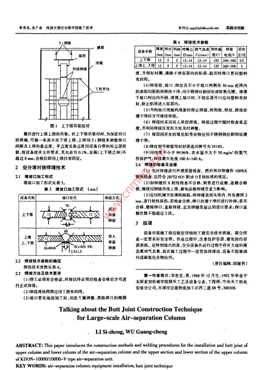 科技惴報(bào)開(kāi)發(fā)與經(jīng)濟(jì)SCI-TECH INFORM ATION DEVELOPMENT ECONOMY2009年第19卷第31期文章編號(hào):1005-6033(200)31-0212-02收稿日期:2009-08-15淺談大型空分塔對(duì)接施工技術(shù)李思忠,吳廣成中冶天工機(jī)電安裝分公司,天津,300308)摘要:介紹了KDON-1000010000V型空分裝置中空氣分餾塔上下塔及上塔上、下段安、對(duì)接的施工方法及焊揍工藝關(guān)鍵詞:空分塔;設(shè)備安裝;對(duì)接技術(shù)中圖分類(lèi)號(hào):TU85文獻(xiàn)標(biāo)識(shí)碼:AFON-100001000~v型分餾塔系統(tǒng)是KDON-000010000考慮到上塔壁較薄如果質(zhì)址太大起吊時(shí)上塔容易產(chǎn)生變Ⅴ型空分裝置中的主要組成系統(tǒng)之一,該系統(tǒng)保冷箱外形尺寸為形,也考慮到對(duì)接焊縫施T難易程度及塔體垂直度和橢園度的12000mmx7800mm×51000mm,設(shè)備安裝25臺(tái),重約3542,調(diào)整決定分3次吊裝,下塔與冷凝蒸發(fā)器組合一次,上塔下段管道3964m,重約1261,空分塔系統(tǒng)設(shè)備總重約36681,冷箱次,上塔上段一次。因考慮到冷箱及其他設(shè)備的安裝,主吊機(jī)及冷箱內(nèi)的設(shè)備管道由杭州制氧機(jī)集團(tuán)有限公司提供。選用150t履帶吊,吊裝參數(shù)見(jiàn)表2該系統(tǒng)的設(shè)備及管道多為薄壁鋁制品,均安裝在冷箱內(nèi)。由表2吊裝參數(shù)表備的安全。這里僅對(duì)空分塔的安裝進(jìn)行介組而冷箱及冷箱內(nèi)的0W/e量/趣重積性電于冷箱較高且內(nèi)部空間狹小給安裝帶來(lái)很大困難因此在設(shè)備設(shè)備安裝質(zhì)搬運(yùn)、起吊、高空作業(yè)及設(shè)備就位過(guò)程中要做好充分的施T準(zhǔn)序名稱(chēng)長(zhǎng)度T作起重備,制定有效的技術(shù)揹施,以防損傷和撞壞設(shè)備,確保人身及設(shè)能力其他設(shè)備及管道的安裝均不作介紹。凝賽發(fā)1517518317215>10|27下邸18336051257215>1027空分塔的安裝a上塔上部1258463872151>02根據(jù)杭氧提供的資料,空分塔分3段運(yùn)抵現(xiàn)場(chǎng)。下塔與冷凝主吊車(chē)為150履帶吊,輔助吊車(chē)為30t汽車(chē)吊。用150t吊蒸發(fā)器組合為一段,上塔又分兩段到貨。下塔高16000m,面車(chē)吊住下塔頂部用301吊車(chē)吊住下部?jī)傻踯?chē)同時(shí)起吊將下18310kg;上塔上段長(zhǎng)14650mm,重8000kg;上塔下段長(zhǎng)18690塔吊離地面然后用1501吊車(chē)起吊,30t吊車(chē)向前送容器使容m;重1250kg:塔組合后長(zhǎng)度為31872m,.重為2050k器緩緩豎起,待容器完全立起后301汽車(chē)吊脫鉤,用1501履帶安裝參數(shù)見(jiàn)表1。吊將其吊裝就位。就位后測(cè)量垂直度允差不大于0%,總高度不應(yīng)超過(guò)3mm。找準(zhǔn)后,墊鐵應(yīng)與支架底板焊牢安裝參數(shù)表上、下塔垂直度用設(shè)備本體所代校直器測(cè)量,而接焊縫水平序「設(shè)備「總質(zhì)「有效長(zhǎng)直徑L標(biāo)高/m度可用“U"型壓差計(jì)測(cè)量。城A度/mmhm底部頂部用同樣的方法將上塔下段吊至塔對(duì)接位置,將預(yù)先吊裝到下十183115042431+204+130冷箱頂部的橫梁移至上塔巾心處,用固定在橫梁上的5倒鏈吊上塔下部1251182302124[+177304560503塔上部8135012121+60460住起吊上塔用的扁擔(dān)后,150t履帶吊脫鉤,用倒鏈調(diào)整上塔對(duì)接間隙及垂直度,上下塔吊裝組對(duì)見(jiàn)圖1。[2]鄒偉國(guó)張善發(fā)張辰等新型雙污泥脫氮除磷T藝處理生[5]沈耀良王寶貞廢水生物處理新技術(shù)—理論與應(yīng)用M.活污水[]中國(guó)給水排水200420(6):16-182版北京中國(guó)環(huán)境科學(xué)出版社,2006.(責(zé)任編輯:戚米莎)3〕鄒偉國(guó)楊小紅張辰雙污泥脫氮除磷工藝用于老廠達(dá)標(biāo)改造[]中國(guó)給水排水200622(2):20-22第一作者簡(jiǎn)介:周艷萍,女,1967年9月生,1989年畢業(yè)于[4]郝嘵地可持續(xù)污水—一廢物處理技術(shù)[M]北京:中國(guó)建筑太原理T大學(xué)T程師,太原市排水管理處污水凈化一廠,山西工業(yè)出版社,2006省太原市,030006Discussion on the Upgrading and Transforming of Urban Sewage Treatment PlantZHOU Yan-pingABSTRACT: This paper expounds the necessity of upgrading and transforming of current urban sewage treatment plant,and in the light of the problems existing in upgrading and transforming urban sewage treatment plant, puts forward somecorresponding solutions, and introduces the new technology for N and P removal.KEY WORDS: sewage treatment plant; upgrading and transforming: N and P removal; discstandard李思忠,吳廣成淺談大型空分塔對(duì)接施T技術(shù)本刊E- mail:bjb@sxinfonet實(shí)踐與創(chuàng)新表4焊接技術(shù)參數(shù)橫梁設(shè)備名稱(chēng)厚度焊絲鎢極噴嘴山氨氣流速預(yù)熱溫焊接層次徑 mm/(U/min)度C。電流N正版反下塔12512-1412-14「1502603022對(duì)接焊維色將上下段21s12-141241026013度,并焊好襯圈清除十凈容器內(nèi)的鋁屑,起吊時(shí)焊口要用塑料布封閉(4)焊接前坡口焊絲及不小于坡口兩側(cè)各50mm范圍內(nèi)T作平臺(tái)的表面用脫脂劑擦洗十凈用不銹鋼絲刷徹底清除氧化膜。清理下坡口時(shí)應(yīng)向外刷,清理上坡口時(shí),下部容器開(kāi)口應(yīng)用塑料布封好,防止鋁屑進(jìn)入容器內(nèi)。(5)當(dāng)鎢極出現(xiàn)觸鎢現(xiàn)象時(shí)停止焊接將鎢極焊絲、溶池處理干凈爭(zhēng)后方可繼續(xù)焊接(6)焊接時(shí)采用雙人單面焊接,焊接過(guò)程中隨時(shí)檢查垂直圖1上下塔吊裝組對(duì)度,并利用焊接反變形方