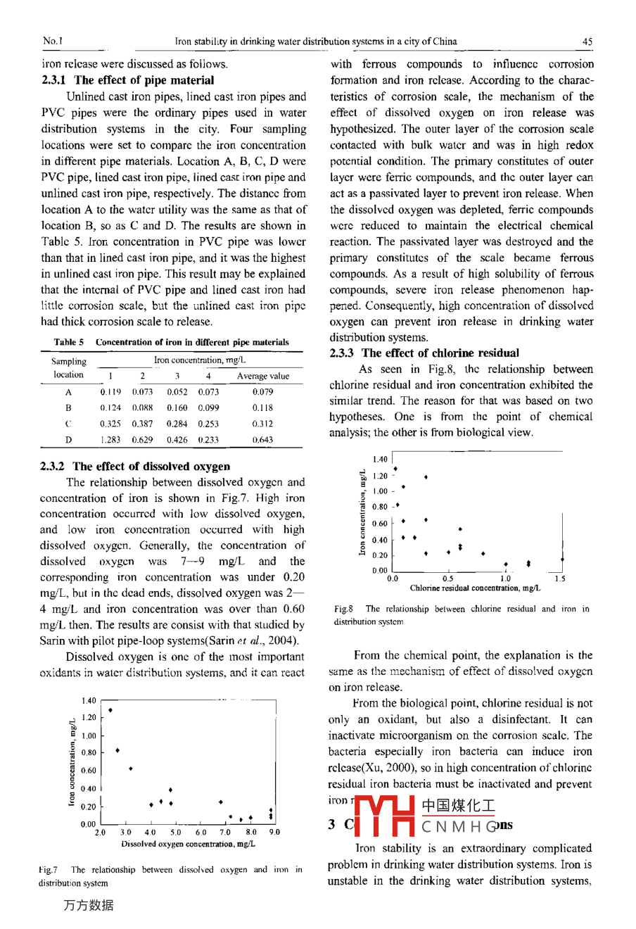 ISSN 1001-0742Journal of Entironmentud Sciences Vol. 18. No. 1, pp. 40- -46, 2006CN11-2629/XArticle ID: 1001-0742(2006)01 0040-07CLC number: X131.2 Dncunent code.AIron stability in drinking water distribution systems in a city ofChinaNIU Zhang-bin!", WANG Yang', ZHANG Xiao-jian', HE Wen jie2, HAN Hong-da, YIN Pei-jun2(1. Depar(ment of Environmenl Science and Technology, Tsinghua University; Beiing 100084, China. F.-mail: nzb03@xnails.tsinghua.cdu.cn; 2.Tianjin Water Works Limited Company, Tianjin 300000 China)Abstract: A field study on the estimation and analysis of iron stability in drinking water distribution system was carried out in a city ofChina. The stability of iron ion was estimated by pC-pH figure. It was found that iron ion was unstable, with日high Fe (OH),precipitation tendency and obvious incrcase in lurbidity. The outer layer of the corrosion scale was compact, while the inner core wasporous. The main composition of the scale was iron, and the possiblc compound constitutes of the outer scale were ax-FcOOH,y-FcOOH, a-Fe2O, y-Fc2O, FeCl, while the inncr were Fe;O4, FeCl, FeCO, According to the charateristics of the corosion scalc, itwas thought that the main reason for iron instbility was iron release fom corosion scale. Many factors such as pipe materials,dissolved oxygen and chlorine residual afect iron release. Cienerally, higher iron release occurred with lower dissolved oxygen orchlorine residual concentration, while lower iron rclease occurred with higher dissolved oxygen or chlorine residual concentration.The reason was considered that the passivated out layer of scale of fric oxide was broken down by reductive reaction in a conditionof low oxidants concentration, which would result more rapid corrosion of the pipe and red water phenomenon.Keywords: chlorine residual; corrosion scale; dissolved oxygcn; drinking water distribution syslems; iron release; iron stabilityyears, correspondingly, the USEPA estimate of 77.2Introductionbillion USD(McNeill and Edwards, 2001). ComplaintsAlthough many water facilities have adoptedof "red water” at the tap is becoming the mostpretreatment and advanced trcatment technologics totroublesome problem for water utilties all over theimprove drinking water quality, iron, turbidity andworld (Xu and He, 2002; Benjanun, 1996). Thereforebacteria in tap water still cannot rcach thepeople must know the mechanism of iron stability to .requirements, indicating that water in distributionsolve problems in water distribution systems.systcms was biological instability and chemicallron stability is one problem of chemical stabilityinstability (Yuan and Wang, 2003; Wu and Liu, 1998;in distribution systems, including iron pipe corrosion,Xu and He, 2002). Maintaining water quality andcorrosion scale formation and iron rclcase phenomena.keeping water stability in drinking water distributionIt is very complicated because of the involutedsystems is a challenge and is viewed as a new frontierphysical, chemical and biological reactions andby thc water industry. Consequently, many researchesprocesscs and reticular relationship among theon the water quality problems in drinking watercorrosion, scale formation and iron rclcase.distribution systems werc carried out.Iron intability not only obstructs the flow ofThe majority of distribution systems pipes werewater, but also degrades the water quality. Manycomposed of iron material: cast iron (51.67%) andproblems causcd by iron instability are as follows: (1)galvanized stcel (23.85%) in China (Xu et al., 2004),it can form corrosion scalc, increasing head loss andsimilarly, cast iron(38%), ductile iron(22%) and steeldecrcasing water capacity (Larson and Sollo, 1967);(5%) in the USA (Benjanmin, 1996). Moreover, a(2) it can cause iron release from the corrosion scalesurvey in the year of 1997 of the 100 largest waterand severely causc“red water" problem(Sarin, 2001);utilties was found that the most common distribution(3) it can react with dissolved oxygen and chlorinesystem problem is the corrosion of iron material piperesidual in drinking water distribution systems (Sarin(Edwards, 2004). Edwards considered that “con-el al, 2004; Fratueret al., 1999); (4) it can provide antrolling corrosion in drinking water distributionexcellent breeding ground for microorganismsystems is a grand challengc for the 21st century"(Tuovinen et al, 1980; LcChevallieret al, 1993); (5)(McNeill and Edwards, 2001). According to the dataespec中國(guó)煤化工ulate arsenic(Ravenprovided by AWWA, 325 billion USD was cost toet al.CNMHG1995).upgrade water distribution systems over the next 20Tl ' Uujcuvc UI UIII stuuy was to estimate theFoundation item: The National Natural Scicnce Foundation of China (No. 50578081) and the Hi-Tech Research and Developneat Program (863) ofChina(No. 2002AA601 140); *Corresponding authorNo.1Iron stability in drinking water distribution systcms in a city of China41iron stability, Lo describe the characteristics 01.2 Sampling and analysis methods for watercorrosion scale and to analyze the infiuence factors onqualityiron release in drinking water distribution systcms in aThe analysis items of water quality includc pH,city of China. The study was conducted using fieldwatcr temperature, turbidity, iron concentration,experiments. Based on the findings the mechanismdissolved oxygen concentration, chlorine residual andand control measurements of iron instability were alsoalkalinity. The analysis methods for each item arediscussed.shown in Table 1.1 Materials and methodsTable 1 Analysis items and methods for water quality1.1 Setting of sampling locationsAnalysis itermsAnalysis methods .As shown in Fig1, the sampling locations werepHB- -4 analysis insrumcntset along a orbicular main lined cast iron pipelineWater tempcrature, CCthanol thermomneler(used about 10 years), including finished water,TurbidityHach2100 turbidityordinary sampling locations(sampling point I- -7) andanalysis instrumentdead end(sampling point 8-