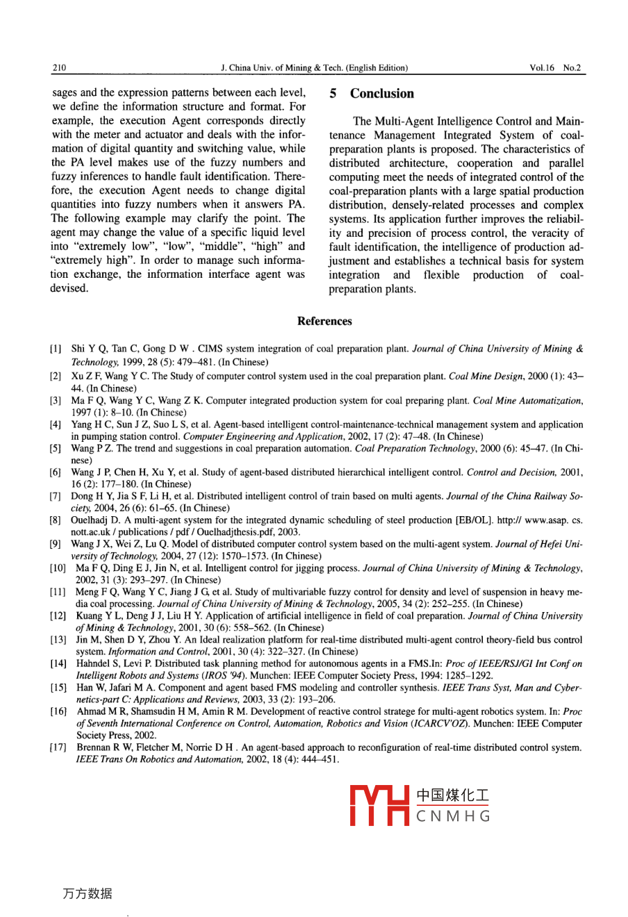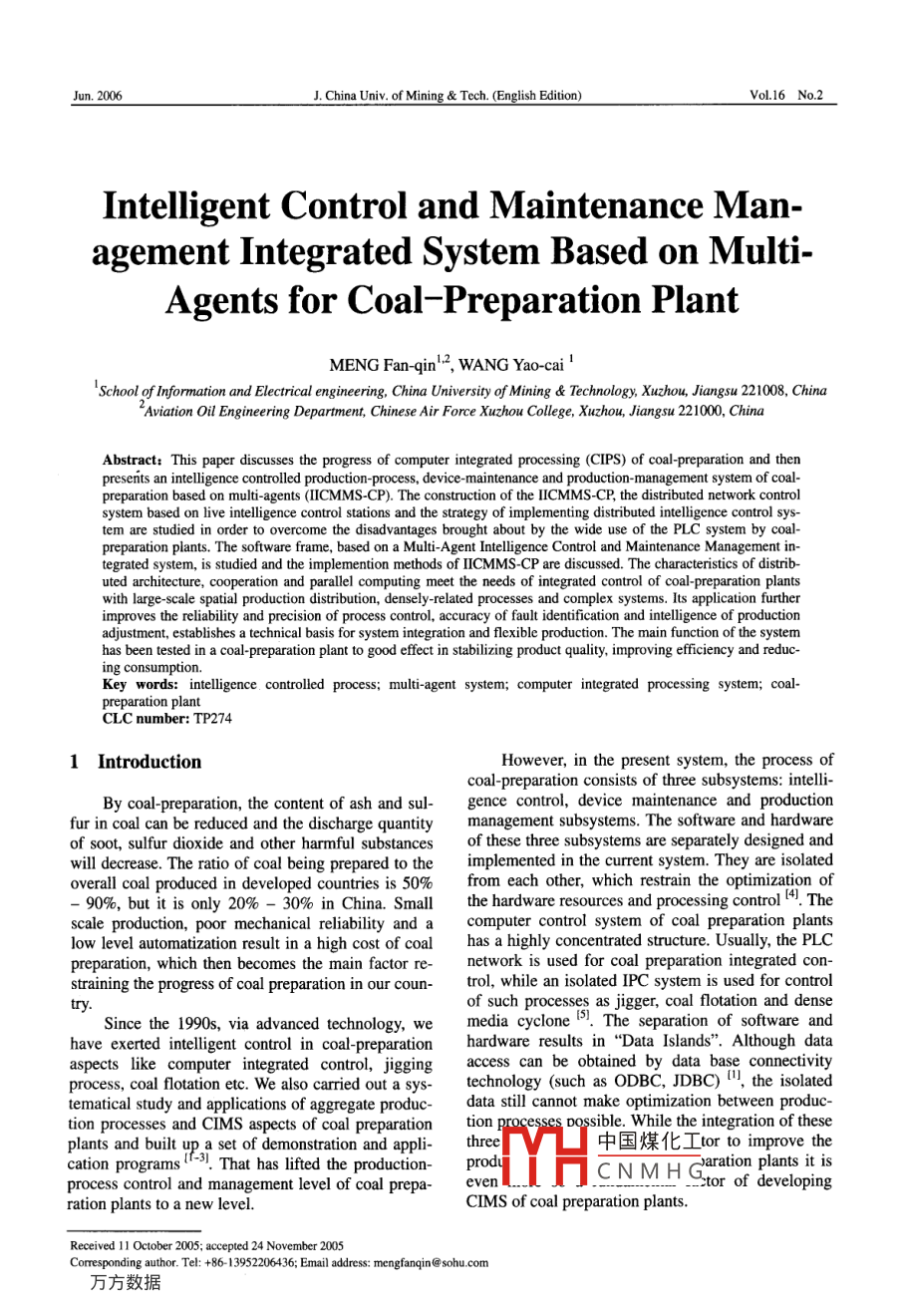 Jun.2006J. China Univ of mining tech (English EditionVol 16 No. 2Intelligent Control and Maintenance management Integrated system Based on MultiAgents for Coal-Preparation PlantMENG Fan-qin", WANG Yao-caihool of Information and Electrical engineering, China University of Mining Technology, Xuzhou, Jiangsu 221008, ChinaAviation Oil Engineering Department, Chinese Air Force Xuzhou College, Xuzhou, Jiangsu 221000, ChinaAbstract: This paper discusses the progress of computer integrated processing(CIPS)of coal-preparation and thenpresents an intelligence controlled production-process, device-maintenance and production-management system of coalreparation based on multi-agents(IICMMS-CP). The construction of the lICMMS-CP, the distributed network controlsystem based on live intelligence control stations and the strategy of implementing distributed intelligence control sys-tem are studied in order to overcome the disadvantages brought about by the wide use of the PLC system by coalpreparation plants. The software frame, based on a Multi-Agent Intelligence Control and Maintenance Management in-tegrated system, is studied and the implemention methods of IICMMS-CP are discussed. The characteristics of distrib-uted architecture, cooperation and parallel computing meet the needs of integrated control of coal-preparation plantswith large-scale spatial production distribution, densely-related processes and complex systems. Its application furtherimproves the reliability and precision of process control, accuracy of fault identification and intelligence of productiondjustment, establishes a technical basis for system integration and flexible production. The main function of the systemhas been tested in a coal- preparation plant to good effect in stabilizing product quality, improving efficiency and reduc.Key words: intelligence. controlled process; multi-agent system; computer integrated processing system; coalpreparation plantCLC number: TP2741 IntroductionHowever, in the present system, the process ofcoal-preparation consists of three subsystems: intelli-By coal-preparation, the content of ash and sul- gence control, device maintenance and productionfur in coal can be reduced and the discharge quantity management subsystems. The software and hardwareof soot, sulfur dioxide and other harmful substances of these three subsystems are separately designed andwill decrease. The ratio of coal being prepared to the implemented in the current system. They are isolatedoverall coal produced in developed countries is 50% from each other, which restrain the optimization of90%, but it is only 20%-30% in China. Small the hardware resources and processing control Thescale production, poor mechanical reliability and a computer control system of coal preparation plantslow level automatization result in a high cost of coal has a highly concentrated structure. Usually, the PLCpreparation, which then becomes the main factor re- network is used for coal preparation integrated constraining the progress of coal preparation in our coun- trol, while an isolated IPC system is used for controlof such processes as jigger, coal flotation and denseSince the 1990s, via advanced technologmedia cyclone. The separation of software andhave exerted intelligent control in coal-preparation hardware results in"Data Islands". Although dataspects like computer integrated control, jigging access can be obtained by data base connectivityprocess, coal flotation etc. We also carried out a sys- technology(such as ODBC, JDBC), the isolatedtematical study and applications of aggregate produc- data still cannot make optimization between prodition processes and CIMS aspects of coal preparation tion processes Possible. while the integration of thesepu吧e: That has lifted the production- prend appli- three中國煤化工 or to improve theCNMHaration plants it isprocess control and management level of coal prepa- evertor of developingration plants to a new levelCiMS of coal preparation plantsReceived 11 October 2005: accepte05ComespondingauthorTel+86-13952206436;Emailaddressmengfanqin@sohu.comMENG Fan-qin et alIntelligent Control and Maintenance Management Integrated System Based onThe application study of agent and multi agent preparation process, due to its features of multiplesystems(MAS), which started in the middle of the variables, targets and non-linearity, intelligence con-1980s, has become a major topic for research in dis- trol theory is used to manage processing control overtributed artificial intelligence. New plans and solution jigger, coal floatation and dense media cyclone o-l)between the agents in such a way that it can be ation The production management Agent can plan the coaloperation, optimize the target, adjust the process andto deal with incomplete and indefinite knowlanalyze the data.2. The device maintenance agentCooperation between them can improve the basic can provide for testing the state of the equipment,ability of a single agent and display its aggregatetesting of technical parameters, an intelligent opinionpacity.When it is used to deal with an actual problem, of device malfunction and device repair management.Agent technology can establish the complicated system in the form of mini-subsystems, which are auto-IICMMS-CPnomous, easily managed but communicate and coop-erate with each other o!. Therefore, the mAs are usedDevicentelligeProductionduring industrial processes to set up distributed testMaintenanceanagementcontroling and controlling systems dealing with complexprocessing control problems. In 1995, Schrott and hiscolleagues raised the concept of a Multi-Agent DisFig 1 Configuration of IICMMS-CPtributed Real-Time System(MAD-RTS), consistingIn the multi agent systems, each single agentof a compiler, operating system kernel and communi- carries out different functions and covers its owncation tools. They established an experimental system range of functions. The interactive methods and reali-controlled by an elevator; th