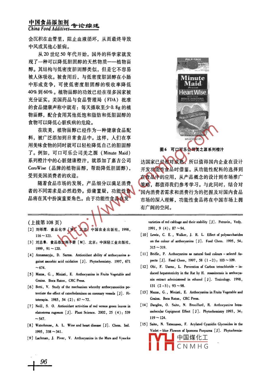 中國(guó)食品添加劑專論綜述ChinaFood Adives花青素類添加劑的應(yīng)用前景分析楊秀娟趙曉燕馬越(北京市蔬菜研究中心,北京100089)摘要:文章根據(jù)近年來國(guó)內(nèi)外對(duì)花青素的研究,就其作為食品添加劑方面的應(yīng)用進(jìn)行分析。關(guān)鍵詞:花色苷;應(yīng)用;食品添加劑The analysis of anthocyanins as food additiveYANG Xiu-juan ZHAO Xiao-yan MA Yue(Beijing Vegetable Research Center, Beijig 10089)Abstract: Antbocyanins are rspomsible for the red, puple and blue colom of many fuits and vetable. they are water- olubiliy. This aticle is the analysis of pplication about anthocyanins 8 food aitive.Key words; anthocyanin; pplcaini; food aditive隨著科技的發(fā)展,人們對(duì)食品添加劑的安全性越來越重視,合成色素的使用種類和數(shù)量已經(jīng)1已開發(fā)的花青素大幅度下降,因此,開發(fā)和應(yīng)用天然色素已成為葡萄皮色素是開發(fā)最早且最豐富的花青素類世界食用色素發(fā)展的總趨勢(shì)。色素,由葡萄科果實(shí)的果皮或葡萄酒酒廠的廢料花青素是一類廣泛存在于植物中的水溶性色. --葡萄渣,以水或乙醇萃取,后經(jīng)精制、真空素,屬于類黃酮化合物,也是植物的主要呈色物濃縮而得,主要成分有錦葵色素-3-葡糖啶、質(zhì),已知有20種花青素,在植物中常見的有六丁香啶、二甲翠雀素、甲基花青素、翠雀素等,種,即天竺葵色索(Pg)、 矢車菊色素(Cy)、飛廣泛用在飲料、冷飲、蛋糕、果醬等的生產(chǎn)上,燕草色素(Dp)、芍藥色素(Pn)、牽?;ㄉ赜昧?.002%~0.3%。.(P)和錦葵色素(Mv)。自然條件下游離的花青玫瑰茄色素(玫瑰茄紅),由錦葵科木槿屬素極少見,而常與一個(gè)或多個(gè)葡萄糖、鼠李糖、-年生草本植物玫瑰茄的花萼中提取精制而來,半乳糖、木糖、阿拉伯糖等通過糖苷鍵形成花色100g干花萼可制得1.5g總花色苷,主要成分有苷,花色苷中的糖苷基和羥基還可以與-一個(gè)或幾飛燕草素 -3-接骨木二糖苷、矢車菊素-3-接個(gè)分子的香豆酸、阿魏酸、咖啡酸、對(duì)羥基苯甲骨木二糖苷和少量的飛燕草素-3-葡糖苷、矢酸等芳香酸和脂肪酸通過酯鍵形成?;幕ㄉ嚲账?3一葡糖苷,玫瑰茄紅是食用紅色(至苷。已知天然存在的花色苷有250多種,存在于紫色)色素,適用于pH值在4以下,不需高溫27個(gè)科, 73個(gè)屬的植物中?;ㄇ嗨仡惿厣术r加熱的食品,如糖漿、冷點(diǎn)、冰糕、果陳等,用艷、色質(zhì)好,而且又具有營(yíng)養(yǎng)、保健作用,因此量在0.1%~ 0.5%。逐漸被人們所重視。中國(guó)煤化工紅棕色高梁種子的外CNMH解皮黃苷。高粱紅對(duì)元、然昆疋,仕取仕相喊任條件下均可呈紅107+中國(guó)食品添加劑China Fo0 Adtives專論綜述棕色,染色力強(qiáng),是食用紅棕色色素,因其性質(zhì)能有較多的研究報(bào)道,并研究了它們的抗氧化性穩(wěn)定,故應(yīng)用廣泛。與化學(xué)結(jié)構(gòu)之間的關(guān)系,然而,花色苷在活體組另外國(guó)際上已開發(fā)應(yīng)用的花青素類色素花生,織中的抗氧化功能 卻很少得到證實(shí),因此更有待衣紅色素、落葵紅、黑加侖紅、天然莧菜紅、紫于我們進(jìn)行深人研究以下問題:人體吸收花色素玉米色素、桑葚紅色素、紅米紅(黑米紅)、紫苷的相關(guān)機(jī)制以及花色素苷的轉(zhuǎn)化產(chǎn)物對(duì)人體所蘇色素、紅球甘藍(lán)色素、藍(lán)錠果紅等。花青素類起的作用, 藥物動(dòng)力學(xué),物種形式和組織結(jié)構(gòu)的色素在酸性環(huán)境中呈現(xiàn)紅色,色澤亮麗,并且對(duì)分布情況。光、熱、氧穩(wěn)定性好(葡萄皮色素除外),是日.用品調(diào)色的最佳天然色素之一。而在國(guó)內(nèi)除紅球3未來有潛力的花青素類色素甘藍(lán)色素、紫蘇色素、藍(lán)錠果紅、紫玉米色素未花青素類色素廣泛存在于葡萄、血橙、紅球得到批準(zhǔn)之外,其它的都得到了廣泛的應(yīng)用[~4)。甘藍(lán)、藍(lán)莓、茄子皮、櫻桃、紅橙、紅莓、草莓、桑椹、山楂皮、紅球甘藍(lán)、紫蘇、紫薯、黑2應(yīng)用研究和存在的問題(紅)米、牽?;ǖ戎参锏慕M織中。20世紀(jì)80年花青素同其它天然色素一樣無毒無副作用,代,日本就從紅球甘藍(lán)的葉子中提取分離出4種安全性能高,著色色調(diào)自然,更接近天然物質(zhì)的. 花青素,并將其作為食品著色劑(紅至紅紫色),顏色,且具有保健功能。但是與合成色素相比廣 泛用于糖果、果汁、汽水、冰淇淋、話梅的生較,花青素類色素也存在- - 些缺陷,花青素對(duì)pH產(chǎn)上。 但紅球甘藍(lán)色素遇蛋白質(zhì)會(huì)變成暗紫色,值、溫度、光照、金屬離子十分敏感,穩(wěn)定性故不宜用于蛋白質(zhì)類食品。紫蘇色素主要成分是差,如色調(diào)會(huì)隨pH的變化而發(fā)生明顯變化,在紫蘇素、紫蘇寧,是存在于紫蘇科中具有紫色葉酸性環(huán)境中顯紅色,中性時(shí)顯紫色,堿性時(shí)顯藍(lán)的品種的天然紅色素,酸性時(shí)(pH<3) 非常穩(wěn).色?;ㄇ嗨卦谥参镏械暮枯^低,且同- -種植物定, 且耐熱性(100C, 30min, 殘存80%)、耐中的花色苷成分復(fù)雜,不易分離提純11[2]。光及耐鹽性較好,日本在1993年就規(guī)定其為食品花青素分子中存在高度分子共軛體系,具酸.添加劑,并用于口香糖、果汁飲料等,認(rèn)為其具.性與堿性基團(tuán),易溶于水、甲醇、乙醇、稀堿與有預(yù)防過敏、防齬齒、消炎等作用。紫蘇是我國(guó)稀酸