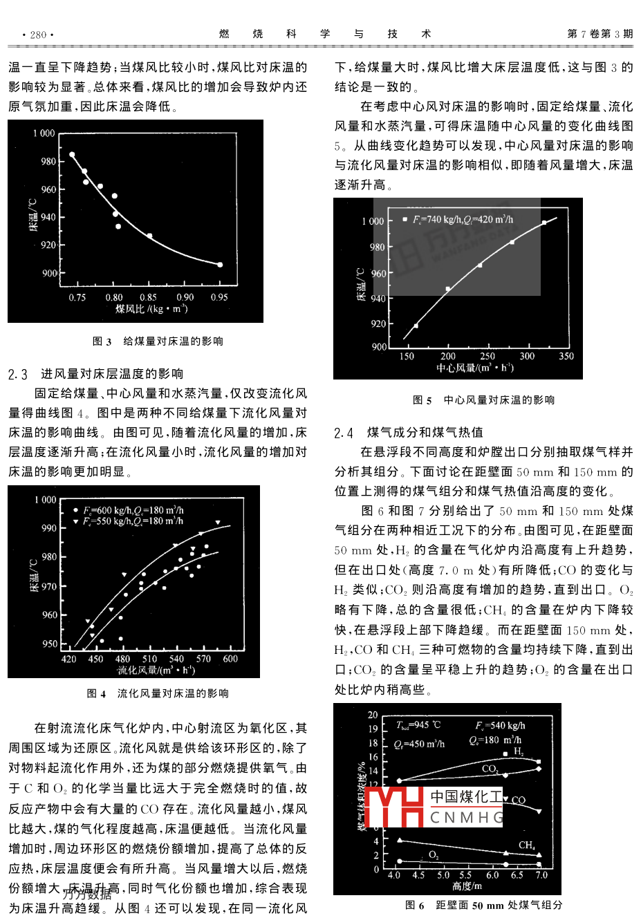 燃燒科學(xué)與技術(shù)第7卷(2001)第3期Vol. 7(2001)No. 3JOURNAL OF COMBUSTION SCIENCE AND TECHNOLOGY噴動(dòng)流化床煤氣化試驗(yàn)研究段鈺鋒,趙長(zhǎng)遂,陳曉平,吳新,梅志林(東南大學(xué)熱能工程研究所,潔凈煤發(fā)電及燃燒技術(shù)教育部重點(diǎn)實(shí)驗(yàn)室,南京210096)摘要:以空氣和水蒸汽為氣化劑,在一內(nèi)徑為600mm的V型布風(fēng)板噴動(dòng)流化床工業(yè)煤氣爐內(nèi)對(duì)動(dòng)力煙煤的氣化進(jìn)行了系統(tǒng)的試驗(yàn)研究??疾炝薞型布風(fēng)板床料的流化特性,研究了操作參數(shù)對(duì)氣化過程的影響,測(cè)量了煤氣成分沿床高和徑向的變化,分析了影響煤氣成分和熱值的有關(guān)因素,提出了合理的運(yùn)行條件和參數(shù)。研究結(jié)果對(duì)工業(yè)裝置的放大設(shè)計(jì)、改造現(xiàn)有燃煤設(shè)備并降低對(duì)環(huán)境的污染具有指導(dǎo)意義。關(guān)鍵詞:V型布風(fēng)板;噴動(dòng)流化床;煤氣化;試驗(yàn)研究中圖分類號(hào):TK229.6+6文獻(xiàn)標(biāo)識(shí)碼:A文章編號(hào):1006- 8740(2001 )03- 0278 04Experimental Study on Coal Gasificationin Jetting Fluidized Bed GasifierDUAN Yu-feng, ZHAO Chang-sui, CHEN Xiao-ping, WU Xin, MEI Zhi-lin(Thermal Energy Engineering Research Institute ,Southeast University ,Nanjing 210096 ,China )Abstract : Experiments were carried out in an industrial fluidized bed gasifier with a V-type distributor and a flu-idization bed with a diameter of 0.6 m. Gas samples were gathered at different heights along the freeboard up to theexit and were analyzed. The gasifier ran at different fluidization airflow rates ,different central airflow rates ,and dif-ferent coal feeding rates. Effects of the above parameters on the gasification of coal ,the components of the gas andthe gas heat value were investigated. F luidization characteristics of the V-type distributor were also obtained. Thoseresults have provided necessary information for the real runs of the gasifier and its enlargement design.Key words:V- type distributor ;etting fluidized bed ;coal gasfication ;experimental study煤在我國(guó)的一次能源結(jié)構(gòu)中占70%以上,居主導(dǎo)用空氣和水蒸汽將煤轉(zhuǎn)變成粗煤氣后再進(jìn)行燃地位。煤的傳統(tǒng)利用方式主要是直接燃燒,這種利用方燒,是對(duì)上述燃煤裝置改造的合理途徑,并減少對(duì)環(huán)境式的效率較低.導(dǎo)致不易治理的環(huán)境污染。在目前眾多的污染。本文采用V型布風(fēng)板噴動(dòng)流化床技術(shù),在爐的熱處理爐、鍛造爐和工業(yè)窯爐中,鏈條爐排和固定爐膛中心區(qū)域依靠射流產(chǎn)生一高氧濃度的氧化區(qū);在周排手燒爐仍然占有相當(dāng)?shù)谋壤?。燃煤過程中,鏈條爐要邊環(huán)形區(qū)域采用低流化數(shù)的流態(tài)化作為氣化反應(yīng)的還經(jīng)常翻動(dòng)和疏松煤層,以免發(fā)生結(jié)焦;手燒爐要經(jīng)常打原區(qū)。兩區(qū)之間由于氣流速度差產(chǎn)生-大范圍的顆粒開爐門向爐內(nèi)加煤。由于爐內(nèi)的正壓,經(jīng)常出現(xiàn)爐門冒內(nèi)循環(huán),強(qiáng)化了氣固兩相間的混合以及熱質(zhì)交換,有利黑煙現(xiàn)象。此外,燃燒不完全造成排渣和~飛灰的碳含量于提高碳的轉(zhuǎn)化率,并具有較高的氣化強(qiáng)度。在爐膛出很高;火焰溫度不均造成被加熱工件的溫度梯度較大口設(shè)中國(guó)煤化工\空氣中進(jìn)入爐內(nèi),增加或局部過燒現(xiàn)象。煤氣C N MH恐值。由此可見,流化床收稿日期:2000-06 -05;修回日期:2000-11-20。基金項(xiàng)邛澳家需點(diǎn)基礎(chǔ)研究發(fā)展規(guī)劃項(xiàng)目(G199902210532)。作者簡(jiǎn)介:段鈺鋒(1963-),男,博士,教授。2001年8月段鈺鋒等:噴動(dòng)流化床煤氣化試驗(yàn)研究.●279●氣化爐具有煤種適應(yīng)性強(qiáng),爐內(nèi)氣固返混強(qiáng)烈,氧化和床內(nèi)物料的返混,延長(zhǎng)顆粒在床內(nèi)的停留時(shí)間,提高碳還原過程并存等特點(diǎn)。它變固體燃燒為氣體燃燒,爐溫的轉(zhuǎn)化率。均勻,加熱速度快,可徹底消除鏈條爐和手燒爐在燃燒在流化床氣化爐系統(tǒng)中共設(shè)有十個(gè)溫度測(cè)點(diǎn)T1過程中和燃燒過程之后的冒黑煙現(xiàn)象。~T10,及爐膛總壓測(cè)點(diǎn)。在懸浮空間不同高度及爐膛本文的研究背景是改造-臺(tái)鏈條爐排燃煤熱處理出口設(shè)有3個(gè)氣體取樣口。蒸汽發(fā)生器產(chǎn)生的飽和蒸加熱爐,即新建一臺(tái)流化床煤氣化爐,生產(chǎn)的煤氣供一汽分別進(jìn)入流化風(fēng)管路和中心噴動(dòng)風(fēng)管路。原料煤由臺(tái)退火爐使用,并滿足其退火工藝要求。目的是完全氣螺旋給煤機(jī)加入,采用床下熱煙氣點(diǎn)火,由啟動(dòng)燃燒室化煤炭并產(chǎn)生中低熱值的煤氣。采用的是V型布風(fēng)完成。另外,在氣化爐底部設(shè)一水封,灰渣由刮板式排板、射流流化床和飛灰循環(huán)技術(shù)。結(jié)合這一工業(yè)應(yīng)用實(shí)渣機(jī)送走。煤氣成分用氣體全分析儀和氣相色譜儀測(cè)踐,對(duì)該裝置進(jìn)行了冷、熱態(tài)過程的試驗(yàn)研究和理論分量。析。通過爐氣取樣并測(cè)量煤氣產(chǎn)物的中間成分和最終成分,分析煤量、風(fēng)量對(duì)氣化過程的影響,最終確定氣2結(jié)果及分析化爐運(yùn)行的合理操作參數(shù)。2.1床 料流化特性試驗(yàn)中所使用的惰性床料是寬篩分的流化床鍋爐1試驗(yàn)裝
