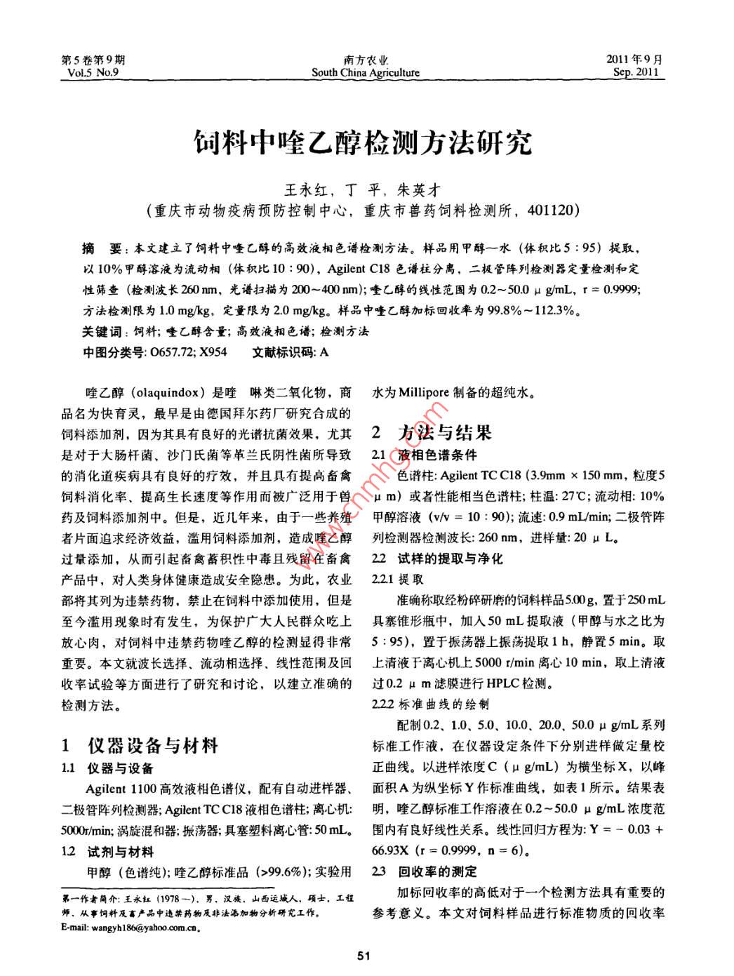 第5卷第9期南方農(nóng)業(yè)2011年9月Vol5 No, 9South China agricultureSep.2011飼料中喹乙醇檢測(cè)方法研究王永紅,丁平,朱英才(重慶市動(dòng)物疫病預(yù)防控制中心,重慶市獸藥飼料檢測(cè)所,401120)摘要:本文建立了飼料中喹乙醇的高效液相色譜檢測(cè)方法。樣品用甲醇一水(體積比5:95)提取,以10%甲醇溶液為流動(dòng)相(體積比10:90), Agilent CI8色譜柱分離,二極管陣列檢測(cè)器定量檢測(cè)和定性篩查(檢測(cè)波長(zhǎng)260m,光譜掃描為20~400m);喹乙醇的線性范圍為0.2~500μg/mL,r=0.999y方法檢測(cè)限為1.0mgkg,定量限為2.0mgkg。樣品中喹乙醇加標(biāo)回收率為98%-112.3%。關(guān)鍵詞:飼料;喹乙醇含量;高效液相色譜;檢測(cè)方法中圖分類號(hào):065772;X954文獻(xiàn)標(biāo)識(shí)碼:A喹乙醇( olaquindox)是喹啉類二氧化物,商水為 Millipore制備的超純水。品名為快育靈,最早是由德國(guó)拜爾藥廠研究合成的飼料添加劑,因?yàn)槠渚哂辛己玫墓庾V抗菌效果,尤其2方法與結(jié)果是對(duì)于大腸桿菌、沙門氏菌等革蘭氏陰性菌所導(dǎo)致21液相色譜條件的消化道疾病具有良好的療效,并且具有提高畜禽色譜柱: Agilent TC O18(39mmx150mm,粒度5飼料消化率、提高生長(zhǎng)速度等作用而被廣泛用于獸μm)或者性能相當(dāng)色譜柱;柱溫:27℃;流動(dòng)相:10%藥及飼料添加劑中。但是,近幾年來(lái),由于一些養(yǎng)殖甲醇溶液(wN=10:90);流速:09mI/min;二極管陣者片面追求經(jīng)濟(jì)效益,濫用飼料添加劑,造成喹乙醇列檢測(cè)器檢測(cè)波長(zhǎng):260mm,進(jìn)樣量:20μL。過(guò)量添加,從而引起畜禽蓄積性中毒且殘留在畜禽22試樣的提取與凈化產(chǎn)品中,對(duì)人類身體健康造成安全隱患。為此,農(nóng)業(yè)221提取部將其列為違禁藥物,禁止在飼料中添加使用,但是準(zhǔn)確稱取經(jīng)粉碎研磨的飼料樣品500g,置于250mL至今濫用現(xiàn)象時(shí)有發(fā)生,為保護(hù)廣大人民群眾吃上具塞錐形瓶中,加入50mL提取液(甲醇與水之比為放心肉,對(duì)飼料中違禁藥物喹乙醇的檢測(cè)顯得非常5:%5),置于振蕩器上振蕩提取1h,靜置5mi。取重要。夲文就波長(zhǎng)選擇、流動(dòng)相選擇、線性范圍及回上清液于離心機(jī)上5000r/min離心10min,取上清液收率試驗(yàn)等方面進(jìn)行了研究和討論,以建立準(zhǔn)確的過(guò)0.2μm濾膜進(jìn)行HPLC檢測(cè)檢測(cè)方法。22標(biāo)準(zhǔn)曲線的繪制配制0.2、1.0、50、10.0、20.0,50.0μg/mL系列1儀器設(shè)備與材料標(biāo)準(zhǔn)工作液,在儀器設(shè)定條件下分別進(jìn)樣做定量校11儀器與設(shè)備正曲線。以進(jìn)樣濃度C(μg/mL)為橫坐標(biāo)X,以峰Agile1100高效液相色譜儀,配有自動(dòng)進(jìn)樣器、面積A為縱坐標(biāo)Y作標(biāo)準(zhǔn)曲線,如表1所示。結(jié)果表二極管陣列檢測(cè)器; Agilent TC CI8液相色譜柱;離心機(jī):明,唯乙醇標(biāo)準(zhǔn)工作溶液在0.2-50.0μgmL濃度范5000min;渦旋混和器;振蕩器;具塞塑料離心管:50mL。圍內(nèi)有良好線性關(guān)系。線性回歸方程為:Y=-0.03+12試劑與材料6693X(r=09999,n=6)。甲醇(色譜純);喹乙醇標(biāo)準(zhǔn)品(>996%);實(shí)驗(yàn)用23回收率的測(cè)定第一作者簡(jiǎn)介:王永紅(1978-),男,漢族,山西運(yùn)城人,碩士,工程加標(biāo)回收率的高低對(duì)于一個(gè)檢測(cè)方法具有重要的師,從事飼料及畜聲品中違禁藥物及非法添加物分析研究工作參考意義。本文對(duì)飼料樣品進(jìn)行標(biāo)準(zhǔn)物質(zhì)的回收率E-mail:wangyh18@yahoo.com.cn王水紅,丁平,朱英才:飼料中喹乙醇檢測(cè)方法研究表1標(biāo)準(zhǔn)曲線峰面積和保留時(shí)間樣品的譜圖和標(biāo)準(zhǔn)品的譜圖進(jìn)行譜圖檢索,如果相峰面積保留時(shí)間(min)14.12似度為900以上,且260mm和380nm附近均出現(xiàn)尖33331111峰,就可以確認(rèn)為陽(yáng)性樣品;如果是ⅴwD檢測(cè)器,可以通過(guò)采取標(biāo)準(zhǔn)加入的方法進(jìn)行確認(rèn),如果在標(biāo)準(zhǔn)1006685811:208物質(zhì)的保留時(shí)間內(nèi)出現(xiàn)雙肩峰就可以確定為假陽(yáng)性,20.013423011.203345.20122如果峰面積增大,保留時(shí)間相同則為陽(yáng)性樣品表2標(biāo)準(zhǔn)物質(zhì)的添加回收率(n=6)3結(jié)論添加標(biāo)準(zhǔn)物質(zhì)水平(mgkg)回收率(%)本文通過(guò)波長(zhǎng)選擇、流動(dòng)相優(yōu)化、提取比例選擇5.00和回收率等一系列試驗(yàn),建立了高效液相色譜方法10.00進(jìn)行飼料中喹乙醇的準(zhǔn)確測(cè)定,同時(shí)對(duì)于假陽(yáng)性樣20.001018品的確認(rèn)進(jìn)行了研究。試驗(yàn)選擇5%甲醇溶液做為飼料試樣的提取劑,10%甲醇溶液為流動(dòng)相,流速為實(shí)驗(yàn),如表2所示,結(jié)果令人滿意09 mL/min,檢測(cè)波長(zhǎng)為260mm,樣品中喹乙醇在2~24疑似樣品的確證20mgkg有理想的回收率,02-50.0μg/mL有良好的對(duì)于喹乙醇疑似樣品的確認(rèn),可以采用2種方法:線性關(guān)系具有DAD檢測(cè)器并可以進(jìn)行譜圖檢測(cè)的儀器,通過(guò)(責(zé)任編輯:丁志祥8,Q9e,①重慶100個(gè)高山納涼貧困村50天實(shí)現(xiàn)萬(wàn)元增收重慶市扶貧辦啟動(dòng)“引導(dǎo)百萬(wàn)市民兩翼避暑納涼”行動(dòng),以休閑避暑納涼為主的鄉(xiāng)村旅游扶貧產(chǎn)業(yè)發(fā)展迅速,助農(nóng)増收效果圩。據(jù)統(tǒng)計(jì),截止到8月15日,100個(gè)鄉(xiāng)村旅游接待點(d