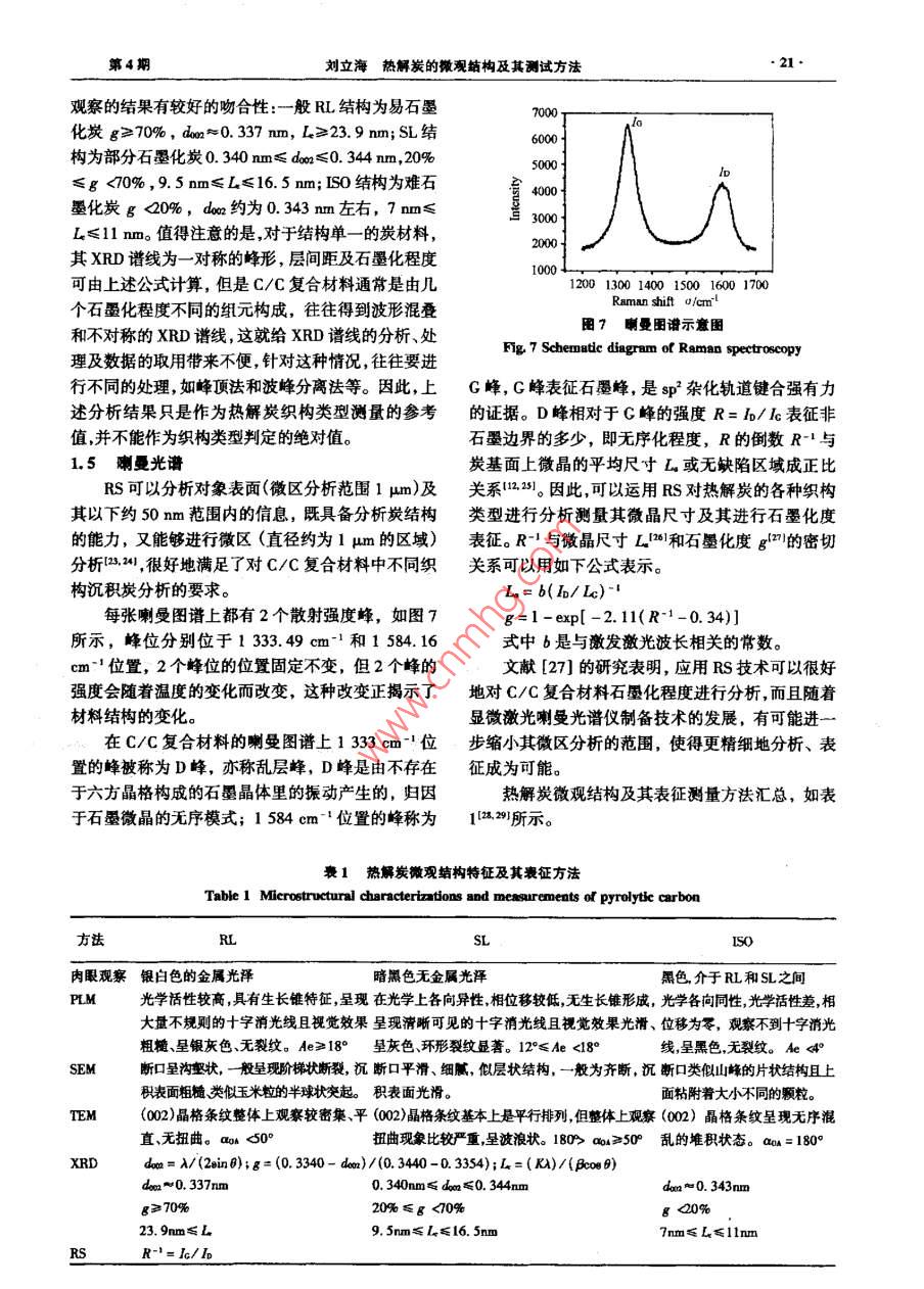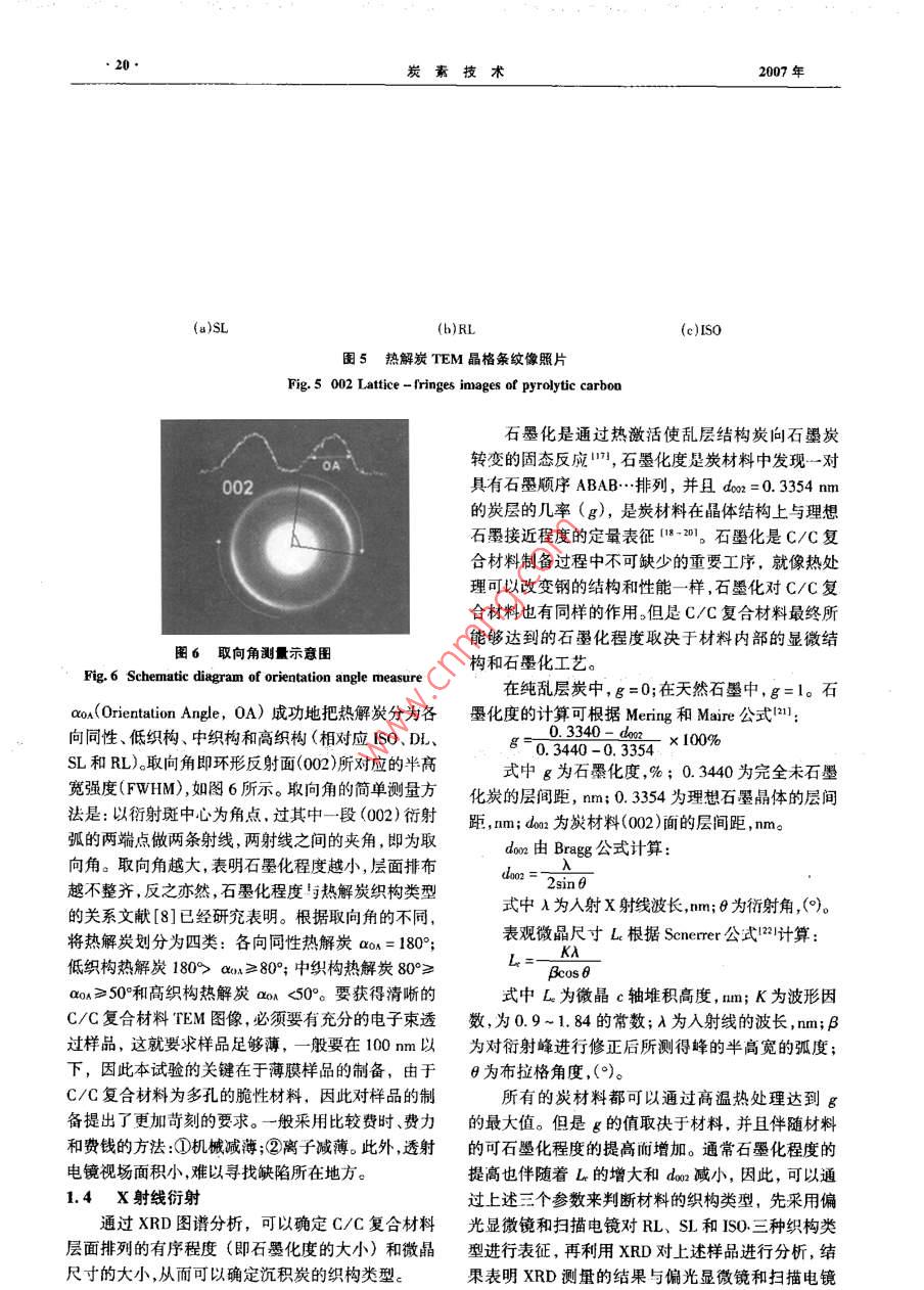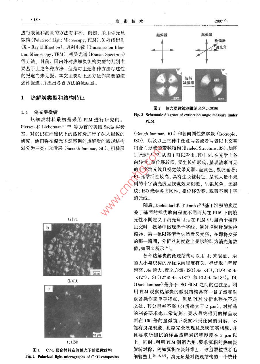 2007年第4期CARBON TECHNIQUES200T№4第26卷炭套技術(shù)Vol 26·綜合述評·熱解炭的微觀結(jié)構(gòu)及其測試方法劉立海,黃啟忠,謝志勇,王秀飛(中南大學(xué)粉末冶金國家重點實驗室,湖南長沙410083)摘要:主要介紹了利用正交偏光顯微鏡(PLM)、X射線射(XRD)透射電鏡(TEM)和喇曼光譜(RS)等測試方法對采用化學(xué)氣相沉積(cD)法制備的c/C復(fù)合材料的熱解炭的表面微觀形貌沉積炭層間距dm微晶尺寸L及其石墨化度等參數(shù)進行表征和測量從而判斷沉積的熱解炭的織構(gòu)類型(光滑層粗糙層和各向同性炭),并且分析了上述各種測試手段的優(yōu)缺點關(guān)健詞:化學(xué)氣相沉積;C/C復(fù)合材料;熱解炭;織構(gòu)中圖分類號:TQ127.1·1文獻標識碼:A文章編號:1001-3741(2007)04001706MICROSTRUCTURAL CHARACTERIZATIONAND MEASUREMENTS OF PYROLYTICCARBONLIU Li-hai, HUANG Qi-zhong, XIE Zhi-yong, WANG Xiu-feiState Key Laboratory for Powder Metallurgy, Central South University, Changsha410083. ChinaAbstract: In this paper, in order to judge the structure (SL, RL, ISO)of pyrolytic carbons prepared by chemicaldeposition(CVD), the methods for observation and measurement of the surface morphologies and structural paprameterssuch as the interlayer spacing don, crystallite size L and graphitization degree of pyrolytic carbons were introducedwhich includes the polarized light microscopy(PLM), scanning electron microscopy(SEM), tansmission electron mirecopy(TEM), X-ray diffraction (XRD) and Raman spectroscopy. The advantages and disadvantages of each measurement were also analysized.Key words Chemical vapor deposition; carbon/ carbon composites; pyrolytic carbonitexture對于C/C復(fù)合材料而言,結(jié)構(gòu)與性能之間的關(guān)料;而各向同性結(jié)構(gòu)具有較好的各向同性、生物相系至關(guān)重要,化學(xué)氣相沉積制備的C/C復(fù)合材料一容性、密封性,可用于生物材料、密封材料等。熱解般由各向同性的炭纖維和各向異性的熱解炭組炭是氣態(tài)碳氫化合物在熱基體表面通過脫氫環(huán)化成。材料的性能主要取決于基體,即沉積的熱解炭作用沉積而形成的炭材料。文獻[1~6]研究表明不類型。例如,光滑層結(jié)構(gòu)具有很好的高溫力學(xué)性能,同類型的熱解炭對C/C復(fù)合材料的摩擦磨損、力學(xué)主要用于高溫結(jié)構(gòu)件、抗燒蝕件等;粗糙層結(jié)構(gòu)具性能等影響較大。因此,對熱解炭組織結(jié)構(gòu)的類型有較好的摩擦磨損性能,適用于高性能飛機剎車材進行表征和測量是十分重要的。對熱解炭織構(gòu)類型作者簡介:劉立海男1981年出生,碩士研究生,E-mil:hiulihaigodc@163.com。收稿日期:2007-02-02炭素技術(shù)07年進行表征和測量的方法有多種。例如,采用偏光顯起偏器起偏器微鏡( Polarized Light Microscopy,PLM)、X射線衍射檢偏器(X- Ray diffraction)、透射電鏡( Transmission Elec了消光角ron Microscopy,TFM)、喇曼光譜( Raman Spectrum等方法。H前,國內(nèi)外對熱鮮炭織構(gòu)類型的判別主要基于」述各種方法,但是對上述各種方法綜述性的報道尚未見報。本文主要對上述方法作簡要的綜旋轉(zhuǎn)述性報道,并提出各自方法的優(yōu)缺點。減偏器1熱解炭類型和結(jié)構(gòu)特征E1.1偏光顯微鏡圖2偏光顯微鏡測量消光角示意圖Fig 2 Schematic diagram ot extinction angle measure under熱解炭材料最初是采用PLM進行研究的PLMPierson和 Lieberman0等為首的美國 Sadia實驗室,對沉積在纖維氈的熱解炭進行了深入細致的 Rough laminar,RL)和各向問性熱解炭( isotroPic研究。他們將在偏光下觀察到的熱解炭的微觀結(jié)構(gòu)IS0),以及以上三種中任意兩者或者兩者以上交替劃分為三類:光滑層( Smooth laminar,SL)粗糙層組合而形成的帶狀結(jié)構(gòu)( Banded Structure,Bs),如圖1所示1從圖1可以看出,其中SL在光學(xué)上各向異性,柑位移較低,無生長錐形成,呈現(xiàn)清晰可見的十字消光線且視覺效果光滑、呈灰色、裂紋顯著;RL光學(xué)活性較高,具有生長錐特征,呈現(xiàn)大量不規(guī)則的十字消光線且視覺效果粗糙、呈銀灰色、無裂紋;ISO光學(xué)各向同性,相位移為零,觀察不到十字消光線。隨后, Diefendorf和1 okarsky I3基于沉積的炭層關(guān)于基面的擇優(yōu)取向程度不同而其在PIM下的旋(a)sL光性不同定義了消光角Aea在PLM屮,當兩個棱鏡正交時,視場中出現(xiàn)黑十字線,通過逆時針旋轉(zhuǎn)檢偏器,第一象限逐漸消失然后又變亮,在即將變亮的那一瞬間,分析器刻度盤上顯示的即為消光角數(shù)值,如圖2所示1各種熱解炭的微觀結(jié)構(gòu)可以用Ae來表征,Ae的大小與織構(gòu)的擇優(yōu)取向程度有關(guān),擇優(yōu)取向程度越高,Ae越大,反之亦然:ISO(Ae<4),DL(4°≤A<12°),SL(12°≤Aec≥50亂的堆積狀態(tài)。aa=180°da=A/(2ein0);g=(0.3340-da)/(0.3440-0.3354);L=(K)/(Bo08)0.340nm≤d≤0.344mmda≈0.343nm≥70%20%≤g<70%23.9mm≤L9.5rm≤L≤16.5nm7mm≤L≤llmmR-= IG/lp2007年2005,5:1201~1207.結(jié)論[13] DIEFENDORF R J, TOKARSKY E w. Air Force Report,1971,AF33(615)-70-C-1530偏光顯微鏡是利用材料的各向異性對光的反14]廖寄喬,黃伯云,黃志鋒,等.熱解炭微觀結(jié)構(gòu)的表征射強度不同進行測量的;TEM是在X射線衍射基礎(chǔ)熱解炭各向異性的偏振光分析[門.理化檢驗一物理分冊.2002,38():501-506上結(jié)合選區(qū)電子衍射(SAED)對熱解炭的織構(gòu)進行(1 LAVINAC, LANGLAIS F. FERON O.aa.Mhem測量分析;X射線衍射是通過計算微晶的尺寸、層間ture of the pyrocarbon matrix in carbon/carbon composites距和