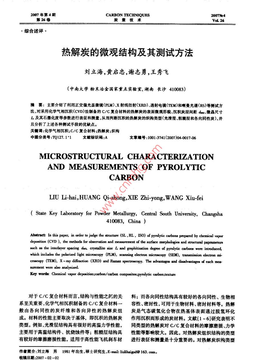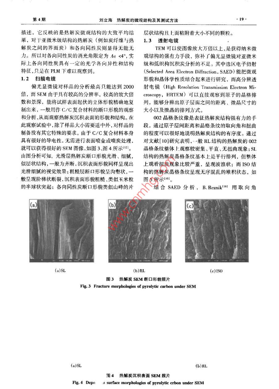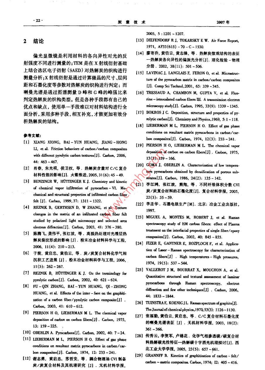 2007年第4期CARBON TECHNIQUES200T№4第26卷炭套技術(shù)Vol 26·綜合述評·熱解炭的微觀結(jié)構(gòu)及其測試方法劉立海,黃啟忠,謝志勇,王秀飛(中南大學(xué)粉末冶金國家重點實驗室,湖南長沙410083)摘要:主要介紹了利用正交偏光顯微鏡(PLM)、X射線射(XRD)透射電鏡(TEM)和喇曼光譜(RS)等測試方法對采用化學(xué)氣相沉積(cD)法制備的c/C復(fù)合材料的熱解炭的表面微觀形貌沉積炭層間距dm微晶尺寸L及其石墨化度等參數(shù)進行表征和測量從而判斷沉積的熱解炭的織構(gòu)類型(光滑層粗糙層和各向同性炭),并且分析了上述各種測試手段的優(yōu)缺點關(guān)健詞:化學(xué)氣相沉積;C/C復(fù)合材料;熱解炭;織構(gòu)中圖分類號:TQ127.1·1文獻標識碼:A文章編號:1001-3741(2007)04001706MICROSTRUCTURAL CHARACTERIZATIONAND MEASUREMENTS OF PYROLYTICCARBONLIU Li-hai, HUANG Qi-zhong, XIE Zhi-yong, WANG Xiu-feiState Key Laboratory for Powder Metallurgy, Central South University, Changsha410083. ChinaAbstract: In this paper, in order to judge the structure (SL, RL, ISO)of pyrolytic carbons prepared by chemicaldeposition(CVD), the methods for observation and measurement of the surface morphologies and structural paprameterssuch as the interlayer spacing don, crystallite size L and graphitization degree of pyrolytic carbons were introducedwhich includes the polarized light microscopy(PLM), scanning electron microscopy(SEM), tansmission electron mirecopy(TEM), X-ray diffraction (XRD) and Raman spectroscopy. The advantages and disadvantages of each measurement were also analysized.Key words Chemical vapor deposition; carbon/ carbon composites; pyrolytic carbonitexture對于C/C復(fù)合材料而言,結(jié)構(gòu)與性能之間的關(guān)料;而各向同性結(jié)構(gòu)具有較好的各向同性、生物相系至關(guān)重要,化學(xué)氣相沉積制備的C/C復(fù)合材料一容性、密封性,可用于生物材料、密封材料等。熱解般由各向同性的炭纖維和各向異性的熱解炭組炭是氣態(tài)碳氫化合物在熱基體表面通過脫氫環(huán)化成。材料的性能主要取決于基體,即沉積的熱解炭作用沉積而形成的炭材料。文獻[1~6]研究表明不類型。例如,光滑層結(jié)構(gòu)具有很好的高溫力學(xué)性能,同類型的熱解炭對C/C復(fù)合材料的摩擦磨損、力學(xué)主要用于高溫結(jié)構(gòu)件、抗燒蝕件等;粗糙層結(jié)構(gòu)具性能等影響較大。因此,對熱解炭組織結(jié)構(gòu)的類型有較好的摩擦磨損性能,適用于高性能飛機剎車材進行表征和測量是十分重要的。對熱解炭織構(gòu)類型作者簡介:劉立海男1981年出生,碩士研究生,E-mil:hiulihaigodc@163.com。收稿日期:2007-02-02炭素技術(shù)07年進行表征和測量的方法有多種。例如,采用偏光顯起偏器起偏器微鏡( Polarized Light Microscopy,PLM)、X射線衍射檢偏器(X- Ray diffraction)、透射電鏡( Transmission Elec了消光角ron Microscopy,TFM)、喇曼光譜( Raman Spectrum等方法。H前,國內(nèi)外對熱鮮炭織構(gòu)類型的判別主要基于」述各種方法,但是對上述各種方法綜述性的報道尚未見報。本文主要對上述方法作簡要的綜旋轉(zhuǎn)述性報道,并提出各自方法的優(yōu)缺點。減偏器1熱解炭類型和結(jié)構(gòu)特征E1.1偏光顯微鏡圖2偏光顯微鏡測量消光角示意圖Fig 2 Schematic diagram ot extinction angle measure under熱解炭材料最初是采用PLM進行研究的PLMPierson和 Lieberman0等為首的美國 Sadia實驗室,對沉積在纖維氈的熱解炭進行了深入細致的 Rough laminar,RL)和各向問性熱解炭( isotroPic研究。他們將在偏光下觀察到的熱解炭的微觀結(jié)構(gòu)IS0),以及以上三種中任意兩者或者兩者以上交替劃分為三類:光滑層( Smooth laminar,SL)粗糙層組合而形成的帶狀結(jié)構(gòu)( Banded Structure,Bs),如圖1所示1從圖1可以看出,其中SL在光學(xué)上各向異性,柑位移較低,無生長錐形成,呈現(xiàn)清晰可見的十字消光線且視覺效果光滑、呈灰色、裂紋顯著;RL光學(xué)活性較高,具有生長錐特征,呈現(xiàn)大量不規(guī)則的十字消光線且視覺效果粗糙、呈銀灰色、無裂紋;ISO光學(xué)各向同性,相位移為零,觀察不到十字消光線。隨后, Diefendorf和1 okarsky I3基于沉積的炭層關(guān)于基面的擇優(yōu)取向程度不同而其在PIM下的旋(a)sL光性不同定義了消光角Aea在PLM屮,當兩個棱鏡正交時,視場中出現(xiàn)黑十字線,通過逆時針旋轉(zhuǎn)檢偏器,第一象限逐漸消失然后又變亮,在即將變亮的那一瞬間,分析器刻度盤上顯示的即為消光角數(shù)值,如圖2所示1各種熱解炭的微觀結(jié)構(gòu)可以用Ae來表征,Ae的大小與織構(gòu)的擇優(yōu)取向程度有關(guān),擇優(yōu)取向程度越高,Ae越大,反之亦然:ISO(Ae<4),DL(4°≤A<12°),SL(12°≤Aec≥50亂的堆積狀態(tài)。aa=180°da=A/(2ein0);g=(0.3340-da)/(0.3440-0.3354);L=(K)/(Bo08)0.340nm≤d≤0.344mmda≈0.343nm≥70%20%≤g<70%23.9mm≤L9.5rm≤L≤16.5nm7mm≤L≤llmmR-= IG/lp2007年2005,5:1201~1207.結(jié)論[13] DIEFENDORF R J, TOKARSKY E w. Air Force Report,1971,AF33(615)-70-C-1530偏光顯微鏡是利用材料的各向異性對光的反14]廖寄喬,黃伯云,黃志鋒,等.熱解炭微觀結(jié)構(gòu)的表征射強度不同進行測量的;TEM是在X射線衍射基礎(chǔ)熱解炭各向異性的偏振光分析[門.理化檢驗一物理分冊.2002,38():501-506上結(jié)合選區(qū)電子衍射(SAED)對熱解炭的織構(gòu)進行(1 LAVINAC, LANGLAIS F. FERON O.aa.Mhem測量分析;X射線衍射是通過計算微晶的尺寸、層間ture of the pyrocarbon matrix in carbon/carbon composites距和