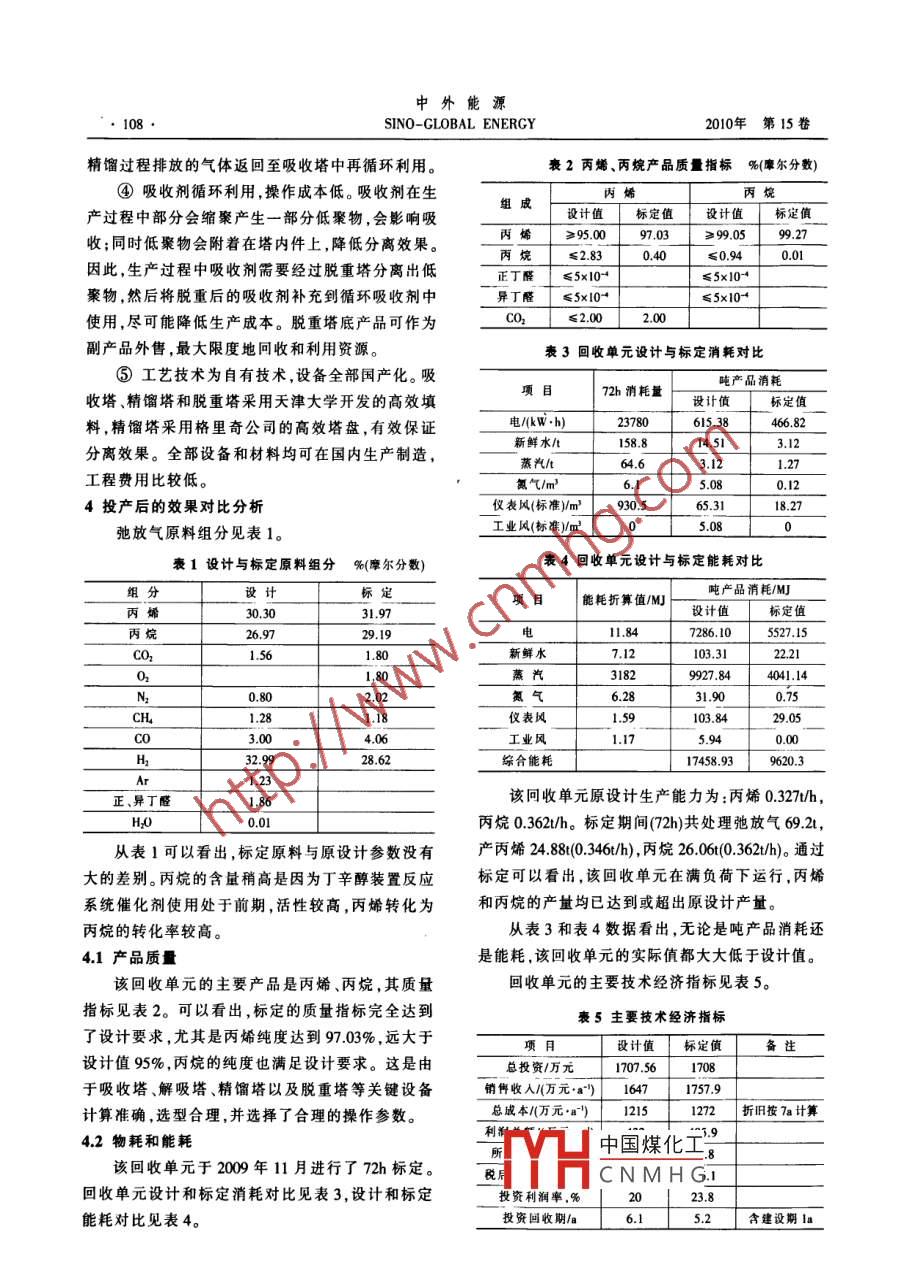 中外能源SINO-GLOBAL ENERGY010年第15卷回收弛放氣中丙烯丙烷的技術(shù)及應(yīng)用劉宏軍,劉殿中,趙曉偉,李新國2,張慧濤',沈琦3(1.中國石油大慶石化公司化工二廠,黑龍江大慶163714;2中國石油大慶石化公司化工三廠,黑龍江大慶163714;3大慶華科股份有限公司,黑龍江大慶163316)摘要在弛放氣同收中試的基礎(chǔ)上,進行了弛放氣回收裝置的工業(yè)化設(shè)計,裝置弛放氣設(shè)計處理能力為68/,同收丙烯和丙烷5.5k/a,年操作時數(shù)為800h。該技術(shù)采用“吸收一精餾一再精餾”工藝路線,即吸收劑吸收他放氣中的丙烯丙烷和丁醛,含丙烯、丙烷的吸收液經(jīng)過精餾分離得到丙烯,丙烷的混合組分,再經(jīng)過常規(guī)精餾分離得到丙烯和丙烷產(chǎn)品。吸收劑經(jīng)提純后可循環(huán)使用。在吸收丙烯、丙烷的同時,混合丁醛也被吸收,與丁醇分離后可作為產(chǎn)品抽出。應(yīng)用該技術(shù),丙烯、丙烷收率大于90%,產(chǎn)品丙爝純度大于%6%,丙烷純度大于9%。該工藝技術(shù)為自有技術(shù),其設(shè)備全部國產(chǎn)化。吸收塔、精餾塔和脫重塔采用天津大學(xué)開發(fā)的高效填料,精餾塔采用格里奇公司的高效塔盤,有效保證分離效果。全部設(shè)備和材料均可在國內(nèi)生產(chǎn)制造,工程費用比較低。關(guān)鍵詞丁辛醇裝置弛放氣阿收丙烯丙烷1前言大慶石化外,還有吉林石化、齊魯石化和揚子巴斯大慶石化公司化工二廠丁辛醇裝置采用低壓夫公司。其中,吉林石化公司丁辛醇裝置原為汽相羰基合成技術(shù)生產(chǎn)丁辛醇產(chǎn)品,現(xiàn)生產(chǎn)能力為循環(huán)技術(shù),在2000年改造后改為液相循環(huán),2004年85kt/a。丁辛醇產(chǎn)品是重要的基本有機化工原料,可裝置又新建一條12×10/a丁辛醇生產(chǎn)線,總計產(chǎn)廣泛用作增塑劑、溶劑,表面活性劑、膠黏劑。丁辛能為26×10t/a,其弛放氣排放量約為22/h。齊魯醇裝置羰基合成反應(yīng)系統(tǒng)以丙烯和合成氣為原料石化公司丁辛醇裝置為液相循環(huán)生產(chǎn)技術(shù),1999年反應(yīng)生成正、異丁醛,在此過程中有少量的丙烯轉(zhuǎn)改造為14x10a丁辛醇,2005年新建丁辛醇裝置化為丙烷。為了防止丙烷等惰性組分的積累,在生20x10v/a,其弛放氣排放量約為29/h。揚子巴斯夫產(chǎn)過程中需要將一部分的氣體(簡稱弛放氣)從系統(tǒng)丁辛醇裝置產(chǎn)能為25×10%v/a,其弛放氣排放量約為循環(huán)回路中連續(xù)排出。弛放氣中含有一定數(shù)量的丙2lt/h。以上各套裝置弛放氣均沒有回收利用,弛放烷和丙烯(分別占389%和45.81%),由于組分復(fù)氣都作為燃料燒掉了,尤其丙烯是非常有價值的化雜,難以處理,過去處理弛放氣的方法是直接排入工原料,排放掉非常可惜。燃料氣管網(wǎng)作為燃料燒掉,造成了資源的浪費和效大慶石化丁辛醇裝置羰基合成技術(shù)是汽相循益的流失2。為了回收弛放氣中有較高經(jīng)濟價值環(huán),生產(chǎn)工藝相對落后,與國內(nèi)其他同類液相循環(huán)的丙烷、丙烯,在原大慶石化公司研究院實驗室回裝置不具有可比性,為了盡量減少裝置弛放氣排放收技術(shù)試驗結(jié)果的基礎(chǔ)上,進行了弛放氣回收裝置量,近年來一直在探尋和試驗,也嘗試了一些方法的工業(yè)化設(shè)計,裝置弛放氣設(shè)計處理能力為6.kua,和措施,如在羰基合成反應(yīng)系統(tǒng)應(yīng)用無模型控制系回收丙烯和丙烷55kua,年操作時數(shù)為800h。弛統(tǒng)提高收率等。2010年還計劃利用裝置檢修時換用放氣回收工藝屬國內(nèi)自主開發(fā),目前在國內(nèi)外還沒種新型催化劑,力爭進一步減少弛放氣排放量。有相同或類似的工業(yè)應(yīng)用。中國煤化工2回收弛放氣中丙烯、丙烷的分析作者CNMHG畢業(yè)于大慶石油學(xué)21國內(nèi)各丁辛醇廠家生產(chǎn)現(xiàn)狀院化學(xué)工程專業(yè),目前主要從事化工企業(yè)生產(chǎn)經(jīng)營管理工作,目前,國內(nèi)丁辛醇產(chǎn)品生產(chǎn)廠家共有四家已發(fā)表論文6篇。E-mail:l1972@163第9期劉宏軍等.回收弛放氣中丙烯丙烷的技術(shù)及應(yīng)用同時,大慶石化丁辛醇裝置擬在2012年進行抽出。應(yīng)用該技術(shù),丙烯、丙烷收率大于90%,產(chǎn)品改擴建,屆時裝置不僅生產(chǎn)規(guī)模將擴大一倍,生產(chǎn)丙烯純度大于%6%,丙烷純度大于99%。工藝也將由汽相循環(huán)改為液相循環(huán)。液相循環(huán)工藝3回收丙烯、丙烷的生產(chǎn)方法與工藝路線不僅收率高于汽相循環(huán),改擴建后裝置弛放氣排放31生產(chǎn)方法量將減少一半以上,弛放氣中丙烯、丙烷含量也將該工藝采用吸收、解吸、精餾等技術(shù)回收弛放減少。這樣既提高了裝置收率、減少了弛放氣排放,氣中的丙烯、丙烷,從而得到丙烯、丙烷等產(chǎn)品。又降低了生產(chǎn)成本,增加了企業(yè)的市場競爭力。3.2工藝路線22回收弛放氣中的丙烯、丙烷的必要性和可行性來自丁辛醇裝置的弛放氣經(jīng)緩沖罐進行氣液作為化工裝置,節(jié)約生產(chǎn)成本,多創(chuàng)經(jīng)濟效益分離后進入吸收塔塔底,吸收劑從塔頂進入,將弛始終是裝置運行和發(fā)展不變的主題。近年來,國家放氣中的丙烯和丙烷吸收下來并從塔底流出,塔頂也在提倡環(huán)保節(jié)能、低碳生產(chǎn)。弛放氣作為裝置的氣排至燃料氣管網(wǎng)。吸收塔塔底物料經(jī