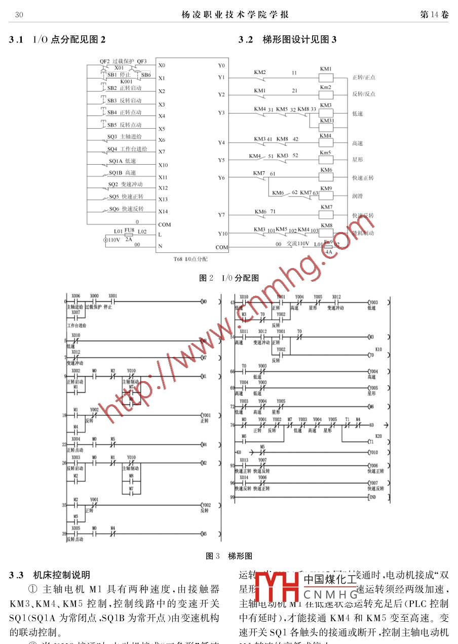 第14卷第2期楊凌職業(yè)技術學院學報Vol 14 No. 22015年6月Journal of Y angling Vocational Technical CollegeJun.,2015T68鏜床的PLC改造孫小春(楊凌職業(yè)技術學院,陜西楊凌712100摘要:介紹了利用三菱FX1S系列PLC對T68鏜床的改造,闡述了系統(tǒng)的改造方案,同時配合T68鏜床的工作要求和特點,確定了PLC的輸入輸出分配,改進了原有繼電器控制電路的缺陷,設計出梯形圖并進行現(xiàn)場調試關鍵詞:PLC;鏜床;梯形圖中圖分類號:TM571文獻標識碼:A文章編號:1671-9131(201502-0028-04PLC Transformation of T68 Boring lathesuN Xiao-chun(Yangling Vocational and Technical College, Yangling, Shaanxi 712100, China)Abstract: This paper describes the transformation of T68 boring lathe with Mitsubishi FXIS series PLC, and states the transforming scheme of the system, meantime, according to the working requirements and characteristics of T68 boring lathe, the as-signments of PLC input and output was confirmed. The defects of relay control circuits were improved, and a ladder diagramwas designed and spot adjustment was performedKey words PLC; boring lathe ladder diagram0引言1T68主電路和控制要求分析鏜床是冷加工中使用比較普遍的設備,主要用圖1中M1為主軸與進給電動機,M2為快速移于孔的精加工,通常有臥式鏜床、坐標鏜床、金剛鏜動電動機。其中M1為一臺4/2極的雙速電動機床等類型。其中以臥式鏜床的使用比較普遍,它可繞組接法為△YY。電動機M1由5只接觸器控以進行的操作有鉆孔、鉸孔、鏜孔、加工端面等。在制,其中KM1、KM2為電動機正、反轉接觸器,加工過程中,常將工件固定在工作臺上,由鏜桿或壓KM3、KM4、KM5接觸器控制低速、高速變換。設平旋盤上固定的刀具進行相關加工。目前,部分企有短路保護和過載保護。電動機M2由接觸器業(yè)及高校仍在使用傳統(tǒng)機床,這些機床經歷了比較KM6、KM7實現(xiàn)正反轉控制,設有短路保護,因快長的時間,雖然它能在一定范圍內可以滿足單機或速移動為點動控制,所以M為短時運行,無須過載者自動生產線的操作需求,但由于它的電氣控制系保護。主電機M停止時,由KM8控制的直流電壓統(tǒng)是以繼電器、接觸器等的硬件設備連接為基礎進行能耗制動的,中間環(huán)節(jié)比較多,線路復雜;電器元件及強電(1)主運動。主軸的旋轉與平旋盤的旋轉運線路電纜線嚴重老化、故障頻繁操作人員維修任務動。主軸電動機為M1,M1采用雙速電動機,由三較大,直接影響了加工產品的質量和生產效率。另接觸器KM3、KM4和KM5作定子繞組三角形和外此機床一直無數顯裝置,現(xiàn)在試制件品種多,且工雙星形的變換,得到主電動機M1的低速和高速。藝都是帶孔系有位移要求,無法滿足試制件及工件當計由動相接成“三角形”連接,低速運加工工藝要求;而且機床潤滑為手動潤滑,經常存在轉中國煤化工時,電動機接成“雙星潤滑不到位現(xiàn)象。本文將采用PLC對T68進行技形”CNMHG術改造。電動機的高速運轉須經兩級加速,即主軸電動收稿日期:2014-12-22作者簡介:孫小春(1976-),女,陜西富平人,碩士研究生,講師,主要從事電氣自動化方面的教學與科研。孫小春:T68鏜床的PLC改造機M1在低速狀態(tài)運轉充足后(PLC控制中有延(3)主運動與進給運動變速控制。通過變速操時),才能接通KM4和KM5變換至高速運行??v盤改變傳動鏈的傳動比來實現(xiàn)的。電氣上要求電MⅠ電動機通過變速箱等傳動機構為主軸及花動機先制動,然后在低速狀態(tài)下實現(xiàn)機械換檔,接著盤提供旋轉動力再起動。運行中變速是指機床拖動系統(tǒng)正在運行(2)進給運動。主軸在主軸箱中的進出進給運中,拉出主軸或進給變速手柄進行變速,此時先進行平旋盤上刀具的徑向進給;主軸箱的升降或者垂制動,然后進行連續(xù)低速沖動。這樣有利齒輪嚙合直進給;工作臺的橫向、縱向進給。這些進給運動都待變速完成,將變速手柄推回后又能使主電動機自可以進行手動或者機動控制。主軸箱、工作臺或主動起動運轉,并使主軸或進給在新的速度下運轉。軸的快速移動由電動機M2進行驅動主軸電機正反轉、高低速能耗制動工作合快速進給正反向380VL2wKM2KMIKMSW8 V8 U8KM4KM3K1主電機M2工作臺電機圖1T68鏜床主電路2確定PLC改造方案低速、高速和變速沖動的操作方法不變,將改造原繼電器控制中的硬件接線,改為PLC編程實現(xiàn)保持原鏜床的工藝加工方法不變,在保證主電中國煤化工補充加裝球柵尺及數路實現(xiàn)功能不變的基礎上,不改變原控制系統(tǒng)電氣顯HCNMHG滑裝置操作方法。對機床控制方式采用PLC可編程控制器,重新設計梯形圖,重新配盤;電氣控制系統(tǒng)控制3利用PLC對T68鏜床的改造元件包括按鈕、行程開關、熱繼電器、接觸器,其作用PLC選用三菱FXS一30MR-001型、16點輸與原電氣線路相同2同時,主軸和進給起動、制動、入/14點輸出34楊凌職業(yè)技術學院學報第14卷3.11/O點分配見圖232梯形圖設計見圖3KM2正轉/正點SB2正轉啟動Km2SB3反轉啟動KM4 31 KM5 32 KM8 33SB4正轉點動SO3主軸進給kM341KM842KmKM451 KM3SO1A低速星形SQIB高速KMKM76快速正轉SQ2變速沖動KM6M763 KM9快速正轉06快速反轉KM6 71Y快速反轉KM3 101KMS 102KMA KM能耗制動T6810點分配圖21/0分配圖變速沖動正轉點動圖3梯形圖3.3機床控制說明運轉V門中國煤化工通時,電動機接成“雙①主軸電機M1具有兩種速度,由接觸器星形HCNMHG速運轉須經兩級加速KM3、KM4、KM5控制,控制線路中的變速開關主軸電物機M1仕低不運轉充足