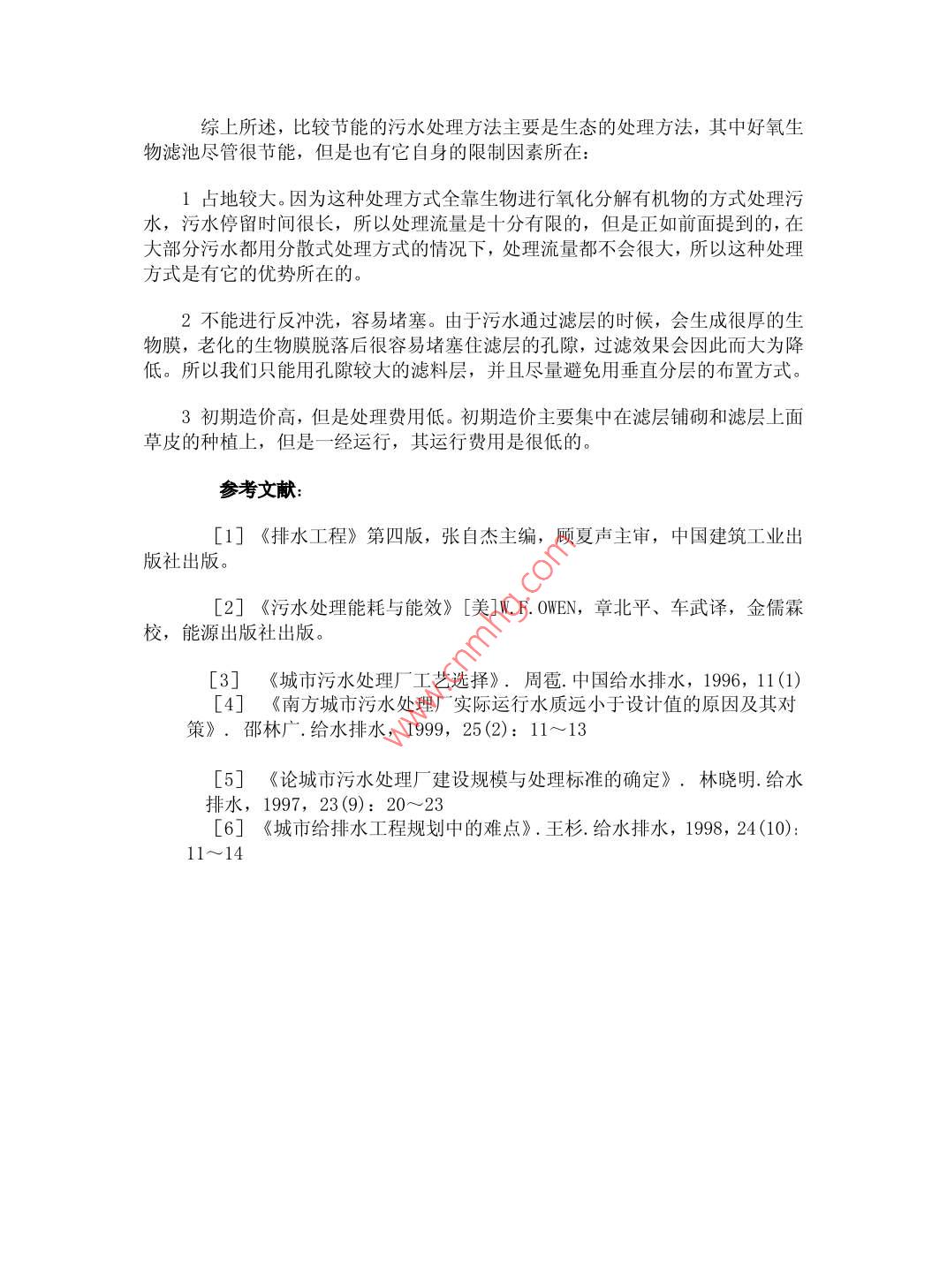 作者簡介張璇,性別:女,年齡:27性別:女,出生年月:1984720學(xué)歷:本科,職稱:助理工程師專業(yè):工程造價淺析城市污水處理節(jié)能途徑張璇胡哲卿(1.天津市排水管處第八排水管理所2.天津市賽英工程建設(shè)咨詢有限公司)摘要:介紹并分析了污水處理廠流程中各個處理構(gòu)筑的能耗情況,并針對各個構(gòu)筑物提出有效的節(jié)能途徑。指出了常用的污水好氧處理能耗過高的突出問題,建議改用能耗低的處理工藝,但是造價稍高的好氧過濾等處理方法。污水再生利用也是解決污水處理能耗高的途徑之關(guān)鍵詞:污水能耗與功效好氧過濾生態(tài)處理自凈目前我國城市污水處理率低、環(huán)境污染壓力大,但現(xiàn)行的處理技術(shù)多數(shù)面臨高額資金投入的難題,當(dāng)前迫切需要低能耗、生態(tài)型的污水處理技術(shù)。并且,隨著人民生活水平的提高和城市化的日益加快,我國城市污水排放量持續(xù)增長。我國水污染的治理重點(diǎn)已經(jīng)開始從工業(yè)點(diǎn)源為主的控制治理,逐步轉(zhuǎn)變?yōu)橐猿鞘猩钗鬯廴緸橹鞯目刂浦卫怼H绾谓?jīng)濟(jì)有效地解決生活污水的污染問題已成為個亟待解決的難題,引起了人民群眾和政府部門的極大關(guān)注一污水處理廠的工藝流程目前,常用于我國城市污水處理的方式為集中污水處理系統(tǒng)和傳統(tǒng)的三格式化糞池。其它的處理構(gòu)筑物也都是大同小異的,主要的流程不外乎如此:污水收集設(shè)施[包括污水管道、雨水管道、工廠排放水管道等]-污水提升泵站-∽>格柵攔截-∽>沉砂池->初沉池->曝氣池、厭氧池等核心處理工藝流程>二次沉淀池->排水管道或渠排入水體[①]二、污水處理各個環(huán)節(jié)的節(jié)能途徑(1)、再生回用以減少深度處理城市污水處理出水的再生利用在我國,花費(fèi)大量投資建設(shè)了城市污水處理廠,但經(jīng)過處理后的再生水并沒有得到充分利用,在城市污水處理決策中應(yīng)充分考慮污水的再生利用。發(fā)展再生水在農(nóng)業(yè)灌溉、綠地澆灌、城市雜用、生態(tài)恢復(fù)和工業(yè)冷卻等方面的利用城市污水再生利用,應(yīng)根據(jù)用戶需求和用途,合理確定用水的水量和水質(zhì)污水再生利用,可選用混凝、過濾、消毒或自然浄化等深度處理技術(shù)。因此,缺水城市和水環(huán)境污染嚴(yán)重的地區(qū),在規(guī)劃建設(shè)遠(yuǎn)距離調(diào)水之前應(yīng)積極實(shí)施城市污水再生利用工程,同時做好非投資性或低投資性的節(jié)水減污工作。(2)、環(huán)境自凈和生態(tài)處理以降低能耗城市污水處理廠出水也可看作是水文循環(huán)的組成部分,將合乎質(zhì)量要求的出水排放到河流水體中,使河流水體能維持或變成供下游使用的原水源,不僅經(jīng)濟(jì)可行,而且可減少風(fēng)險并發(fā)揮河流自凈能力。(3)、各個處理構(gòu)筑物的節(jié)能途徑在污水處理流程中,各個污水處理構(gòu)筑物的節(jié)能途徑很多,下面就污水處理流程中各個構(gòu)筑物的節(jié)能方法。污水提升泵站節(jié)能途徑。將現(xiàn)有的集中式污水處理改成分散式處理,并充分利用一級處理后的中水,可以減小城市污水處理廠的壓力,更可以大大減少深度處理所需的費(fèi)用。同時污水提升泵站的水量也會適當(dāng)減少,甚至可以取消,全部采用分散處理模式。污水處理廠只負(fù)責(zé)處理工廠附近、污水量大的用戶排放的水格柵的節(jié)能途徑。盡量將污水處理設(shè)備安裝在地勢較低的地方,可以減小提升泵的功率。污水經(jīng)過格柵的時候可以憑借其較快的流速通過柵條,必要時再用提升泵將污水提升至沉淀池曝氣設(shè)施的節(jié)能途徑[③]。不管是好氧處理還是厭氧處理設(shè)施,其能耗都是非常大的。因?yàn)槲覀儽仨氁秒娏υO(shè)備將空氣充入到污水中,但是我們可以采用多層好氧過濾的方式減小這一能耗開支。好氧過濾的各個濾層的厚度的材料都是不相同的,實(shí)現(xiàn)的過濾效果也大相徑庭好氧過濾具體的方法是:污水經(jīng)過格柵攔截之后,即可以直接進(jìn)入第一層好氧過濾層,第一層好氧過濾層的孔隙是很大的,一般用粗大的砂石鋪墊,主要去除污水中大的懸浮物并通過水流在砂石中紊動的流動將空氣中的氧氣混入污水中。然后污水進(jìn)入第二層好氧過濾層,這一層的砂石粒徑相對較小,污水在這層的停留時間相對較長,主要是好氧微生物對有機(jī)物的氧化過程,在這一好氧濾層里,很容易生成生物膜,類似于生物膜的處理。如果污水的有機(jī)物的含量不是很高的話,處理水已經(jīng)基木達(dá)到了排放的標(biāo)準(zhǔn)了,也可以將處理后的水收集起來作中水使用。如果污水的有機(jī)物含量很高的話,可以讓污水繼續(xù)進(jìn)行下一層的好氧過濾,濾層的孔隙也將更小,處理時間更長,效果也更好。在這一層中,由于污水的停留時間較長,對污水中的N和P也有較好的去除效果進(jìn)行好氧過濾處理的排放水已經(jīng)可以達(dá)到排放的要求,沒有必要設(shè)置二次沉淀池進(jìn)行泥水分離。這種處理流程適用于建設(shè)在河湖的旁邊,有利用處理水的就近排放,而且可以不用清水管道或管渠即可。綜上所述,比較節(jié)能的污水處理方法主要是生態(tài)的處理方法,其中好氧生物濾池盡管很節(ji