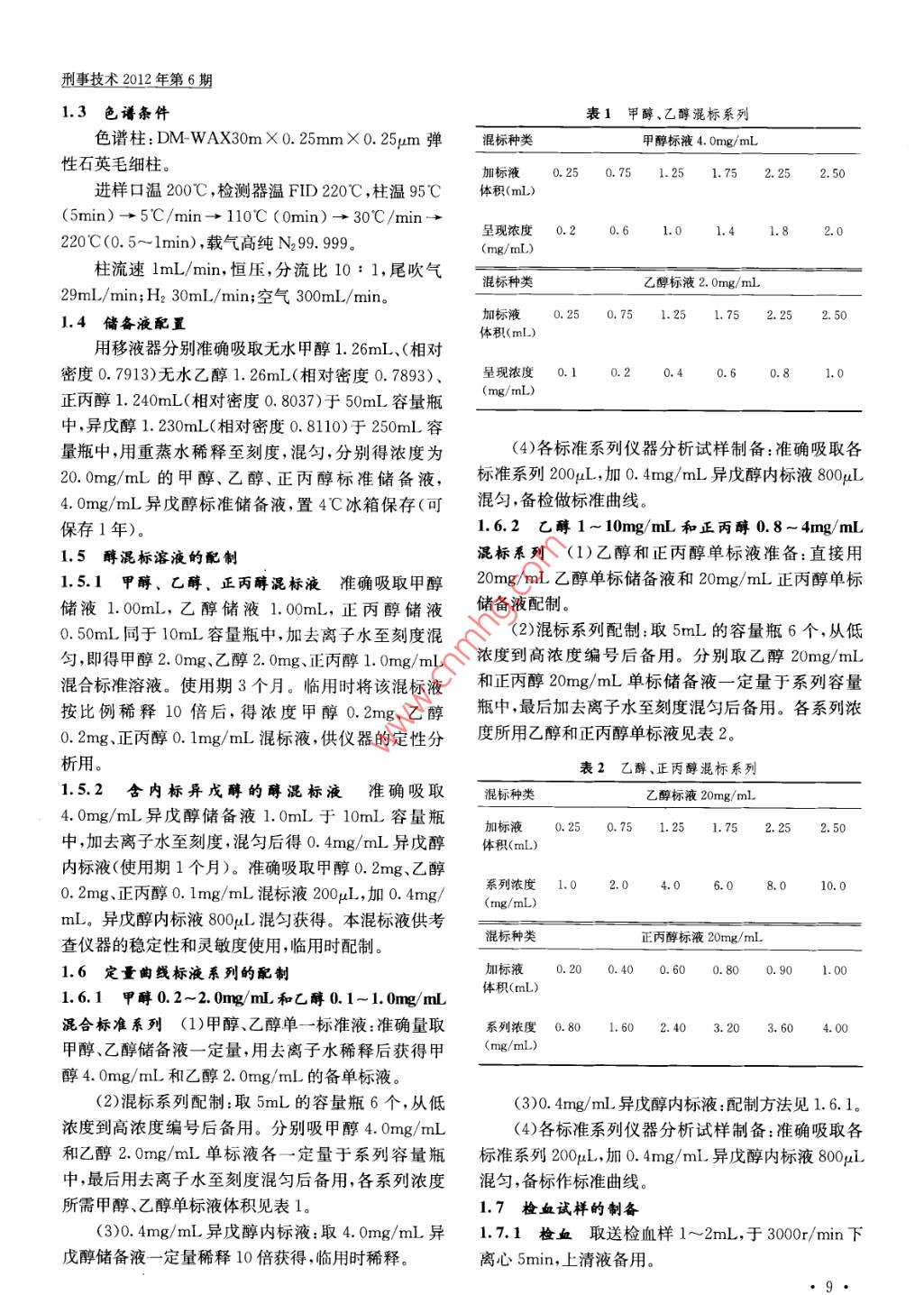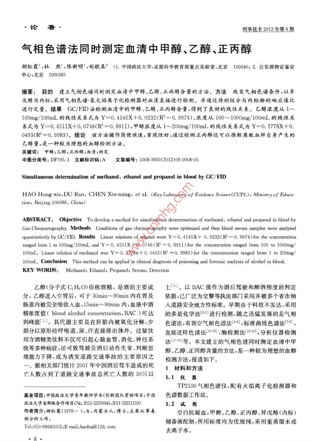 氣相色譜法同時(shí)測(cè)定血清中甲醇、乙醇、正丙醇 氣相色譜法同時(shí)測(cè)定血清中甲醇、乙醇、正丙醇