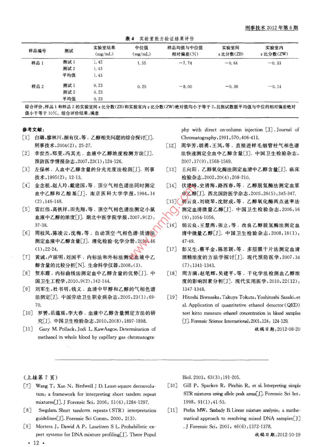 刑事技術(shù)2012年第6期氣相色譜法同時(shí)測(cè)定血清中甲醇、乙醇、正丙醇郝紅霞,杜然,陳新明,趙敬真2(1.中國(guó)政法大學(xué),證據(jù)科學(xué)教育部重點(diǎn)實(shí)驗(yàn)室,北京10040;2.公安部物證鑒定中心,北京100038)摘要:目的建立氣相色譜同時(shí)測(cè)定血清中甲醇、乙醇、正丙醇含量的方法。方法改變氣相色譜條件,以異戊醇為內(nèi)標(biāo),采用氣相色譜氫火焰離子化檢測(cè)器對(duì)血清直接進(jìn)行檢測(cè)。并通過待測(cè)組分與內(nèi)標(biāo)物的響應(yīng)值比進(jìn)行定量。結(jié)果GC/FID法檢測(cè)血清中的甲醇、乙醇、正丙醇含量,得到了良好的線性關(guān)系。乙醇濃度從1~100mg/100mL的線性關(guān)系式為Y=0.4145X+0.0232(R2=0.9974)、濃度從100~100mg/100mL的線性關(guān)系式為Y=0.4511X+0.0746(R2=0.991),甲醇濃度從1~200mg/100mL的線性關(guān)系式為Y=0.2778X+00493(R2=0.9983)。結(jié)論該方法操作簡(jiǎn)便快速,重現(xiàn)性妤,通過檢測(cè)正丙醇還可以推斷腐敗血樣自身產(chǎn)生的乙醇量,是一種較為理想的血醇檢測(cè)方法。關(guān)鍵詞:甲醇;乙醇;正丙醇;血清;測(cè)定中圖分類號(hào):DF795.1文獻(xiàn)標(biāo)識(shí)碼:A文章編號(hào):1008-3650(2012)06-000805Simultaneous determination of methanol, ethanol and propanol in blood by GC/FIDHAO Hong-xia, DU Ran, Chen Xin-ming, et al. (Key Laboratory of Evidence Science(CUPL), Ministry of education, Beijing 100088, ChinaABSTRACT: Objective To develop a method for simultaneous determination of methanol, ethanol and propanol in blood byGas Chromatography. Methods Conditions of gas chromatography were optimized and then blood serum samples were analyzedquantitatively by GC/FID. Results Linear relations of ethanol were Y=0. 4145X+ 0. 0232(R2=0. 9974)for the concentrationranged from 1 to 100mg/100mL and Y=0.4511X+0. 0746(R2=0. 9911)for the concentration ranged from 100 to 1000mg/100mL Linear relation of methanol was Y=0. 2778x-+0. 0493(R2=0. 9983)for the concentration ranged from 1 to 200mg/100mL. Conclusion This method can be applied in clinical diagnosis of poisoning and forensic analysis of alcohol in blood.KEY WORDS: Methanol; Ethanol; Propanol; Serum; Detection乙醇(分子式C2HO)俗稱酒精,是酒的主要成上2。以BAC值作為酒后駕駛和醉酒程度的判定分,乙醇進(jìn)入空胃后,可于3min~90min內(nèi)在胃及依據(jù),已廣泛為交警等執(zhí)法部門采用并被多個(gè)省市納腸道內(nèi)被完全吸收人血,15min~9omin內(nèi),血液中酒道路安全地方性標(biāo)準(zhǔn)。早期由于科技不發(fā)達(dá),采用精濃度值( blood alcohol concentration,BAC)可達(dá)的多是化學(xué)法23進(jìn)行檢測(cè),隨之迅猛發(fā)展的是氣相到峰值凵]。其代謝主要是在肝臟內(nèi)被氧化分解,少色譜法,有頂空氣相色譜法,標(biāo)準(zhǔn)曲線色譜法),部分以原形經(jīng)呼吸道、尿、汗直接排出體外。過量飲直接進(jìn)樣色譜法012,酶檢測(cè)法31,分析儀器檢測(cè)用含酒精類飲料不僅可引起心腦血管、消化、神經(jīng)系法等。本文建立的氣相色譜同時(shí)測(cè)定血清中甲統(tǒng)等多種病癥,還可致駕駛員酒后動(dòng)作失常、判斷思醇、乙醇、正丙醇含量的方法,是一種較為理想的血醇維能力下降,成為誘發(fā)道路交通事故的主要原因之檢測(cè)方法報(bào)道如下。據(jù)相關(guān)部門統(tǒng)計(jì)2001年中國(guó)酒后駕車造成的死1材料和方法亡人數(shù)占到了道路交通事故總死亡人數(shù)的30%以l1儀器TP2100氣相色譜儀,配有火焰離子化檢測(cè)器和基金項(xiàng)目:中國(guó)政法大學(xué)青年教師學(xué)術(shù)(創(chuàng)新團(tuán)隊(duì)資助項(xiàng)目;中國(guó)色譜數(shù)據(jù)工作站。政法大學(xué)省部級(jí)合作項(xiàng)目(№201123210044,2011-23211191.2試劑作者簡(jiǎn)介:郝紅霞(1976—),女,內(nèi)蒙古人,博士,主要從事毒空白抗凝血,甲醇、乙醇、正丙醇、異戊醇(內(nèi)標(biāo))物分析工作。儲(chǔ)備液配制,所用標(biāo)準(zhǔn)均為優(yōu)級(jí)純,采用重蒸餾水或Tel:010-68645052:E-mail;haohx(@126.com去離子水。刑事技術(shù)2012年第6期1.3色譜條件表1甲醇、乙醇混標(biāo)系列色譜柱: DM-WAX30m X025m×0.2m彈單祖標(biāo)種關(guān)甲靜標(biāo)液4mm性石英毛細(xì)柱。加標(biāo)液0.250.751.25752.252.50進(jìn)樣口溫200℃,檢測(cè)器溫FID220℃,柱溫95℃體積(mL)(5min)→5/min→110c(omin)→30℃/min→220℃(0.5~1min),載氣高純N299.999呈現(xiàn)濃度0.20.61.01.41.82.0(mg/mL)柱流速lmL/min,恒壓,分流比10:1,尾吹氣混標(biāo)種類乙醇標(biāo)液2.0mg/mL29mL/min;H230mL/min;空氣300mL/minl.4儲(chǔ)備液配置加標(biāo)液0.250.751.251,7體積(mL)用移液器分別準(zhǔn)確吸取無(wú)水甲醇1.26mL、(相對(duì)密度0.7913)無(wú)水乙醇1.26mL(相對(duì)密度0.7893)呈現(xiàn)濃度0.10.20.40.60.81.0正丙醇1.240mL(相對(duì)密度0.8037)于50mL容量瓶(mg/mL)中,異戊醇1.230mL(相對(duì)密度0.8110)于250mL容量瓶中,用重蒸水稀釋至刻度,混勻,分別得濃度為(4)各標(biāo)準(zhǔn)系列儀器分析試樣制備:準(zhǔn)確吸取各20.0mg/mL的甲醇、乙醇、正丙醇標(biāo)準(zhǔn)儲(chǔ)備液,標(biāo)準(zhǔn)系列200L,加0.4mg/mL異戊醇內(nèi)標(biāo)液80uL4.0mg/mL異戊醇標(biāo)準(zhǔn)儲(chǔ)備液,置4C冰箱保存(可混勻,備檢做標(biāo)準(zhǔn)曲線保存1年)。1.6.2乙醇1~10mg/mL和正丙醇0.8~4mg/mL1.5醇混標(biāo)溶液的配制混標(biāo)系列(1)乙醇和正丙醇單標(biāo)液準(zhǔn)備:直接用1.5.1甲醇、乙醇、正丙