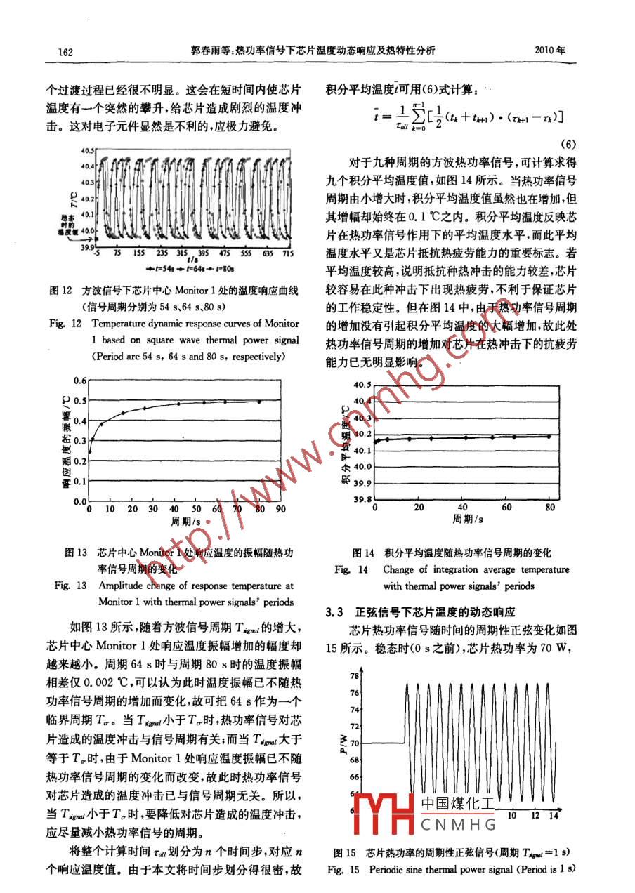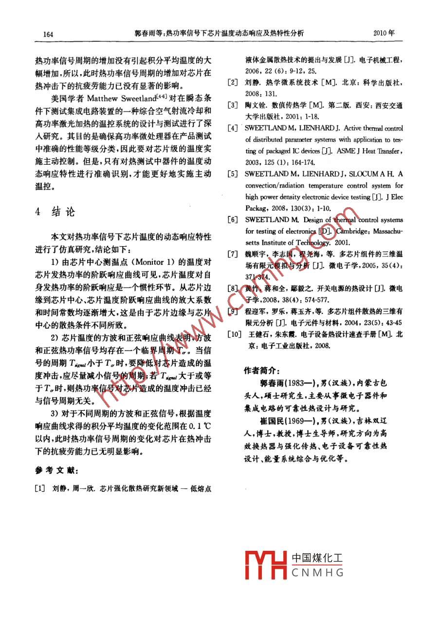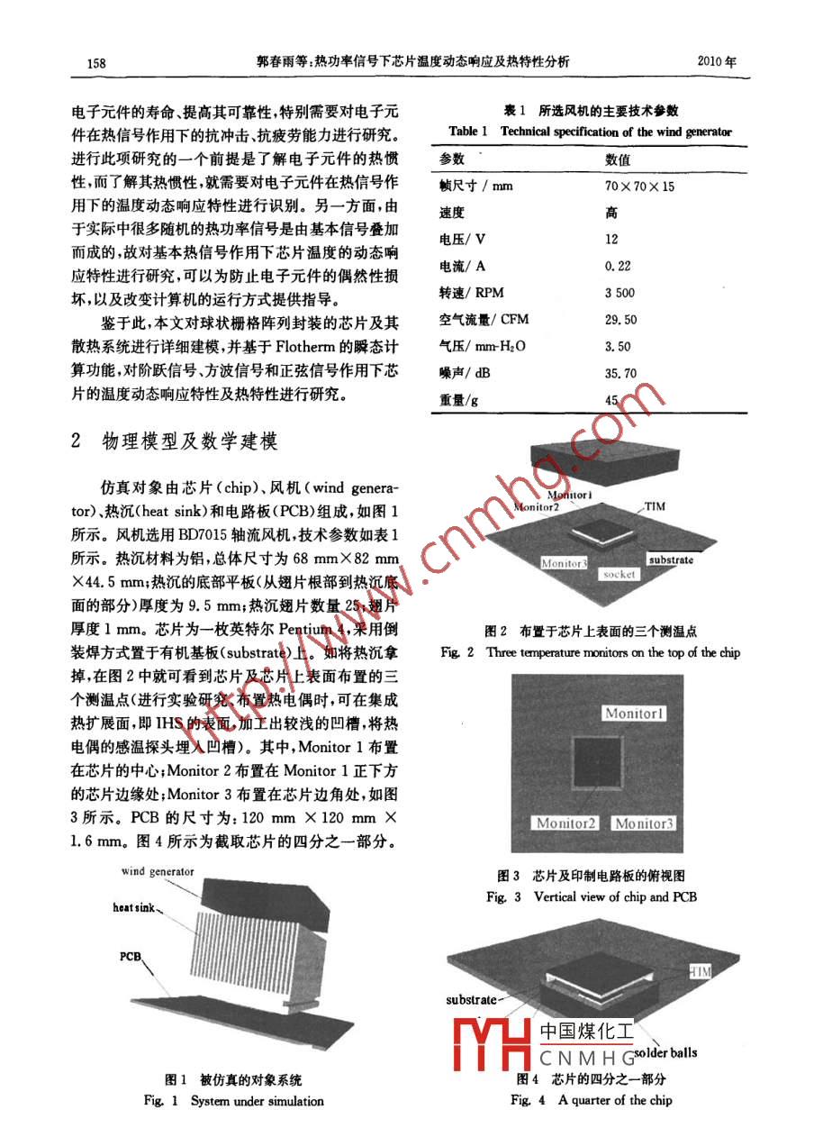 第40卷第1期微電子學Vol 40, No. 12010年2月MicroelectronicsFeb.2010熱功率信號下芯片溫度動態(tài)響應及熱特性分析郭春雨,崔國民上海理工大學熱工程研究所,上海200093)摘要:,針對電子元件在瞬態(tài)傳熱中的熱慣性問題,對芯片在熱功率信號作用下的溫度動態(tài)響應特性進行識別。根據(jù)芯片溫度對芯片發(fā)熱功率的階躍響應曲線求得芯片上關(guān)鍵點的傳遞函數(shù);根據(jù)芯片溫度的方波響應曲線和正弦響應曲線,重點對熱功率信號給芯片造成的溫度沖擊與信號周期之間的關(guān)系進行分析。該研究對提高電子元件抵抗熱沖擊和熱疲勞的能力具有指導意義。關(guān)鍵詞:熱功率信號;芯片;動態(tài)響應;熱特性;溫度沖擊中圖分類號:TN452文獻標識碼:A文章編號:1004-3365(2010)01-0157-08Analysis on Temperature Dynamic Response and Thermal Characteristicsof Chips based on Thermal Power Signal(Institute of Thermal Engineering, University of shanghai for Science and Technology, Shanghai 200093, P. R. China)Abstract: In order to explore thermal inertia of electronic components, dynamic temperature response character-of chips based on thermal power signals were identified. According to step function response curves of chipstemperature, transfer functions of temperature at chip's key points were established. Relationship between tempera-ture shock to chips induced by thermal power signals and signal period was analyzed in detail, based on square wavesignal and sine signal response curves of chips temperature. This work is helpful in improving the capability of elec-tronic components to resist thermal shock and thermal fatigue.Key words: Thermal power signal; Chip: Dynamic response; Thermal characteristics; Temperature shockEEACC: 2250@2GHz芯片消耗的功率高達75W。由此帶來的1引言過高溫度將降低芯片的工作穩(wěn)定性,增加出錯率;同時,模塊內(nèi)部與其外部環(huán)境間所形成的熱應力會直如今,微電子芯片的發(fā)展呈現(xiàn)三大趨勢:進一步接影響到芯片的電性能、工作頻率及機械強度提高集成度減小芯片尺寸及增大時鐘頻率。同時,此外,由于各種電子元件材料的熱膨脹系數(shù)不同,以高集成度計算機芯片引發(fā)的熱障問題成了制約其持及在變化的溫度場中材料本身的粘性彈性塑性會續(xù)發(fā)展的技術(shù)瓶頸之一。一枚英特爾 Pentium4發(fā)生非線性變化等原因,材料本身溫度分布的不均芯片集成的晶體管有4200萬個,根據(jù)“摩爾定律”勻也將會導致結(jié)構(gòu)內(nèi)部的應力和能量的積累。這種推算:芯片上的晶體管數(shù)目每18個月翻一番,那么累積會誘發(fā)產(chǎn)生輕微的裂紋,隨著電子元件自身工到2010年芯片上的晶體管數(shù)量將超過10億2。作時間的延續(xù),裂紋會不斷擴展,以致最后造成分層伴隨著晶體管集成度的迅速提高,芯片功率與功率或斷裂,從而影響整個系統(tǒng)的可靠性。密度也在急劇增加?,F(xiàn)有AMD處理器 Athlon中國煤化工求穩(wěn)態(tài)設計時器120H產(chǎn)生的熱量已達66W,一枚 Pentium44件單位HCNMH文認為要確保收稿日期:20090909;定稿日期:20091026基金項目:教育部博士點基金資助項目(20080252000;國家自然科學基金資助項目(20406011);上海市教育委員會發(fā)展基金資助項目(07285);上海市重點學科建設項目資助(S30503)158郭春雨等:熱功率信號下芯片溫度動態(tài)響應及熱特性分析2010年電子元件的壽命、提高其可靠性特別需要對電子元表1所選風機的主要技術(shù)參數(shù)件在熱信號作用下的抗沖擊、抗疲勞能力進行研究Table 1 Technical specification of the wind generator進行此項研究的一個前提是了解電子元件的熱慣參數(shù)數(shù)值性而了解其熱慣性就需要對電子元件在熱信號作幀尺寸/m70×70×15用下的溫度動態(tài)響應特性進行識別。另一方面,由速度于實際中很多隨機的熱功率信號是由基本信號疊加電壓/V而成的,故對基本熱信號作用下芯片溫度的動態(tài)響應特性進行研究,可以為防止電子元件的偶然性損電流/A0.22壞,以及改變計算機的運行方式提供指導。轉(zhuǎn)速/RPM鑒于此,本文對球狀柵格陣列封裝的芯片及其空氣流量/CFM29.50散熱系統(tǒng)進行詳細建模,并基于 Flotherm的瞬態(tài)計氣壓/mmH2O算功能,對階躍信號、方波信號和正弦信號作用下芯片的溫度動態(tài)響應特性及熱特性進行研究重量/g2物理模型及數(shù)學建模仿真對象由芯片(chip)、風機( wind generaMonitor itor)熱沉( heat sink)和電路板(PCB)組成,如圖1Monitor 2TIM所示。風機選用BD7015軸流風機,技術(shù)參數(shù)如表1所示。熱沉材料為鋁,總體尺寸為68mm×82mmontosubstrate4.5mm;熱沉的底部平板(從翅片根部到熱沉底面的部分)厚度為9.5mm;熱沉翅片數(shù)量25;翅片厚度1mm。芯片為一枚英特爾 Pentium4,采用倒圖2布置于芯片上表面的三個測溫點裝焊方式置于有機基板( substrate)上。如將熱沉拿2 Three temperature monitors on the top of the chip掉在圖2中就可看到芯片及芯片上表面布置的三個測溫點(進行實驗研究、布置熱電偶時,可在集成熱擴展面,即IHS的表面,加工出較淺的凹槽,將熱MonitorI電偶的感溫探頭埋入凹槽)。其中, Monitor1布置在芯片的中心; Monitor2布置在 Monitor1正下方的芯片邊緣處; Monitor3布置在芯片邊角處,如圖3所示。PCB的尺寸為:120mm×120mmMonitor Monitor1.6mm。圖4所示為截取芯片的四分之一部分。wind generator圖3芯片及印制電路板的俯視圖Fig. 3 Vertical view of chip and PCBheatsink中國煤化工CNMH Golder bal
