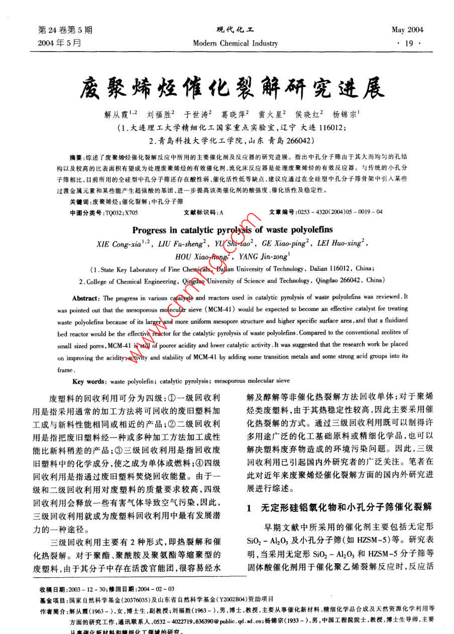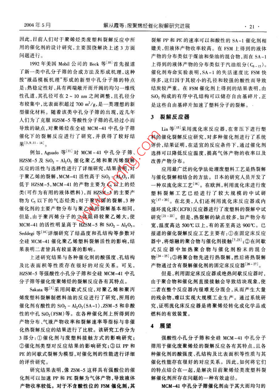 第24卷第5期現(xiàn)代化工May 20042004年5月Modem Chemical Industry19 ●廢聚烯烴催化裂解研究進(jìn)展解從霞',2劉福勝2 于世濤2葛曉萍2雷火星2 侯曉紅2楊錦宗'(1.大連理工大學(xué)精細(xì)化工國(guó)家重點(diǎn)實(shí)驗(yàn)室,遼寧大連116012;2.青島科技大學(xué)化工學(xué)院,山東青島266042)摘要:綜述了廢聚烯烴催化裂解反應(yīng)中所用的主要催化劑及反應(yīng)器的研究進(jìn)展。指出中孔分子篩由于其大而均勻的孔結(jié)構(gòu)以及較高的比表面積有望成為處理廢囊婚烴的有效催化劑,流化床反應(yīng)器是處理廢聚烯烴的有效反應(yīng)器。與傳統(tǒng)的小孔分子篩相比.目前所用的全硅型中孔分子篩還存在酸性弱、催化活性低等缺點(diǎn),建議應(yīng)通過(guò)在全硅型中孔分子篩骨架中引人某些過(guò)渡金屬元素和某些能產(chǎn)生超強(qiáng)酸的基團(tuán).進(jìn)-步提高該類催化劑的酸強(qiáng)度、催化活性及穩(wěn)定性。關(guān)鍵詞:廢聚烯烴;催化裂解:中孔分子篩中圖分類號(hào):TQ032;X705文獻(xiàn)標(biāo)識(shí)碼:A文章編號(hào):0253 - 4320(200)05 - 0019 - 04Progress in catalytic pyrolysis of waste polyolefinsXIE Cong-xial.2, LIU Fu-sheng”, YU Shi-tao”, GE Xiao-ping', LEI Huo xing2 ,HOU Xiao-hong2,YANG Jin- zong'(1. State Key Laboratory of Fine Chemicals, Dalian University of Technology, Dalian 116012, China; .2. Cllege of Chemical Engineering, Qingdao University of Science and Technology,Qingdao 266042, China)Abstract: The progress in various catalysts and reactors used in catalytie pyrolysis of waste polyolefins was reviewed.Itwas pointed out that the mesoporous molecular sieve (MCM- 41) would be expected to become an fectre catalyst for treatingwaste polyoleins because of its larger and more uniform mesopore structure and higher specific surface area ,and that a fluidizedbed reactor would be the efectre reaclor for the catalytice prolysis of waste polylefins . Compared to the conventional zeolites ofsmall sized pores , MCM-41 is stll of poorer acidity and lower catalytic activity . It was suggested that the research work be placedon improving the acidity , ativity and sability of MCM-41 by adding some tansition metals and some strong acid goups into itsframe .Key words: waste plyolefin; catalytic pyrolysis; megoporous molecular sieve廢塑料的回收利用可分為四級(jí):①一級(jí)回收利解及醇解等非催化熱裂解方法回收單體;對(duì)于聚烯用是指采用通常的加工方法將可回收的廢舊塑料加烴類廢塑料,由于其熱穩(wěn)定性較高,因此主要采用催工成與新料性能相同或相近的產(chǎn)品;②二級(jí)回收利化熱裂解的方式。通過(guò)三級(jí)回收利用既可以制得許用是指把廢舊塑料經(jīng)一種或多種加工方法加工成性多用途廣泛的化工基礎(chǔ)原料或精細(xì)化學(xué)品,也可以能比新料稍差的產(chǎn)品;③三級(jí)回收利用是指回收廢解決塑料廢棄物造成的環(huán)境污染問(wèn)題。因此,三級(jí)舊塑料中的化學(xué)成分,使之成為單體或燃料;④四級(jí)回收利用已引起國(guó)內(nèi)外研究者的廣泛關(guān)注。筆者在.回收利用是指通過(guò)廢舊塑料焚燒回收能量。由于一此對(duì)近年來(lái)廢聚烯烴催化裂解方面的國(guó)內(nèi)外研究進(jìn)級(jí)和二級(jí)回收利用對(duì)廢塑料的質(zhì)量要求較高,四級(jí)展進(jìn)行綜述?;厥绽脮?huì)釋放- - 些有害氣體導(dǎo)致空氣污染,因此,1無(wú)定形硅鋁氧化物和小孔分子篩催化裂解三級(jí)回收利用就成為廢塑料回收利用中最有發(fā)展?jié)摿Φ囊? 種途徑。早期文獻(xiàn)中所采用的催化劑主要包括無(wú)定形三級(jí)回收利用主要有2種形式,即熱裂解和催Si02- Al2O3及小孔分子篩(如HZSM-5)等。研究表化熱裂解。對(duì)于聚酯、聚酰胺及聚氨酯等縮聚型的明,當(dāng)采用無(wú)定形Si02- Al2O3和HZSM-5分子篩等廢塑料,由于其分子中存在活潑官能團(tuán),很容易經(jīng)水固體酸催化劑用于催化聚乙烯裂解反應(yīng)時(shí),反應(yīng)活收稿日期2003- 12- 30:修回日期:204-02-03基金項(xiàng)目:國(guó)家自然科學(xué)基金(20376035)及山東省自然科學(xué)基金( Y2002B04)資助項(xiàng)目作者簡(jiǎn)介:解從霞(1963- ),女.博士生,副教授;劉福勝(1963- ),男,博士,教授,主要從事催化新材料精細(xì)化學(xué)品合成及天然資源化學(xué)利用等方面的研究工作,通訊聯(lián)系人,0532 - 42729639@ pbli.qd. ad.cn:楊錦宗(1933- ),男,中國(guó)工程院院士.教授,博士生導(dǎo)師,主要從事催化新材料和精細(xì)化工領(lǐng)城的研究。2004年5月.解從霞等:廢聚烯烴催化裂解研究進(jìn)展21●因此,目前人們對(duì)于聚烯烴類廢塑料裂解反應(yīng)中所裂解PP和PE的速率可以和酸性的SA-1催化劑相用的催化劑的設(shè)計(jì)研究,主要圍繞解決上述3方面媲美,但液體產(chǎn)物收率較高。在FSM上得到的液體問(wèn)題進(jìn)行。產(chǎn)物的分布類似于煤油和柴油的混合物,而在SA-11992年美國(guó)Mobil公司的Beck等[10]首先報(bào)道上得到的液體產(chǎn)物的分布類似于汽油組分(6%13)。了新一類中孔分子篩的合成方法及形成機(jī)理,這種.催化劑壽命實(shí)驗(yàn)表明,SA-1的失活速度比FSM快按“液晶模板機(jī)理"形成的新型中孔分子篩的特點(diǎn)得多,這歸因于其較小的孔徑和較強(qiáng)的酸性而導(dǎo)致是:熱穩(wěn)定性好,具有兩端敞開(kāi)而開(kāi)闊的均勻-維線結(jié)炭較嚴(yán)重。在FSM催化劑上得到的結(jié)果表