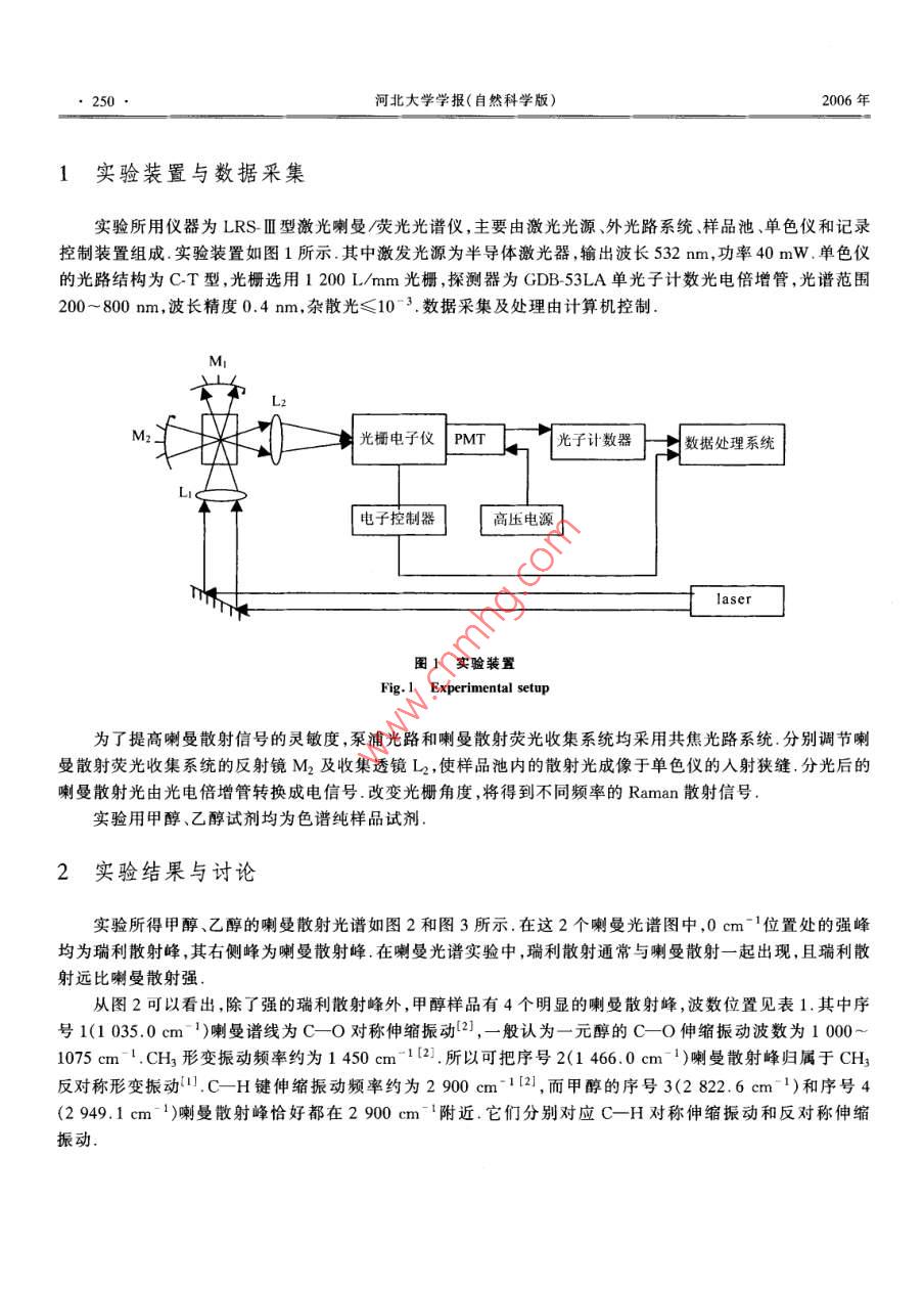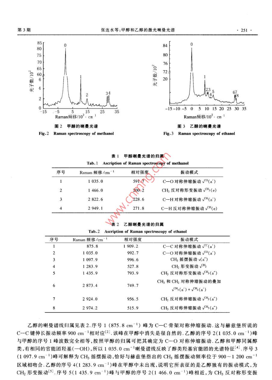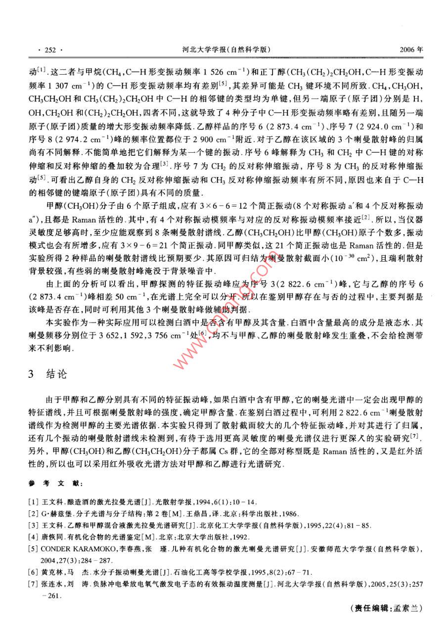 第26卷第3期河北大學學報(自然科學版)Vol 26 No. 32006年5月Journal of Hebei University(Natural Science Edition)May 2006甲醇和乙醇的激光喇曼光譜張連水,毛少娟,黨偉,孫江,馮小敏(河北大學物理科學與技術(shù)學院,河北保定071002)摘要:采用激光喇曼方法,對甲醇和乙醇液體樣品進行了喇曼光譜研究,得到了上述樣品的喇曼光譜,并對其進行了歸屬經(jīng)過分析比較,給出了檢測甲醇的特征譜線,為假酒鑒別、深入研究甲醇和乙醇的能級結(jié)構(gòu)等提供了可供借鑒的參考關(guān)鍵詞:甲醇;乙醇;喇曼光譜中圖分類號:O433.4文獻標識碼:A文章編號:1000-1565(2006)03-0249-04Raman Spectroscopy of Methanol and EthanolZHANG Lian-shui, MAO Shao-juan, DANG Wei, SUN Jiang, FENG Xiao-minCollege of Physics Science and Technology, Hebei University, Baoding 071002, China)Abstract: Laser Raman spectroscopy technique is used to study methanol and ethanol liquid. The vibrationalpeak obtained in the experiment has been assigned. This paper presents characteristic spectral line for detectingmethanol by analyzing and comparing all the spectral lines. It has great referrence value in evaluating the qualityof alcohol and studying the energy level of methanol and ethanol deeplyKey words: methanol; ethanol; laser Raman spectroscopy酒是人們?nèi)粘I钪械闹匾M品,適量飲酒能疏通經(jīng)絡、促進血液循環(huán),有利于身體健康,而過量飲酒或飲用甲醇含量超標的酒類,會嚴重影響身體健康,甚至致殘.長期以來人們對白酒的成分進行了深入的探討1,其主要成分是乙醇所謂“假酒”就是以工業(yè)酒精為原料仿冒有品牌的“真酒”,由于工業(yè)酒精分餾純度不佳,常伴隨有不少甲醇成分,甲醇同乙醇類似,也是具有酒香氣味的無色透明液體,有顯著的麻醉作用,對于視神經(jīng)危害最為嚴重,能引起損害和失明,甚至危及人的生命有人稱其為“假酒中的殺人兇手”國內(nèi)外已有很多起甲醇中毒致死事件鑒于此,如何鑒別酒中是否含有甲醇,成了一項值得研究的課題一般消費者只能通過感官(包括觀、嗅、嘗等)對酒的色、香、味進行鑒別但是由于每個人的感官要求不樣,所以這種方法易受主觀條件限制,并且不夠準確,不能量化.用指示劑法來檢測甲醇的依據(jù)是指示劑只和甲醇氧化后的甲醛起反應,發(fā)生顏色的變化.該方法的缺點是甲醇可能過度氧化成甲酸,而無法確定甲醇氧化成甲醛和甲酸的量,間接影響此試劑的檢測靈敏度.目前有人用化學方法來檢測甲醇,但耗時長,不方便.而采用激光喇曼方法對白酒中的甲醇含量進行檢測,可以克服上述檢測方法的不足本文基于上述目的分別對甲醇和乙醇樣品進行了喇曼光譜實驗研究,得到了對應的喇曼光譜,對喇曼頻移所對應的簡正振動模式進行了歸屬,并對二者做了比較這不僅對檢測酒類飲品中的甲醇提供了可靠依據(jù),還為研究甲醇的能級結(jié)構(gòu)、電子態(tài)躍遷等做了基礎工作,豐富了有機物分子的價鍵數(shù)據(jù)和性質(zhì)收稿日期:2005-10-30作者簡介:張連水(1956-),男,河北保定人,河北大學教授,主要從事激光光譜方面的研究250·河北大學學報(自然科學版)2006年實驗裝置與數(shù)據(jù)釆集實驗所用儀器為LRSⅢ型激光喇曼熒光光譜儀,主要由激光光源、外光路系統(tǒng)、樣品池、單色儀和記錄控制裝置組成實驗裝置如圖1所示.其中激發(fā)光源為半導體激光器,輸出波長532nm,功率40mW單色儀的光路結(jié)構(gòu)為CT型,光柵選用1200L/mm光柵,探測器為GDB53LA單光子計數(shù)光電倍增管,光譜范圍200~800nm,波長精度0.4nm,雜散光≤10-3.數(shù)據(jù)采集及處理由計算機控制L光柵電子儀PMT光子計數(shù)器數(shù)據(jù)處理系統(tǒng)電子控制器高壓電源laaser圖1實驗裝置Fig 1 Experimental setup為了提髙喇曼散射信號的靈敏度,泵浦光路和喇曼散射熒光收集系統(tǒng)均采用共焦光路系統(tǒng).分別調(diào)節(jié)喇曼散射熒光收集系統(tǒng)的反射鏡M2及收集透鏡L2,使樣品池內(nèi)的散射光成像于單色儀的入射狹縫,分光后的喇曼散射光由光電倍增管轉(zhuǎn)換成電信號.改變光柵角度,將得到不同頻率的 Raman散射信號實驗用甲醇、乙醇試劑均為色譜純樣品試劑2實驗結(jié)果與討論實驗所得甲醇、乙醇的喇曼散射光譜如圖2和圖3所示.在這2個喇曼光譜圖中,0cm-1位置處的強峰均為瑞利散射峰,其右側(cè)峰為喇曼散射峰.在喇曼光譜實驗中,瑞利散射通常與喇曼散射一起出現(xiàn),且瑞利散射遠比喇曼散射強從圖2可以看出,除了強的瑞利散射峰外,甲醇樣品有4個明顯的喇曼散射峰,波數(shù)位置見表1.其中序號1(10350cm-1)喇曼譜線為CO對稱伸縮振動2),一般認為一元醇的C_O伸縮振動波數(shù)為10001075cm1.CH3形變振動頻率約為1450cm1(2所以可把序號2(1460cm-1)喇曼散射峰歸屬于CH3反對稱形變振動.C-H鍵伸縮振動頻率約為2900cm-12,而甲醇的序號3(2822.6cm1)和序號4(2949.1cm-1)喇曼散射峰恰好都在2900cm附近.它們分別對應C-H對稱伸縮振動和反對稱伸縮振動第3期張連水等:甲醇和乙醇的激光喇曼光譜251050508626420Raman頻移/102.cm12535-15-10-505101520253035Raman頻移/02.cm1圖2甲醇的喇曼光譜圖3乙醇的喇曼光譜Fig 2 Raman spectroscopy of methanolFig 3 Raman spectroscopy of ethanol表1甲醇喇曼光譜的歸屬Tab 1 Ascription of Raman spectroscopy of methanol序號Raman頻移/cm-1相對強度振動模式1035.0591.7C-O對稱伸縮振動vO(a')1466.0CH3反對稱形變振動(e)2342822.6228.6C-H對稱伸縮振動H(a)2949.1271.8C-H反對