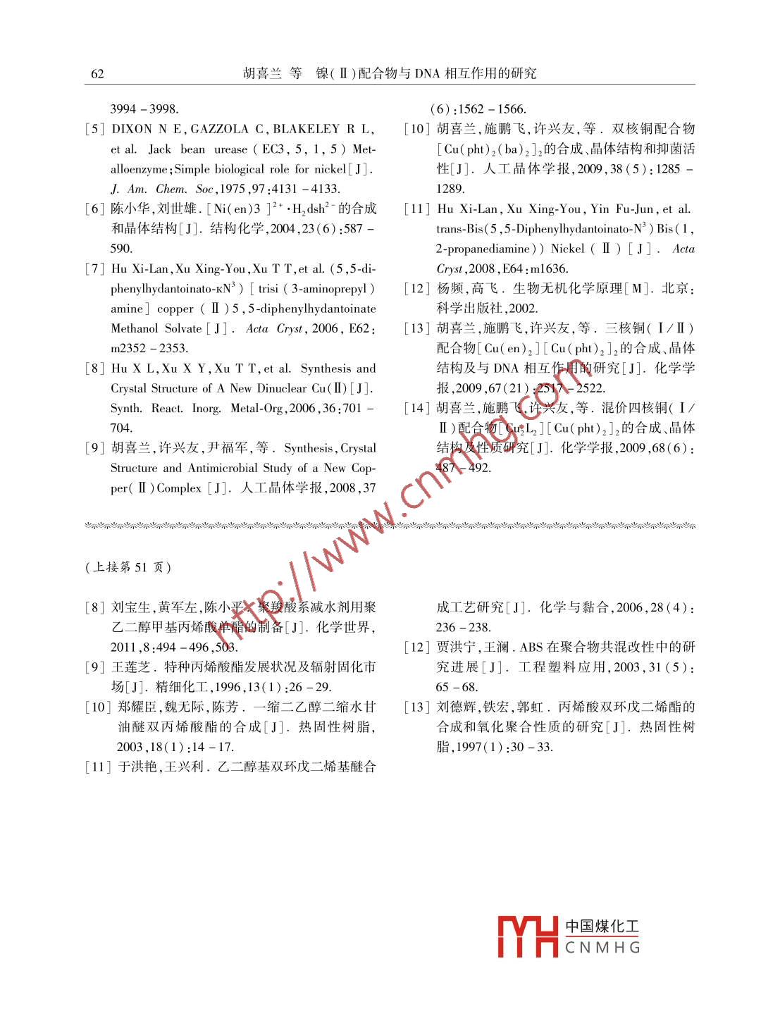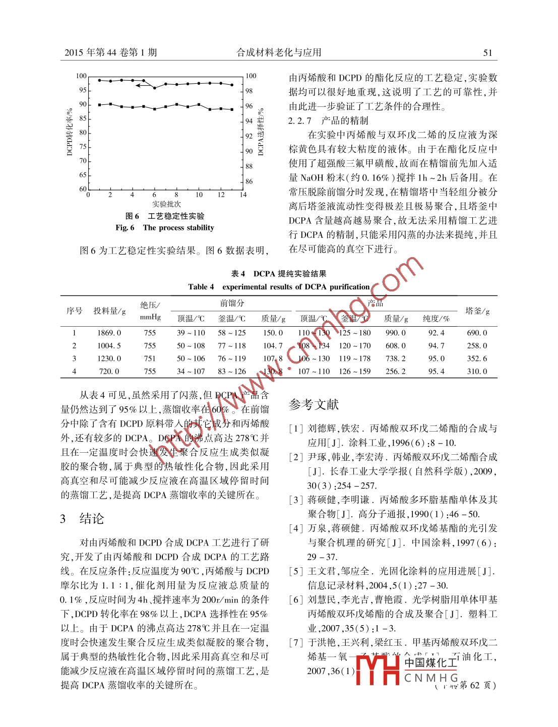 2015年第44卷第1期合成材料老化與應用47丙烯酸雙環(huán)戊烯基酯合成工藝的研究許惠明,夏蓉暉,徐澤輝(中國石化上海石油化工股份有限公司精細化工部,上海200540)摘要:以丙烯酸和雙環(huán)戊二烯為原料合成了丙烯酸雙環(huán)戊烯基酯。實驗結果表明:以三氟甲磺酸為催化劑,反應溫度為90℃,丙烯酸與DCPD摩爾比為1.1:1,催化劑用量為反應液總質量的0.1%,反應時間為4h、攪拌速率為200r/min的條件下,DCPD轉化率在98%以上,DCPA選擇性在95%以上關鍵詞:丙烯酸,雙環(huán)戊二烯,丙烯酸雙環(huán)戊烯基酯,催化劑,合成中圖分類號:TQ314+91Study on the Process for Synthesis of Dicyclopentadienyl AcrylateXU Hui-ming. Xia rong-hui. xu Ze-huiSINOPEC Shanghai Petrochemical Company Limited, Fine chemical industry, Shanghai 200540, ChinaAbstract: The process for the synthesis of dicyclopentadienyl acrylate by esterification of acrylic acid and dicy-clopentadiene was investigated in the presence of trifluoromethanesulfonic acid catalyst. The experiment resultsshowed that the esterification conversion of dicyclopentadiene was over 98% and the selectivity to dicyclopentadienyl acrylate was greater than 95% in the corresponding conditions: 90C reaction temperature, 0. 1%( the massnt based on the quantity of the total amount of the reaction liquid )the amount of catalyst, 200rpm the stirrinspeed, 4 hour reaction time, n( acrylic acid)/n( DCPD)=l1: 1Key words: acrylic acid, dicyclopentadiene, dicyclopentadienyl acrylate, catalyst, synthesis目前大量用于涂料和粘合劑領域中的(甲基)點,DCPA的最重要市場定位是作為光(UV、EB)固丙烯酸酯主要是(甲基)丙烯酸的直鏈烷基酯,一般化樹脂生產用的反應性稀釋劑。用于合成熱塑性聚(甲基)丙烯酸酯樹脂,而合成熱從現(xiàn)有的文獻報導來看,DCPD在酸性催化劑固性聚(甲基)丙烯酸酯樹脂,須在直鏈烷基上引入作用下與丙烯酸經(jīng)酯化反應來制得DCPA,催化劑活性官能團,如羥基、環(huán)氧基、酰胺基等。為提高熱的性能決定了反應的收率。但由于DCPA的沸點極固性聚(甲基)丙烯酸酯樹脂的性能,常常使其單體高且極易發(fā)生聚合反應,故要獲得較高純度的產與丙烯腈、苯乙烯、丙烯酰胺等其它單體共聚,而品,需對酯化反應和DCPA的精制進行詳細地研究。(甲基)丙烯酸多脂環(huán)酯樹脂及系列產品是一類很為此對DCPD與丙烯酸酯化反應進行了考察,篩選有特點的特種(甲基)丙烯酸酯單體,目前全球只有了一種酯化催化劑,在合適的條件下,DCPD的轉化美國和日本生產。率在98%以上,DCPA選擇性在95%以上,并依據(jù)通常(甲基)丙烯酸雙環(huán)戊二烯酯( DicyclopenDCPA的特點,進行了DCPA的提純,得到含量在dienyl Ae,DCPA)這類單體聚合后在聚合物95%的DCPA產品。中引入了構象固定的較大多酯環(huán)基團,使聚合物有實驗較高的玻璃化溫度、表面能低、聚合收縮率小、硬度大、吸水率低、氣干性及絕緣與透明性好等特性,因1.1原料及催化劑而可廣泛用于涂料、粘合劑等其他領域。此外,由丙烯酸由江蘇永華精細化學品有限公司生產,于(甲基)丙烯酸酯的雙鍵可進行游離基聚合且多CP級,含量≥98盡中上流油股份有限酯環(huán)上的烯丙基又可在空氣中進行氧化聚合的特公司精細化工部中國煤化工88%;催化CNMHG收稿日期:2014-11-03許惠明等丙烯酸雙環(huán)戊烯基酯合成工藝的研究劑三氟甲烷磺酸由阿拉丁試劑公司生產,含量≥98%;溫度降至室溫,再加入1g粉狀NaOH中和反應液,阻聚劑對苯二酚由中國五聯(lián)化工生產,含量≥98%。使三氟甲磺酸轉化為三氟甲磺酸鈉,處理后物料進1.2實驗操作行產品分離酯化條件實驗在500mL四口燒瓶中進行,中部1.3分析裝有可變速機械攪拌裝置,左右兩側分別接有球形定量分析色譜儀為HP6890,色譜柱為FFAP型冷凝管和恒壓滴液漏斗,剩余接口裝有測溫用水銀60m長毛細管柱,膜厚0.25μm,柱溫由130℃程序溫度計。通過恒溫水浴來控制反應溫度并移出反升溫至250℃。采用面積歸一化方法進行計算行,裝置同前。將547丙烯酸和149g催化劑2結果與討論三氟甲磺酸及微量對苯二酚(50mg/kg)加入反應器內,開動攪拌穩(wěn)定在200r/min并升溫至80℃2.1熱力學計算85℃,開始滴加946.8 g DCPD,在1h內滴加完畢,反用 Benson法估算雙環(huán)戊二烯、雙環(huán)戊二烯丙烯應溫度維持在(90±1)℃,反應3h后,反應結束,將酸脂、丙烯酸的C,△H°、△G°。計算結果見表1。表1熱力學參數(shù)的估算Table 1 The thermodynamic parameter estimation化合物雙環(huán)戊二烯152.42346.79109.38173.57229.12135.030.94430-0.00043雙環(huán)戊二烯丙烯酸脂-232.97427.32195.988.79353.99丙烯酸319.52218.2678.1796.05111.190.274700.00014由表1數(shù)據(jù)可計算出各溫度下反應的△H、轉化率計算結果見表3。由表3可看出,在較低溫ΔS、△G、平衡常數(shù)和平衡轉化率。從表2中可見,度下因平衡常數(shù)較大,選擇低摩爾比就可以達到較酯化反應為放熱反應,反應平衡常數(shù)隨溫度的升高大的平衡轉化率,而在高溫時,原料摩爾比同樣對而降低。不同溫度和丙烯酸/DCPD摩爾比的平衡平衡轉化率有一定的影響。表2溫度與熱力學參數(shù)的關系Table 2 Relationship between temperature and thermodynamic parameters反應溫度/K平衡常數(shù)平衡轉化率137.730-137.4573.1758037.380.98884665.704-137.19533065.622136.94220.4311714.340.975855340136.69748.740.96569565.4-136.45817.697437.780.9522610.93483065.29-135.994129.970.91261965.205-135.765-13.61474.380.884818表3不同溫度和原料摩爾比對反應平衡轉化率的影響Table 3 Effect o