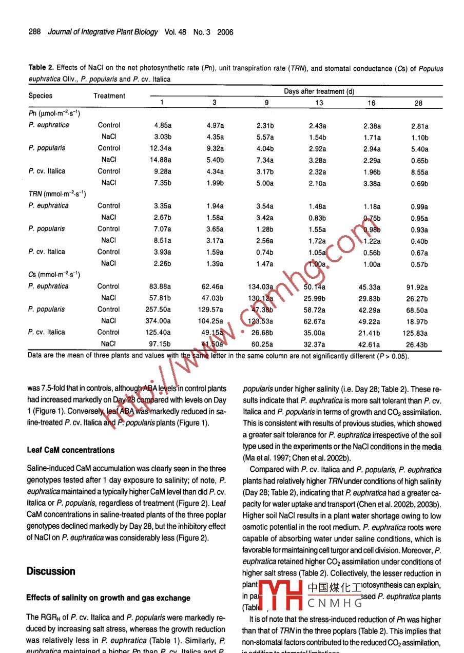 Joumal of Integrative Plant Biology 2006, 48(3): 286-293www.blackwell-synergy.com;www.chineseplantscience.comGrowth Gas Exchange Abscisic Acid and calmodulinResponse to Salt Stress in Three PoplarsYu Chang, Shao-Liang Chen*, Wei-Lun Yin, Rui-Gang Wang, Yan-Feng Liu,Yong Shi, Yuan- Yuan Shen, Yue Li, Jie Jiang and Yue Liu(College of Biological Science and Technology, Beijing Forestry University, Beijing 100083, China)AbstractIn the present study, we investigated the effects of increasing salinity on growth, gas exchange, abscisic acid(ABA), calmodulin(CaM), and the relevance to salt tolerance in seedlings of populus euphratica oliv. andcuttings of P,"pupularis 35-44"(P. popularis)and P. x euramericana cv. I-214(P. cV. Italica). The relative growthrates of shoot height(RGRH)for P. CV. Italica and P. popularis were severely reduced by increasing salt stress,whereas the growth reduction was relatively less in P. euphratica. Similarly, P. euphratica maintained highernet photosynthetic rates(Pn)and unit transpiration rates(TRN) than P cv. Italica and P. popularis under condi-tions of higher salinity. Salinity caused a significant increase in leaf ABa and caM in the three genotypes afterthe onset of stress, but Nacl-induced ABA and CaM accumulation was more pronounced in P euphratica,suggesting that P. euphratica plants are more sensitive in sensing soil salinity than the other two poplarsFurthermore, P euphratica maintained relatively higher ABA and caM concentrations under conditions of highsalinity. The higher capacity to synthesize stress signals, namely ABa and CaM, in P. euphratica and thecontribution of this to the salt resistance of P. euphratica are discussed.Key words: abscisic acid; calmodulin; gas exchange; growth; NaCl; PopulChang Y, Chen SL, Yin WL, Wang RG, Liu YF, Shi Y, Shen YY, Li Y, Jiang J, Liu Y(2006). Growth, gas exchange, abscisic acid,and calmodulin response to salt stress in three poplars. J Integrat Plant Biol 48(3),286-293Salt stress signal transduction is made up of multiple pathways al. 1997; Gomez-Cadenas et al. 1998). ABA limits Na* and Clthat consist of ionic and osmotic homeostasis signaling pathways, accumulation in leaves(Karmoker and van Steveninck 1979detoxification response pathways, and pathways for growth regu- Montero et al. 1997), which appears to be the result of a restric-lation(Zhu 2001, 2002). The SOS pathway for ion homeostasis tion of root-to-shoot ion transport via a transpirational stream be-regulation has been established by Zhu(zhu 2001, 2002). cause ABA is a stomatal regulator. Recently, the role of ABA inGenerally, salinity causes increased biosynthesis and accumula- stress signal transduction has been investigated intensively andtion of abscisic acid(ABA), which can modulate physiological the results indicate that ABA can upregulate many stress-respon-reactions in plant responses to salinity( Karmoker and van sive genes(Hasegawa et al. 2000 Zhu 2002 ). ABA has beenSteveninck 1979: Behl and Jeschke 1981; Wolf et al. 1990; Zhao shown to activate LEA-like class genes through the bZIP tran-et al. 1991; Thomas et al. 1992; He and Cramer 1996; Montero et scription factors ABF/AREB (Shinozaki and Yamaguchi-Shinozaki2000; Xiong et al. 2002a). In addition, ABA has been suggested toinduce the gene expression of anti-oxidant enzymes(zhu andReceived 25 Mar 2005 Accepted 25 May 2005Scandalios 1994 Guan and Scandailos 1998a 1998b Guan et alSupported by the National Natural Science Foundation of China(30430430maior role of ABa in adaptation to abioticthe Foundation for the Author of National Excellent Doctoral Dissertation of envirol中國煤化工 any attempts to correlateChina(200152), and the Teaching and Research Award Program for Out- the preCN MHGoplant salinity tolerancestanding Young Teachers in Higher Education Institution of MOE, China Comparative studies nave snown that salt-tolerant Populuseuphratica plants are sensitive to salt stress and their roots in-Author for correspondence. Tel: +86(0)10 6233 8129; Fax: +86(0)10 6233 crease ABA synthesis under conditions of lower salinity(Chen et7855:E-mail:.al. 2002a, 2003a). Furthermore, P euphratica maintains a higherCaM and ABa Response to Nacl Stress in Poplars 287BA concentration under conditions of long-term increasing sa- week of salinity (Table 1)linty( Chen et al. 2001a). In addition to osmotic stress-inducedABA, ion-specific effects(e.g. Na* salts and cr salts)also con-tribute to the accumulation of ABA in P euphratica(Chen et al. Gas exchange response to salt stress2003a). Abscisic acid signal transduction is a complex signal trans-duction network; however, there is no information on the correla- The Pn, TRN, and Cs of control plants fluctuated considerablytion between salt-induced ABA and secondary signals(e.g. Ca2+ over the 4-week study(Table 2), which resulted from variationsand calmodulin(CaM)in trein environmental factors Natural PAR varied between 100 andThe Ca signal has been regarded as a primary signal trans- 1 100 umol." and air temperature ranged from 20 to 30Cducer in plant cells and CaM is the most important Ca* receptor during the observation period. In general, Ph, TRN, and Cs of thewithin cells. It has been demonstrated that there are many en- three poplar genotypes were all reduced by increasing salt stress,ymes that have important functions in plant metabolism that are but there were genotypic differences in the pattern of the gasregulated by Ca*or the Ca */CaM system( Dieter and Dieter 1983; exchange response to salinity( Table 2). P euphratica and P cvZielinski 1998; Sun et al. 2000 ). The role of Ca/CaM in stress ltalica exhibited a rapid decline in gas exchange upon the initiationphysiology has received considerable attention in recent years, of salinity and the Pn, TRN, and Cs of these two genotypesbut contradictory results have been reported Zong et al. (2000) decreased significantly on Day 1, whereas a marked reduction infound that blockade of Ca */CaM signal transdu