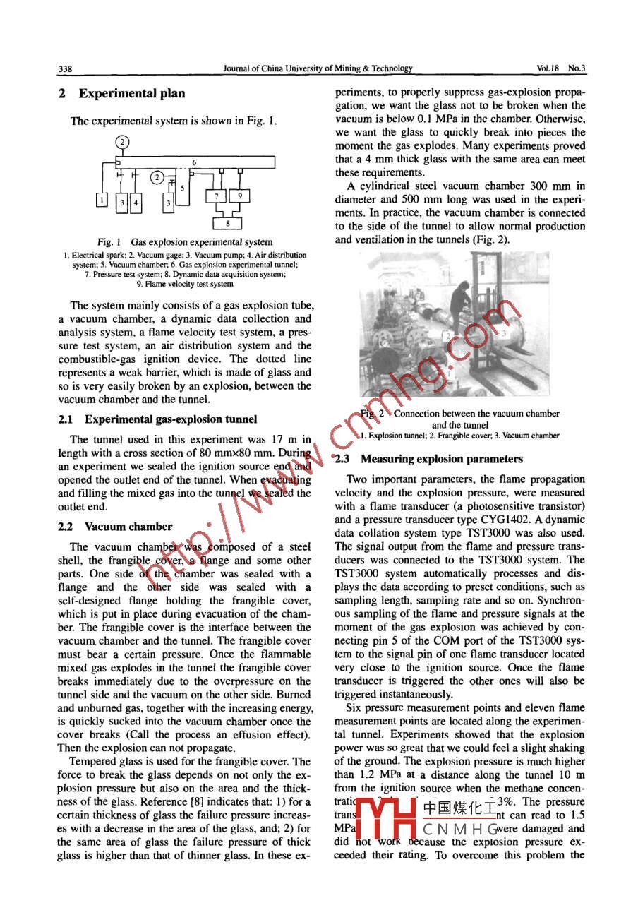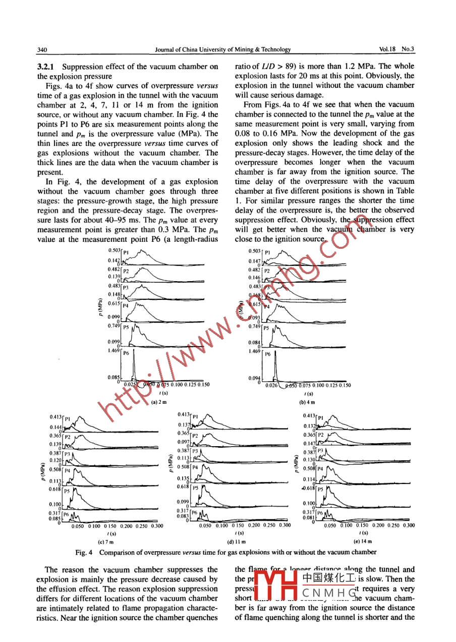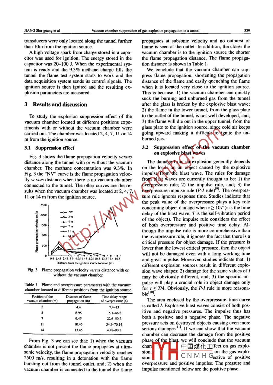 leonlineatwww.sciencedireJOURNAL OF CHINA UNIVERSITY OFScience dir(MININGTECHNOLOGYELSEVIERJ China Univ Mining Technol 18(2008)0337-0341www.clsevier.com/locate/jcumtVacuum chamber suppression of gas-explosionpropagation in a tunnelJIANG Shu-guang, WU Zheng-yan, LI Qing-hua, HE Xin-jian, SHAO Hao,QIN Jun-hui, WANG Lan-yun, HU Li-ming, LIN Bai-quanSchool of Safery Engineering, China Universiry of Mining Technology, Xuzhou, Jiangsu 221008, chinaAbstract: To control and reduce the harm of a gas explosion, a new method is proposed for suppressing gas-explosion propagationa tunnel by using a vacuum chamber. We studied the suppression effect on gas explosions by placing a vacuum chamber at dif-rent positions along the tunnel. The results indicate that: I)the vacuum chamber can absorb the explosion wave and explosionnergy as much as possible at the beginning of the gas explosion, and; 2)when the vacuum chamber is used the closer it is to theon source the more significant the suppression effect. In addition, by using the vacuum chamber: 1)the flame propagationvelocity decreases from ultrasonic to subsonic: 2)the flame propagation distance is remarkably shortened; 3)the maximumvalue of overpressure (Pm)decreases from 0.34 to 0. 17 MPa or less, and; 4)the impulse of the blast wave(n) decreases from 20 to 8kPa.s or lessKey words: vacuum chamber; liquid venting: flame quenching: pressure venting: impulse; explosion suppression1 IntroductionFive-Year Plan".However, the application of thesetechnologies introduces a significant workload in theQ For a long time gas explosions in the coal mines of form of equipment maintenance. As we all know, ex-hina have been the most serious problem affecting plosion suppression means not only suppression ofsafe production. Anti-explosion sheds, water tanks, flame propagation but also the suppression of the in-rock powder sheds, water bags and other tech- teraction between the flame and blast waves. So,niques- are widely applied in coal mines at home supported by the National Natural Science Founda-and abroad to control or reduce the harm from gas tion of China, the author, together with other colexplosions. Although these methods have played an leagues, has for the first time proposed a new methodmportant role in explosion prevention, they still have of suppressing gas explosions by using a vacuumsome shortcomings: 1) most of them act passively in chamberlo-7l. We have developed a vacuum chambersuppressing explosions and can only reduce the tem- that can be easily connected to the tunnel. a series ofperature of the flame; 2)the water in the water tanks experimental gas explosions were performed in aor the water bags is easily evaporated. Particularlysquare tunnel with a section area of 80 mmx80 mmmining districts with a large air volumes and high and a length of 17 mtemperatures, the water is easily mixed with dust re-To prove the suppression effect of the same vasulting in a failure to suppress flame propagation be- cuum chamber when connected to any side of thecause of the lack of water, and; 3)rock powders in tunnel, but at different positions, we selected me-the sheds will absorb moisture and become agglome- thane-air as the working medium. The gas explosionrated and unable to fly upwards to form a rock powd. experimental system developed by China Universityer mist, which may reduce or even prevent proper of Mining Technology was used to study and ana-performance for explosion-proofing. To overcome lyze the flame propagation velocity and the explosionthese disadvantages, automatic suppression technolo- pressure along the tunnel with or without the vacuumgies have been proposed and studied since the EighthReceived 12 January 2008: accepted 15 May 200中國煤化工ojects 50534090 and 50674090 supported by the National Natural Science FoundatCNMHtific and Technology Key Program of China, 2005CB221503 by the National Basic ReFoundation of China University of Mining&Correspondingauthor.Tel:+86-516-83885156E-mailaddress:jsguang@cumt.edu.cnJournal of China University of Mining& TechnologyVol, 18 No. 32 Experimental planperiments, to properly suppress gas-explosion propagation, we want the glass not to be broken when theThe experimental system is shown in Fig. 1vacuum is below 0. 1 MPa in the chamber. Otherwisewe want the glass to quickly break into pieces themoment the gas explodes. Many experiments provedthat a 4 mm thick glass with the same area can meetthese requirementsA cylindrical steel vacuum chamber 300 mm indiameter and 500 mm long was used in the experiments In practice, the vacuum chamber is connectedto the side of the tunnel to allow normal productionFig 1 Gas explosion experimental systemand ventilation in the tunnels(Fig. 2).system; 5. Vacuum chamber; 6. Gas7. Pressure test system; 8. Dynamic data acquisition system;9. Flame velocity test systemThe system mainly consists of a gas explosion tube,a vacuum chamber, a dynamic data collection andanalysis system, a flame velocity test system, a pres-sure test system, an air distribution system and thecombustible-gas ignition device. The dotted linerepresents a weak barrier, which is made of glass andso is very easily broken by an explosion, between thevacuum chamber and the tunnelosion tunneland the tunnelThe tunnel used in this experiment was 17 m inI Explosion tunnel; 2. Frangible cover: 3. Vacuum chamberlength with a cross section of 80 mmx80 mm During 2.3 Measuring explosion parametersan experiment we sealed the ignition source end andopened the outlet end of the tunnel. when evacuatingTwo important parameters, the flame propagationand filling the mixed gas into the tunnel we sealed the velocity and the explosion pressure, were measuredoutlet endwith a flame transducer(a photosensitive transistor)2.2 Vacuum chamberand a pressure transducer type CYG1402 A dynamicdata collation system type tsT3000 was also usedThe vacuum chamber was composed of a steel The signal output from the flame and pressure trans-shell,