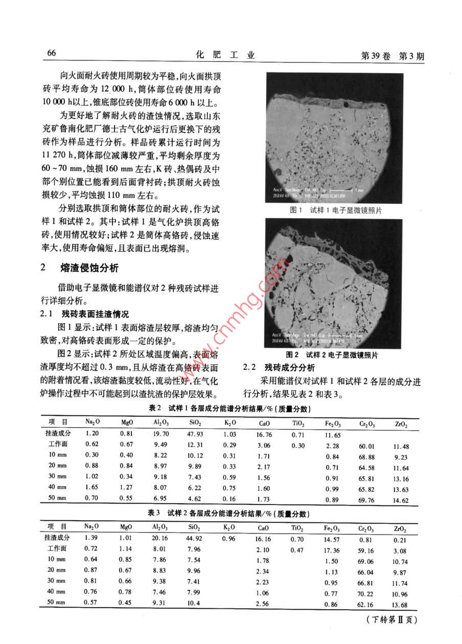 2012年6月化肥工業(yè)高溫熔渣對水煤漿氣化爐耐火磚的影響劉進波(山東兗礦國拓科技工程有限公司山東鄒城273500)摘要對使后的耐火磚殘磚迸行取樣分杄,以了解高鉻磚顯微結(jié)構(gòu)和成分變化,找出水煤漿氣化爐向火面高鉻磚受熔渣侵蝕毀的杋理。結(jié)果表明:對于結(jié)枃相冋的耐火畤,在髙漒煷渣侵蝕硏火磚的過程中,主要影響因素是熔渣的成分、工作溫度、耐火磚的致密度和雜質(zhì)含量,熔渣中的SO2含量是造成渣蝕的直接原因,而耐火磚的工作溫度、致密度和雜質(zhì)含量決定了渣飲的速率。關(guān)鍵詞水煤裟氣化爐耐火磚侵蝕分析Effect of High-Temperature Slag on Refractory Bricksin Coal-Water Slurry GasifierLiu jinboShandong Yancon Guotuo Science& Engineering Co, Ltd. Shandong Zoucheng 273500)Abstract An analysis is made of samples taken from residual pieces of used refractory bricks, soas to understand the microstructure of high-chromium bricks and their change in composition and findout the mechanism of damage on the side of high-chromium bricks facing the fire by slag erosion in thecoal-water slurry gasifier. The results show that for bricks of the same structure the main influencingfactors in the course of refractory bricks eroded by high-temperature slag are the composition of the slagworking temperature, densification and impurity content of the bricks, and the SiO, content of the slapis the direct cause for slag erosion, while the working temperature, densification and impurity contentof the bricks determine the rate of slag erosionKeywords coal-water slurry gasifer refractory bricks erosion analysis0概述1分析材料的選擇隨著內(nèi)煤化工的發(fā)展,水煤漿加壓氣化技日前,水煤漿加壓氣化爐使用的向火面耐火術(shù)以其技術(shù)成熟可靠、碳轉(zhuǎn)化率高、環(huán)境污染小磚多為國產(chǎn)鉻鋁鋯系產(chǎn)品,含氧化鉻質(zhì)量分數(shù)>適用于大型化等優(yōu)點,展現(xiàn)出良好的發(fā)展前景。86%。新耐火磚理化指標及檢驗結(jié)果見表1。水煤漿加壓氣化技術(shù)屬氣流床氣化工藝,其表1新耐火磚理化指標及檢驗結(jié)果操作溫度在煤灰熔融流動溫度(FT)以上。在以檢驗項日平均值)保證值耐火磚為襯里的爐型中,氣化爐內(nèi)襯耐火材料不C2O3/%(質(zhì)量分數(shù))僅處于高溫、高壓、強還原性氣氛和高速氣流的沖>4.5刷環(huán)境中,而且與侵蝕性極強的酸性熔渣接觸,受體積密度/(g·cm3)到熔渣的侵蝕。因此,了解高溫熔渣對耐火磚侵量氣孔率(耐火磚表面)16.2蝕速率的影響因素,有助于延長耐火磚使用壽命、耐壓強度/MPa10延長裝置運行周期、降低生產(chǎn)成本。注:1)為連續(xù)3次的產(chǎn)品檢驗報告數(shù)據(jù)本文作者的聯(lián)系力式:dclu(126.com化肥工業(yè)第39卷第3期向火面耐火磚使用周期較為平穩(wěn)向火面拱頂磚平均壽命為12000h,筒體部位磚使用壽命10000h以上,錐底部位磚使用壽命6000h以上為更好地了解耐火磚的渣蝕情況,選取山東兗礦魯南化肥廠德士古氣化爐運行后更換下的殘磚作為樣品進行分析。樣品磚累計運行時間為l1270h,筒體部位減薄較嚴重,平均剩余厚度為60~70mm,蝕損160mm左右,K磚熱偶磚及中部個別位置已能看到后面背襯磚;拱頂耐火磚蝕損較少,平均蝕損110mm左右。分別選取拱頂和筒體部位的耐火磚,作為試圖1試樣1電子顯微鏡照片樣1和試樣2。其中:試樣1是氣化爐拱頂高鉻磚,使用情況較好;試樣2是筒體高鉻磚,侵蝕速率大使用壽命偏短,且表面已出現(xiàn)熔洞。2熔渣侵蝕分析借助電子顯微鏡和能譜儀對2種殘磚試樣進行詳細分析。21殘磚表面掛渣情況圖1顯示:試樣1表面熔渣層較厚,熔渣均勻致密,對高鉻磚表面形成一定的保護。圖2顯示:試樣2所處區(qū)域溫度偏高,表面熔圖2試樣2電子顯微鏡照片渣厚度均不超過0.3mm,且從熔渣在高鉻磚表面2.2殘磚成分分析的附著情況看,該熔渣黏度較低,流動性好,在氣化采用能譜儀對試樣1和試樣2各層的成分進爐操作過程中不可能起到以渣抗渣的保護層效果。行分析結(jié)果見表2和表3。表2試樣1各層成分能譜分析結(jié)果/%(質(zhì)量分數(shù)O2 Fe203 Cr,O,掛渣成分1.200.8116.760.71l1.65工作面0.620.6712.310.292.2860.01l1.48100.408.2210.120.311.719.230.848.979.890.332.170.7164.5811.640.590.9165.8113.1640ml.651.270.750.9965.8214.62表3試樣2各層成分能譜分析結(jié)果/%(質(zhì)量分數(shù)項日N20MoA2o3so2k2oTiO掛渣成分1.3916.160.7014.570.810.210.728.017.962.1059.163.08101.7869.062.346630mm0.810.669.387.4140 mm0.7770.10.9650 mm62.16(下轉(zhuǎn)第Ⅱ頁)發(fā)生過加煤機容桶爆炸事故,徹底消除了加煤防護罩。機容桶發(fā)生爆炸的隱患。為了進一步提高加煤(云南云天化國際化工股份有限公司紅磷分公司機的安全性,建議對加煤機檢修人孔增設(shè)安全云南開遠661600王文毓)分必必小必必必必心必必必必必必必必必必必小小必必辦辦必必必辦必辦辦必辦必辦必必必(上接第66頁)從表2和表3可知2個試樣表面掛渣中SiO2含量較高其次是A2O3,CaO和Fe2O3,僅試樣2的表面掛渣中含有少量的Cr2O3;2個試樣中在較深深度均有SO2,CaO和Fe2O3存在由于高鉻磚內(nèi)熱略這些雜質(zhì)含量極少,顯然這是來自外部。結(jié)合電子顯微鏡分析結(jié)果,在試樣1工作面及滲透層表面存在 Zrsio4相,顯然是渣中的SO2與磚內(nèi)ZO2反應(yīng)的產(chǎn)物,對阻礙渣向耐火材料內(nèi)部的滲透起到積極作用。但試樣2的工作面未見ZsO4相,只在內(nèi)部可見,這是由于生成的ZSiO4圖3試樣1電子顯