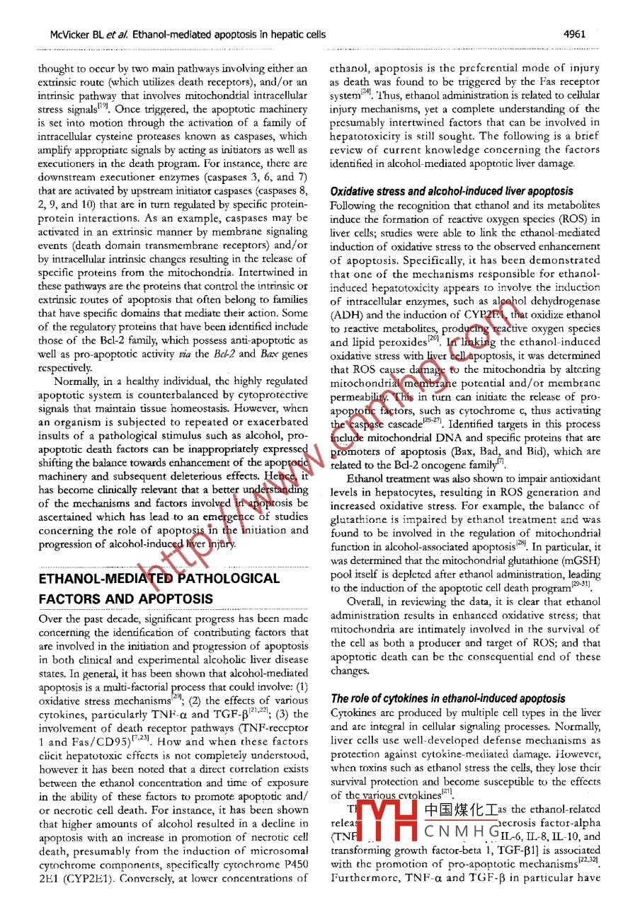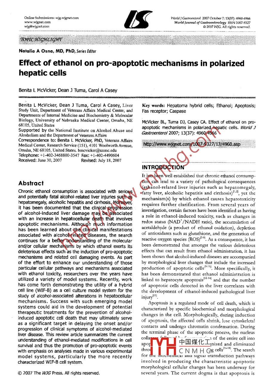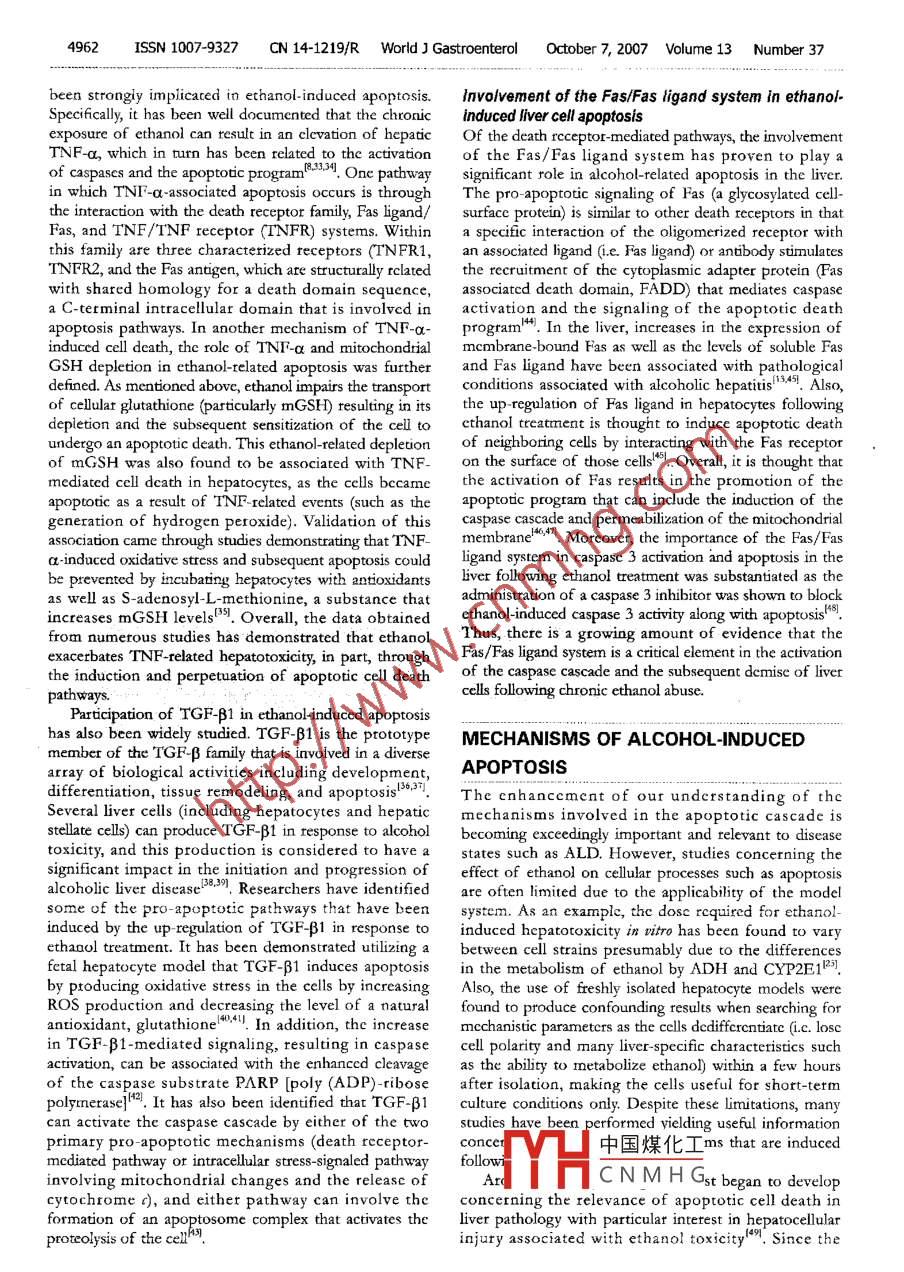 oNatalia A Osna, MD, PhD, Series EditorEffect of ethanol on pro-apoptotic mechanisms in polarizedhepatic cellsBenita L McVicker, Dean Tuma, Carol A CaseyBenita L McVicker, Dean J Tuma, Carol A Casey, Liver Key words: Hepatoma hybrid cells; Ethanol; Apoptosis;Study Unit, Department of Veterans Affairs Medical Center; and Fas receptor; CaspaseDepartments of Intermal Medicine and Biochemistry moleculariology, University of Nebraska Medical Center, Omaha, NE MCVicker BL, Tuma D), Casey CA. Effect of ethanol on pro-Supported by the National Institute on Alcohol Abuse and apoptotic mechanisms in polarized hepatic cells. World JAlcoholism and the Departinent of Veterans AffairsGastroenterol2007;13(37):4960-4966Correspondence to: Benita L McVicker, PhD, veterans AffairsMedical Center, Research Service (151), 4101 Woolworth Avenue,http:!www.wignet.com100927131908Omaha, NE 68105, United States. bmevicker @ unmc.eduTelephone:+1-402-3468800-3547Fax:+1-402-4490604Received: June 30. 2007Revised: July 18, 2007INTRODUCTIONIt has been well established that chronic ethanol consump-Abstraction can lead to a variety of pathological consequences(ethanol-relateed liver injuries such as hepatomegaly,Chronic ethanol consumption is associated with serious fatty liver, alcoholic hepatitis and cirrhosis), yet theand potentially fatal alcohol-related liver injuries such as mechanism(s)by which ethanol causes hepatotoxicityhepatomegaly,alcoholic hepatitis and cirrhosis. Moreover, requires further clarification From several years oft has been docume nted that the clinical progression investigation, certain factors have been identified as havingwith an increase in hepatocellular death that involves a role in ethanol-induced toxicity, such as changes inapoptotic mechanisms. Although much informationredox status(NAD/NADH ratio), the accumulation ofhas been learned about the clinical manifestations acetaldehyde(a product of ethanol oxidation), depletionassociated with alcohol-related diseases, the search of antioxidants such as glutathione, and the generation ofcontinues for a better understanding of the molecular reactive oxygen species(roS). As a consequence, it hasind or cellular mechanisms by which ethanol exerts itsen demonstrated that amongst the various deleteriousdeleterious effects such as the induction of pro-apoptoticeffects that can result from ethanol administration, it hasmechanisms and related cell damaging events. As part been shown that alcohol-induced diseases are accompaniedof the effort to enhance our understanding of those by morphological liver changes that include the increasedparticular cellular pathways and mechanisms associated production of apoptotic cells". More specifically, itvith ethanol toxicity, researchers over the years have has been demonstrated that ethanol administration isutilized a variety of model systems. Recently, work linked to hepatocyte apoptosis" 4 and that the numberhas come forth demonstrating the utility of a hybrid of apoptotic cells detected in the liver correlates withstudy of alcohol-associated alterations in hepatocellularchanisms Success with such emerging modelApoptosis is a regulated mode of cell death, which issystems could aid in the development of potential chatacterized by specific biochemical and morphologicaltherapeutic treatments for the prevention of alcoholchanges in the cell. Morphologically, during inductioninduced apoptotic cell death that may ultimately serve of apoptosis, the affected cells shrink, lose cytoskeletalas a significant target in delaying the onset and/orprogression of clinical symptoms of alcohol-mediated contacts and undergo chromatin condensation. duringliver disease. This review article summarizes the currentunderstanding of ethanol-mediated modifications in cellsurvival and thus the promotion of pro-apoptotic eventswith emphasis on analyses made in various experimentalCTH中國(guó)煤化工 d and eliminatedCNMH Gg cells!. The searchodel systems, particularly the more recentlyical anu signal transduction pathwayscharacterized WIF-B cell systeminvolved in producing the characteristic apoptoticmorphological cellular changes has been unde@2007 The WG Press. All rights reservedseveral years. The current dogma is that apoptosis isw而點(diǎn)教播McVicker BL et al Ethanol-mediated apoptosis in hepatic cellsthought to occur by two main pathways involving either an cthanol, apoptosis is the preferential mode of injuryextrinsic route(which utilizes death receptors), and/or an as death was found to be triggered by the Fas receptorintrinsic pathway that involves mitochondrial intracellular system". 'Thus, ethanol administration is related to cellularstress signals". Once triggered, the apoptotic machinery injury mechanisms, yet a complete understanding of theis set into motion through the activation of a family of presumably intertwined factors that can be involved inintracellular cysteine proteases known as caspases, which hepatotoxicity is still sought. The following is a briefamplify appropriate signals by acting as initiators as well as revicw of current knowledge concerning the factorsexecutioners in the death program. For instance, there are identified in alcohol-mediated apoptotic liver damagedownstream executioner enzymes(caspases 3, 6, and 7)that are activated by upstream initiator caspases(caspases 8, Oxidative stress and alcohol-induced liver apoptosis2,9, and 10) that are in turn regulated by specific protein- Following the recognition that ethanol and its metabolitesprotein interactions. As an example, caspases may be induce the formation of reactive oxygen species(ROS)invated in an extrinsic manner by membrane signaling liver cells; studies were able to link the ethanol-mediatedevents(death domain transmembrane receptors)and/ or induction of oxidative stress to the observed enhancementby intracellular intrinsic changes resulting in the release of of apoptosis. Specifically, it has been demonstratedspecific proteins from the m