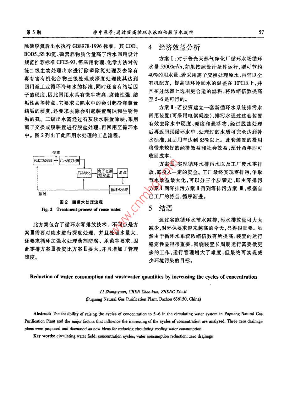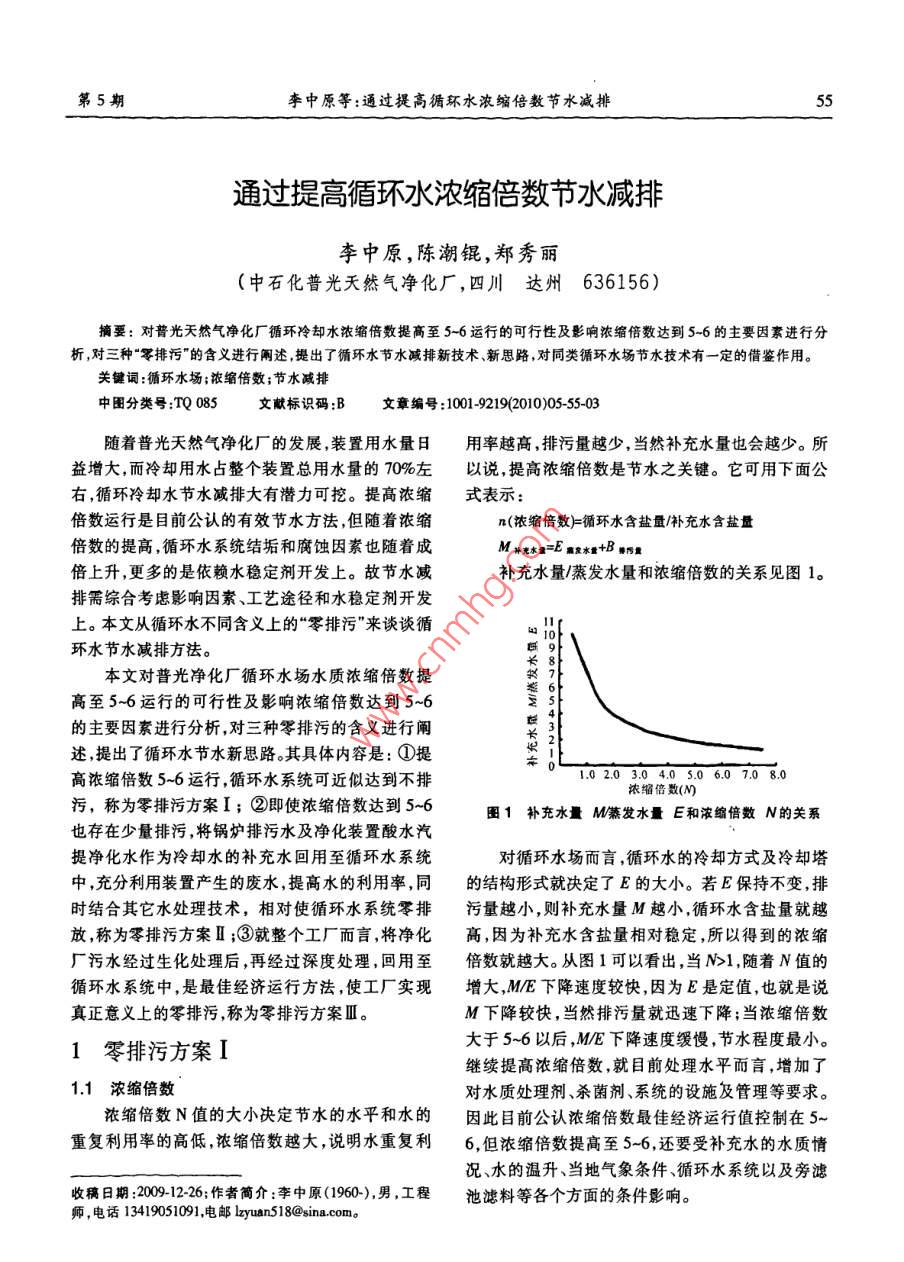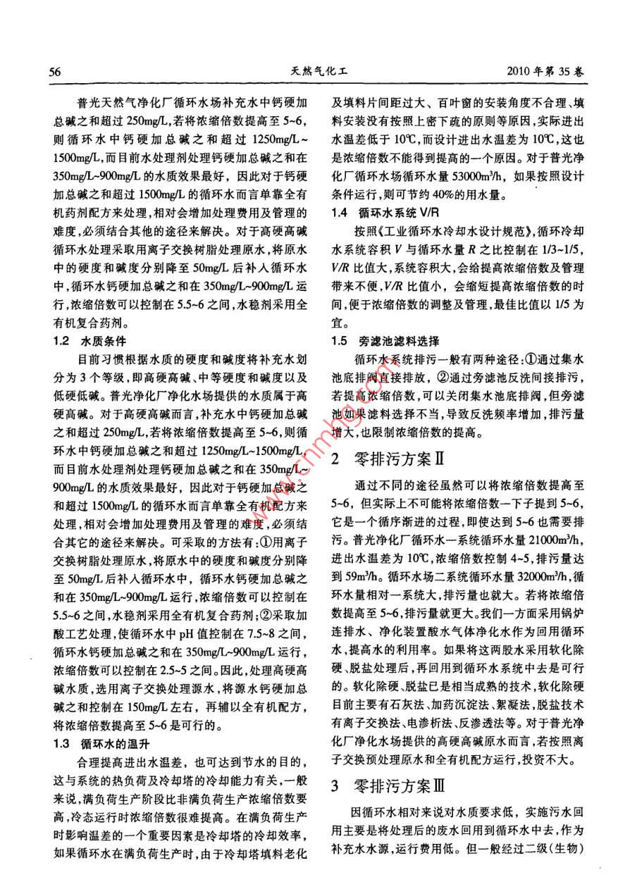 第5期李中原等:通過提高循環(huán)水濃縮倍數(shù)節(jié)水減排通過提高循環(huán)水濃縮倍數(shù)節(jié)水減排李中原,陳潮錕,鄭秀麗中石化普光天然氣凈化廠,四川達州636156)摘要:對普光天然氣凈化廠循環(huán)冷卻水濃縮倍數(shù)提高至5-6運行的可行性及影響濃縮倍數(shù)達到5-6的主要因素進行分析,對三種“零排污”的含義進行闡述提出了循環(huán)水節(jié)水減排新技術(shù)新思路,對同類循環(huán)水場節(jié)水技術(shù)有一定的借鑒作用。關(guān)鍵詞:循環(huán)水場;濃縮倍數(shù);節(jié)水減排中圍分類號:TQ085文獻標識碼B文章編號:10019219(2010)05-5503隨著普光天然氣凈化廠的發(fā)展裝置用水量日用率越高,排污量越少,當(dāng)然補充水量也會越少。所益增大,而冷卻用水占整個裝置總用水量的70%左以說,提高濃縮倍數(shù)是節(jié)水之關(guān)鍵。它可用下面公右,循環(huán)冷卻水節(jié)水減排大有潛力可挖。提高濃縮式表示倍數(shù)運行是目前公認的有效節(jié)水方法,但隨著濃縮n(濃縮倍數(shù)}=循環(huán)水含鹽量/補充水含鹽量倍數(shù)的提高,循環(huán)水系統(tǒng)結(jié)垢和腐蝕因素也隨著成M補光水量=E蓋象水量+B游污重倍上升,更多的是依賴水穩(wěn)定劑開發(fā)上。故節(jié)水減補充水量/蒸發(fā)水量和濃縮倍數(shù)的關(guān)系見圖1。排需綜合考慮影響因素、工藝途徑和水穩(wěn)定劑開發(fā)上。本文從循環(huán)水不同含義上的“零排污”來談?wù)勓h(huán)水節(jié)水減排方法。本文對普光凈化廠循環(huán)水場水質(zhì)濃縮倍數(shù)提高至5-6運行的可行性及影響濃縮倍數(shù)達到5~6的主要因素進行分析,對三種零排污的含義進行閘既長乏述提出了循環(huán)水節(jié)水新思路。其具體內(nèi)容是:①提高濃縮倍數(shù)5-6運行,循環(huán)水系統(tǒng)可近似達到不排,02.03.04.05.06.07.08.0濃縮倍數(shù)(M污,稱為零排污方案I;②即使?jié)饪s倍數(shù)達到56圖1補充水量M蒸發(fā)水量E和滾給倍數(shù)N的關(guān)系也存在少量排污,將鍋爐排污水及凈化裝置酸水汽提凈化水作為冷卻水的補充水回用至循環(huán)水系統(tǒng)對循環(huán)水場而言,循環(huán)水的冷卻方式及冷卻塔中,充分利用裝置產(chǎn)生的廢水,提高水的利用率,同的結(jié)構(gòu)形式就決定了E的大小。若E保持不變,排時結(jié)合其它水處理技術(shù),相對使循環(huán)水系統(tǒng)零排污量越小,則補充水量M越小,循環(huán)水含鹽量就越放稱為零排污方案Ⅱ;③就整個工廠而言將凈化高,因為補充水含鹽量相對穩(wěn)定,所以得到的濃縮廠污水經(jīng)過生化處理后,再經(jīng)過深度處理,回用至倍數(shù)就越大。從圖1可以看出,當(dāng)N1,隨著N值的循環(huán)水系統(tǒng)中,是最佳經(jīng)濟運行方法,使工廠實現(xiàn)增大,ME下降速度較快,因為E是定值,也就是說真正意義上的零排污,稱為零排污方案ⅢM下降較快,當(dāng)然排污量就迅速下降;當(dāng)濃縮倍數(shù)1零排污方案I大于5~6以后,ME下降速度緩慢,節(jié)水程度最小。繼續(xù)提高濃縮倍數(shù),就目前處理水平而言,增加了11濃縮倍數(shù)對水質(zhì)處理劑、殺菌劑系統(tǒng)的設(shè)施及管理等要求。濃縮倍數(shù)N值的大小決定節(jié)水的水平和水的因此目前公認濃縮倍數(shù)最佳經(jīng)濟運行值控制在5~重復(fù)利用率的高低濃縮倍數(shù)越大說明水重復(fù)利6,但濃縮倍數(shù)提高至5-6,還要受補充水的水質(zhì)情況、水的溫升、當(dāng)?shù)貧庀髼l件、循環(huán)水系統(tǒng)以及旁濾收搞日期:20012-26;作者簡介:李中原(1960),男,工程池濾料等各個方面的條件影響。師,電話13419051091電郵 lzyuan518@ Sinacom6天然氣化工2010年第35卷普光天然氣凈化廠循環(huán)水場補充水中鈣硬加及填料片間距過大、百葉窗的安裝角度不合理、填總堿之和超過250mgL,若將濃縮倍數(shù)提高至5~6,料安裝沒有按照上密下疏的原則等原因,實際進出則循環(huán)水中鈣硬加總堿之和超過1250mgL~水溫差低于10℃,而設(shè)計進出水溫差為10℃,這也幾,而目前水處理劑處理鈣硬加總堿之和在是濃縮倍數(shù)不能得到提高的一個原因。對于普光凈350mg/L-900mg/L的水質(zhì)效果最好,因此對于鈣硬化廠循環(huán)水場循環(huán)水量5300m}h,如果按照設(shè)計加總堿之和超過1500mg的循環(huán)水而言單靠全有條件運行,則可節(jié)約40%的用水量。機藥劑配方來處理,相對會增加處理費用及管理的14循環(huán)水系統(tǒng)ⅥR難度,必須結(jié)合其他的途徑來解決。對于高硬高堿按照《工業(yè)循環(huán)水冷卻水設(shè)計規(guī)范》循環(huán)冷卻循環(huán)水處理采取用離子交換樹脂處理原水,將原水水系統(tǒng)容積V與循環(huán)水量R之比控制在1/3~1/5,中的硬度和堿度分別降至50mg/L后補入循環(huán)水V/R比值大,系統(tǒng)容積大,會給提高濃縮倍數(shù)及管理中,循環(huán)水鈣硬加總堿之和在350mg/L~900mg/L運帶來不便,VR比值小,會縮短提高濃縮倍數(shù)的時行濃縮倍數(shù)可以控制在55-6之間,水穩(wěn)劑采用全間,便于濃縮倍數(shù)的調(diào)整及管理,最佳比值以1/5為有機復(fù)合藥劑。宜1.2水質(zhì)條件15旁濾池濾料選擇目前習(xí)慣根據(jù)水質(zhì)的硬度和堿度將補充水劃循環(huán)水系統(tǒng)排污一般有兩種途徑:①通過集水分為3個等級,即高硬高堿、中等硬度和